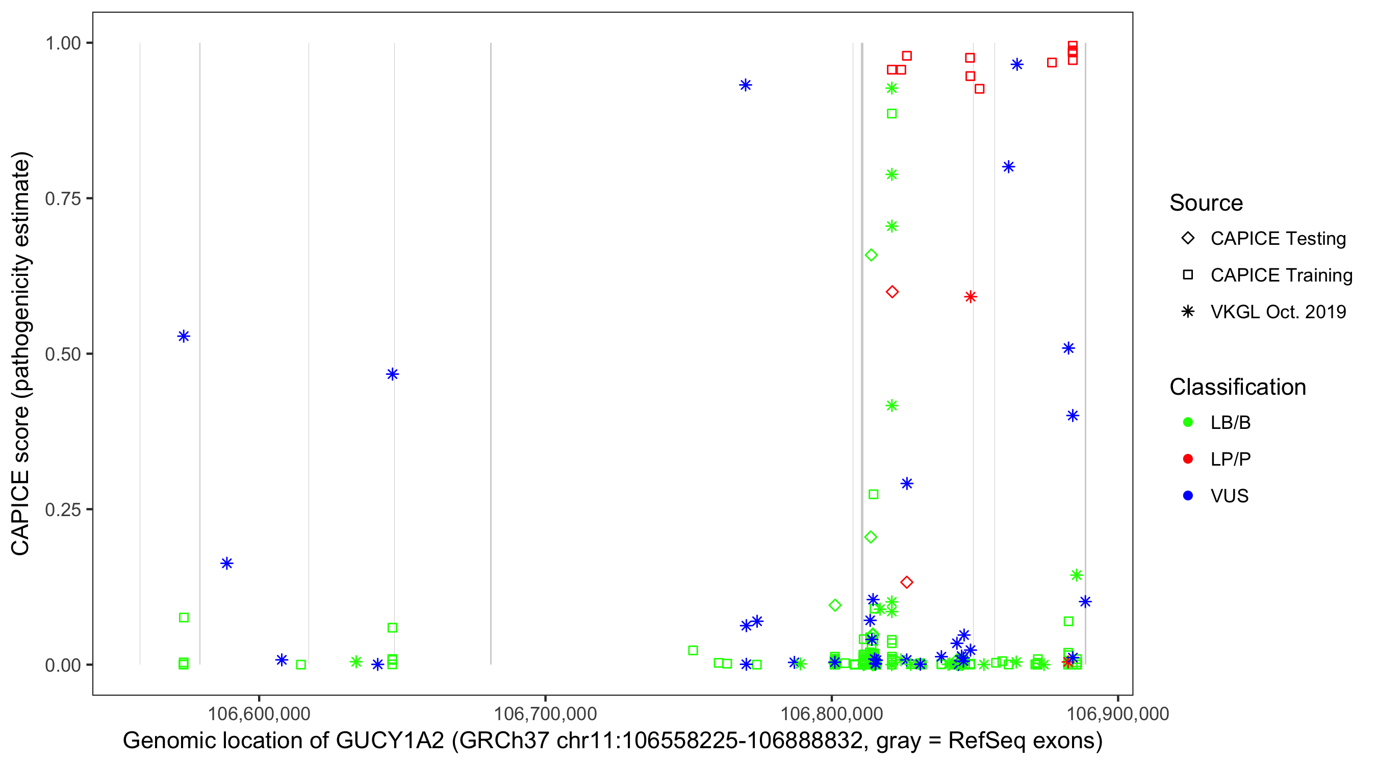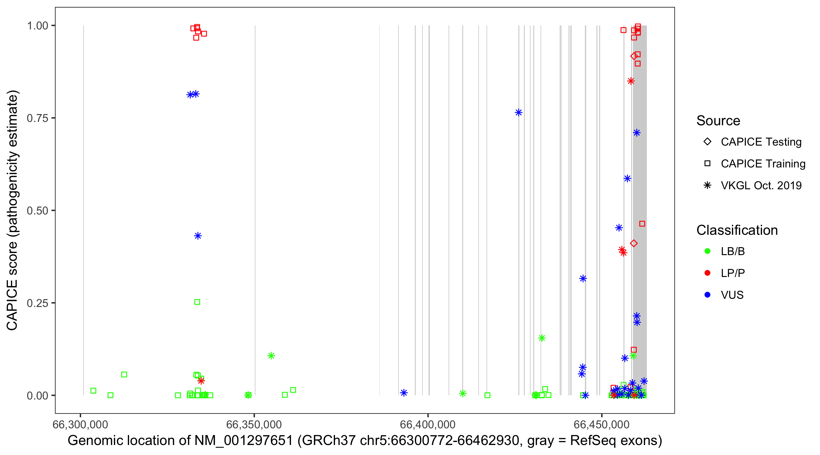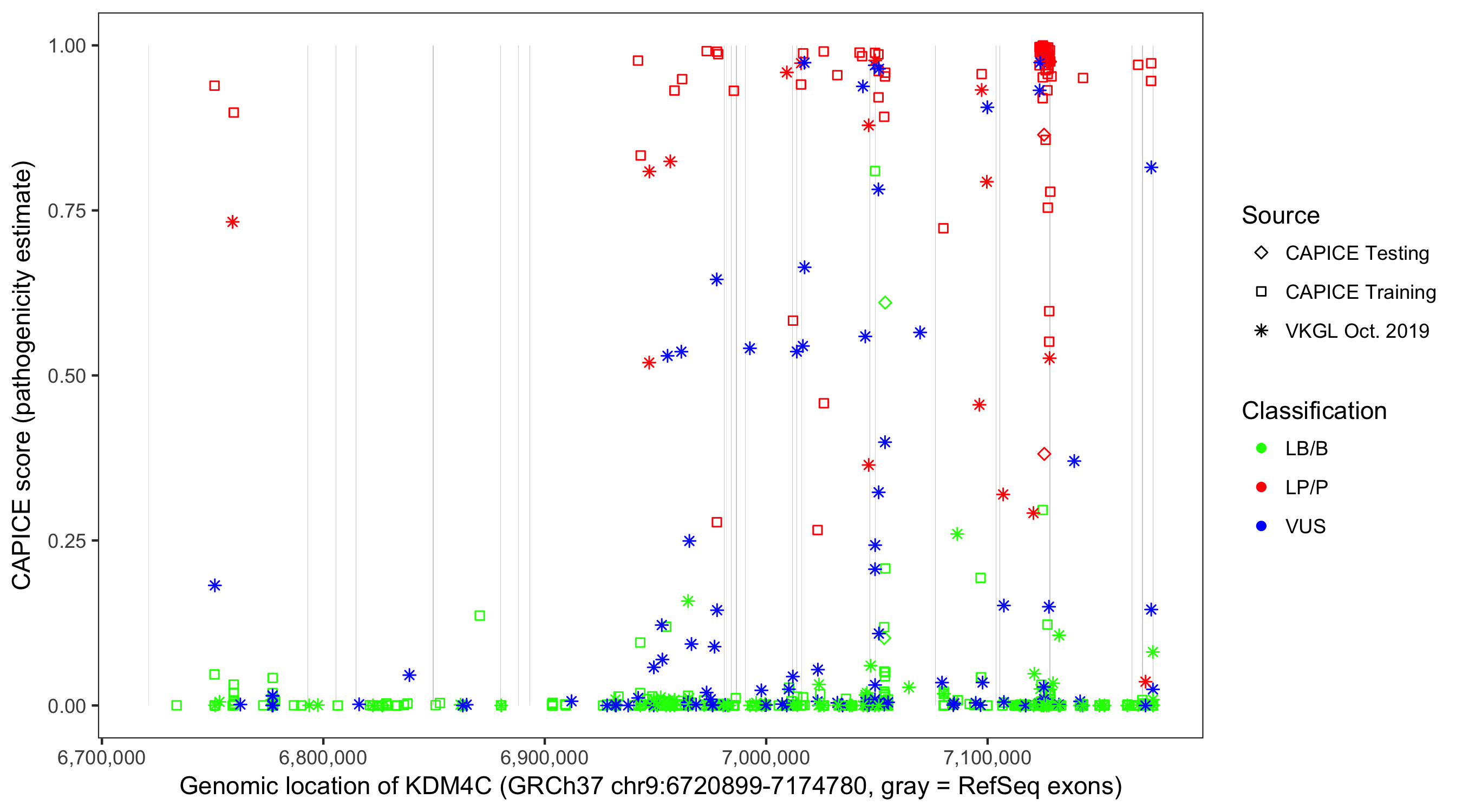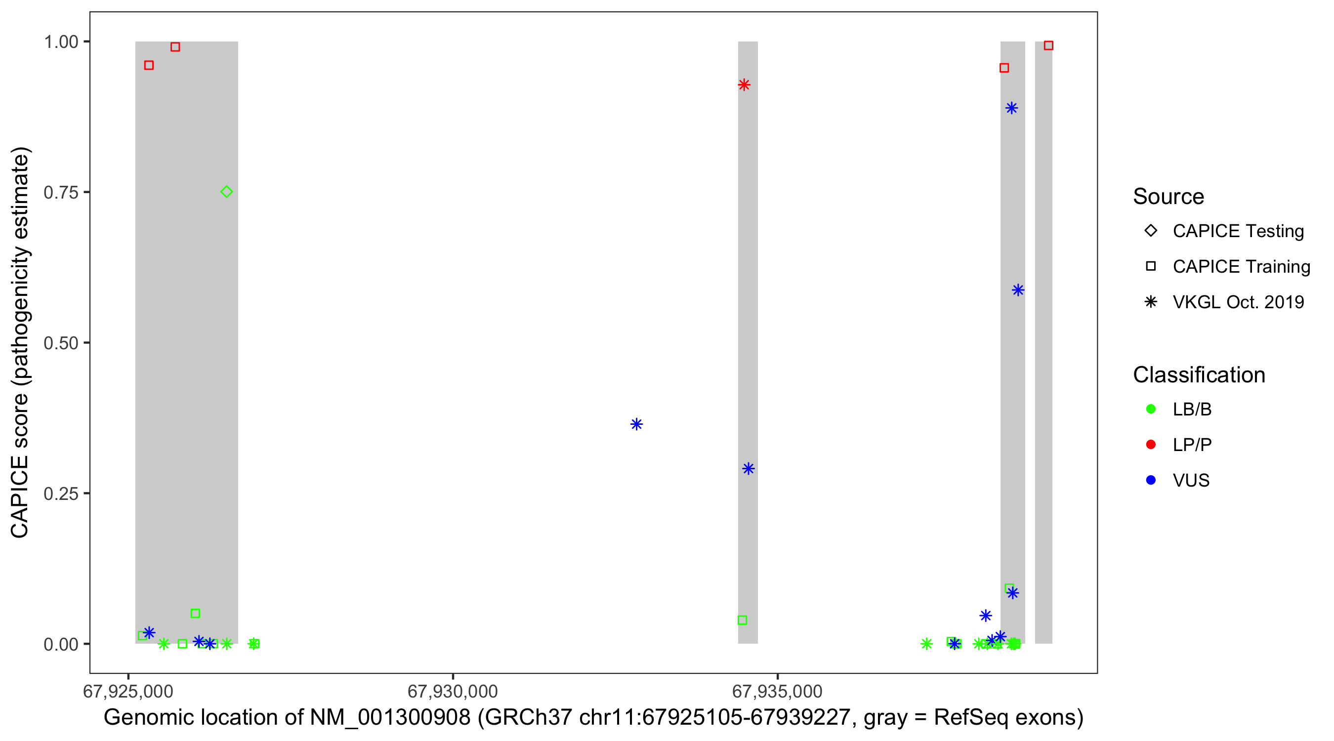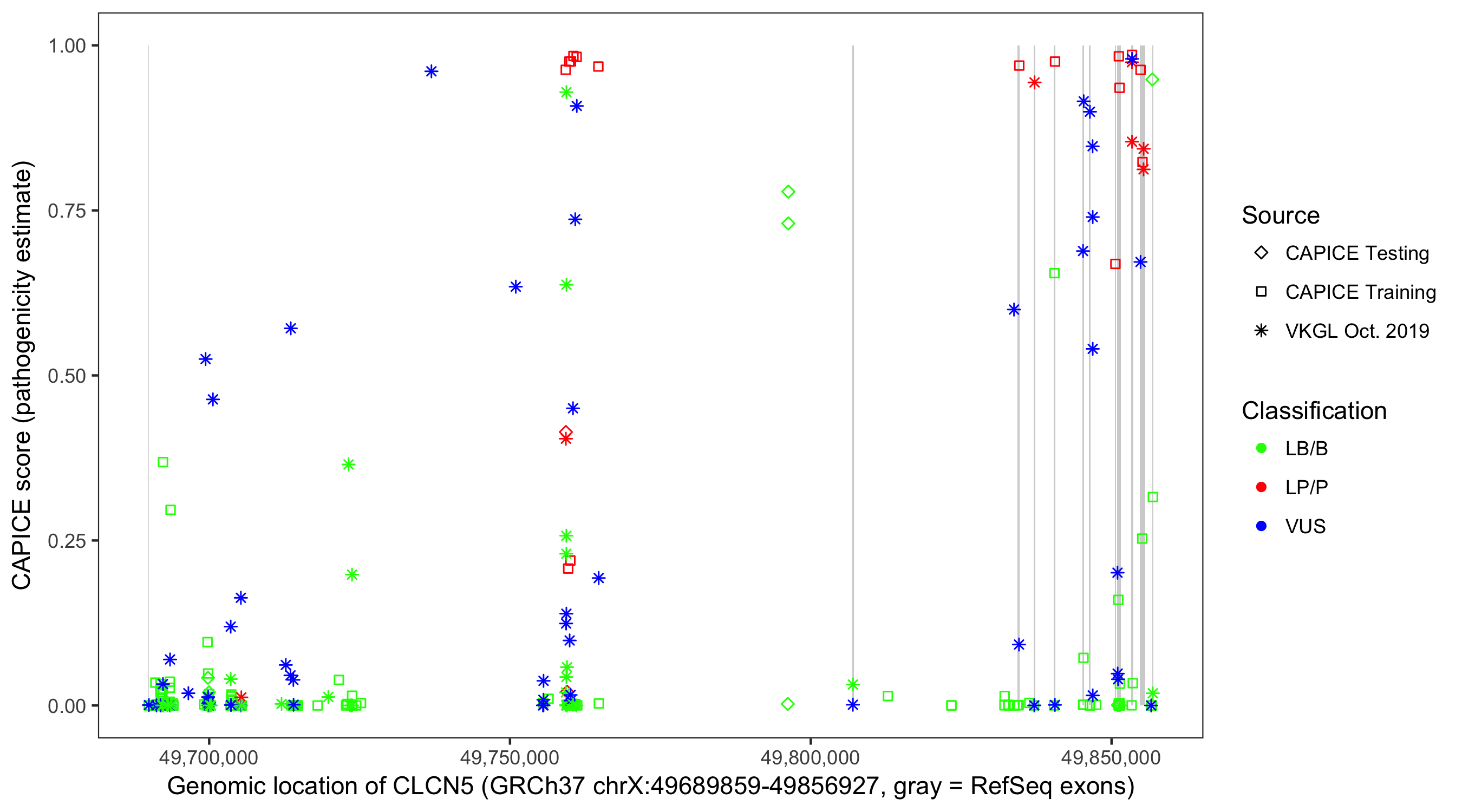 Shown are CAPICE train/test variants plus VKGL Oct 2019.