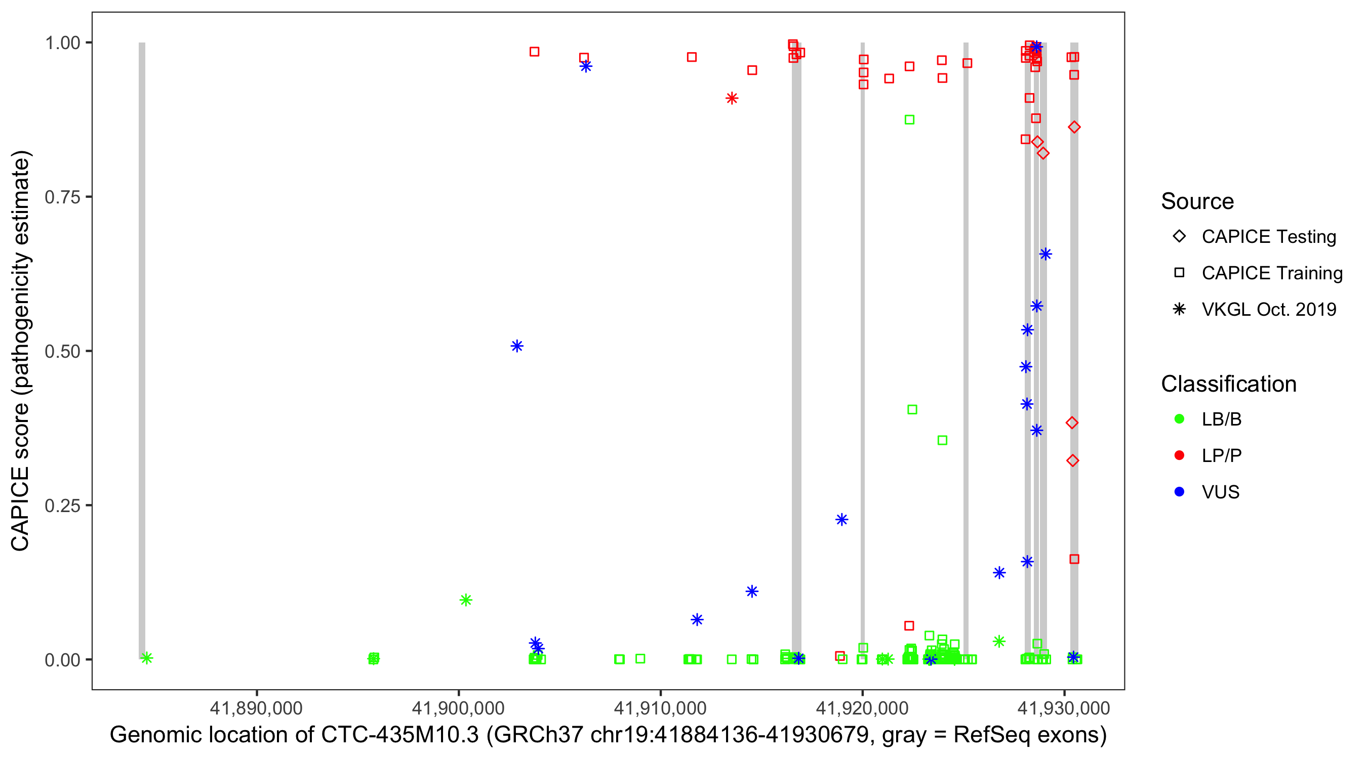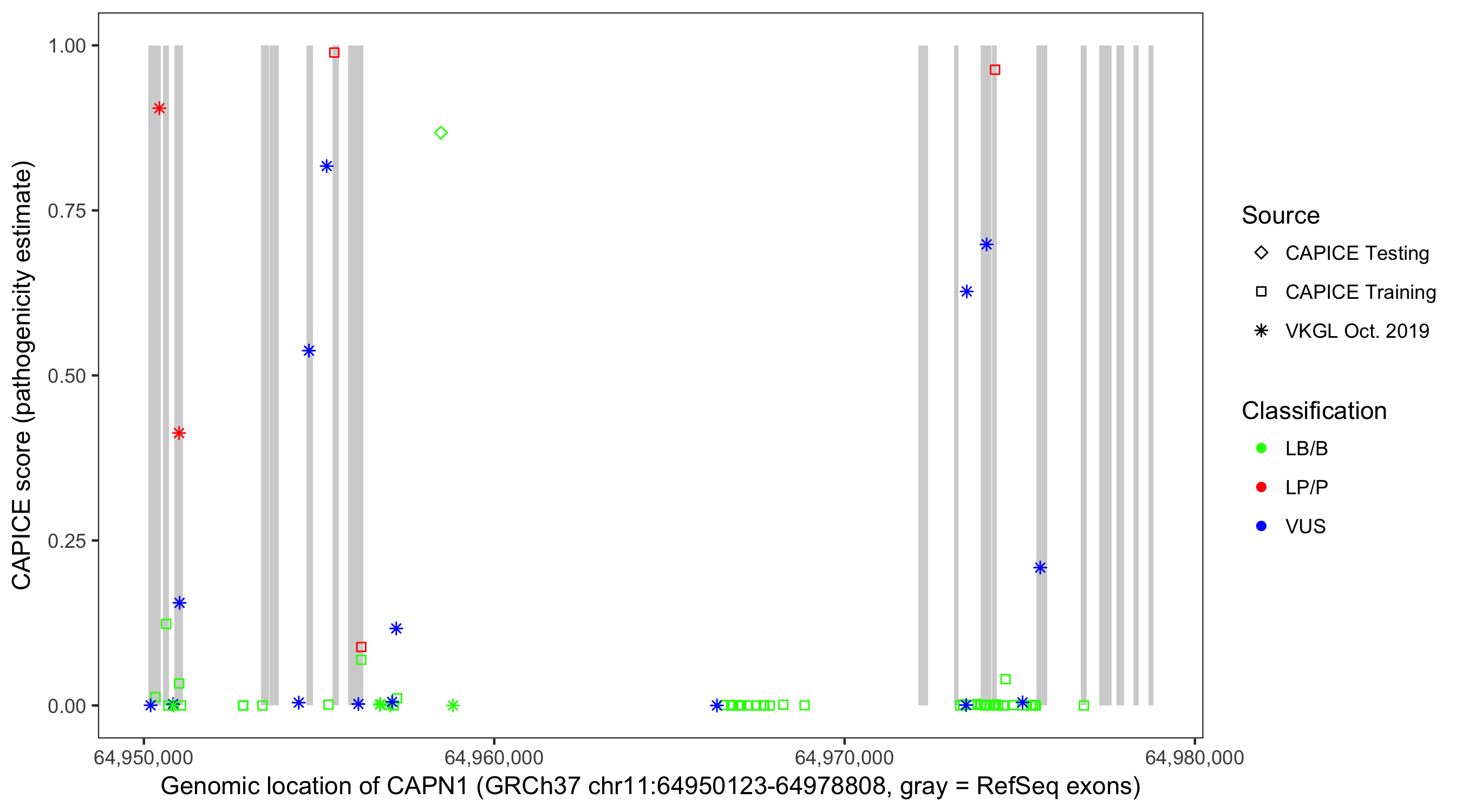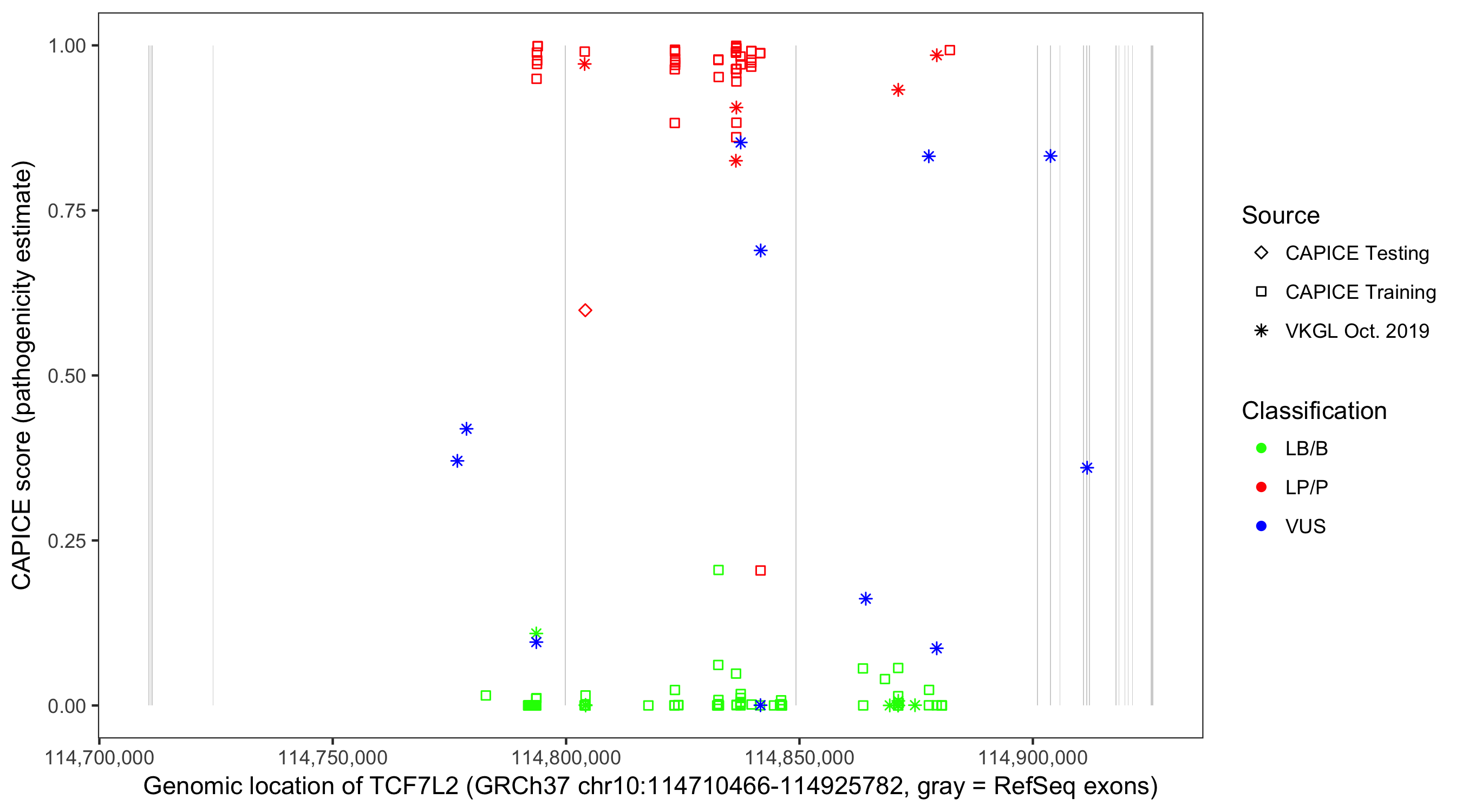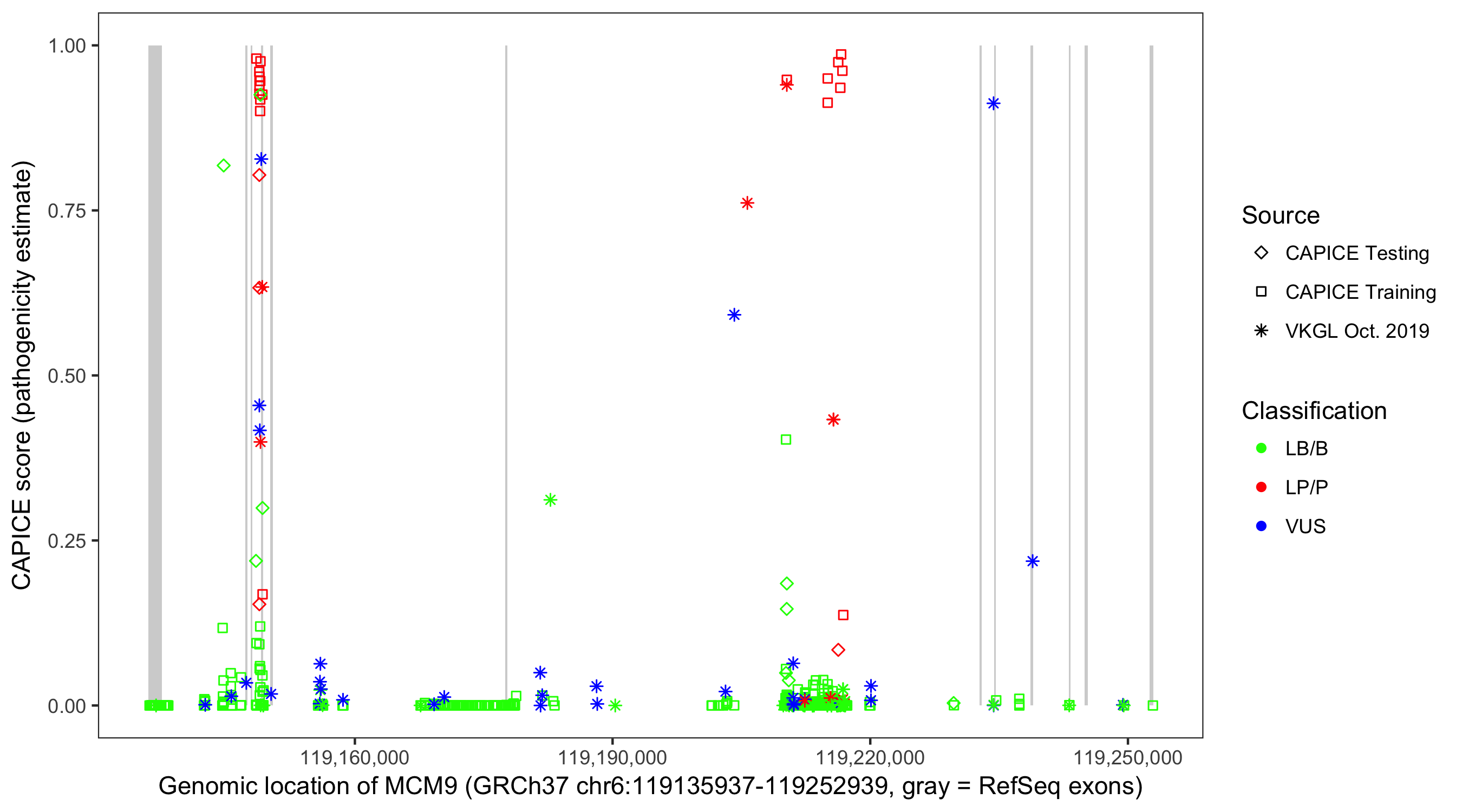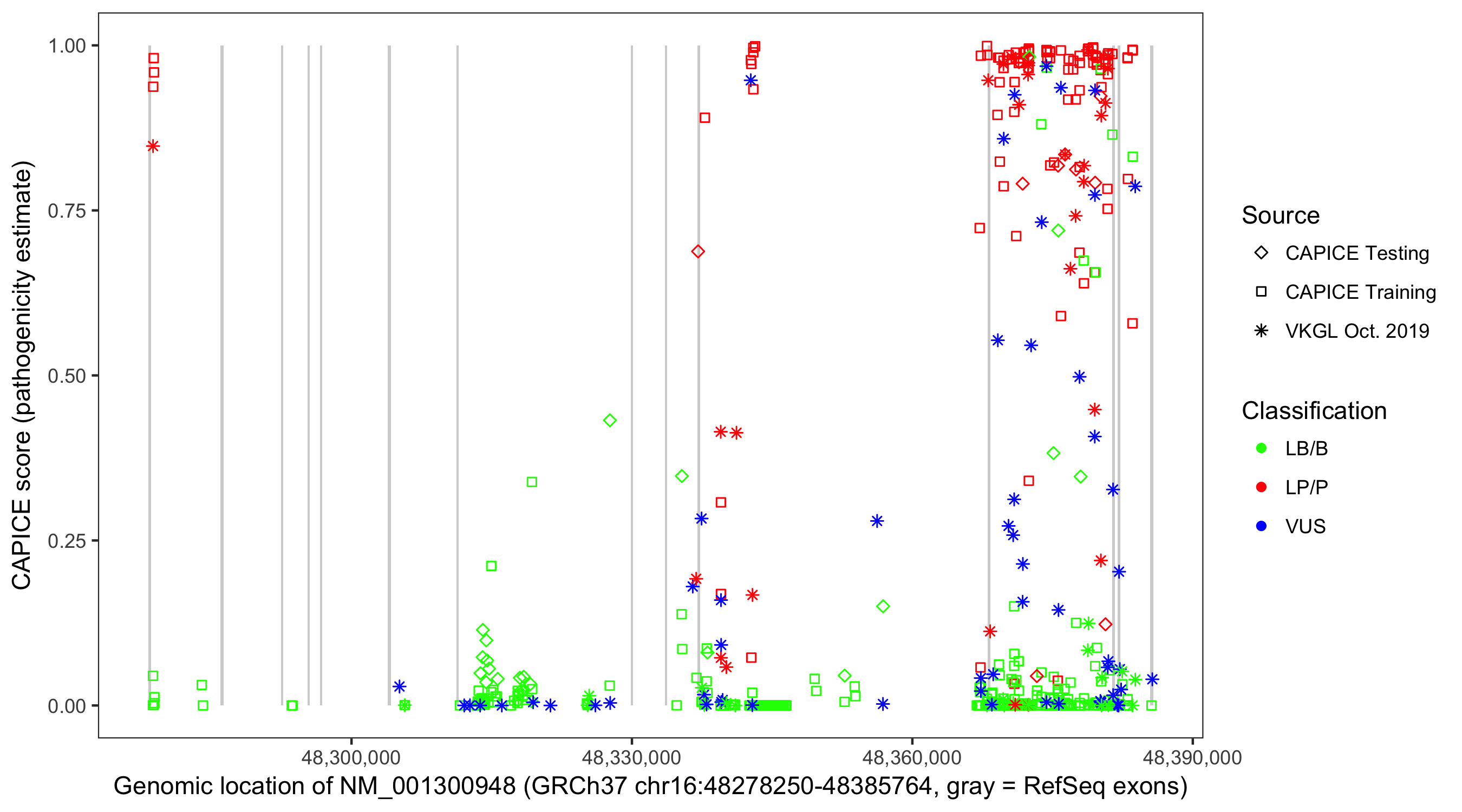 Shown are CAPICE train/test variants plus VKGL Oct 2019.