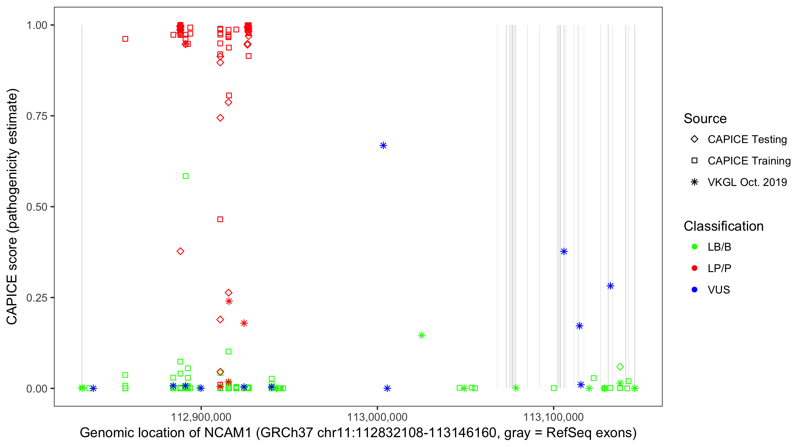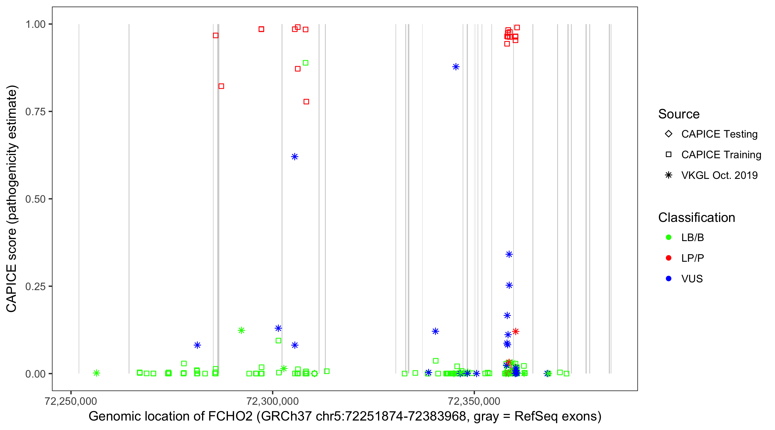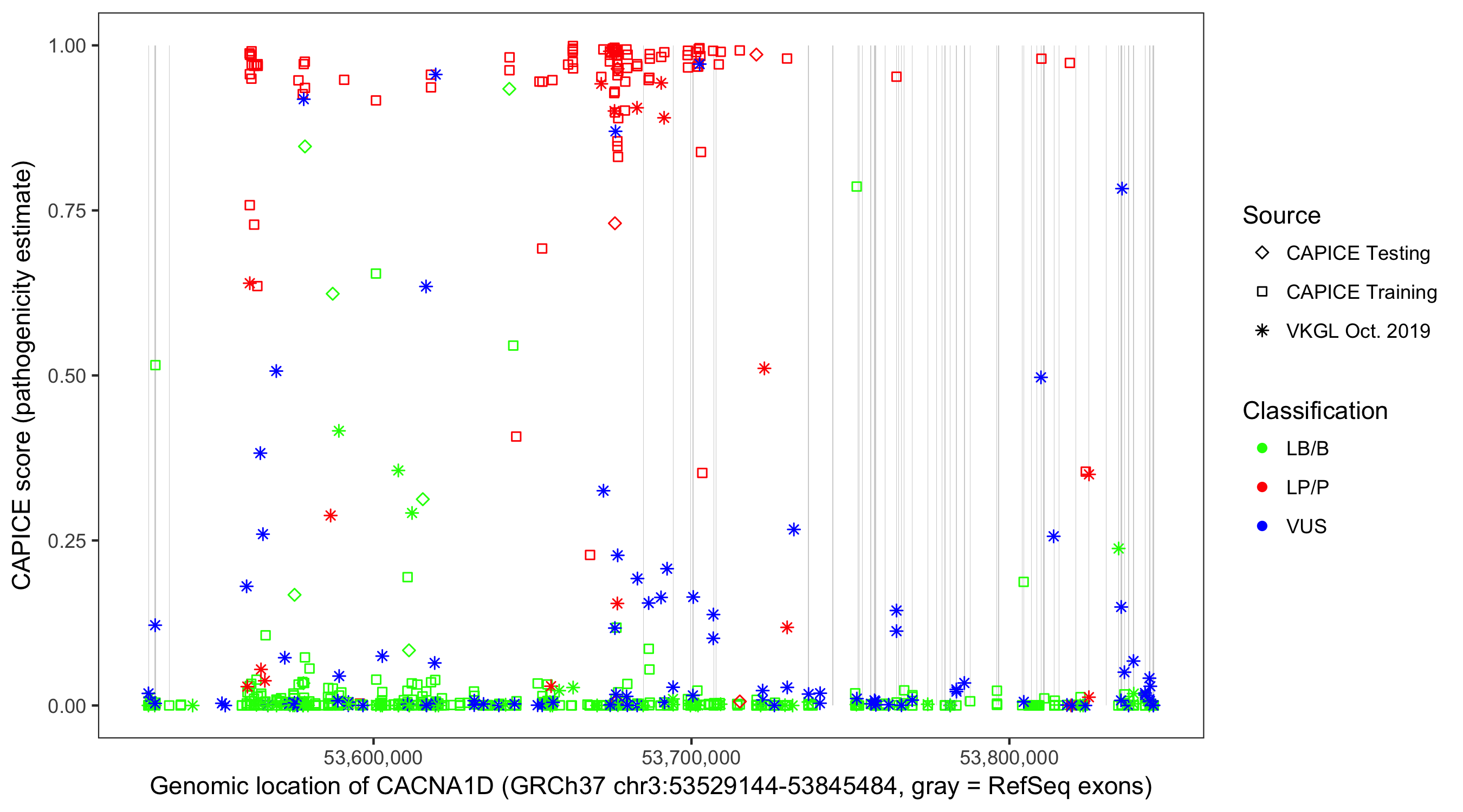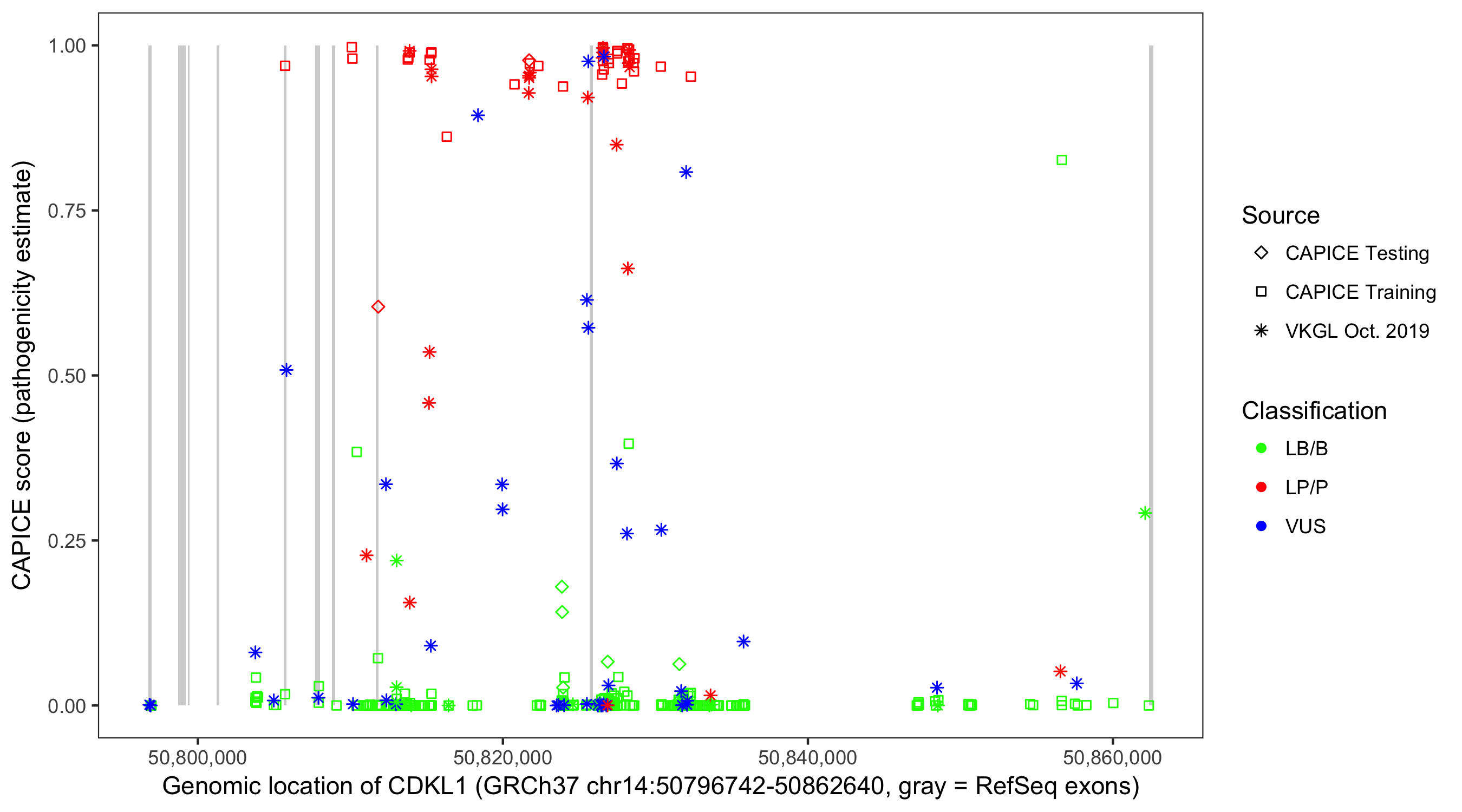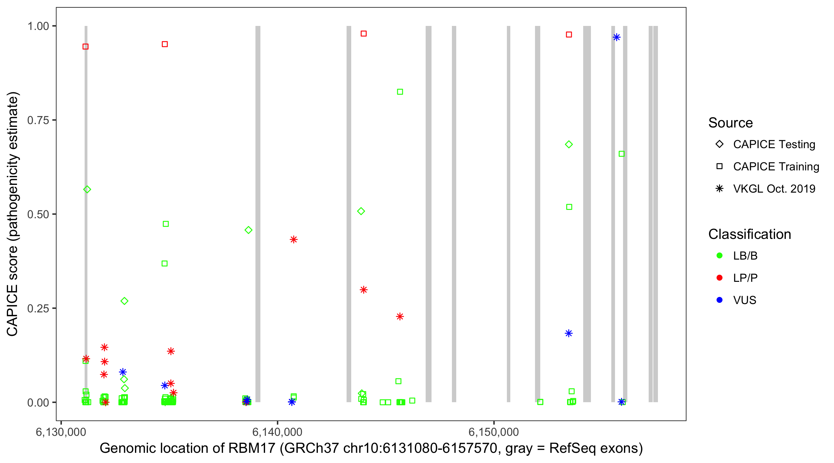 Shown are CAPICE train/test variants plus VKGL Oct 2019.