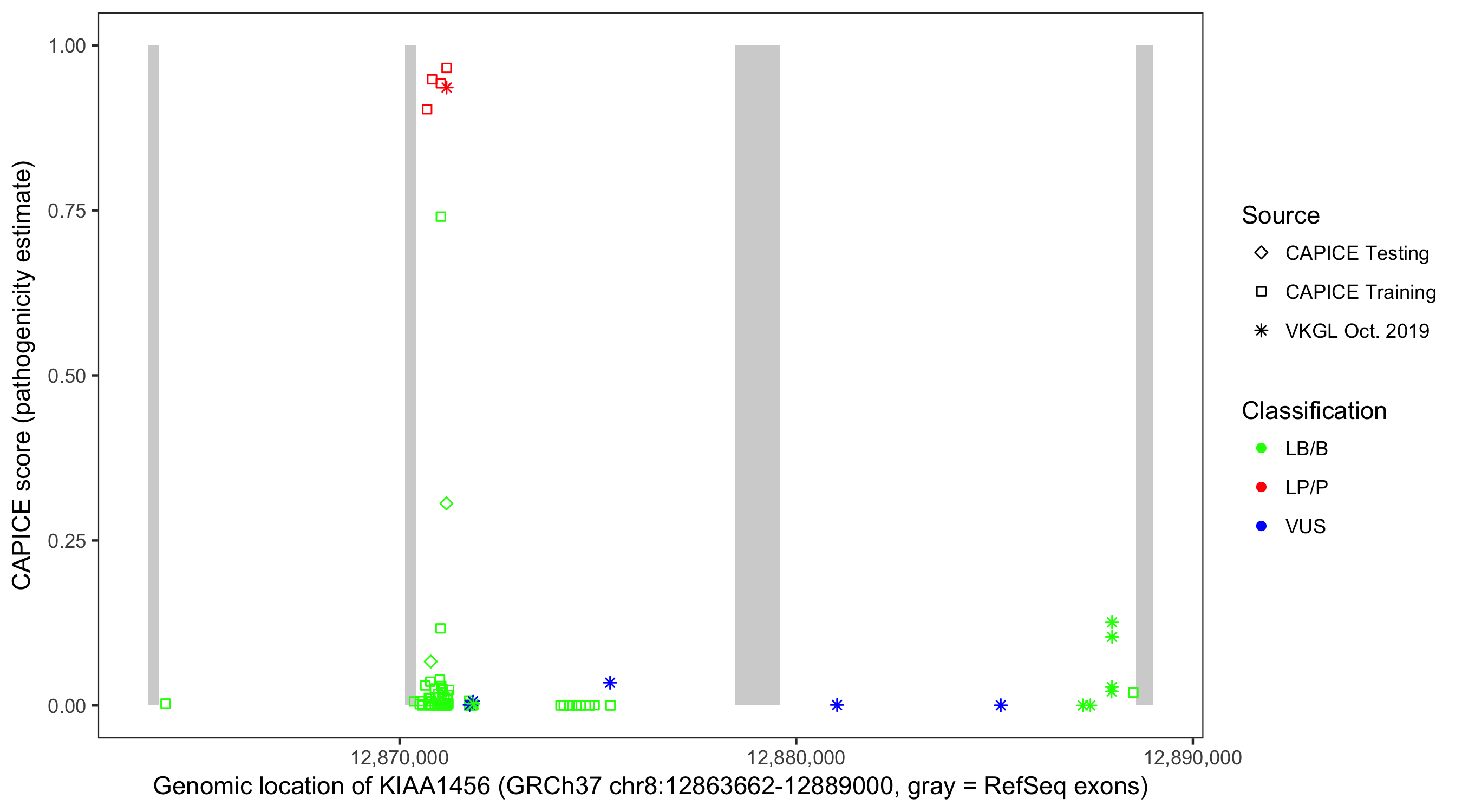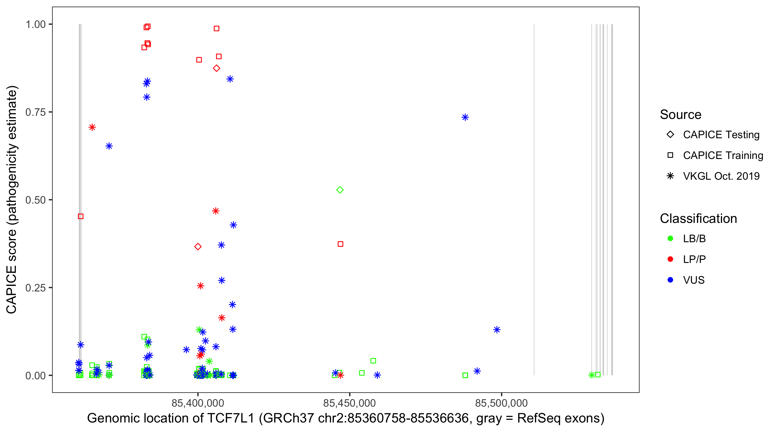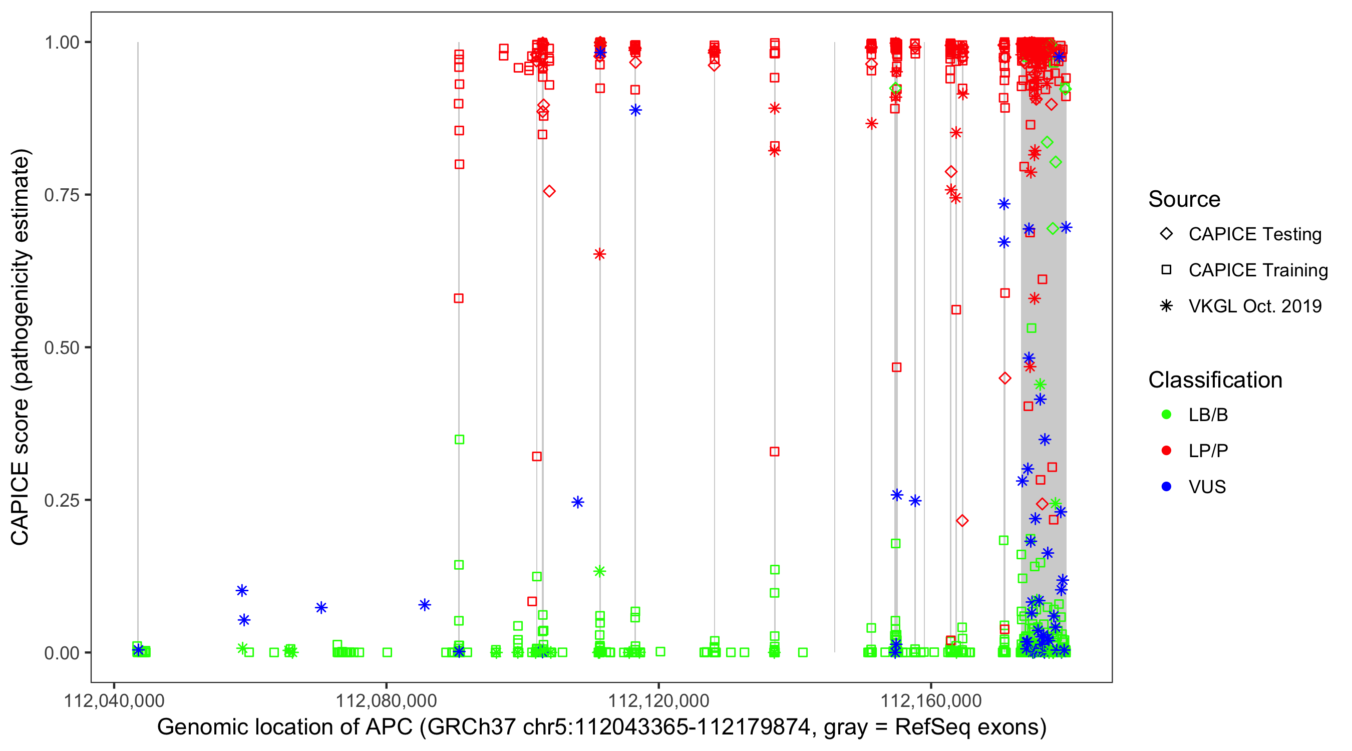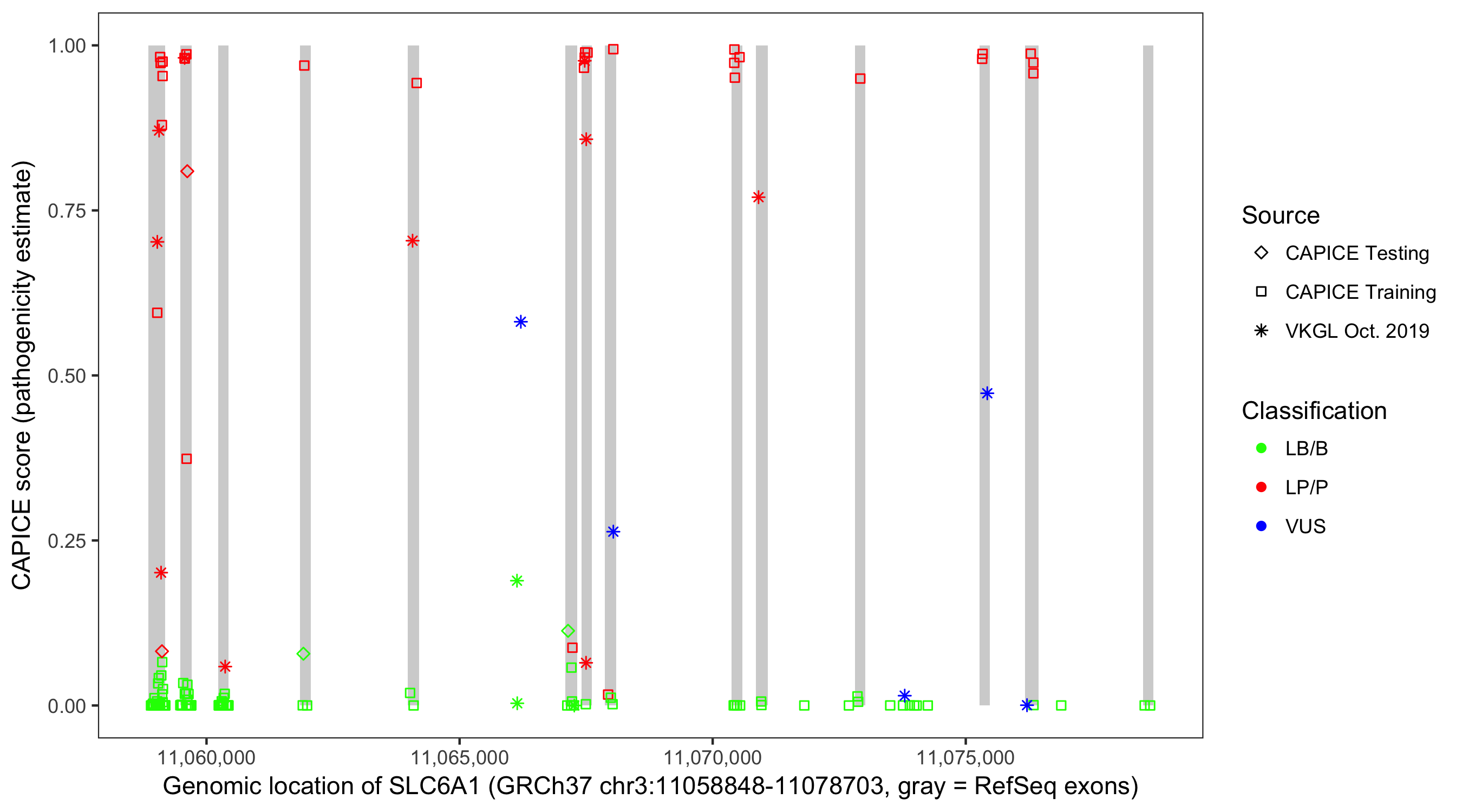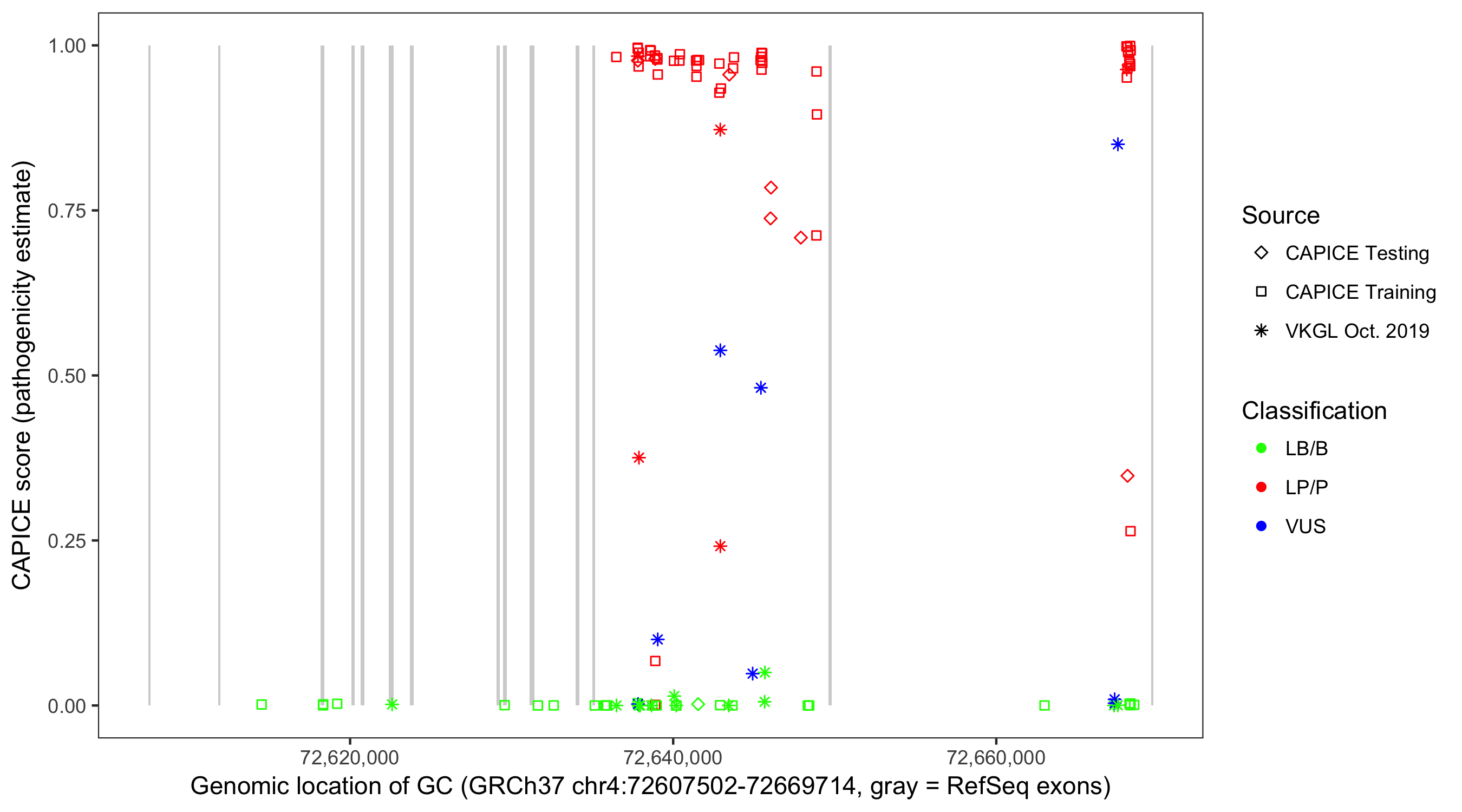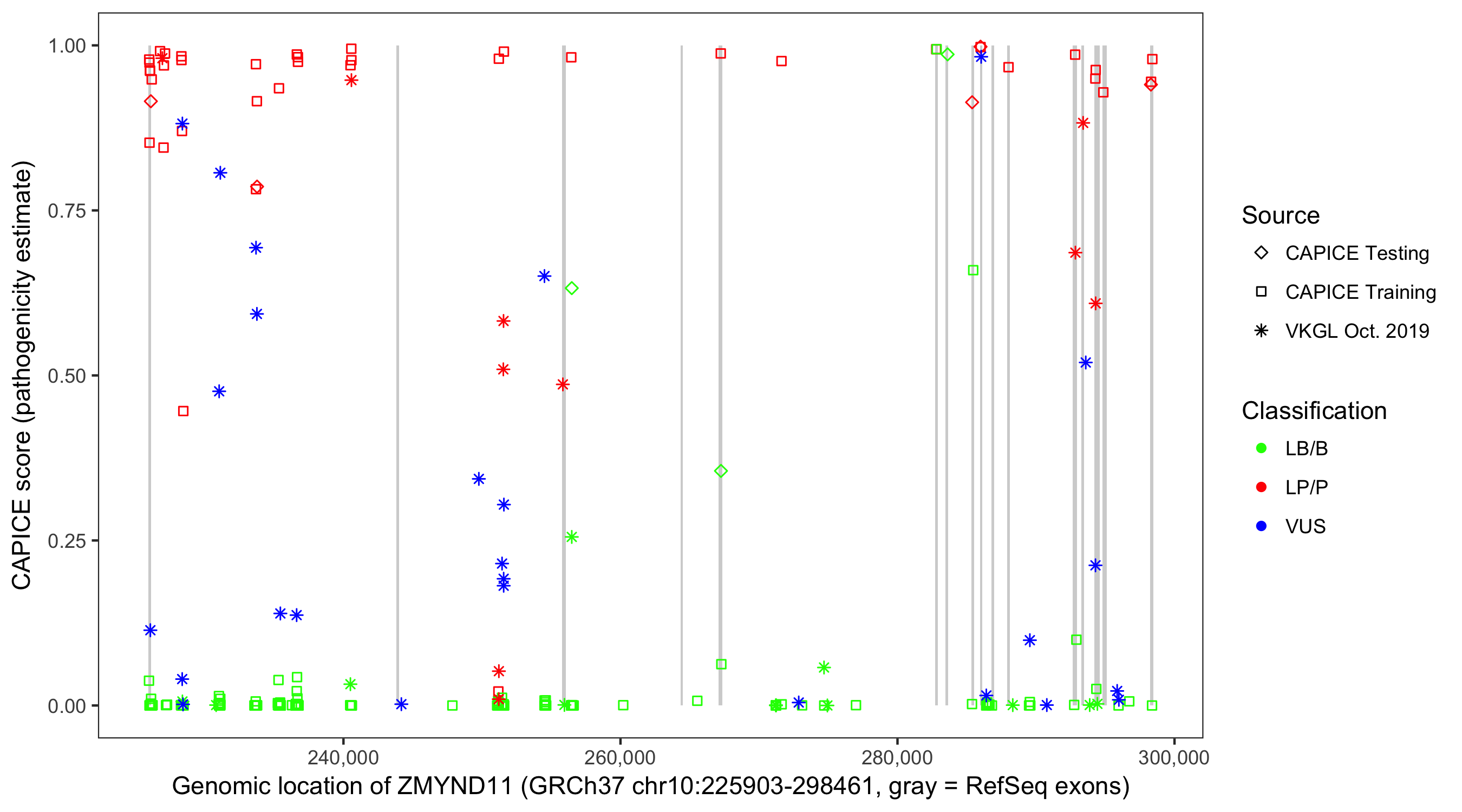 Shown are CAPICE train/test variants plus VKGL Oct 2019.