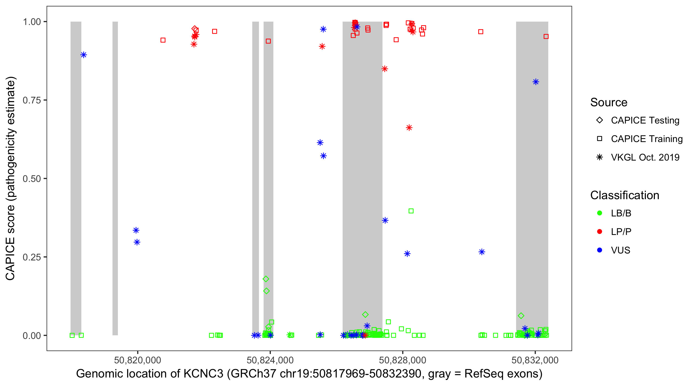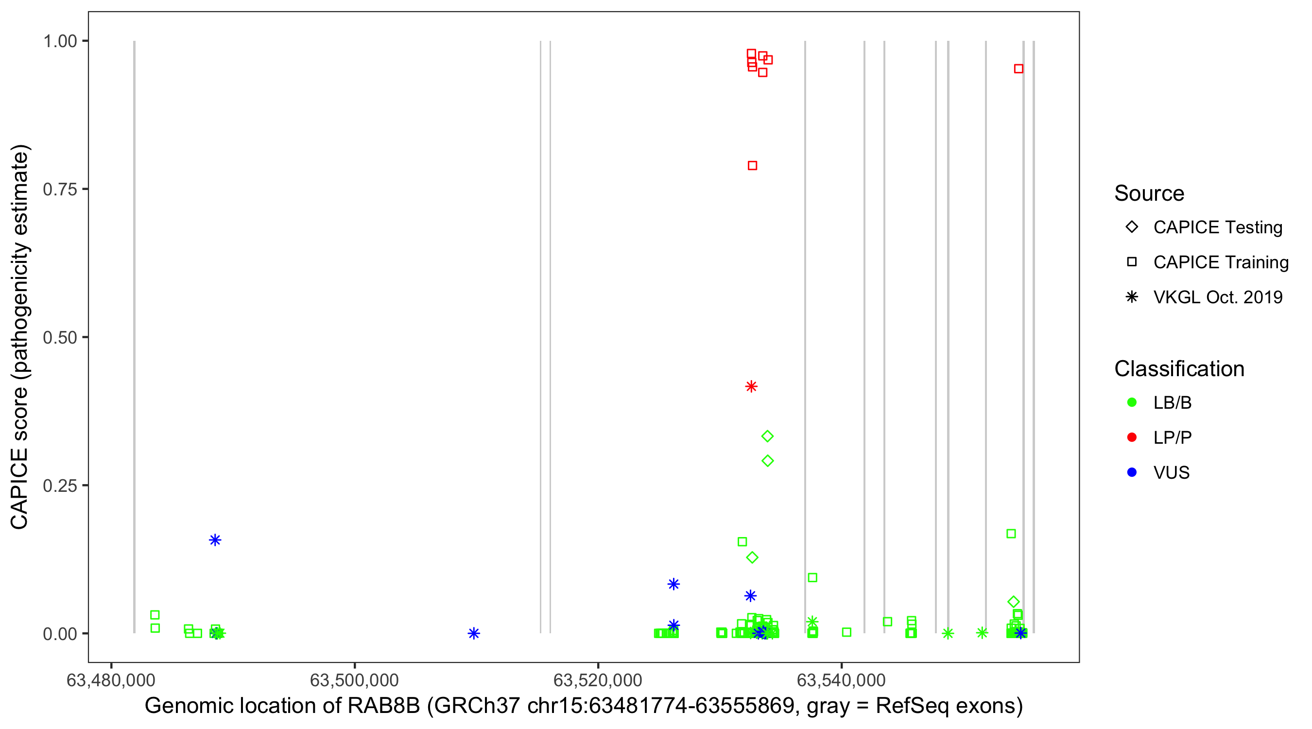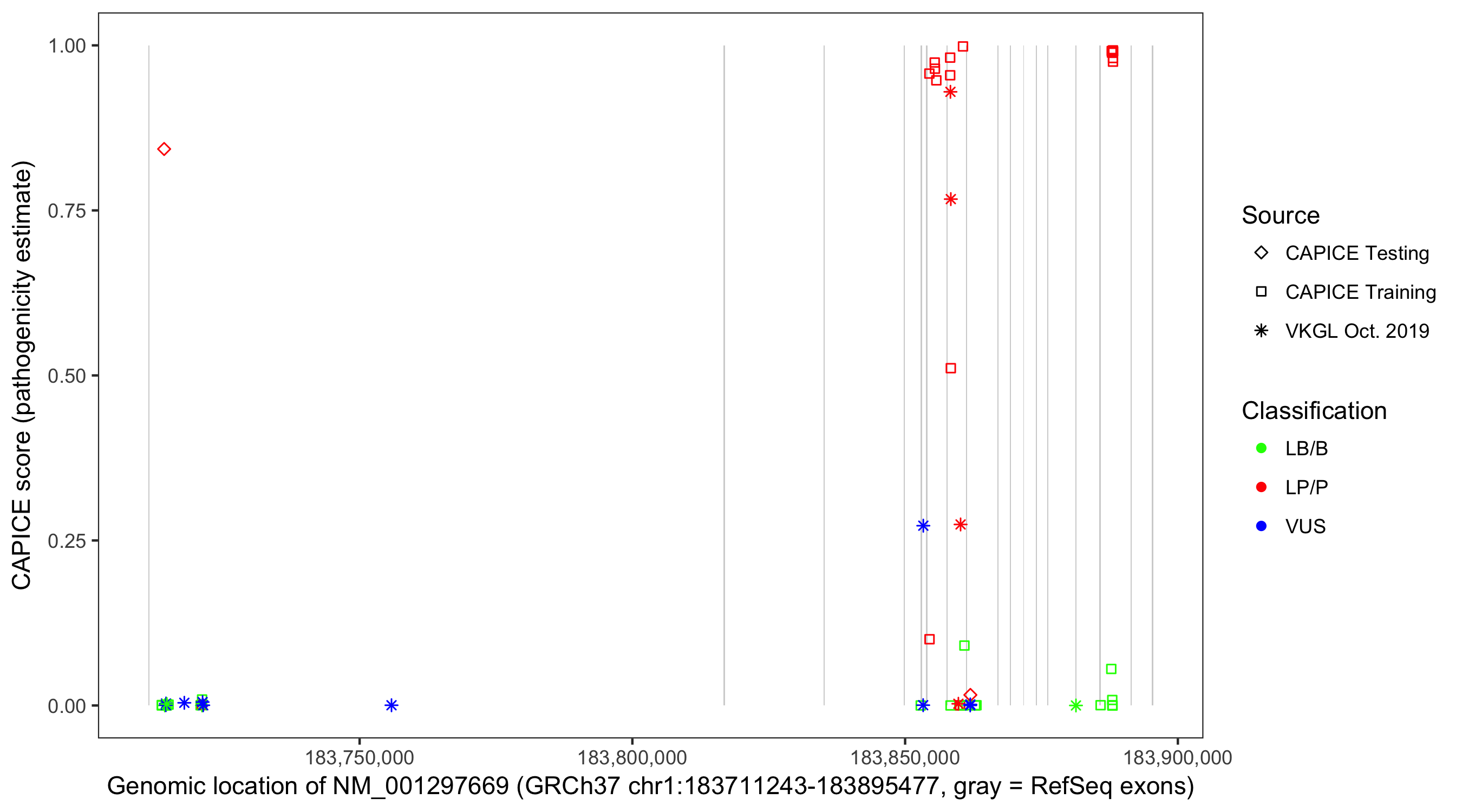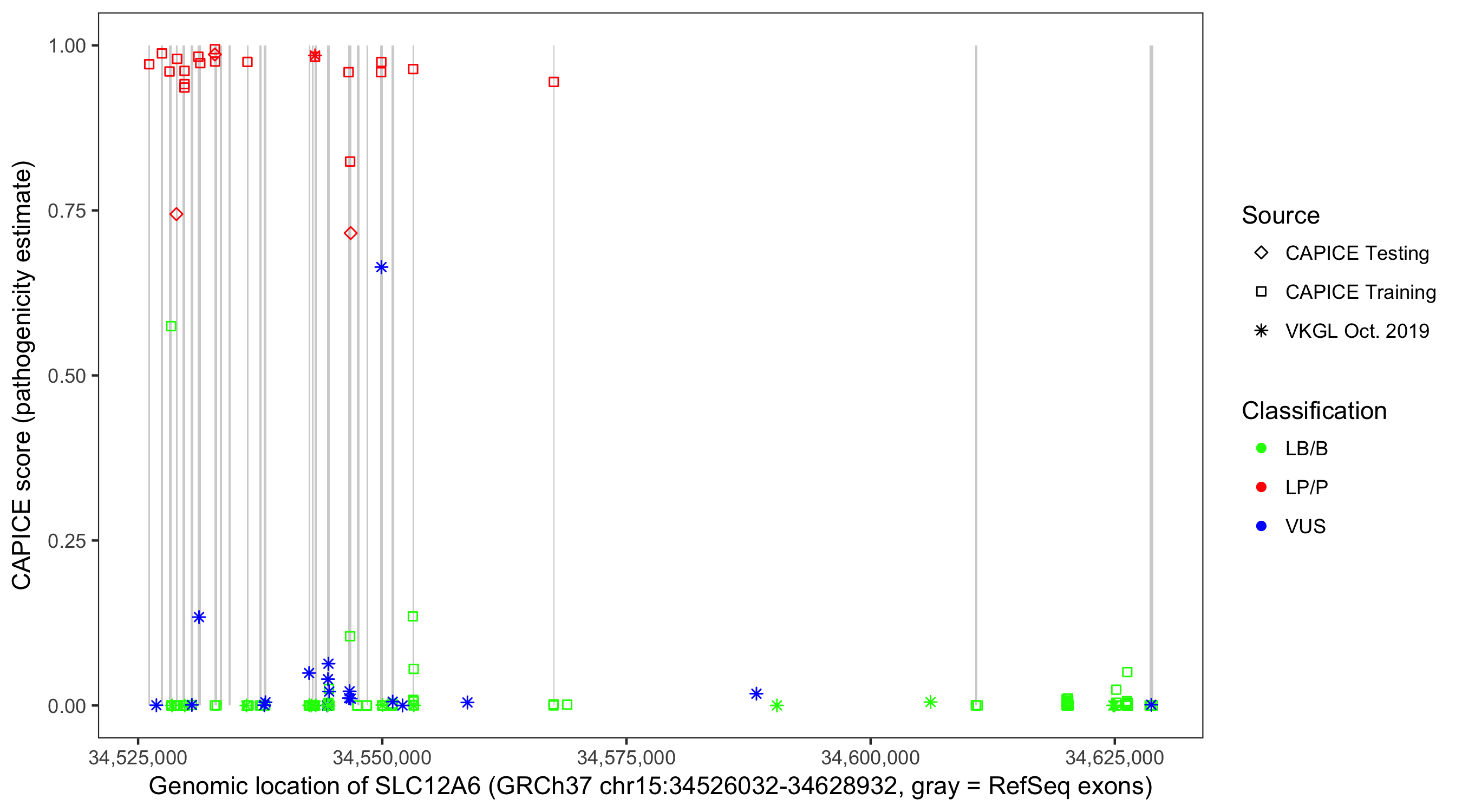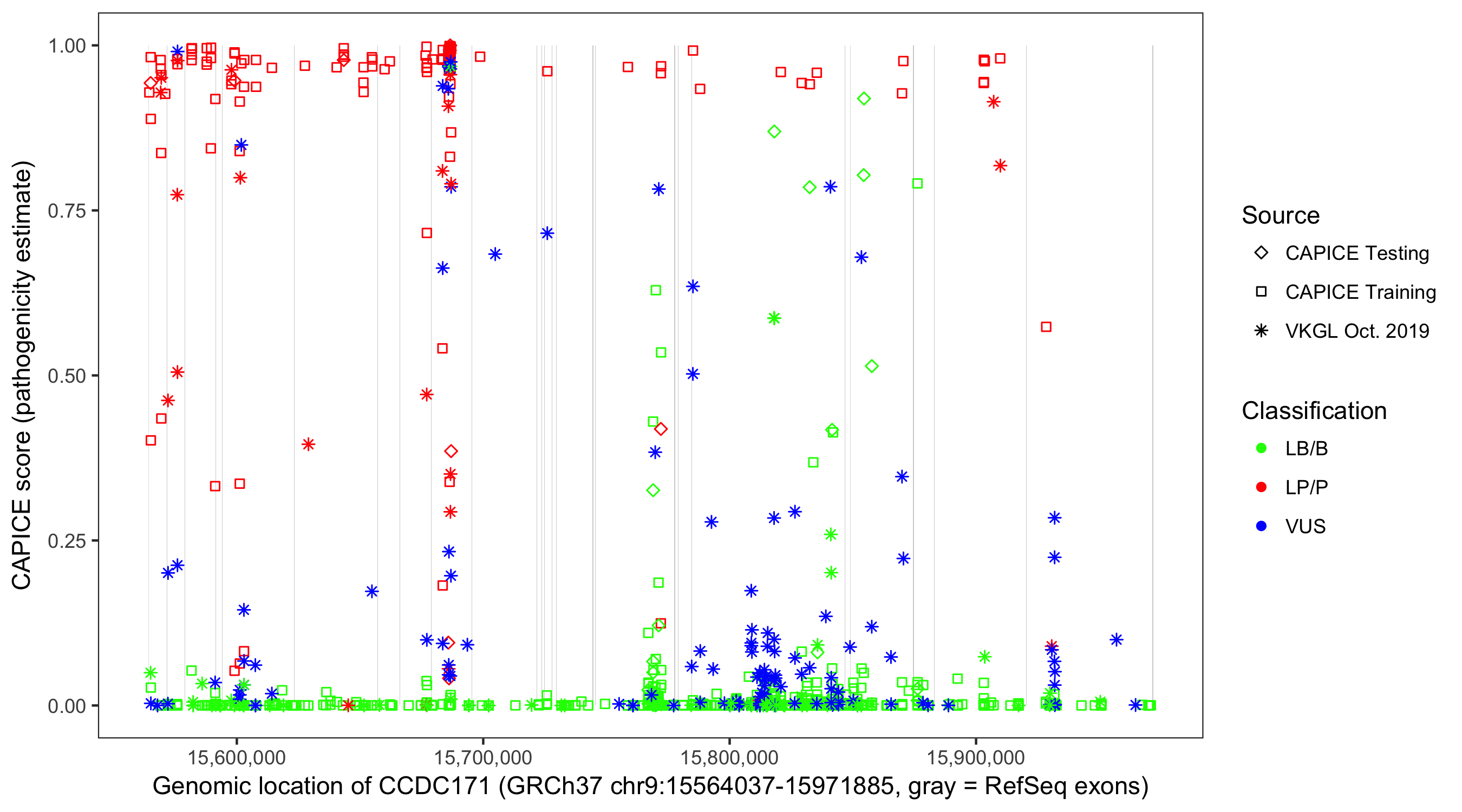 Shown are CAPICE train/test variants plus VKGL Oct 2019.