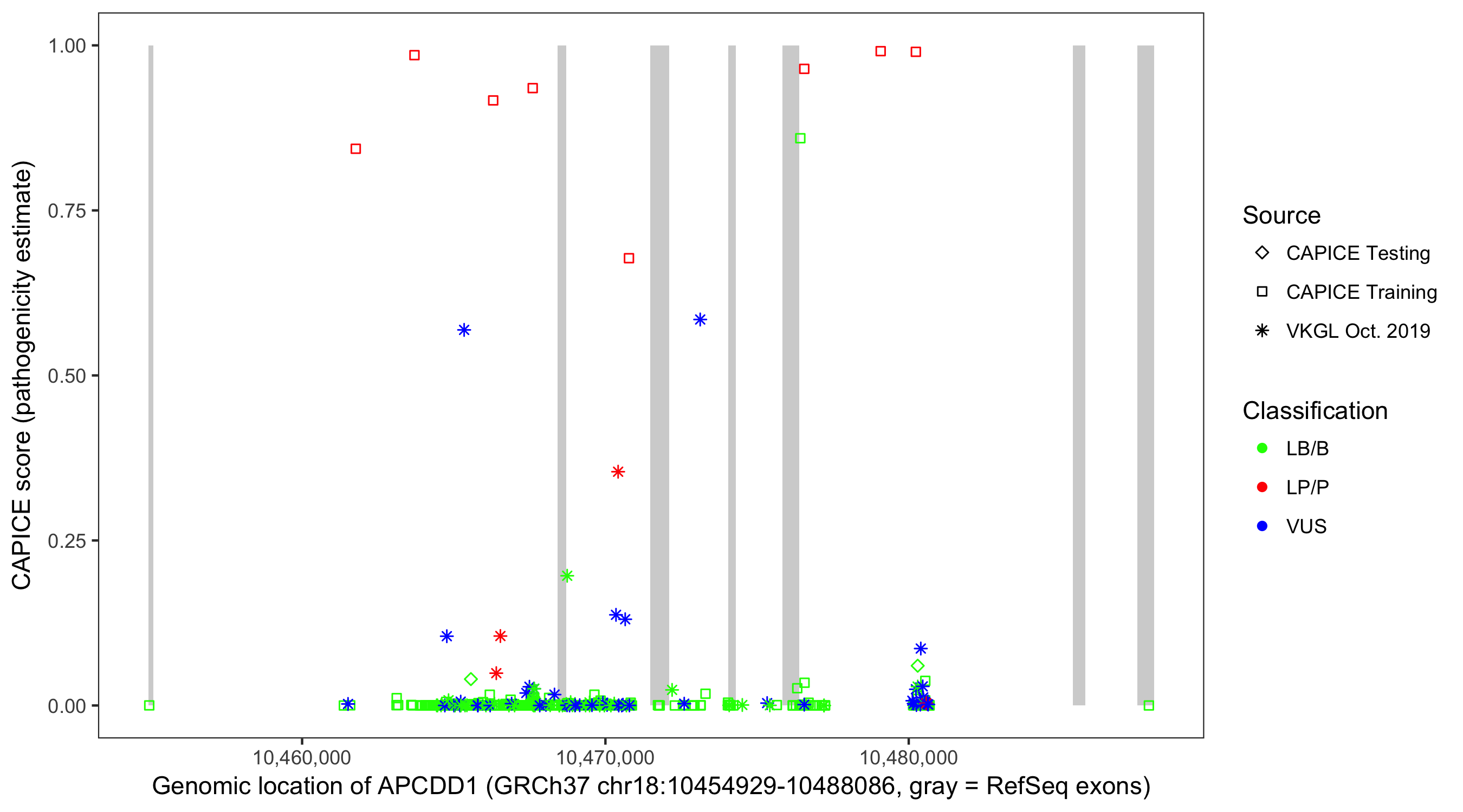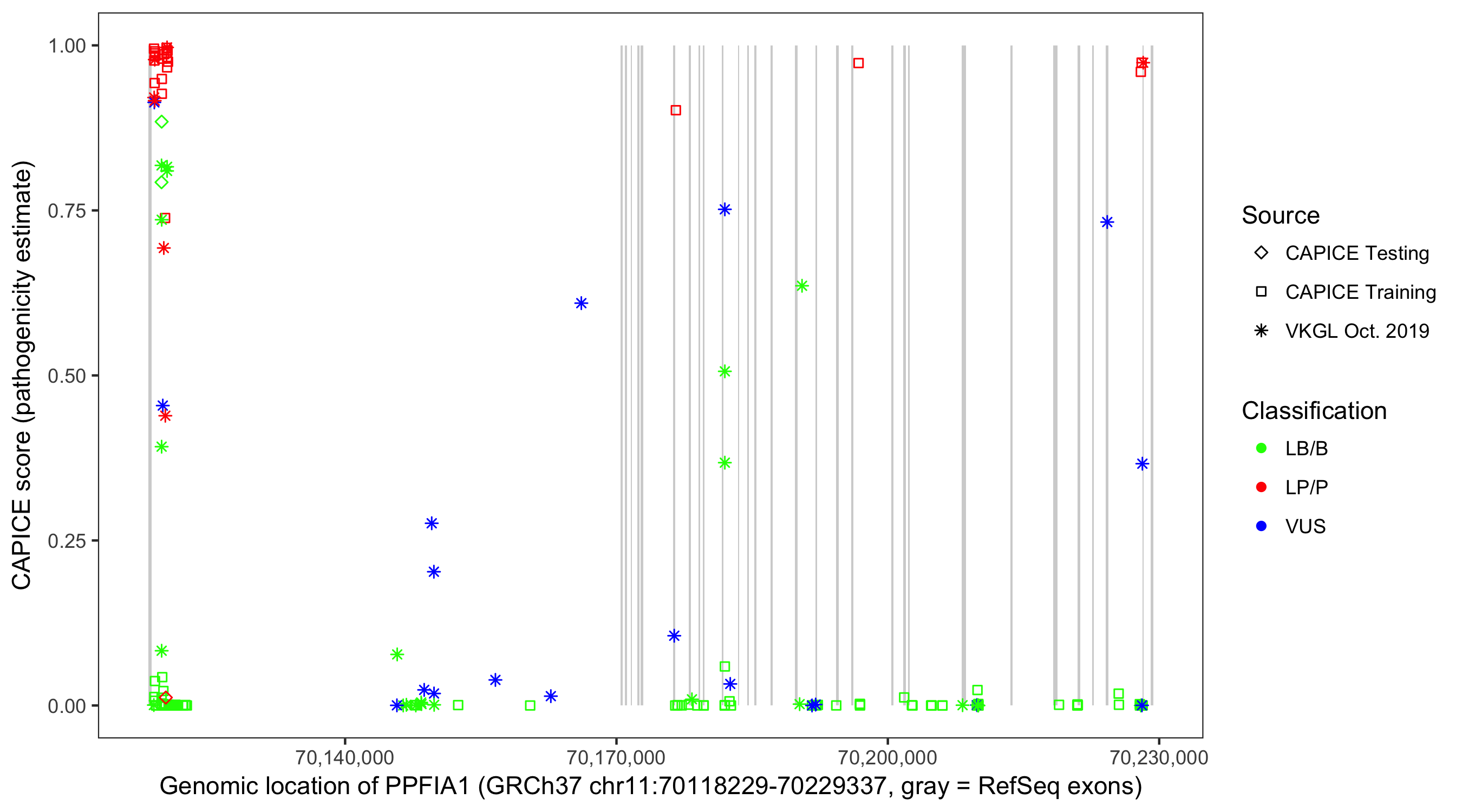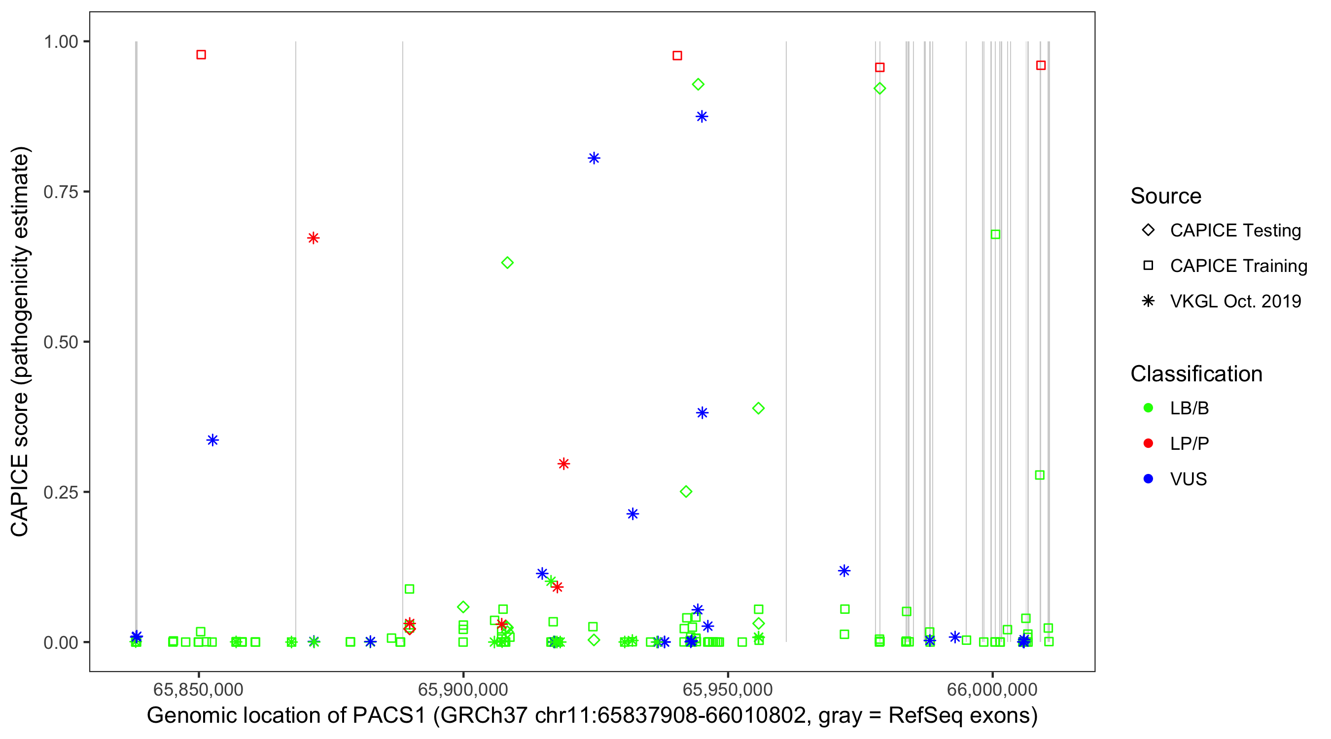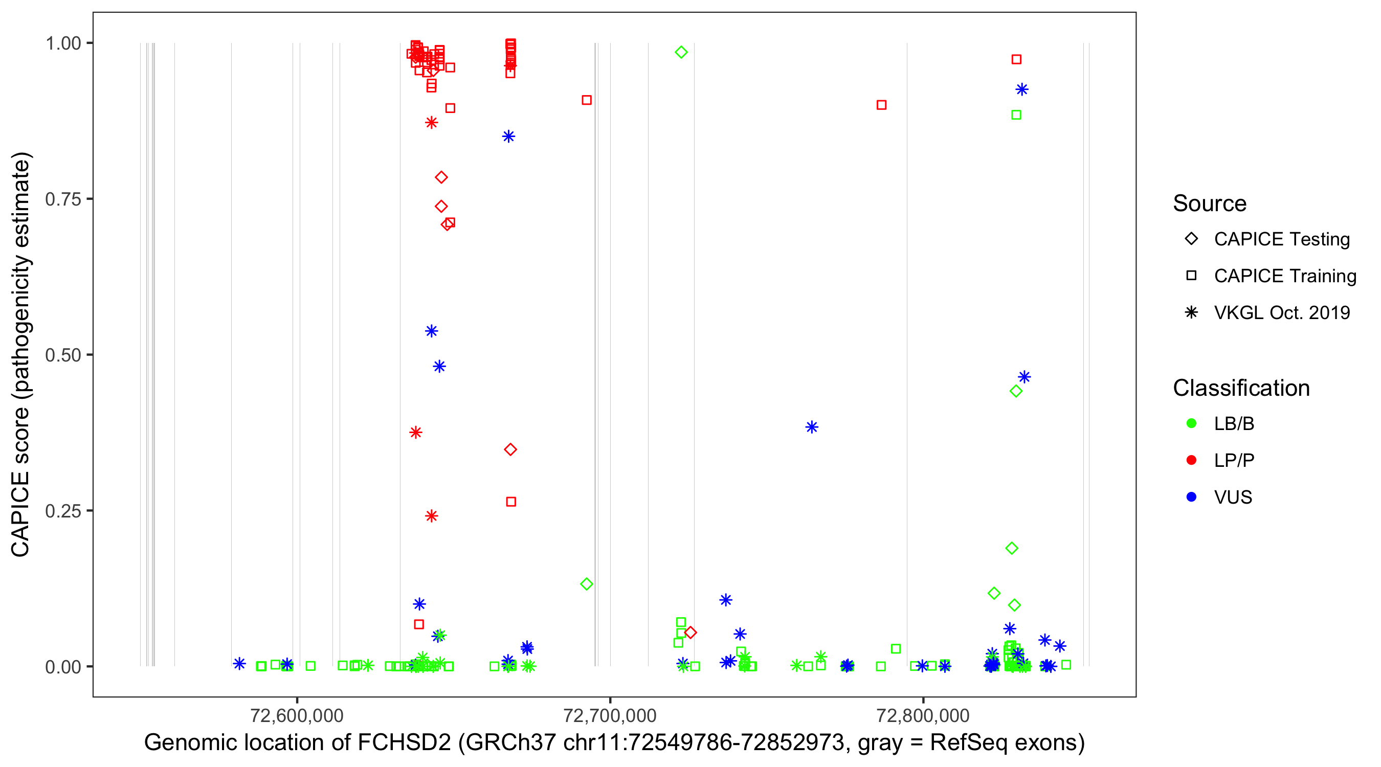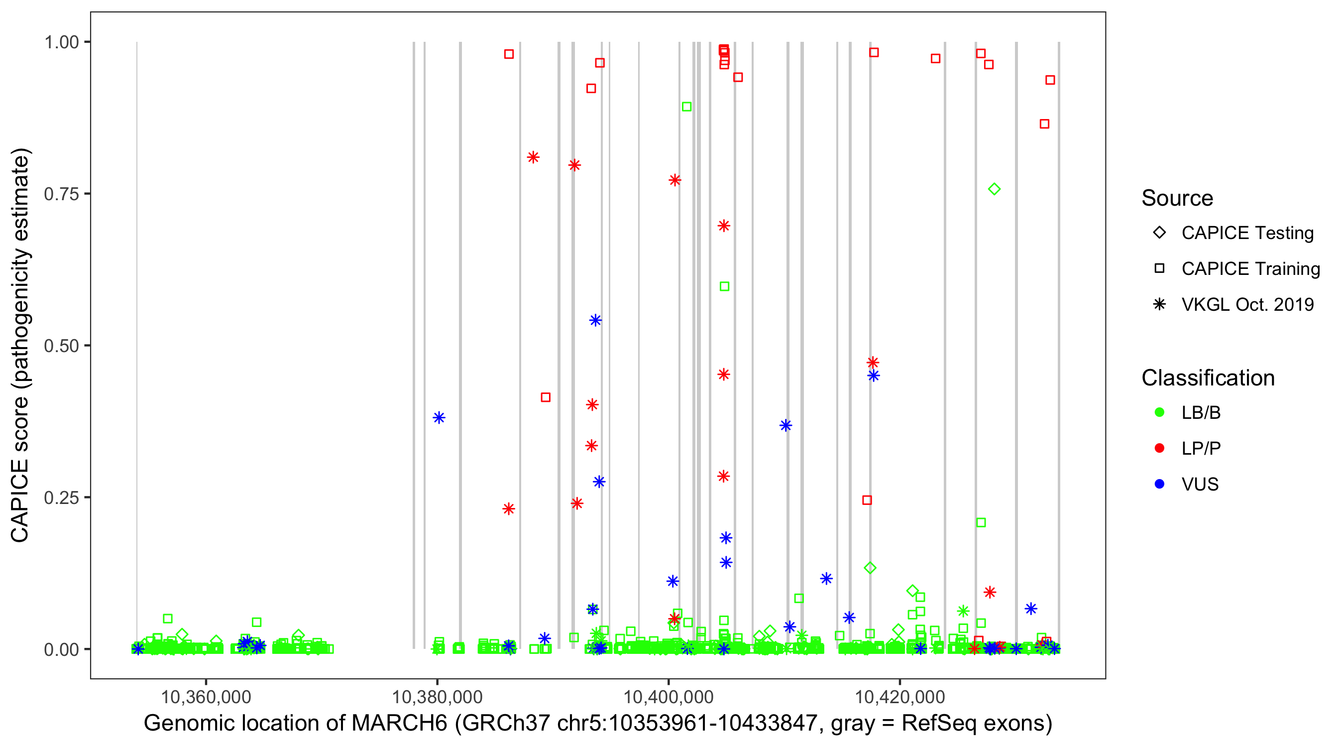 Shown are CAPICE train/test variants plus VKGL Oct 2019.