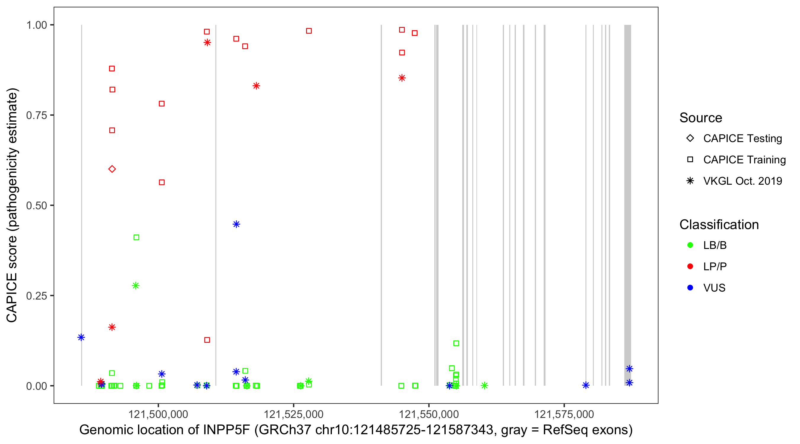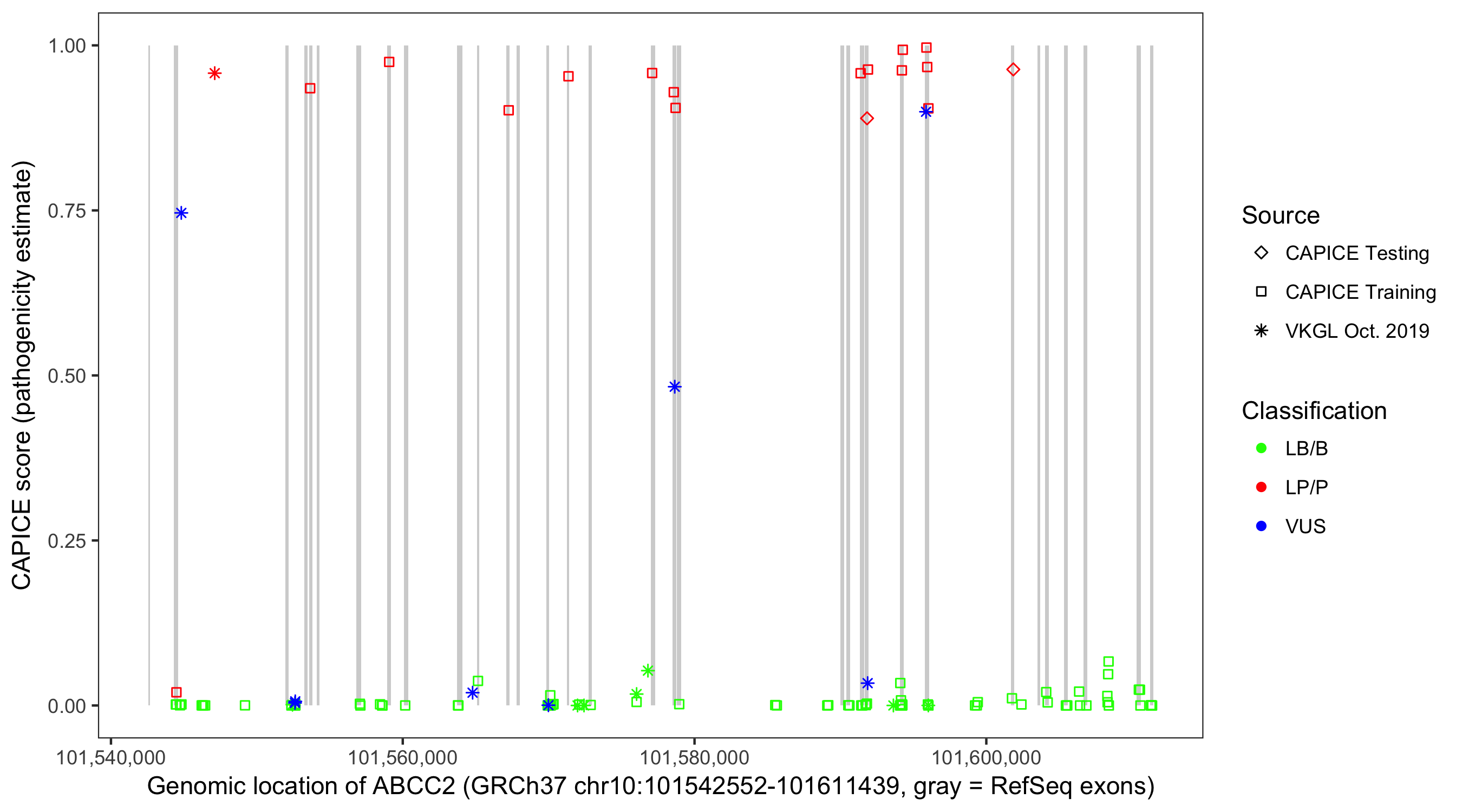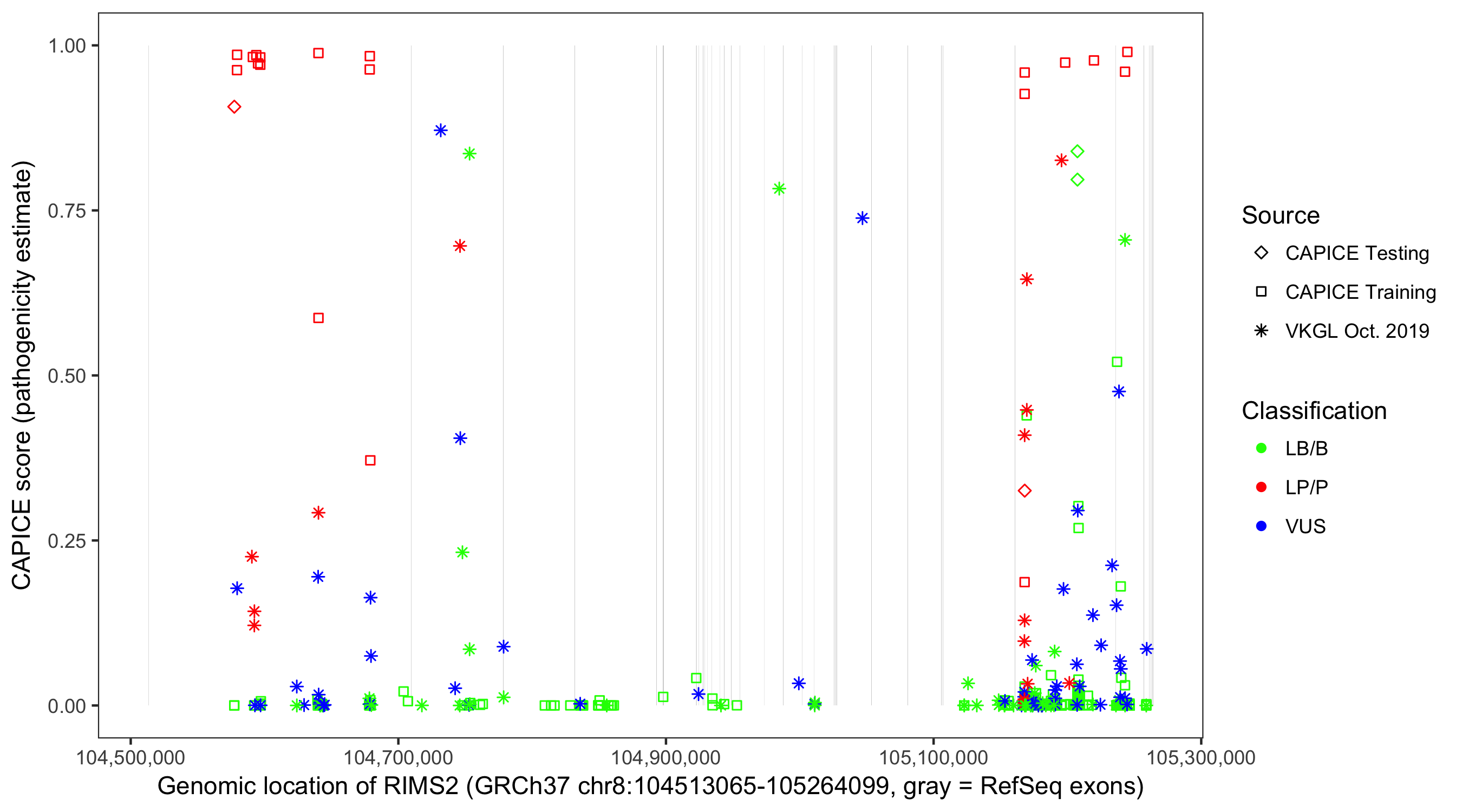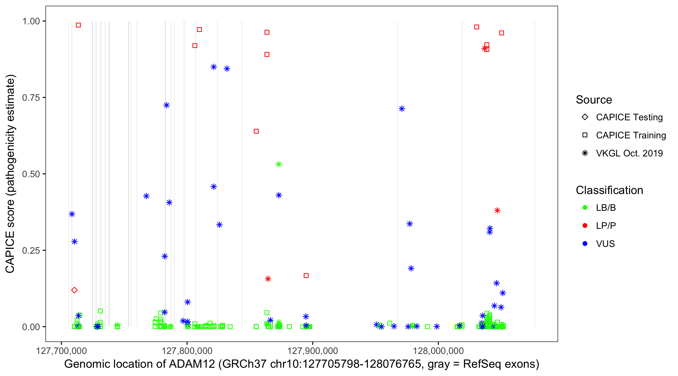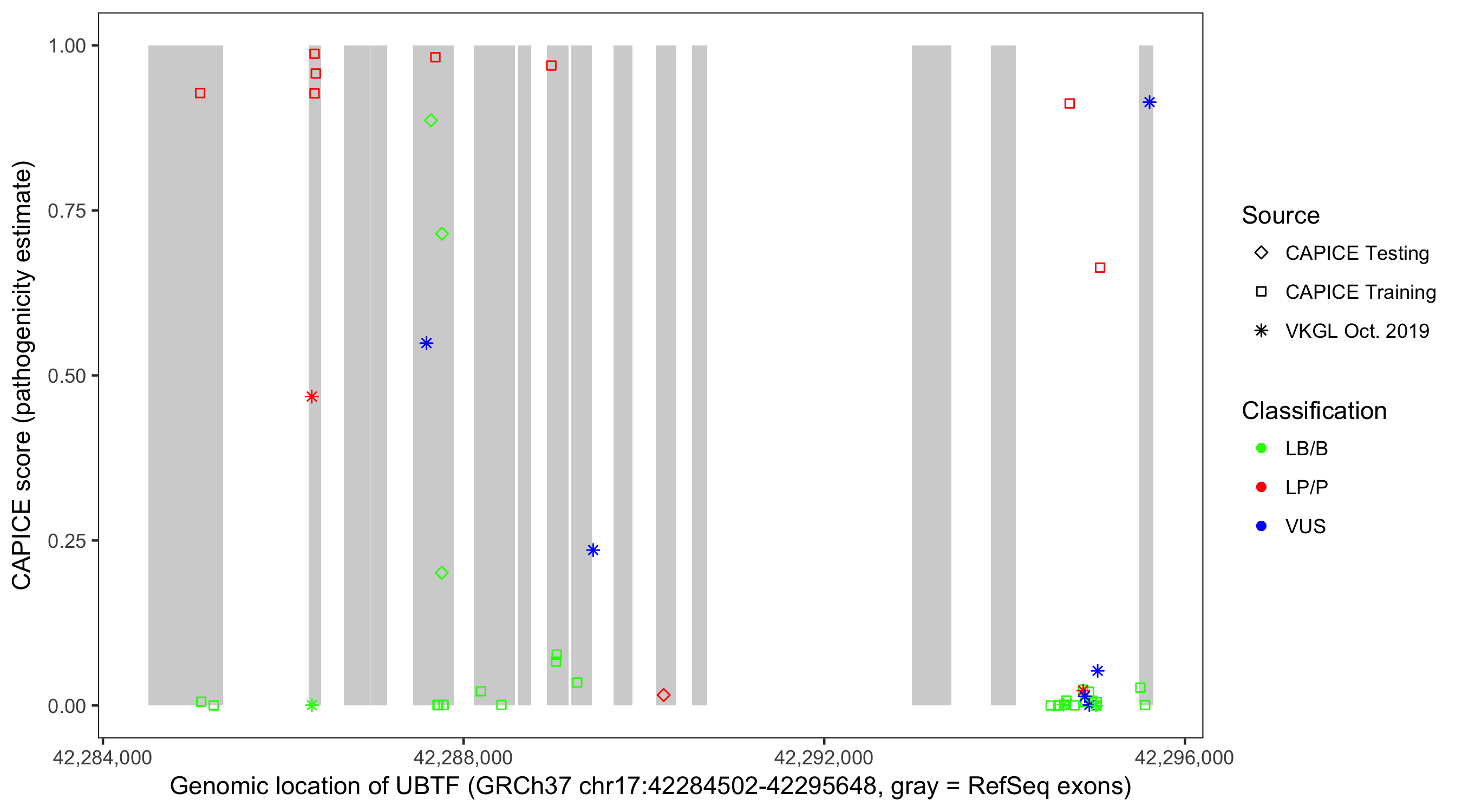 Shown are CAPICE train/test variants plus VKGL Oct 2019.