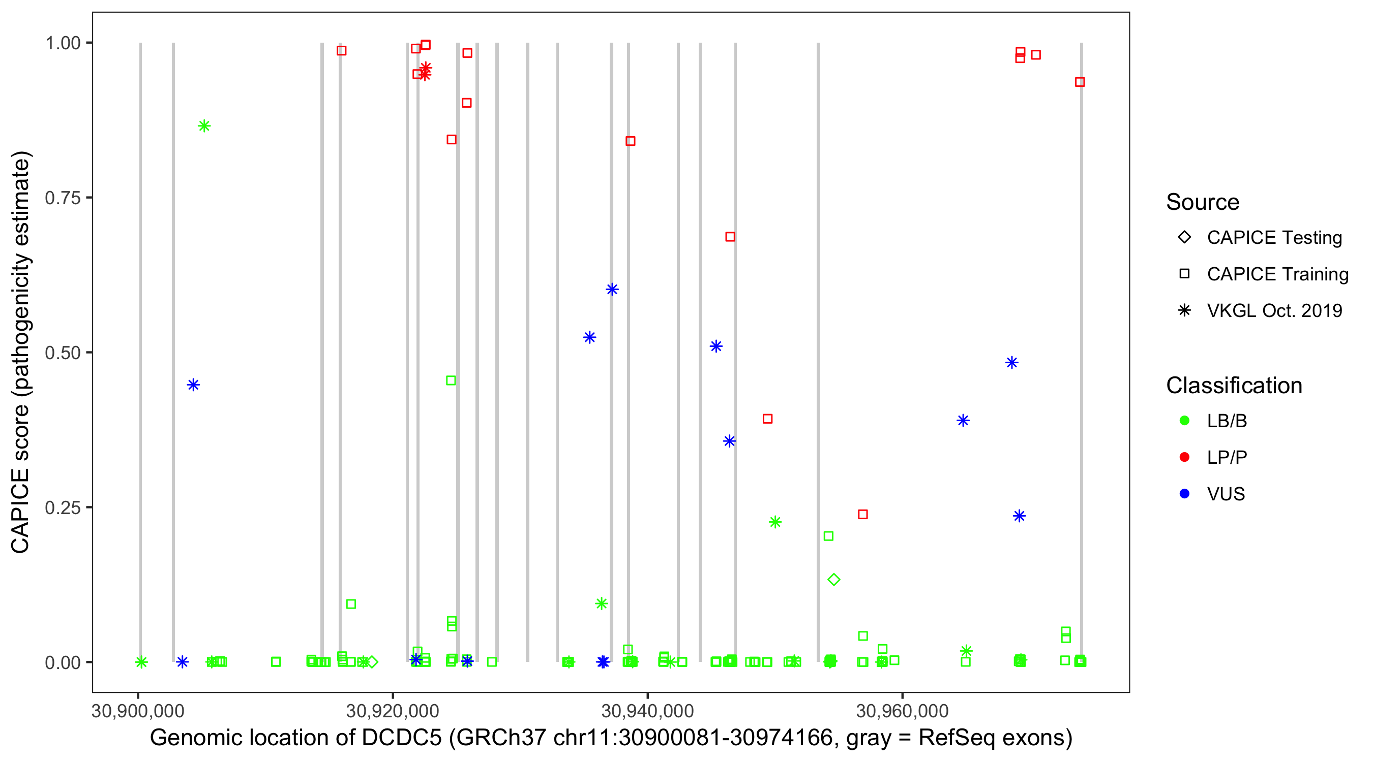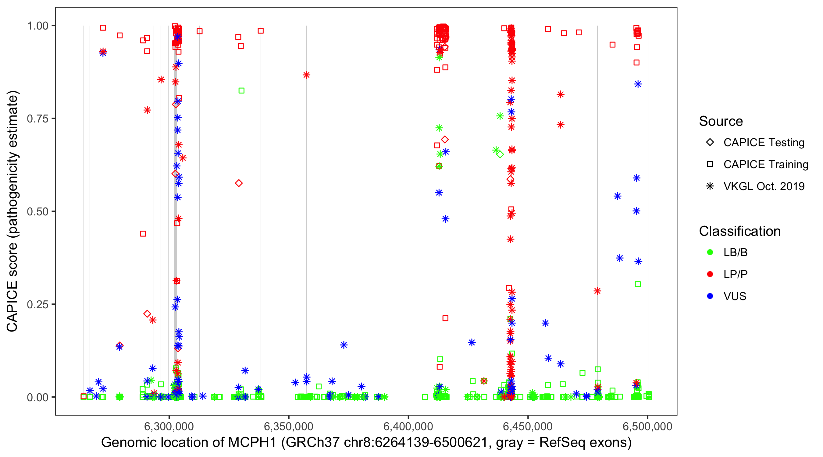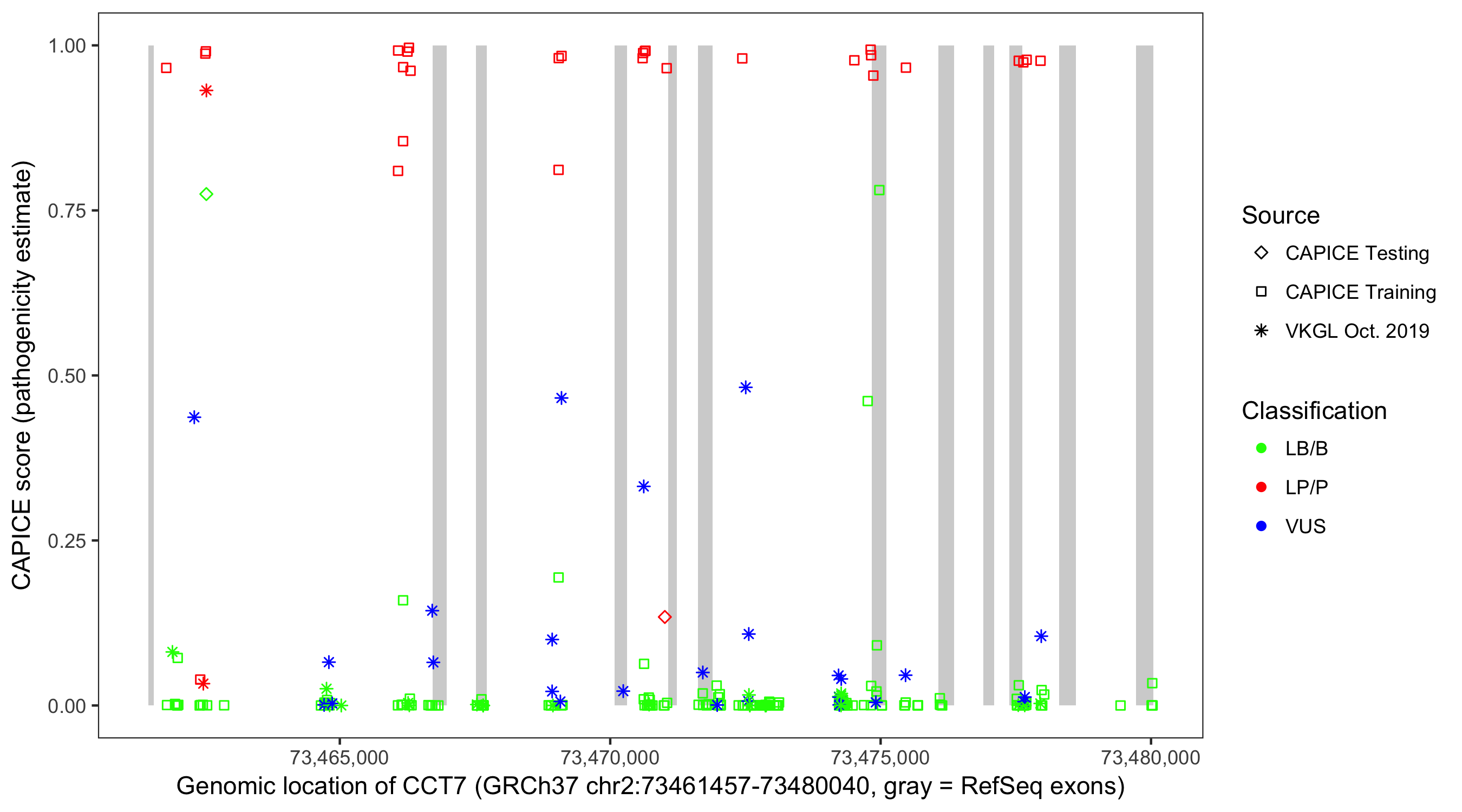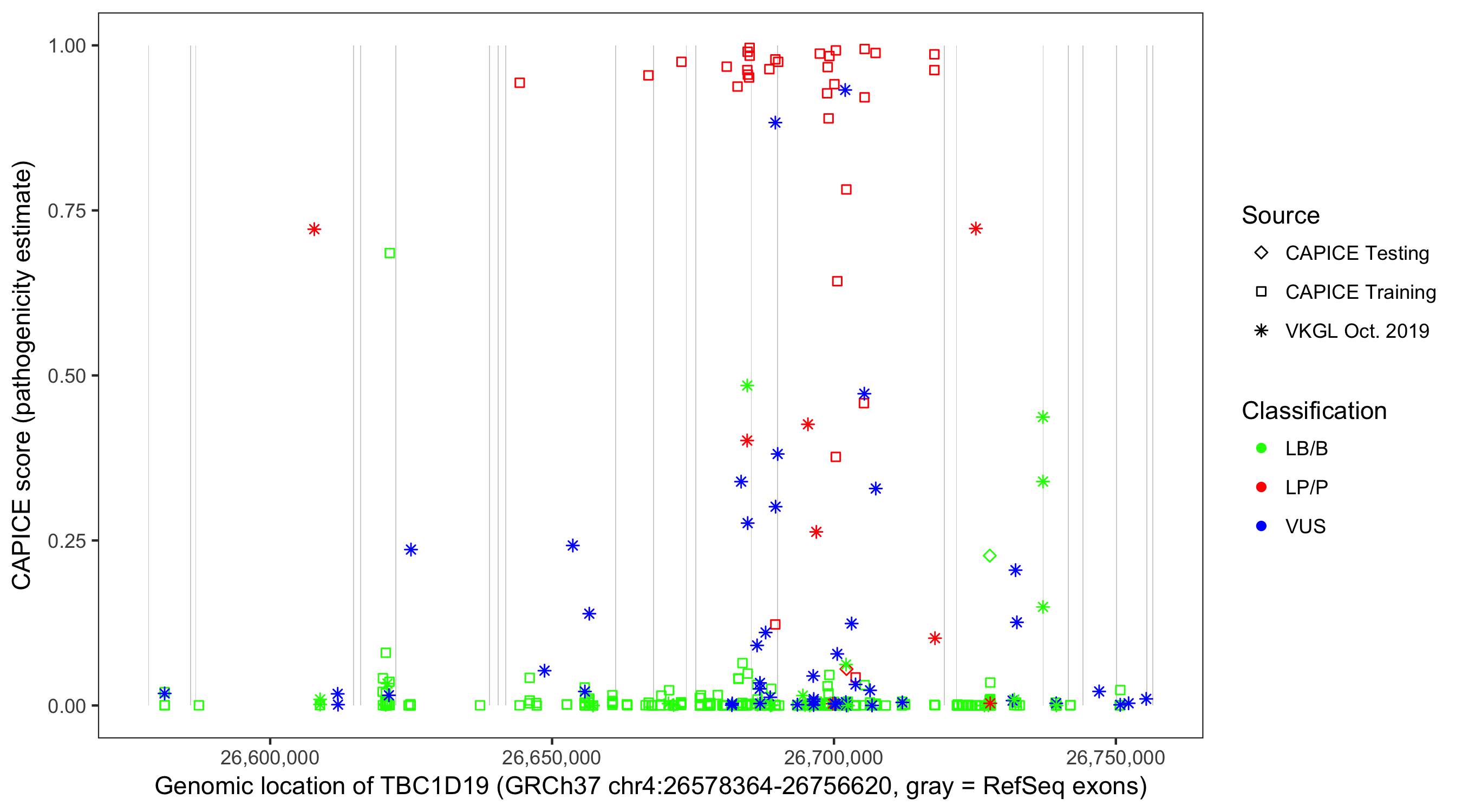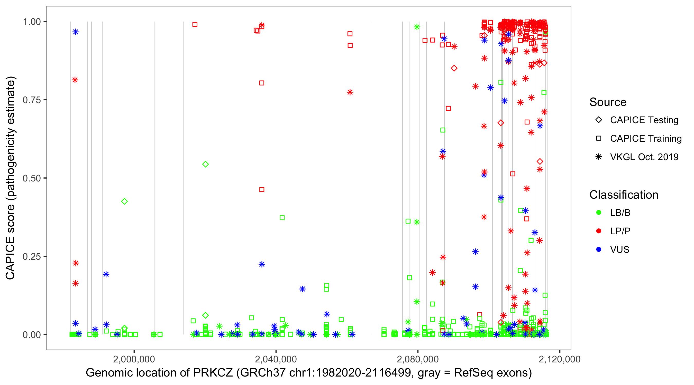 Shown are CAPICE train/test variants plus VKGL Oct 2019.