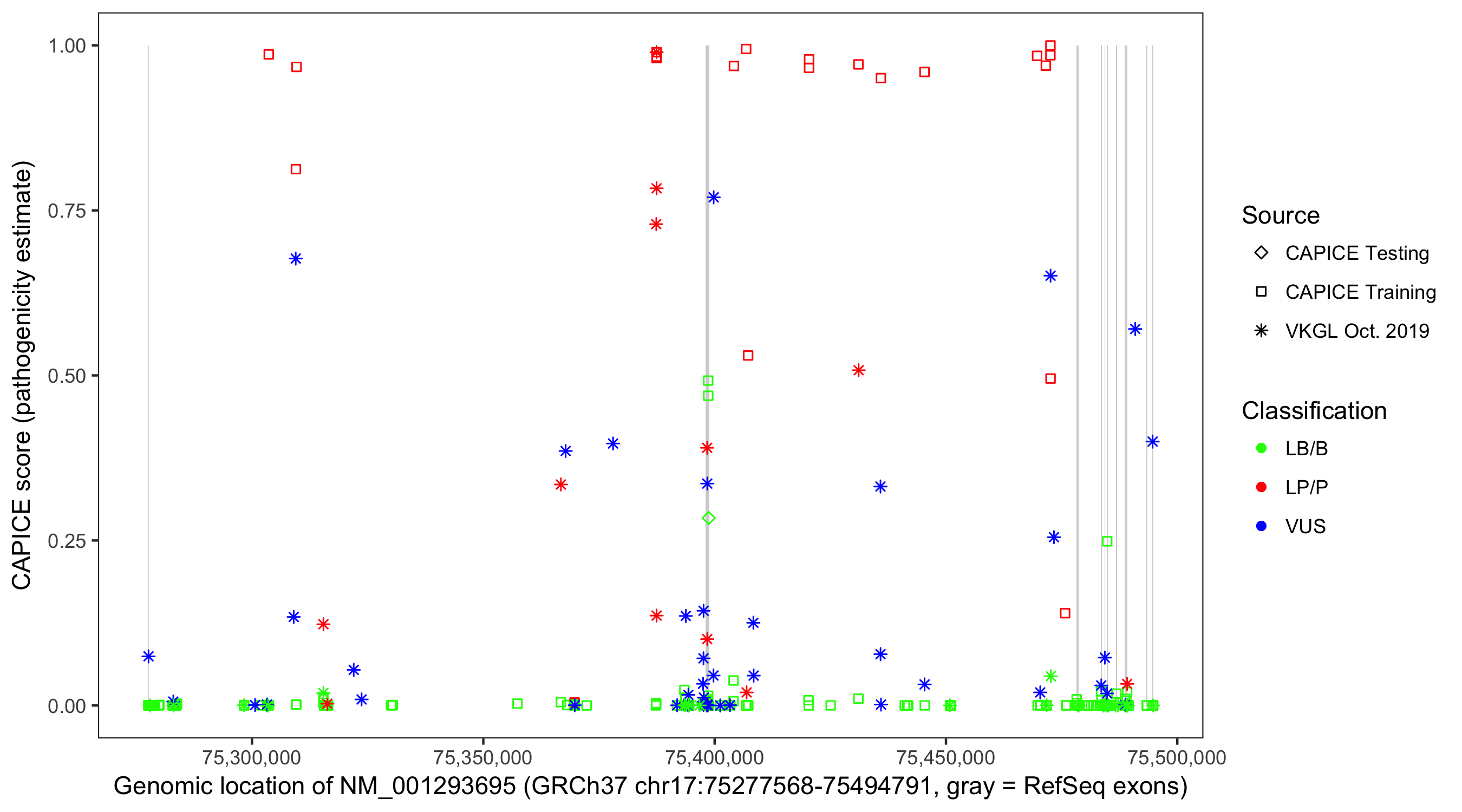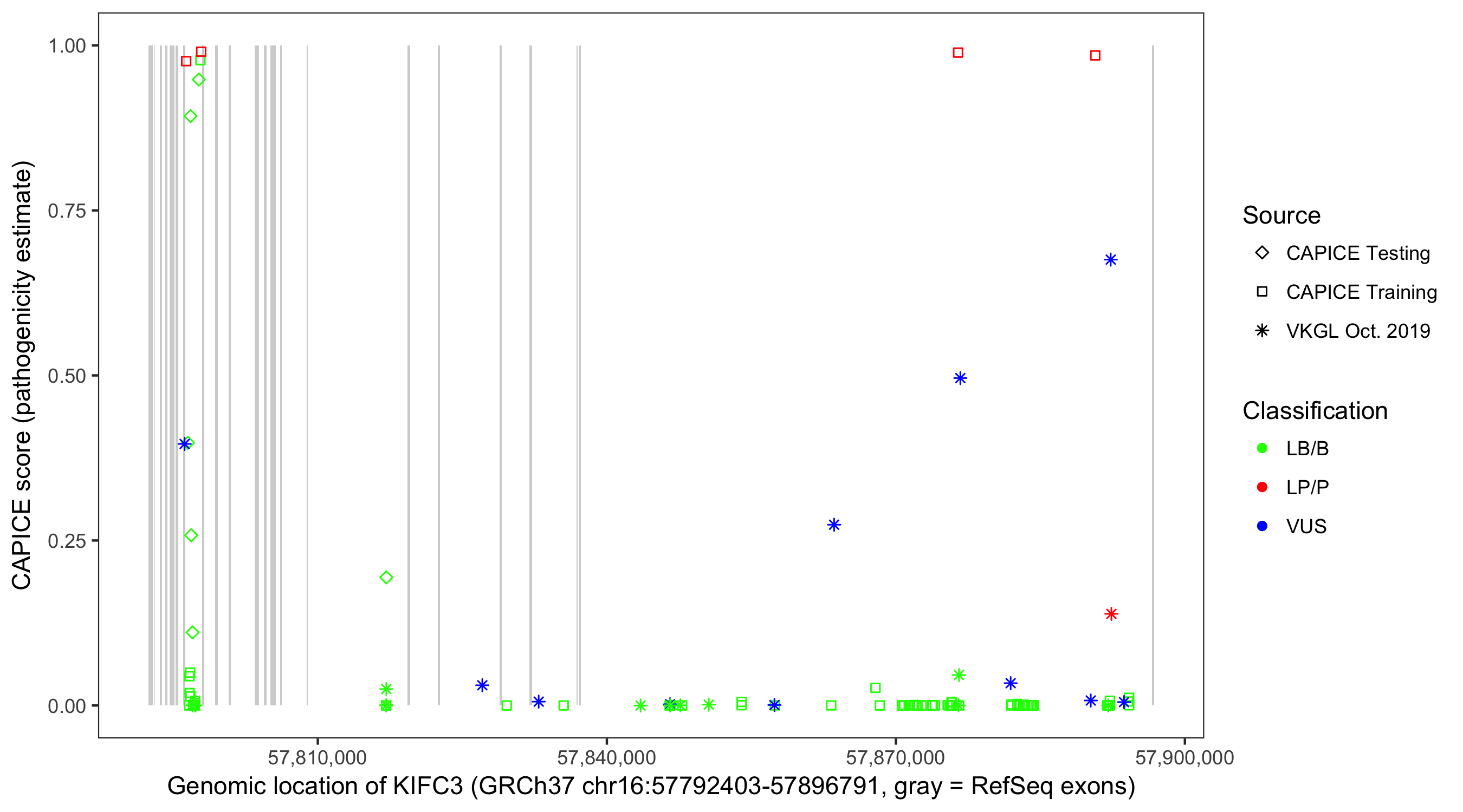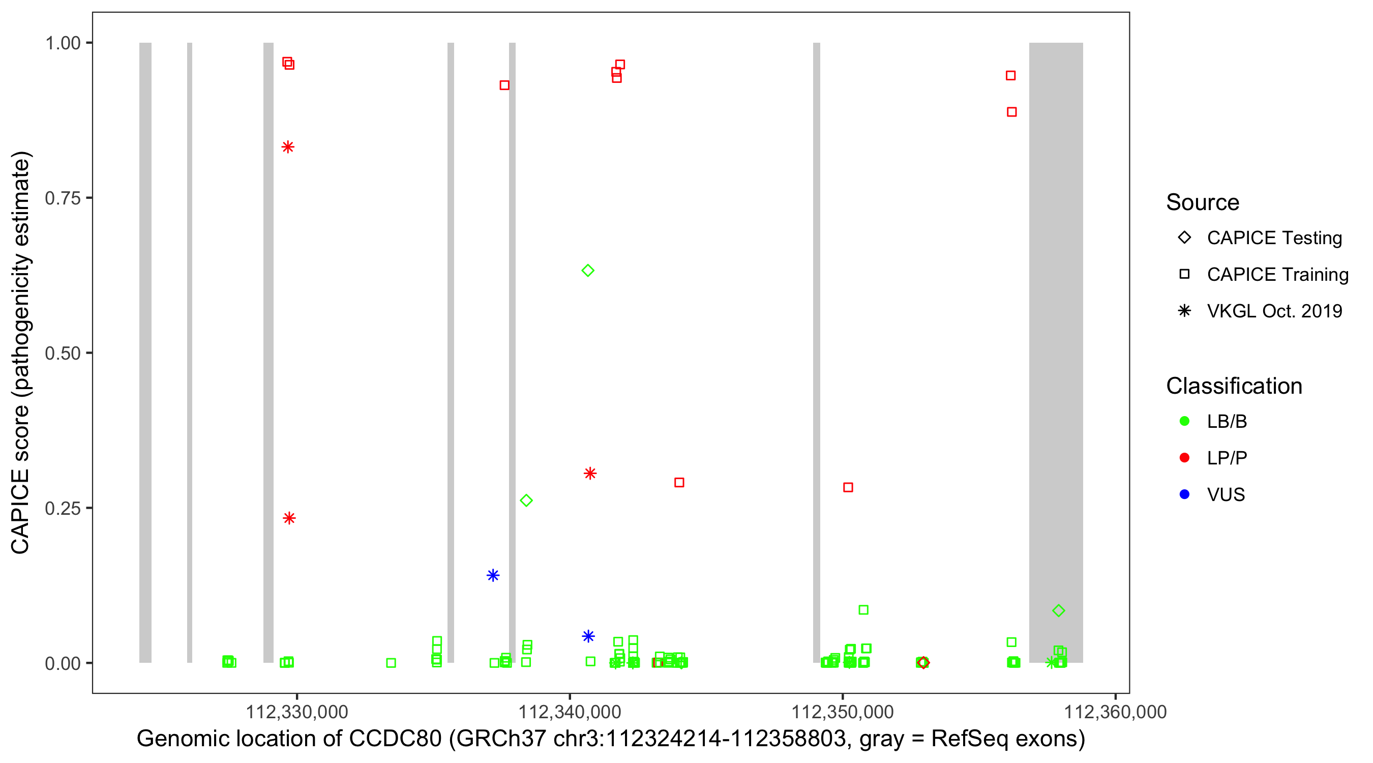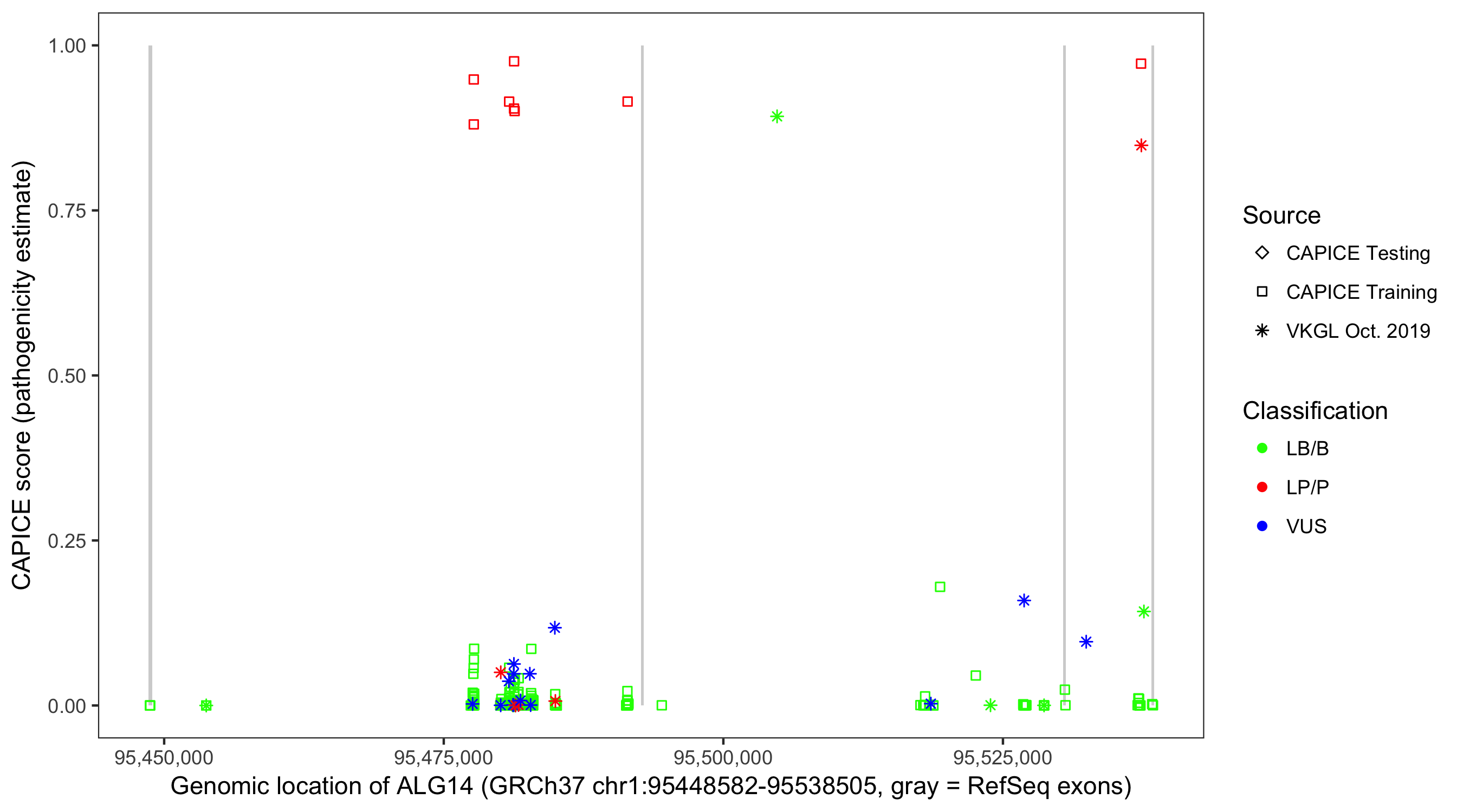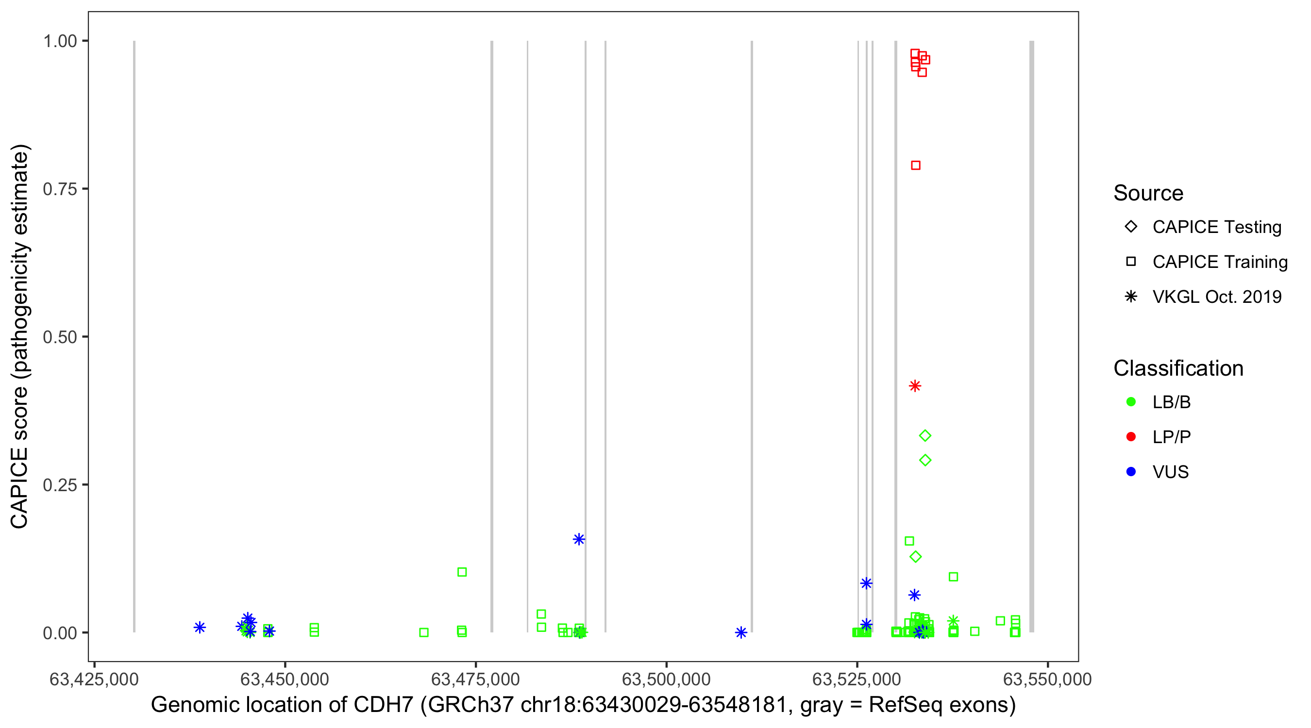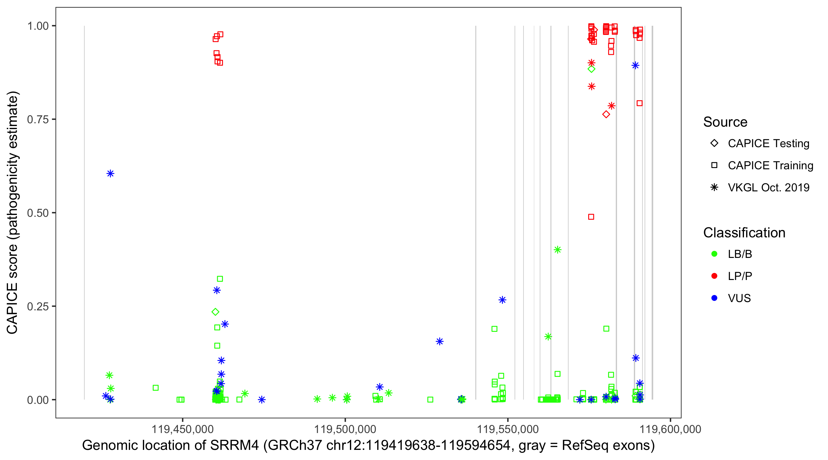 Shown are CAPICE train/test variants plus VKGL Oct 2019.