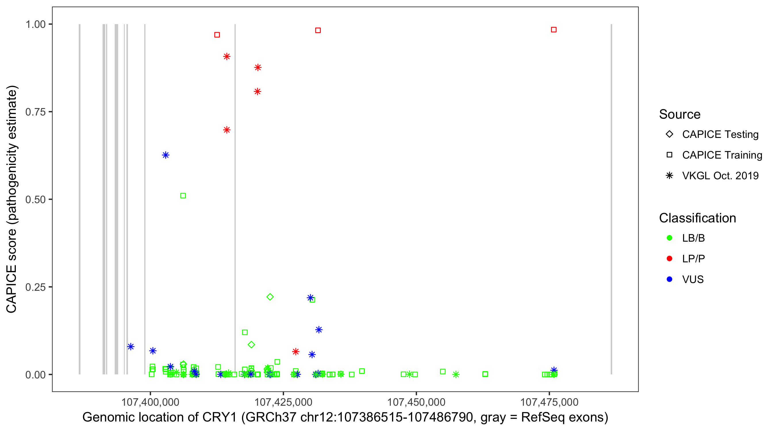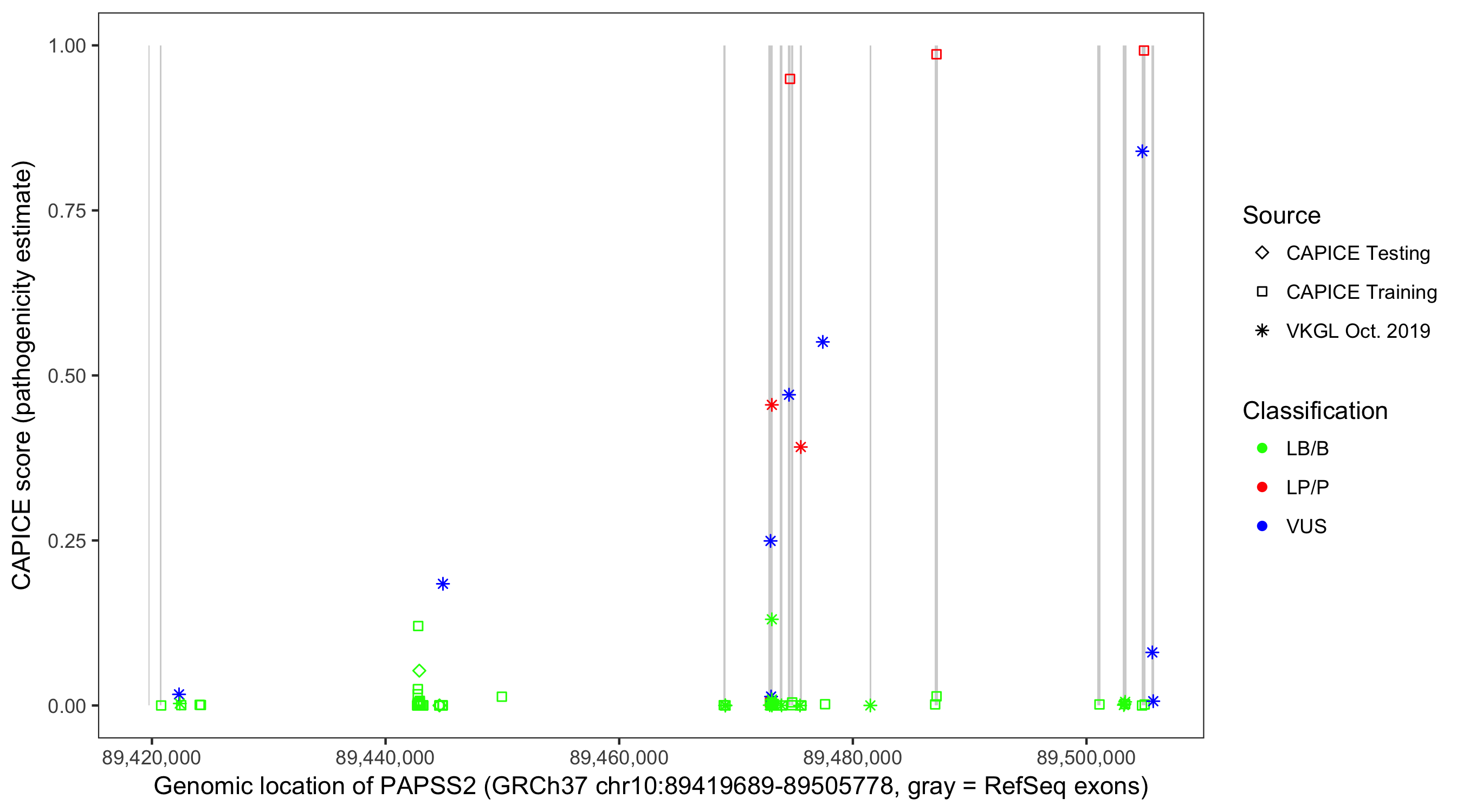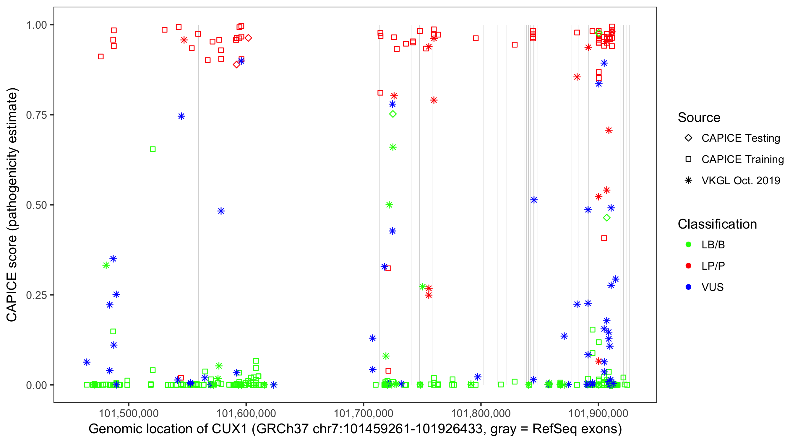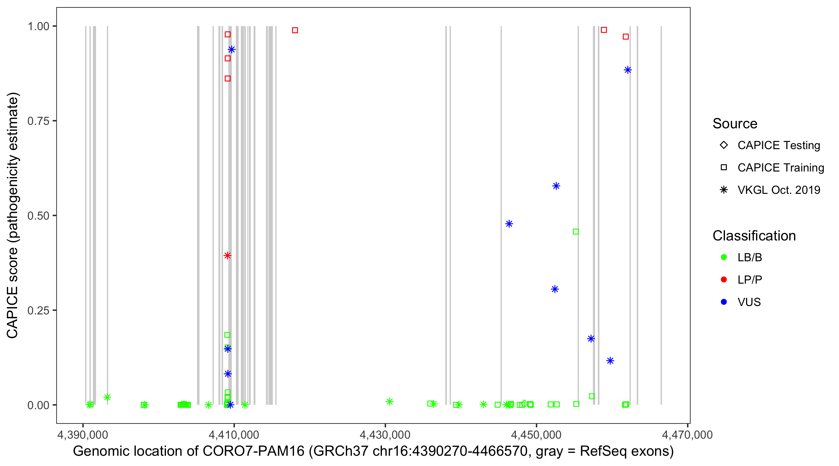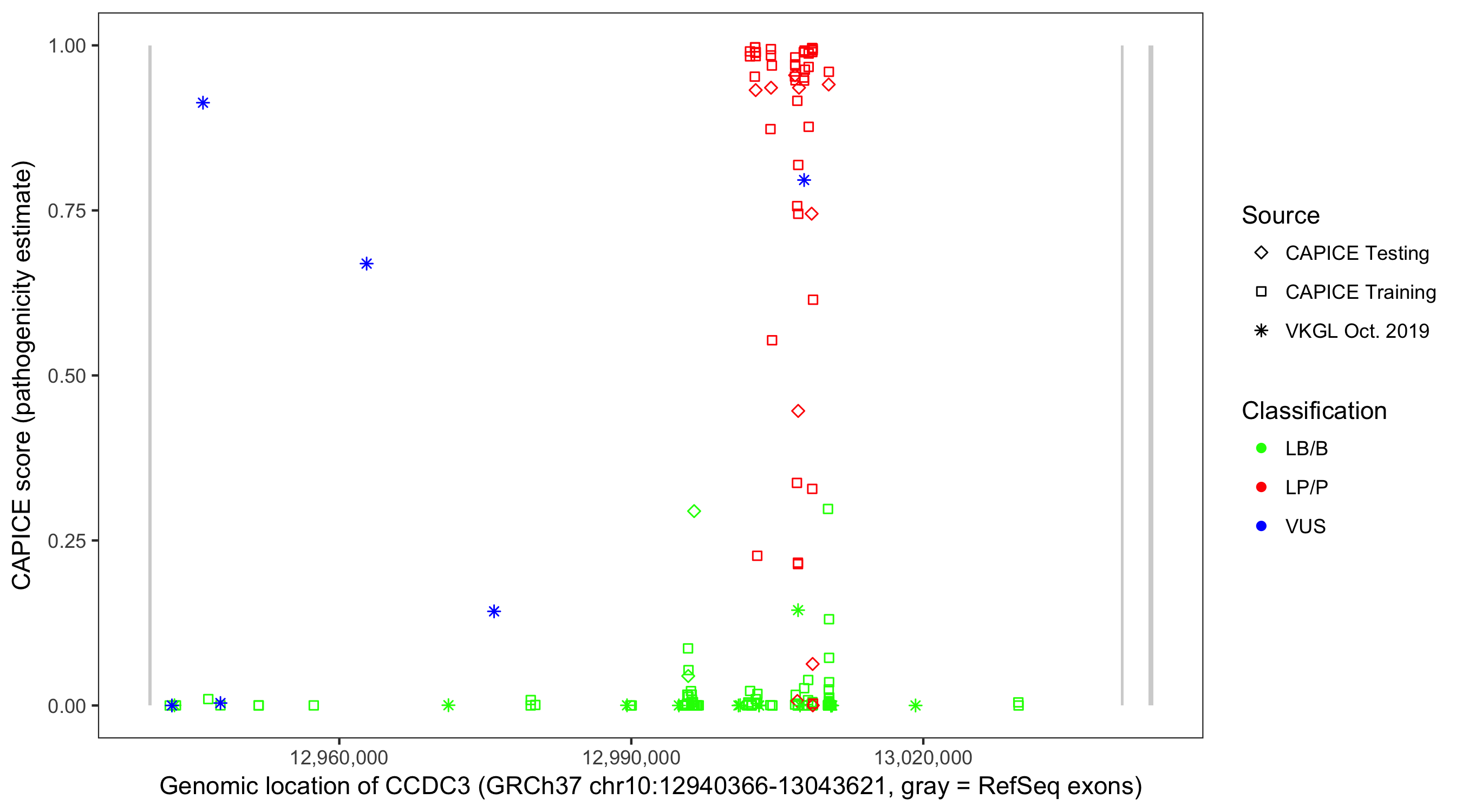 Shown are CAPICE train/test variants plus VKGL Oct 2019.