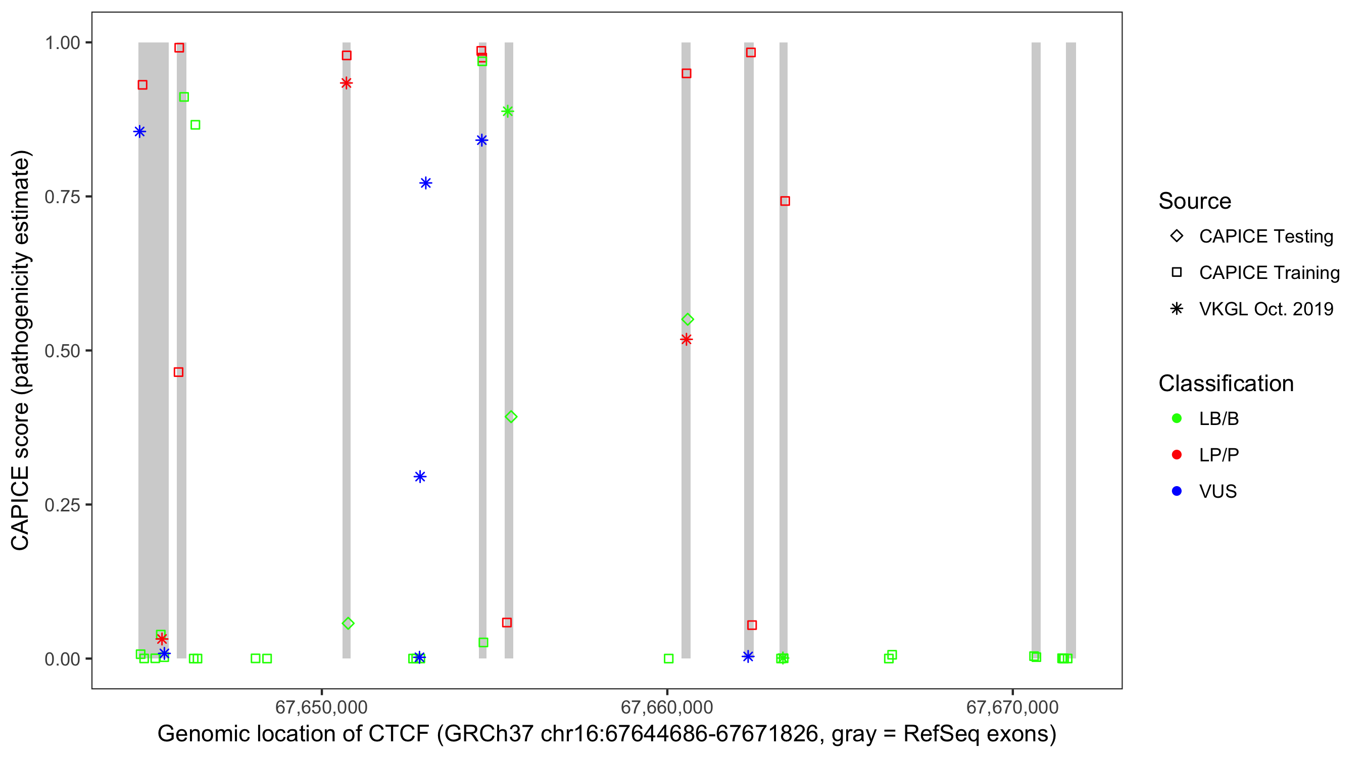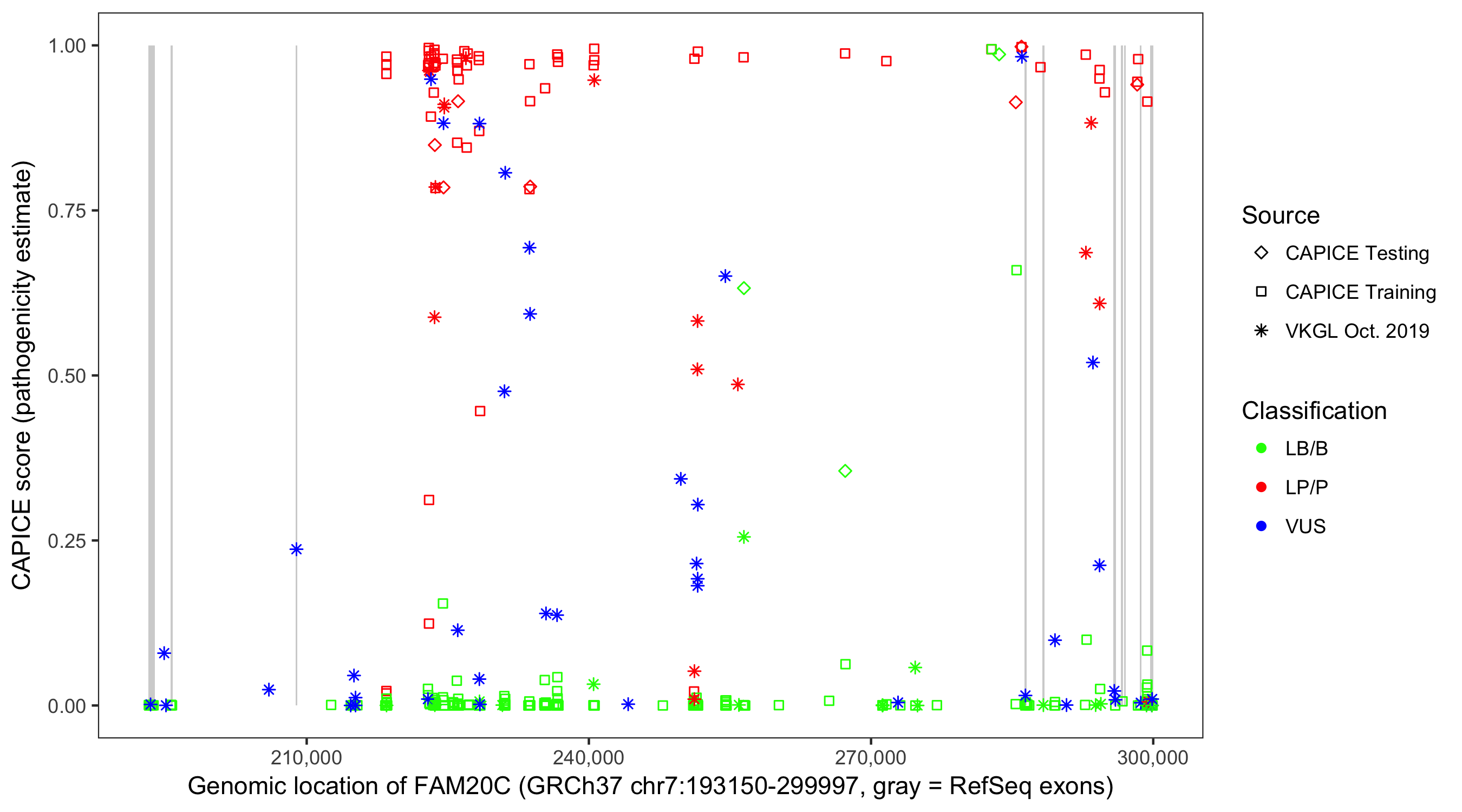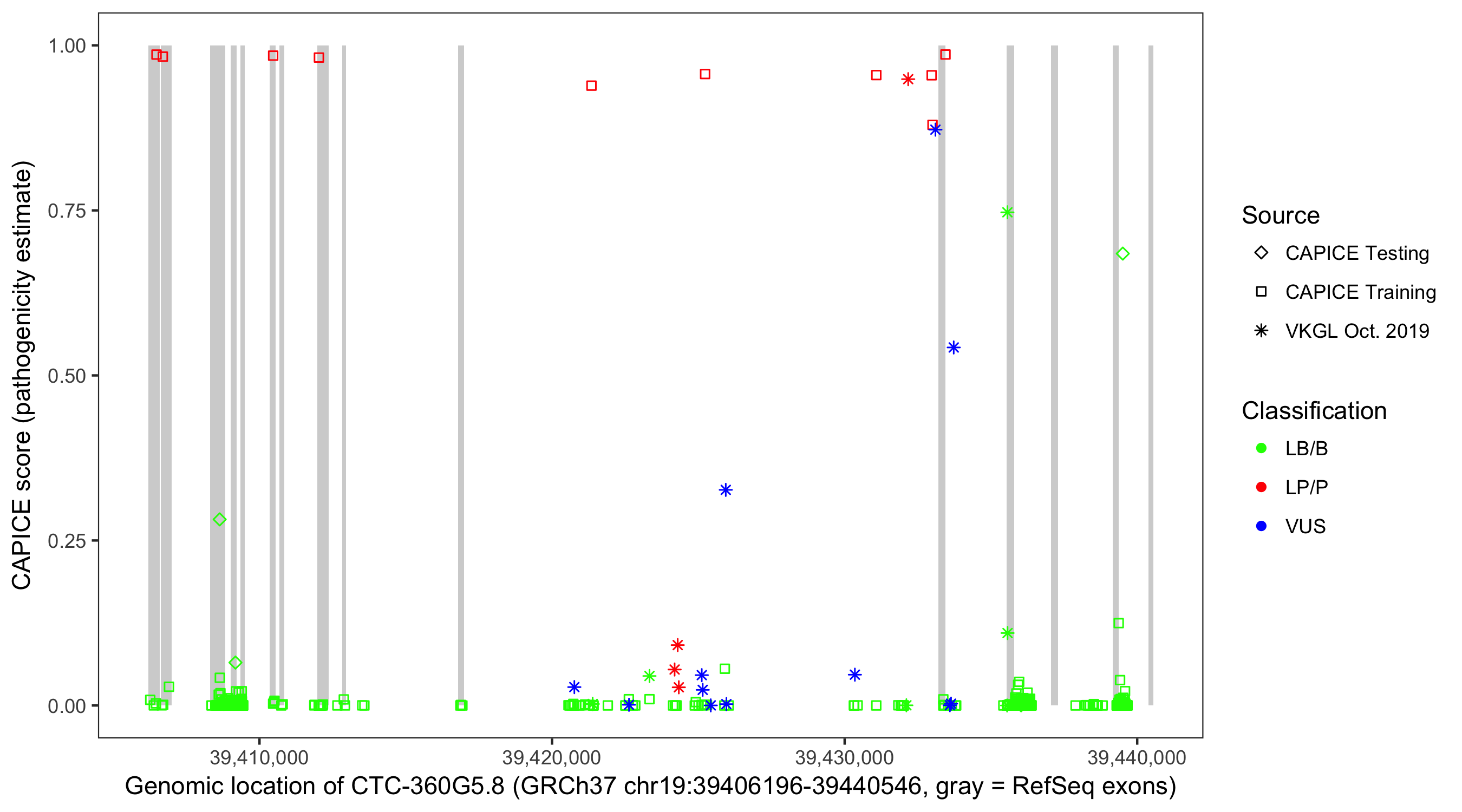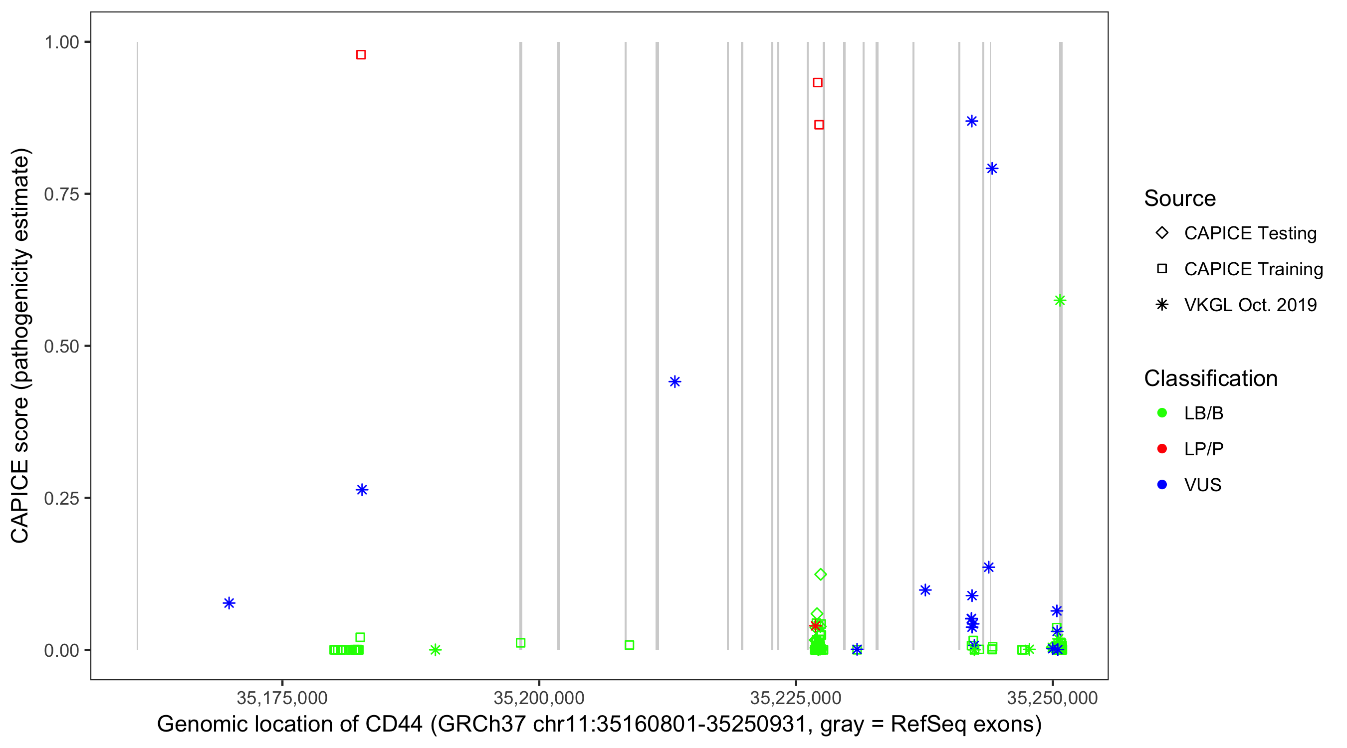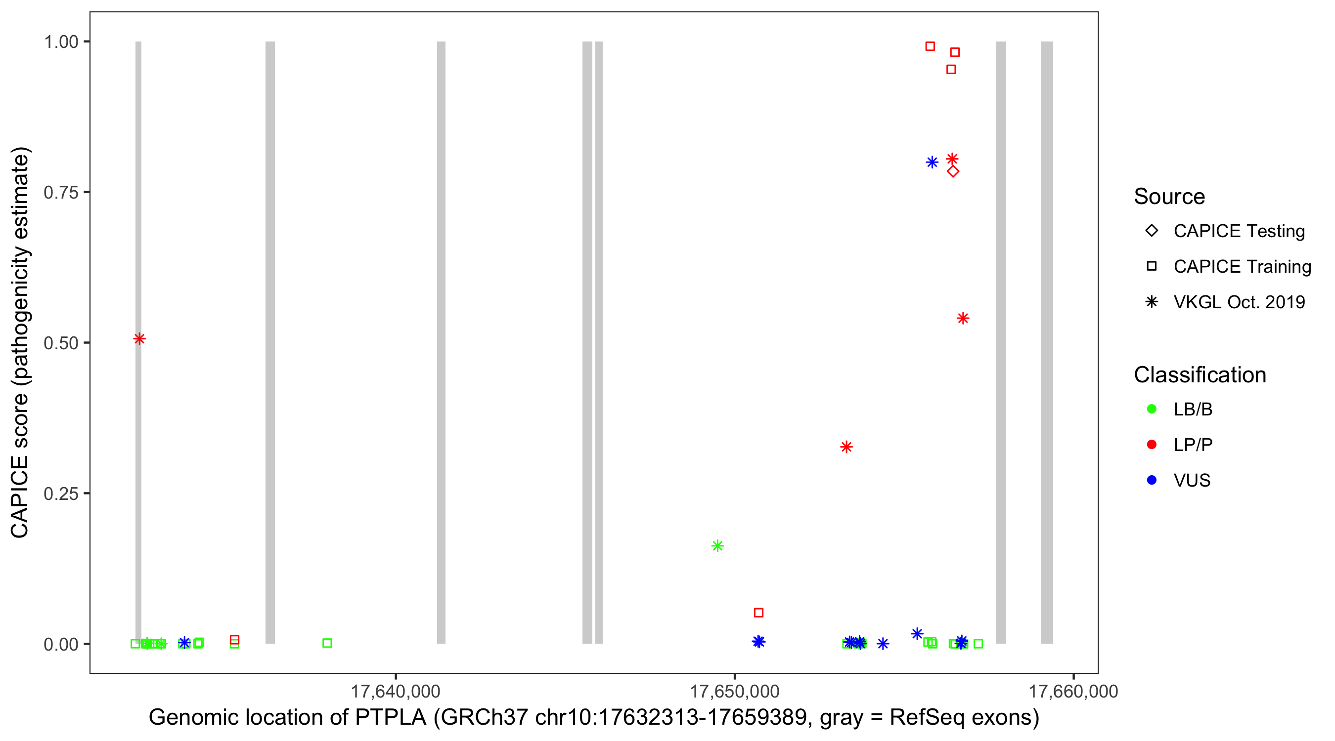Shown are CAPICE train/test variants plus VKGL Oct 2019.