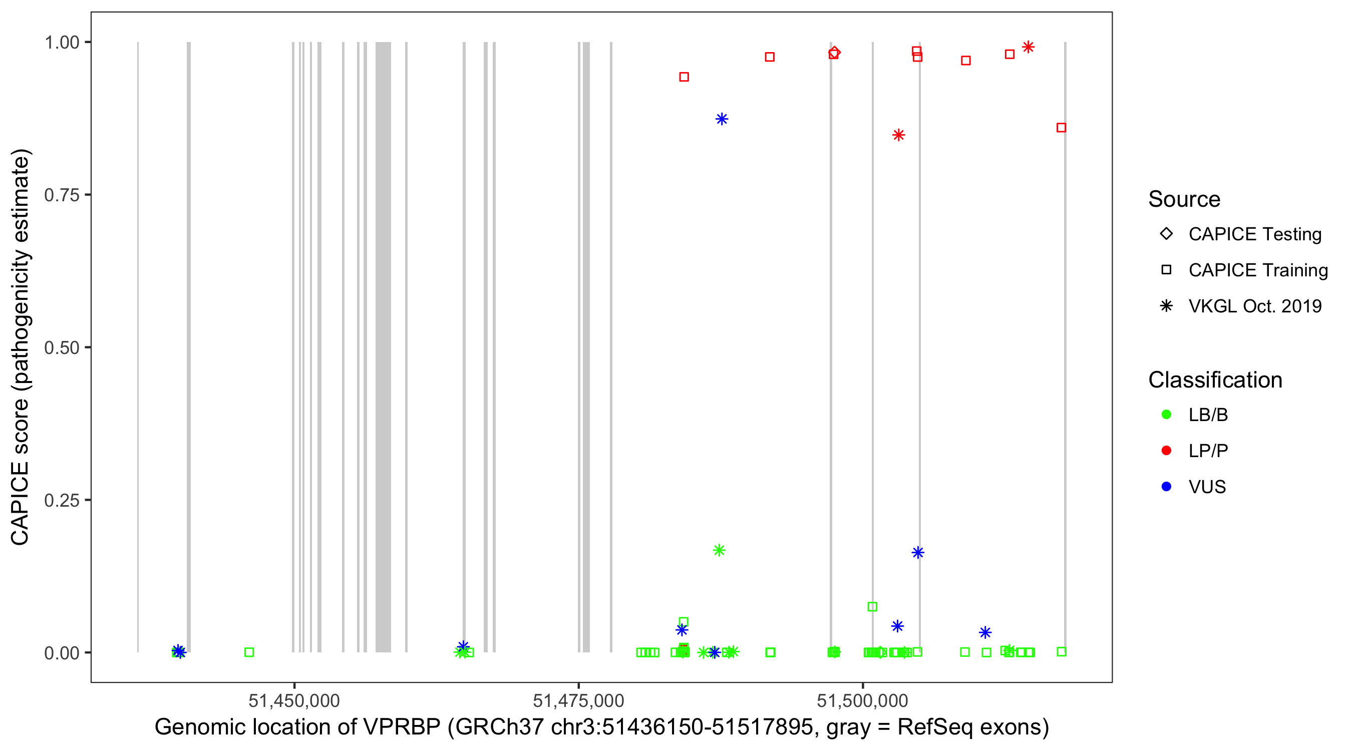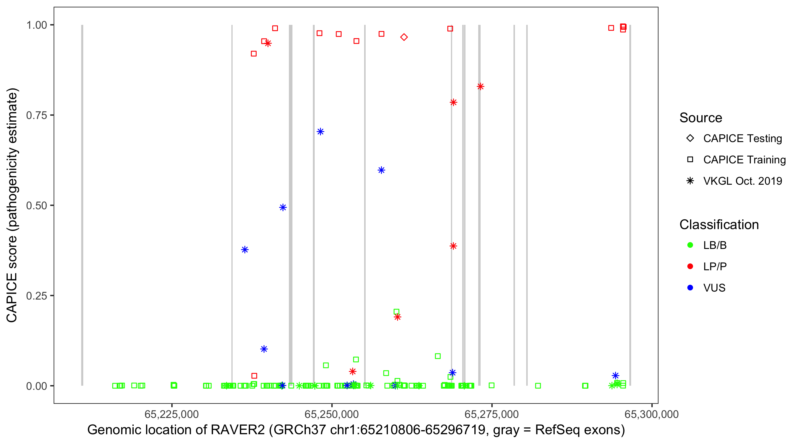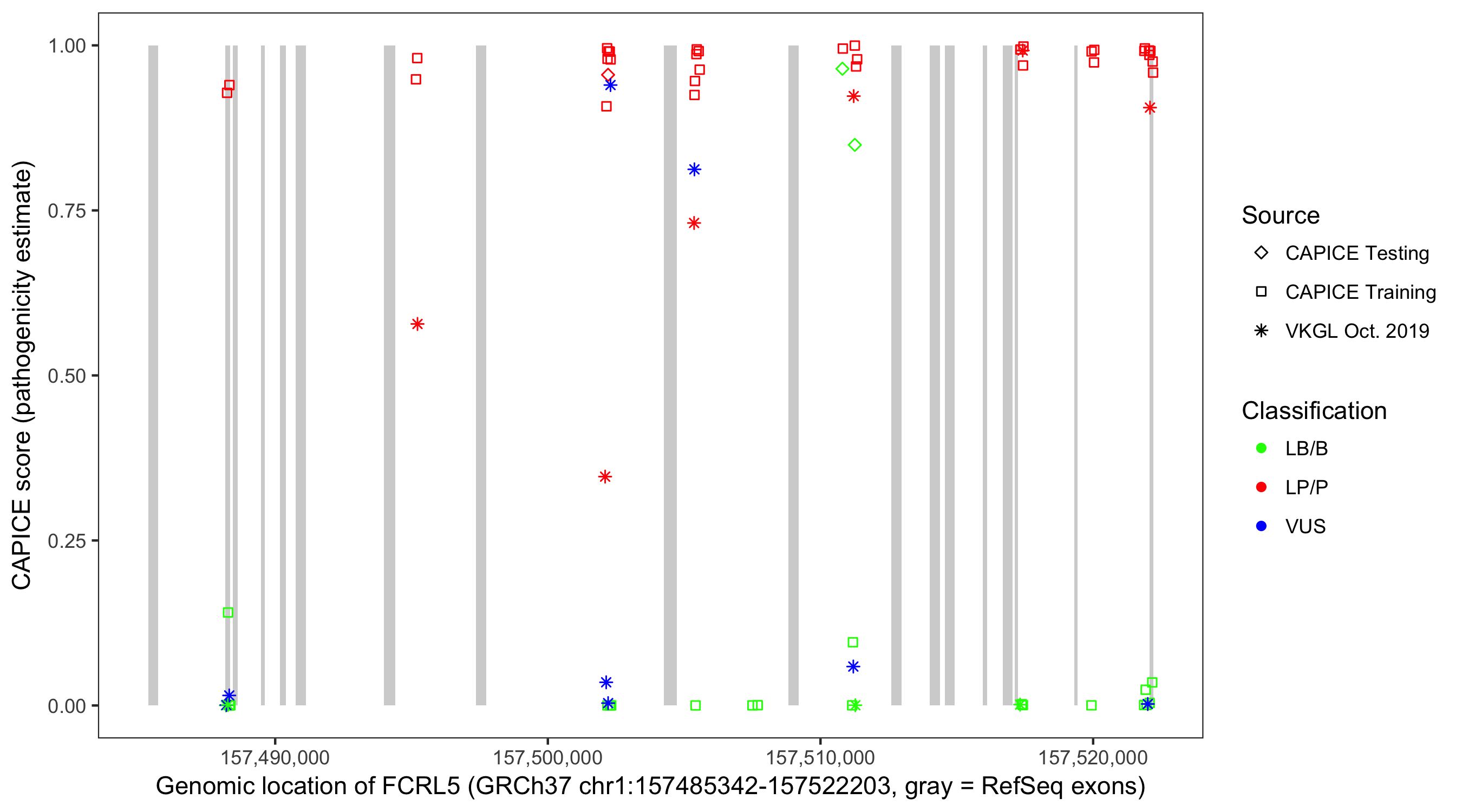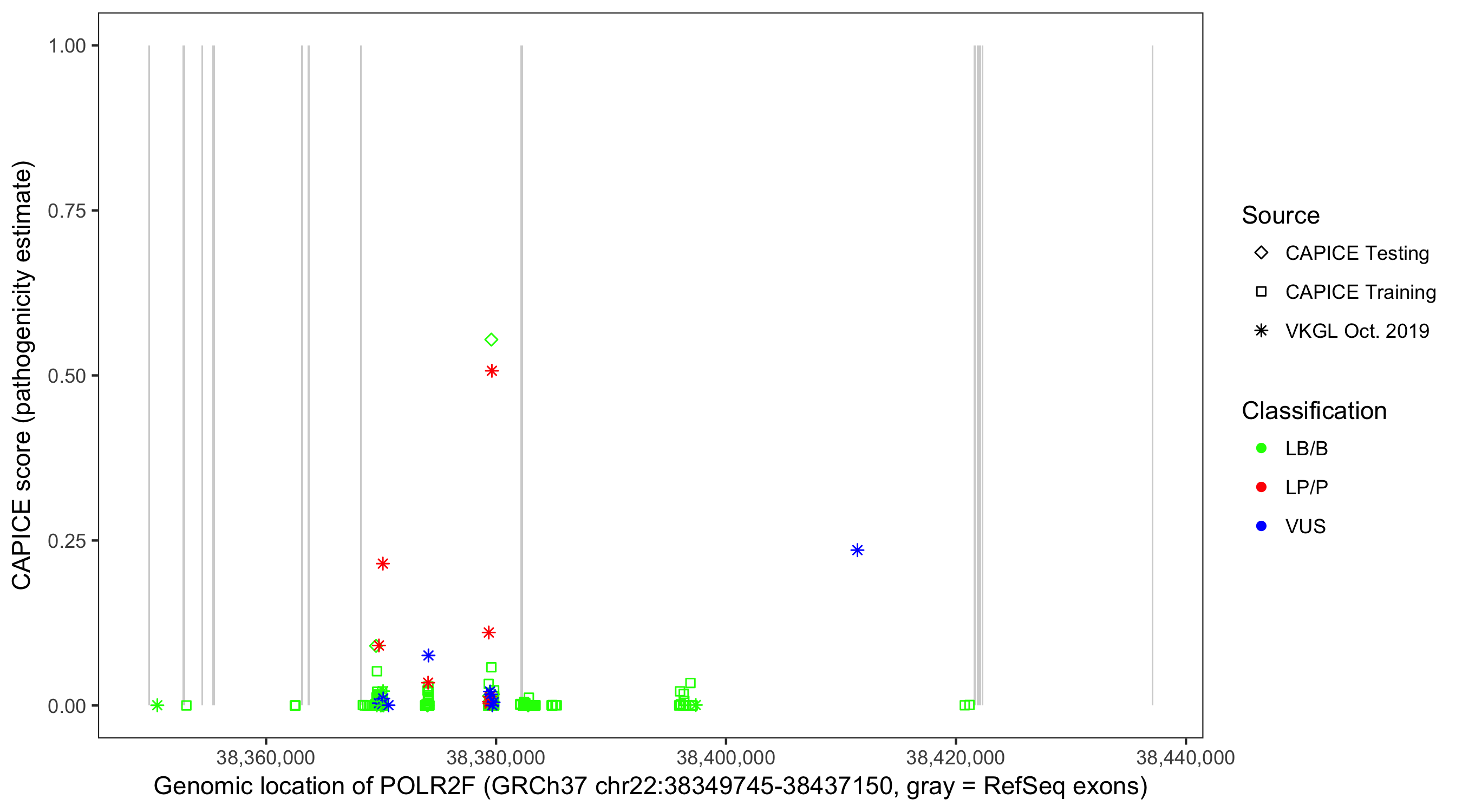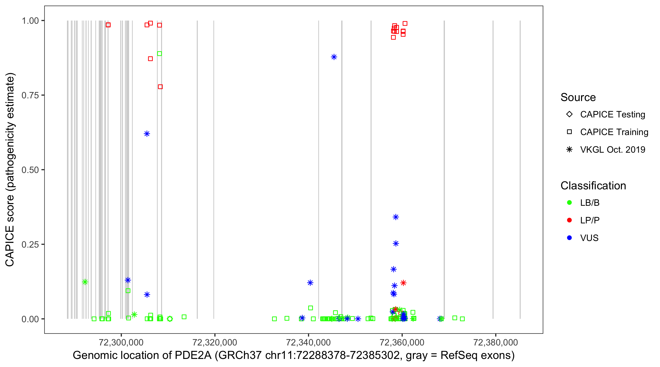 Shown are CAPICE train/test variants plus VKGL Oct 2019.