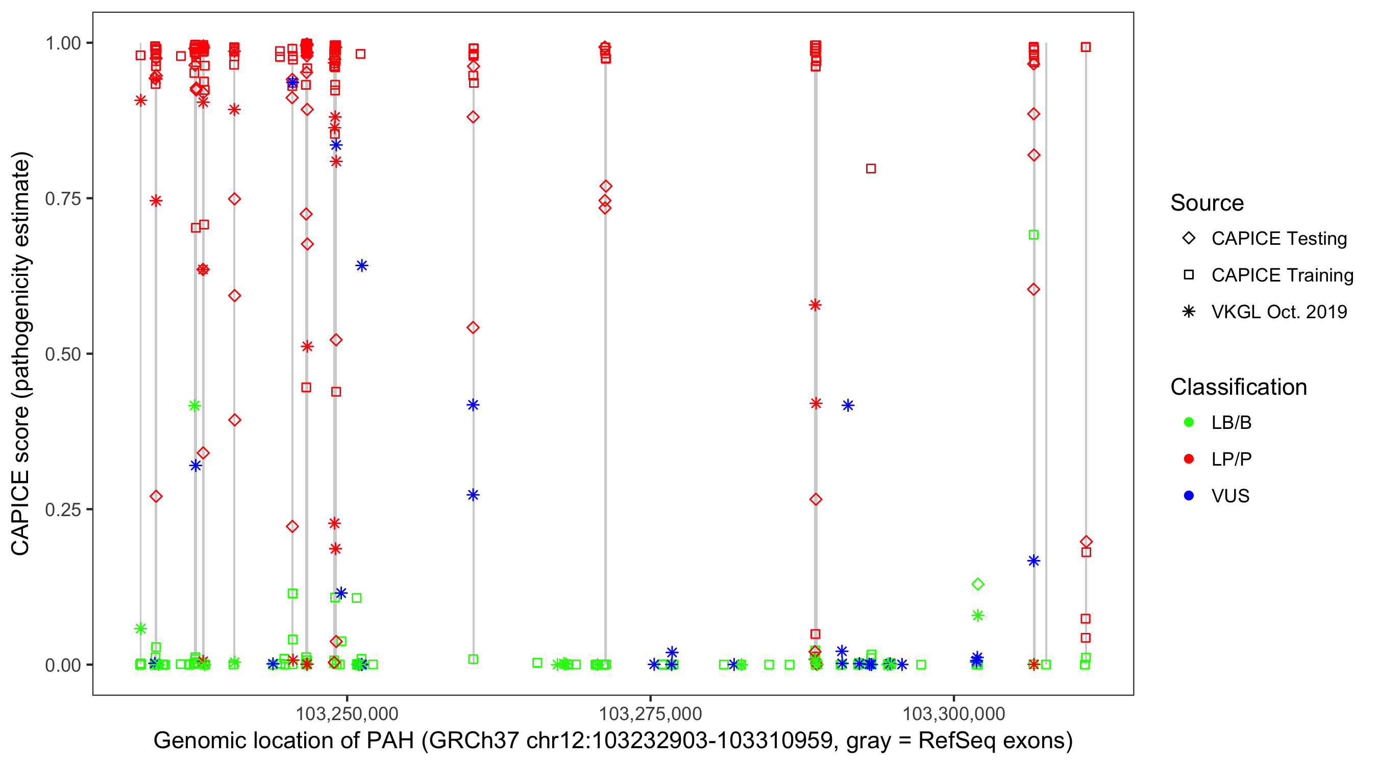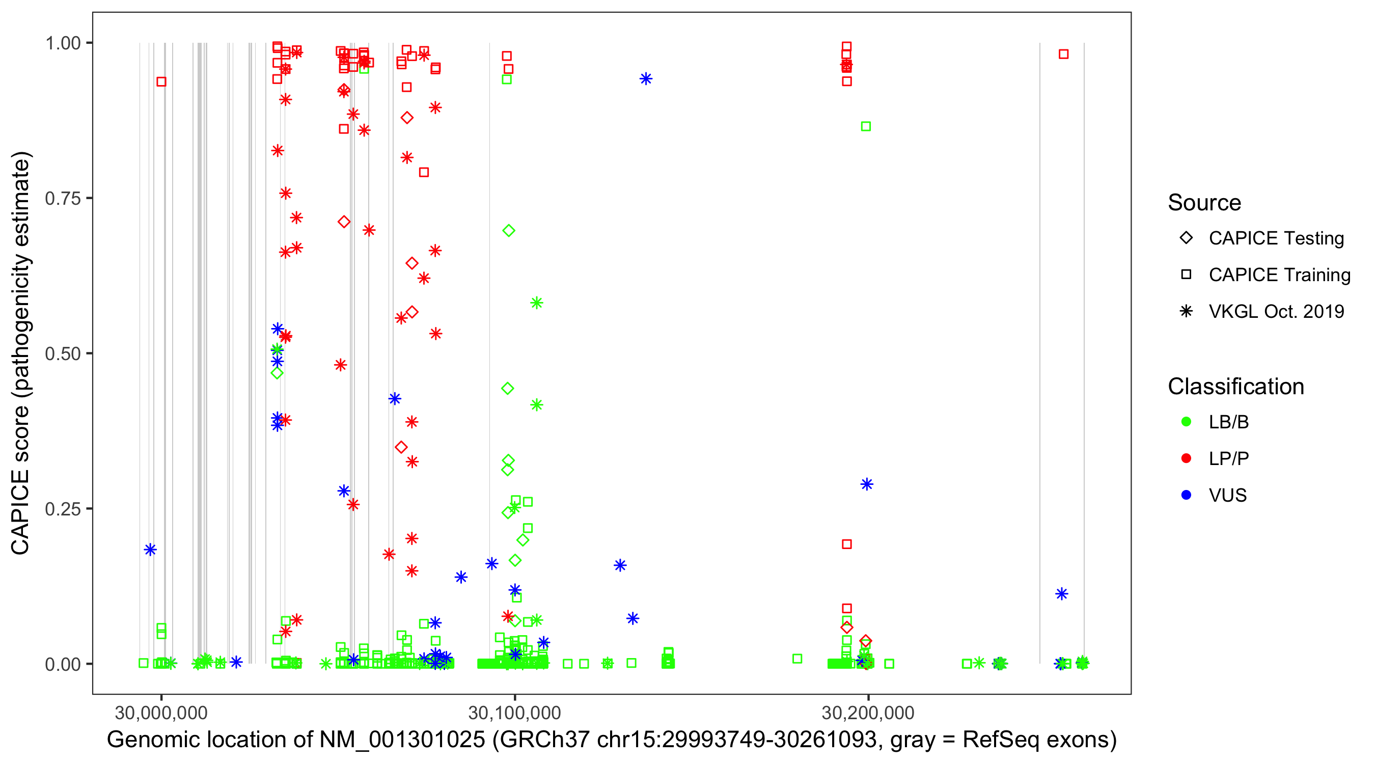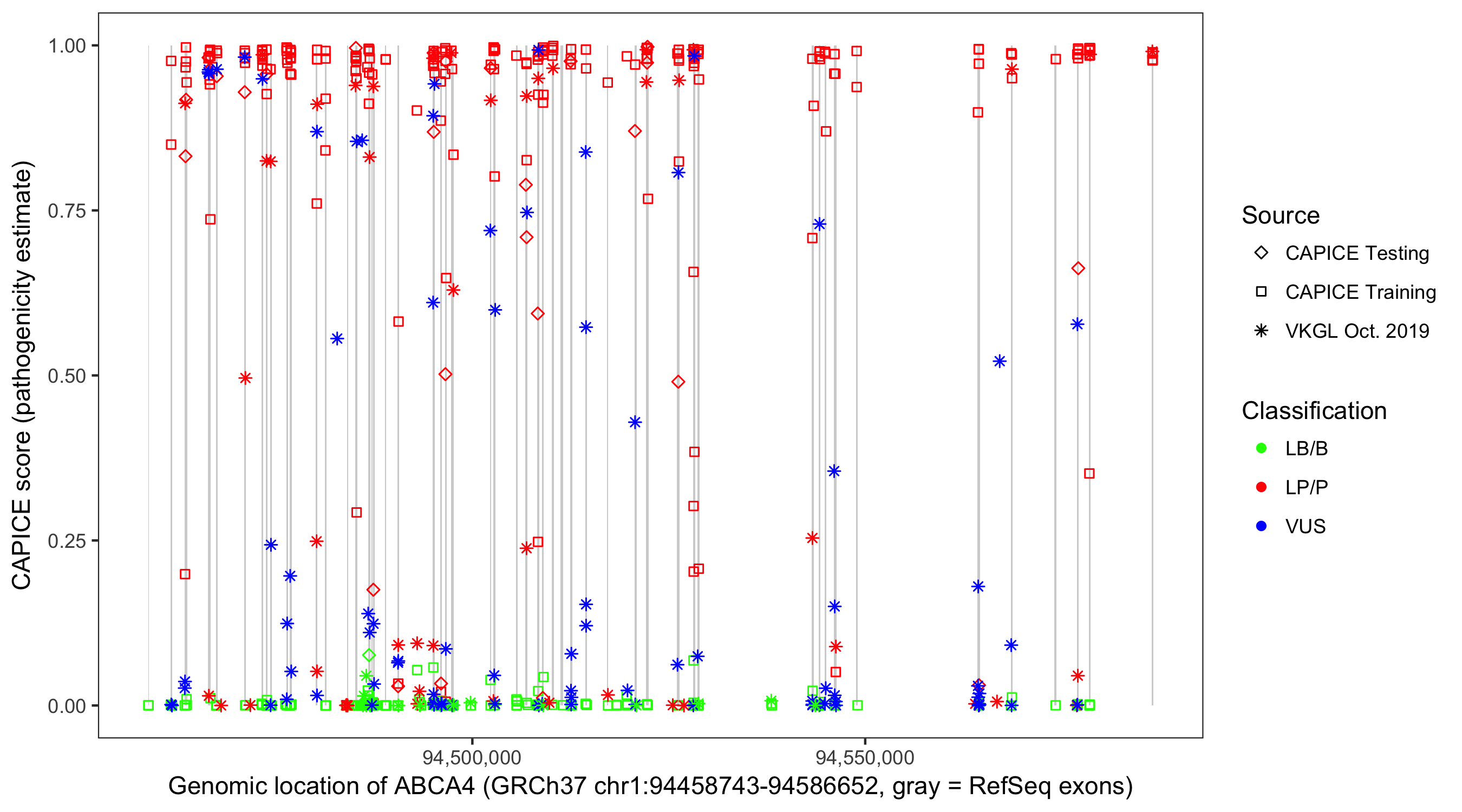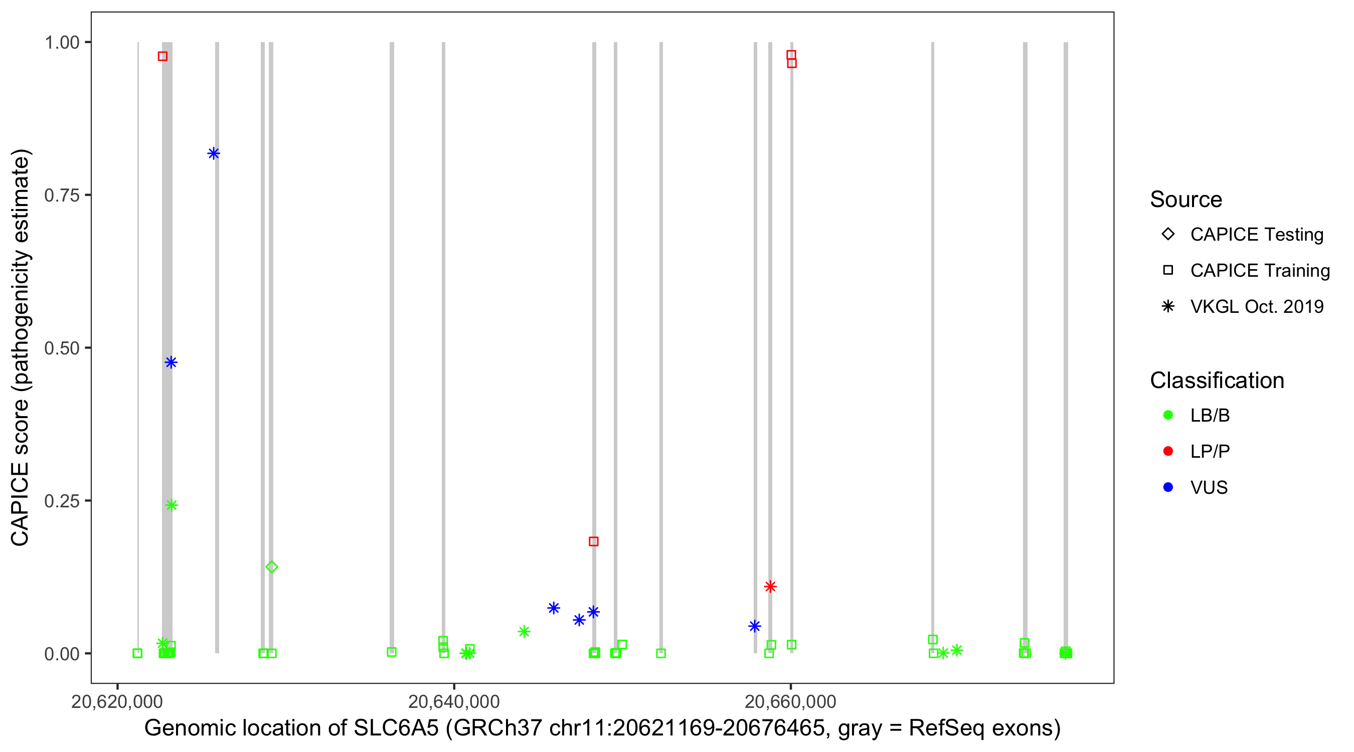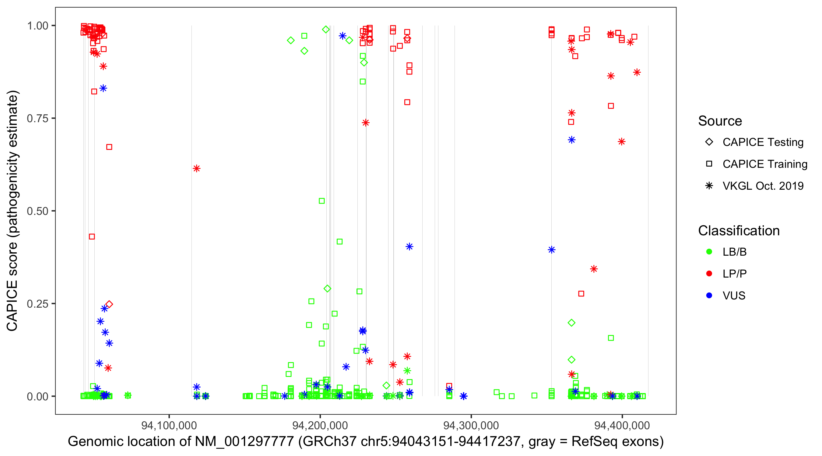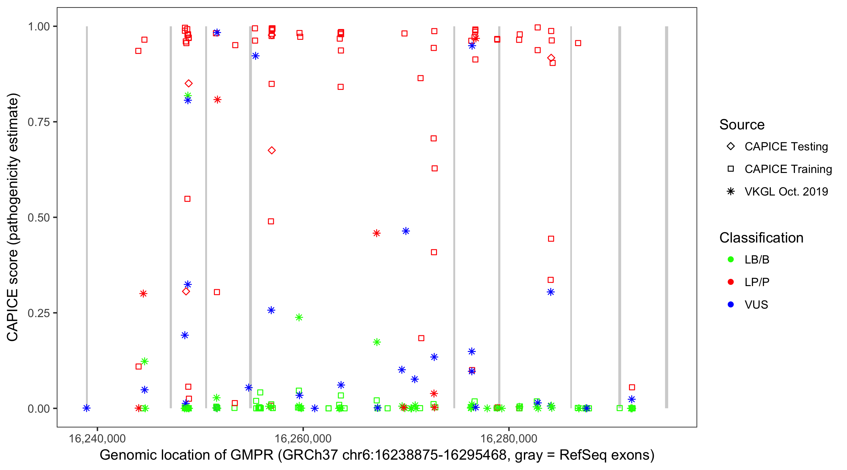 Shown are CAPICE train/test variants plus VKGL Oct 2019.