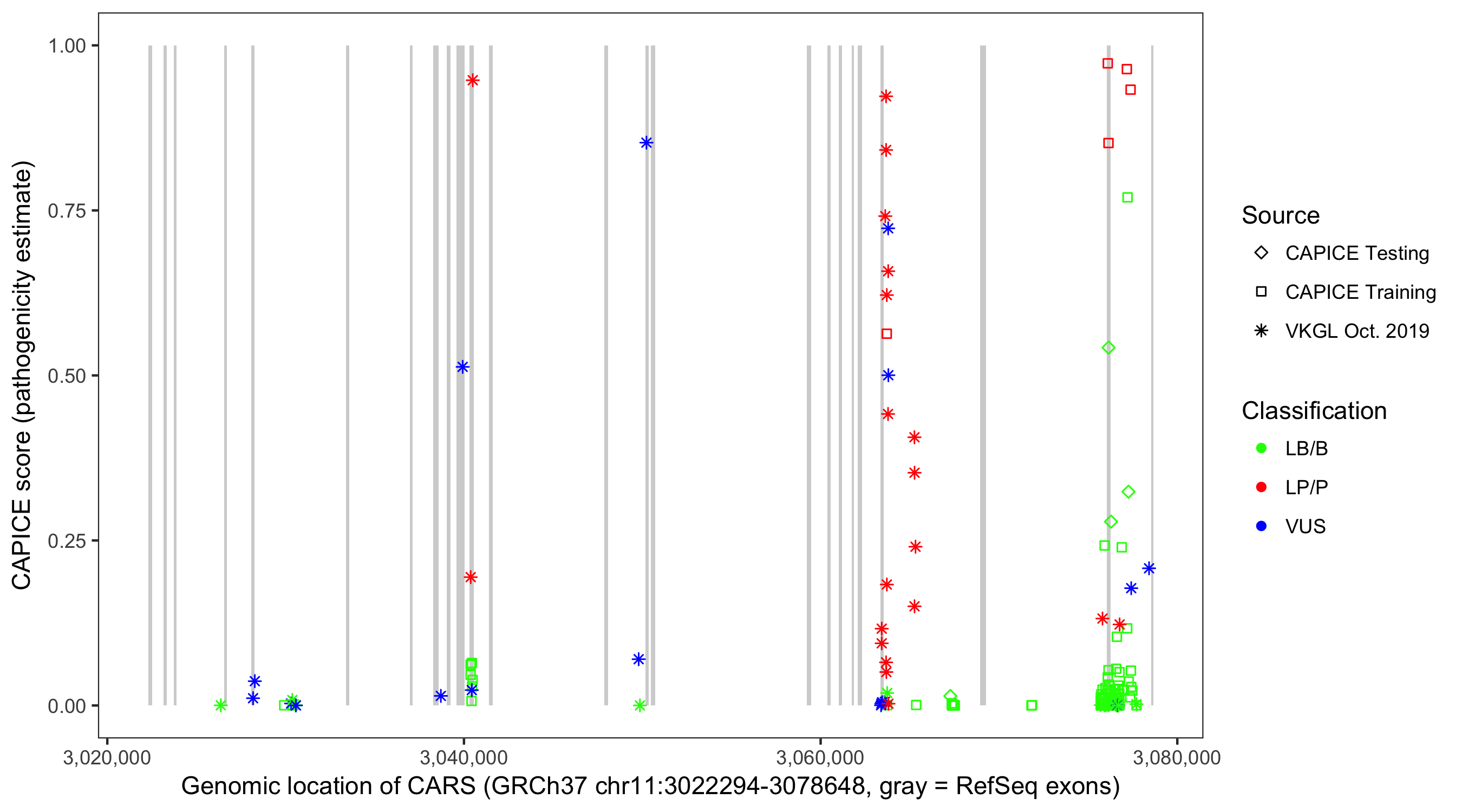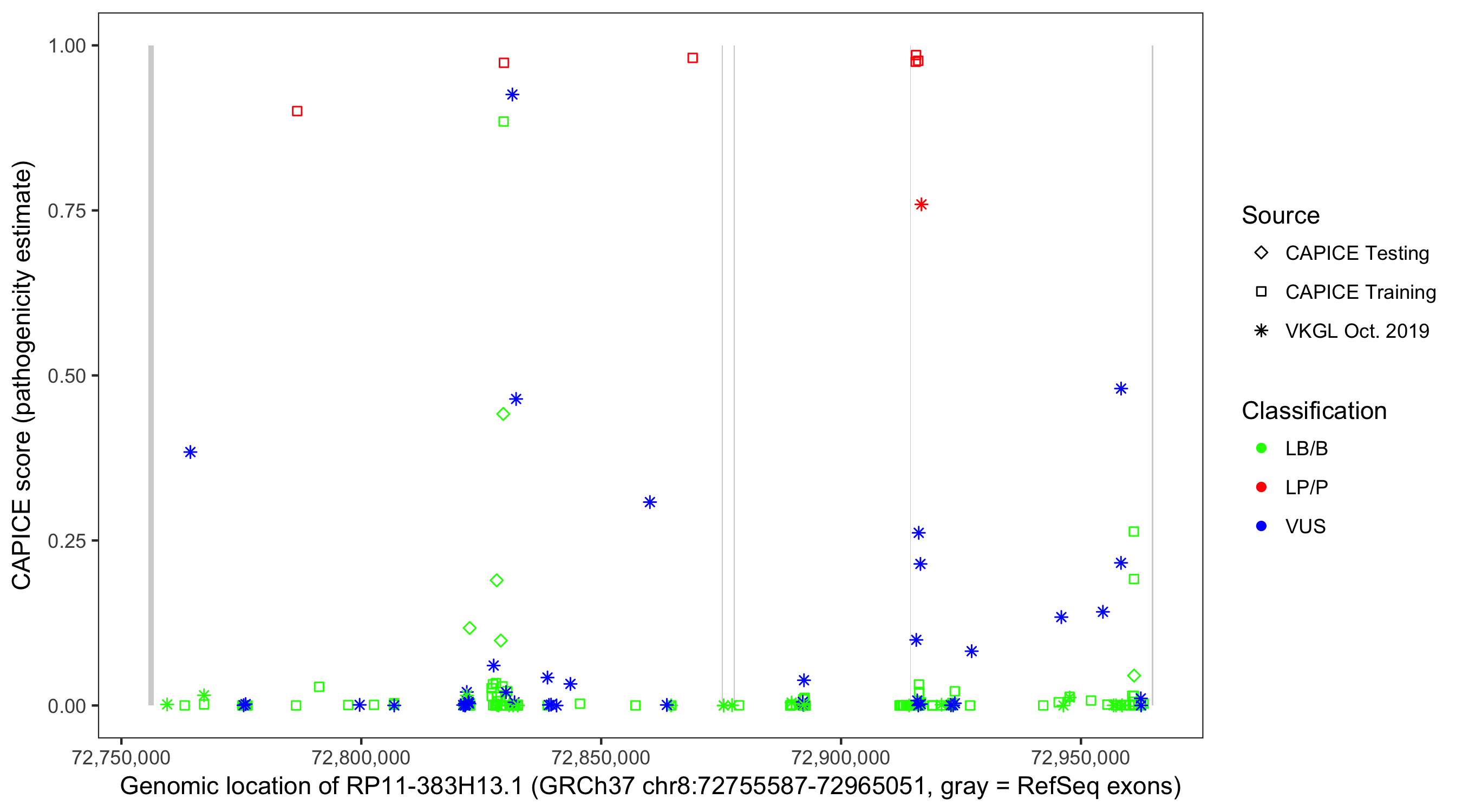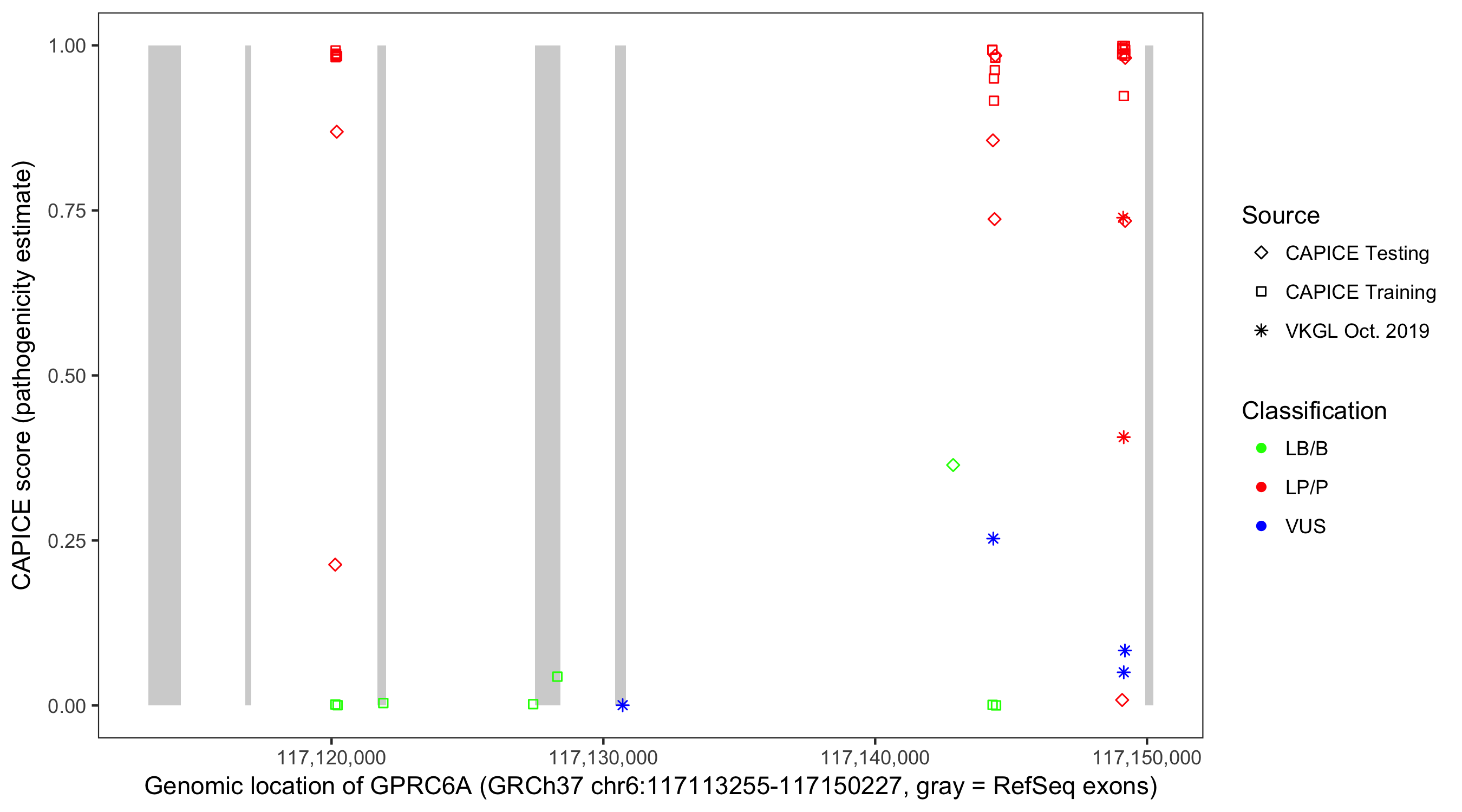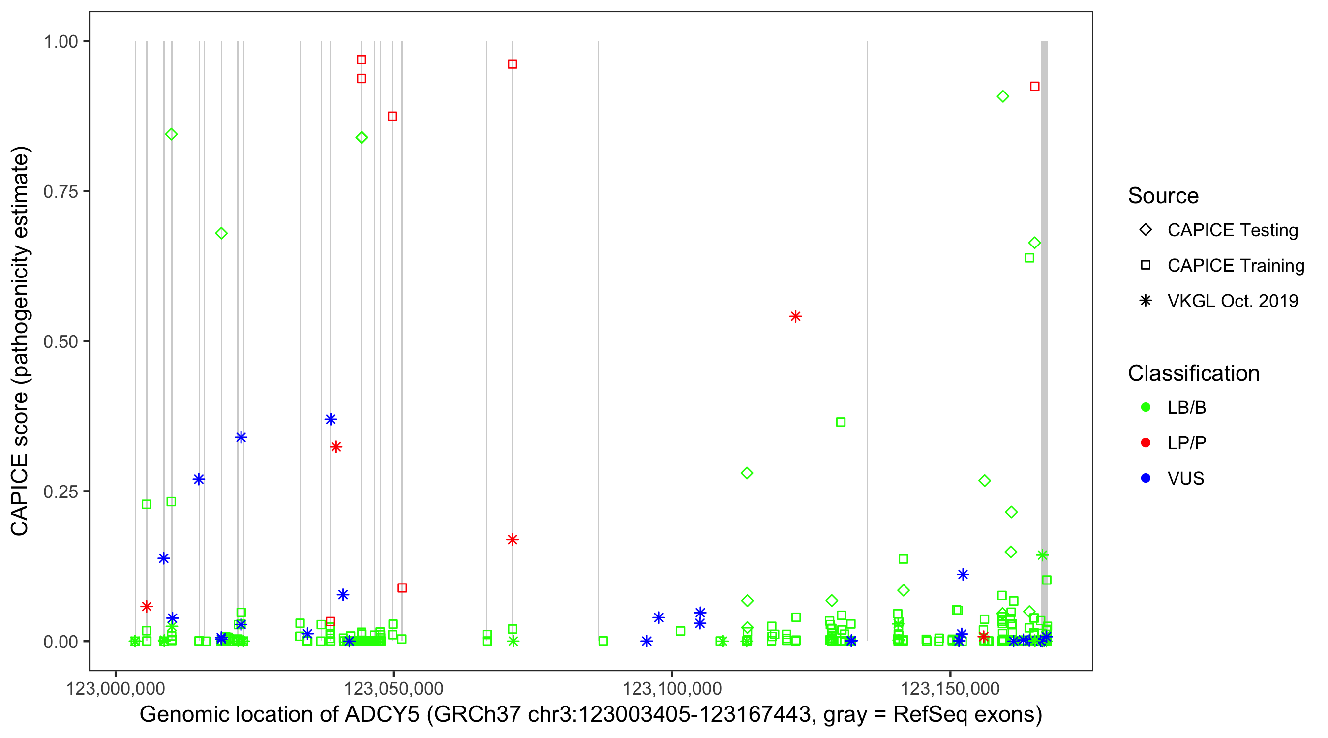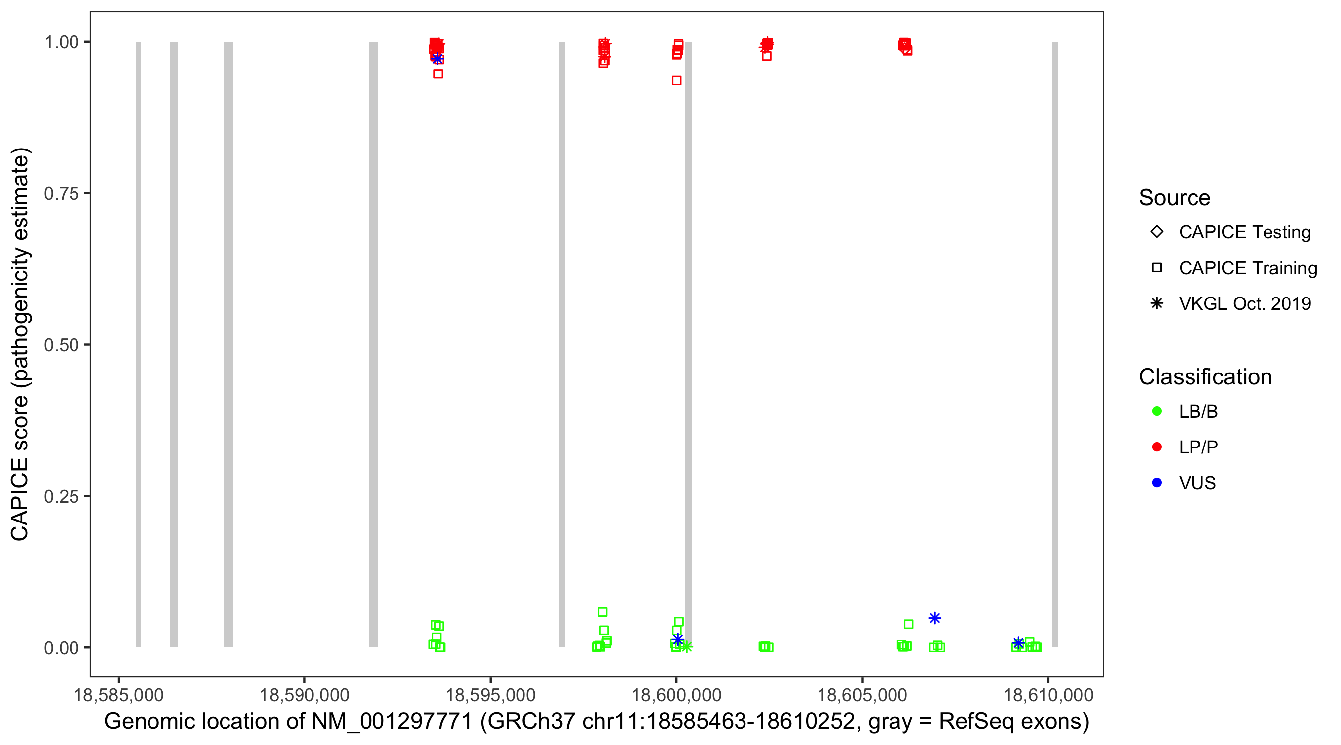 Shown are CAPICE train/test variants plus VKGL Oct 2019.
