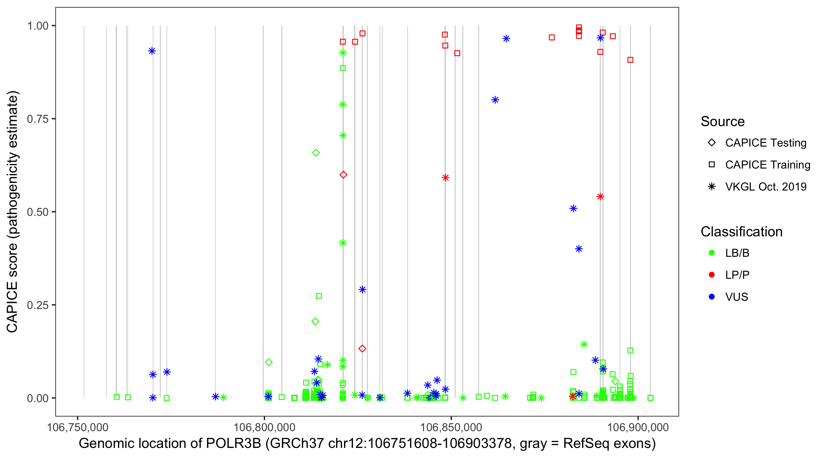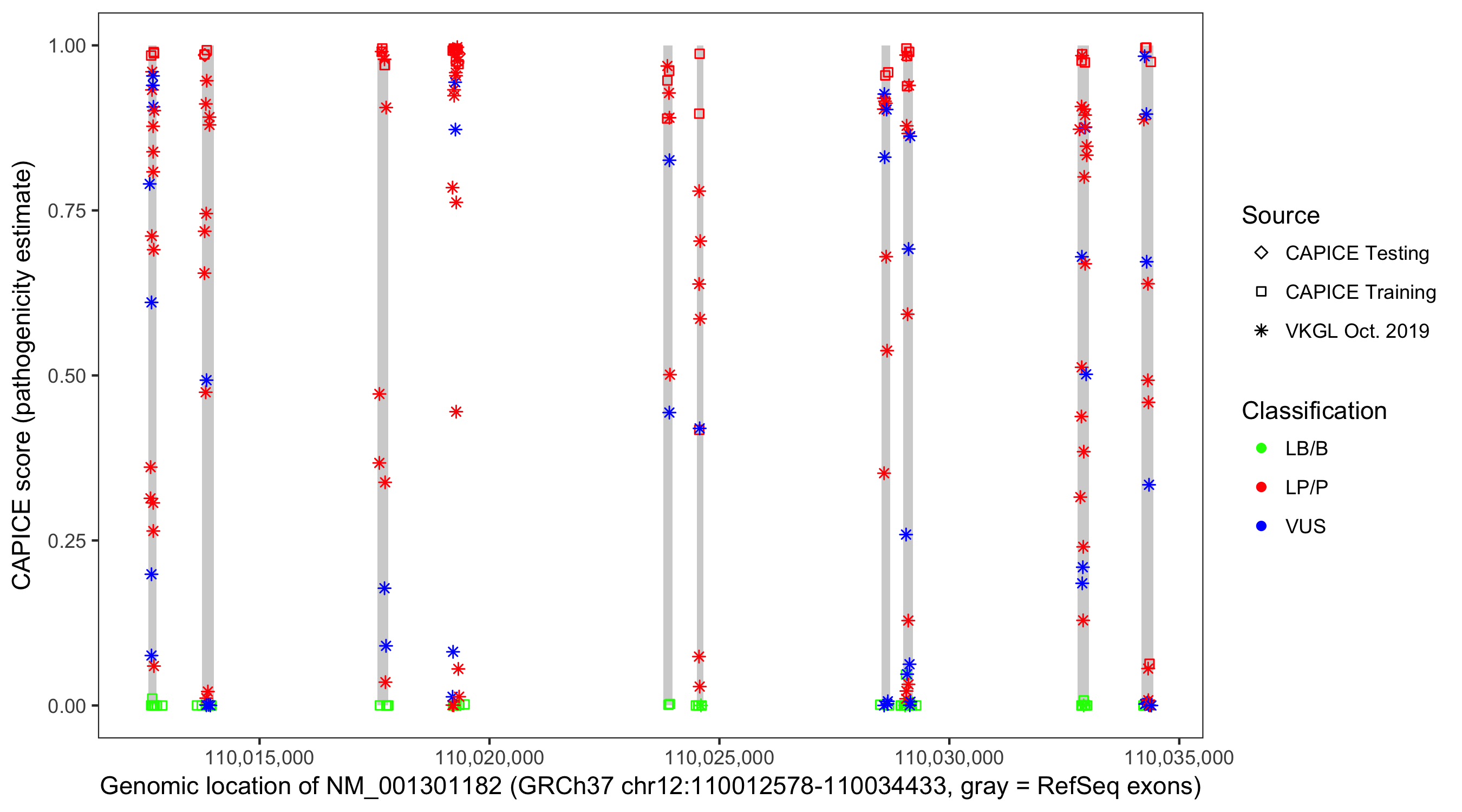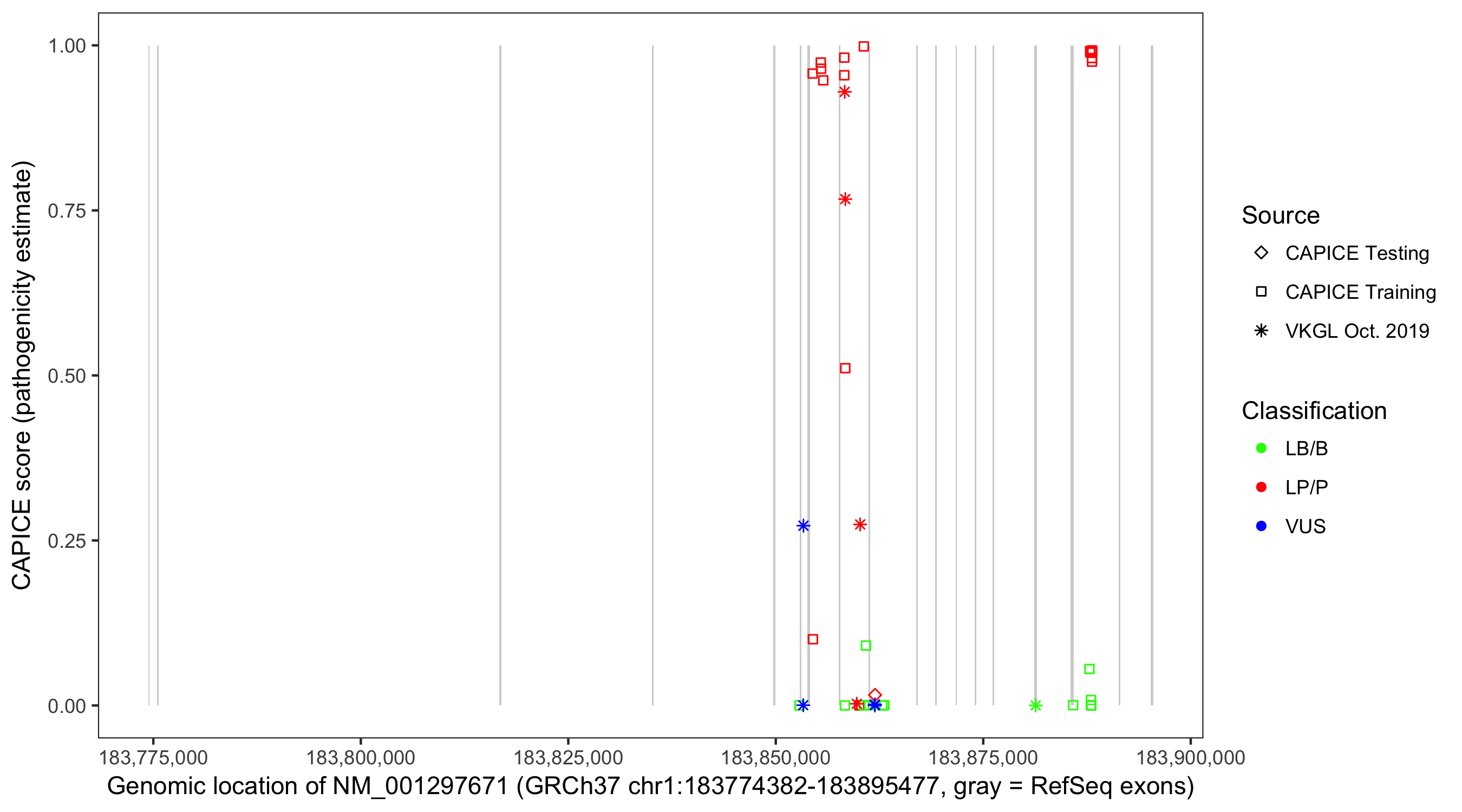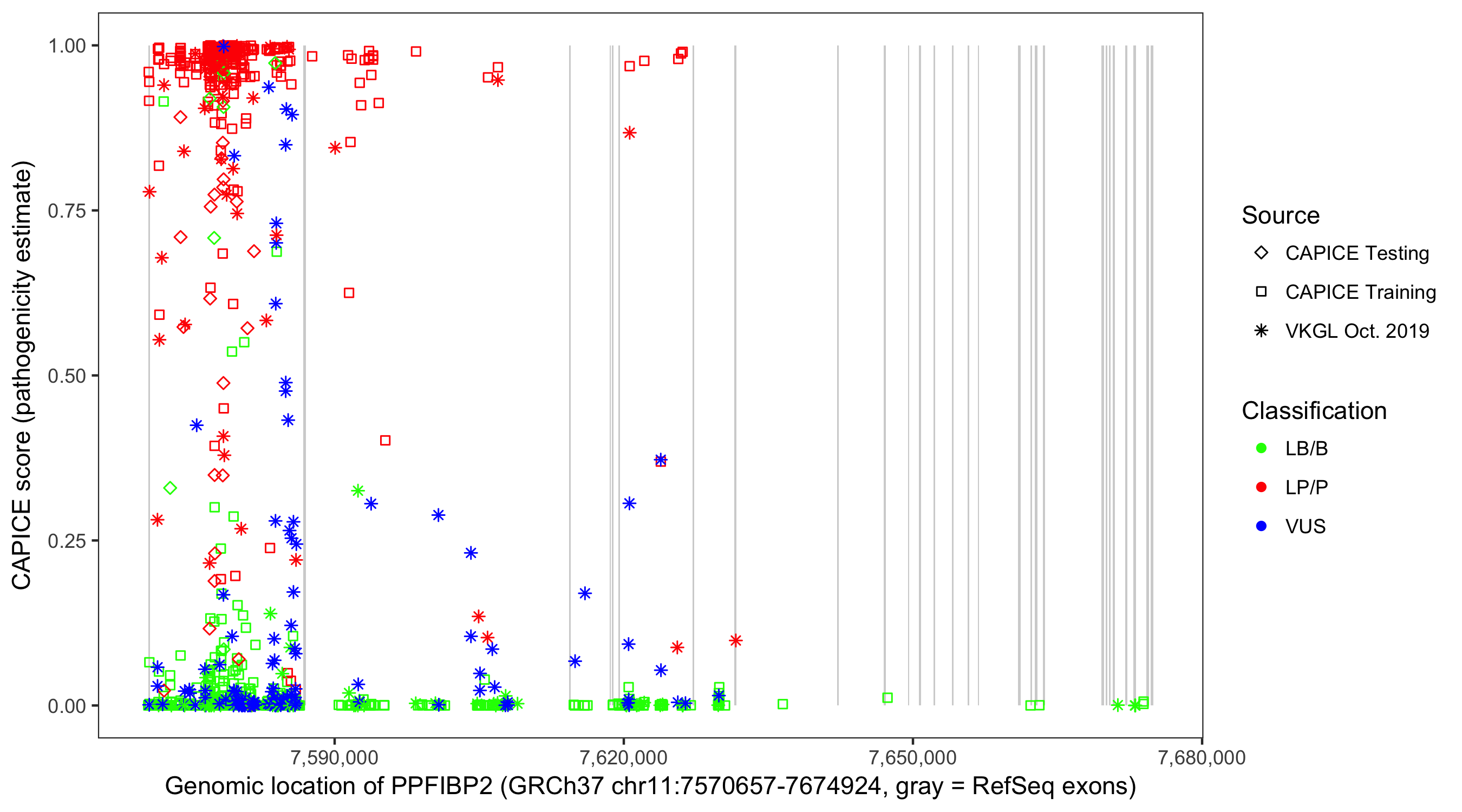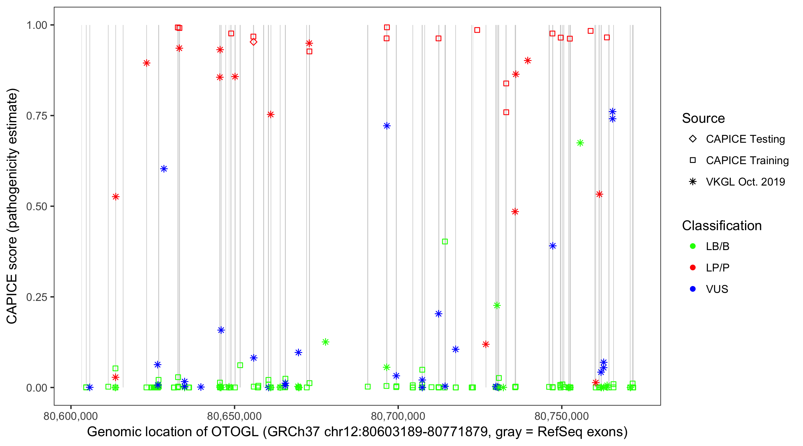 Shown are CAPICE train/test variants plus VKGL Oct 2019.