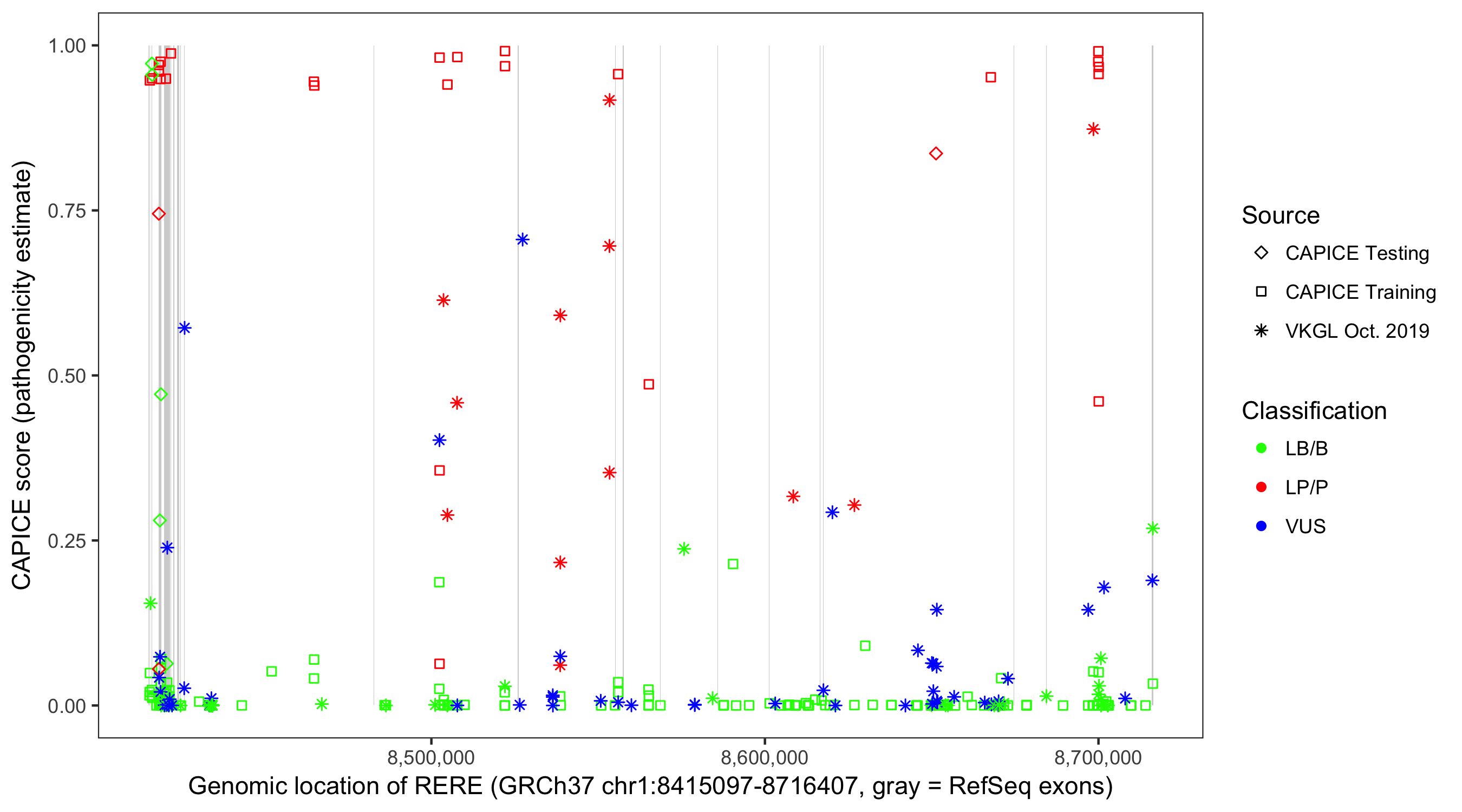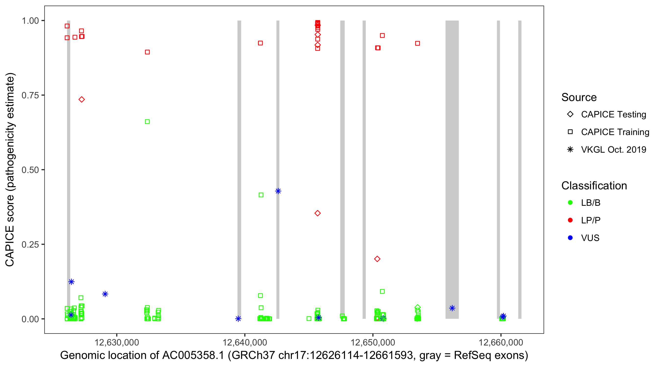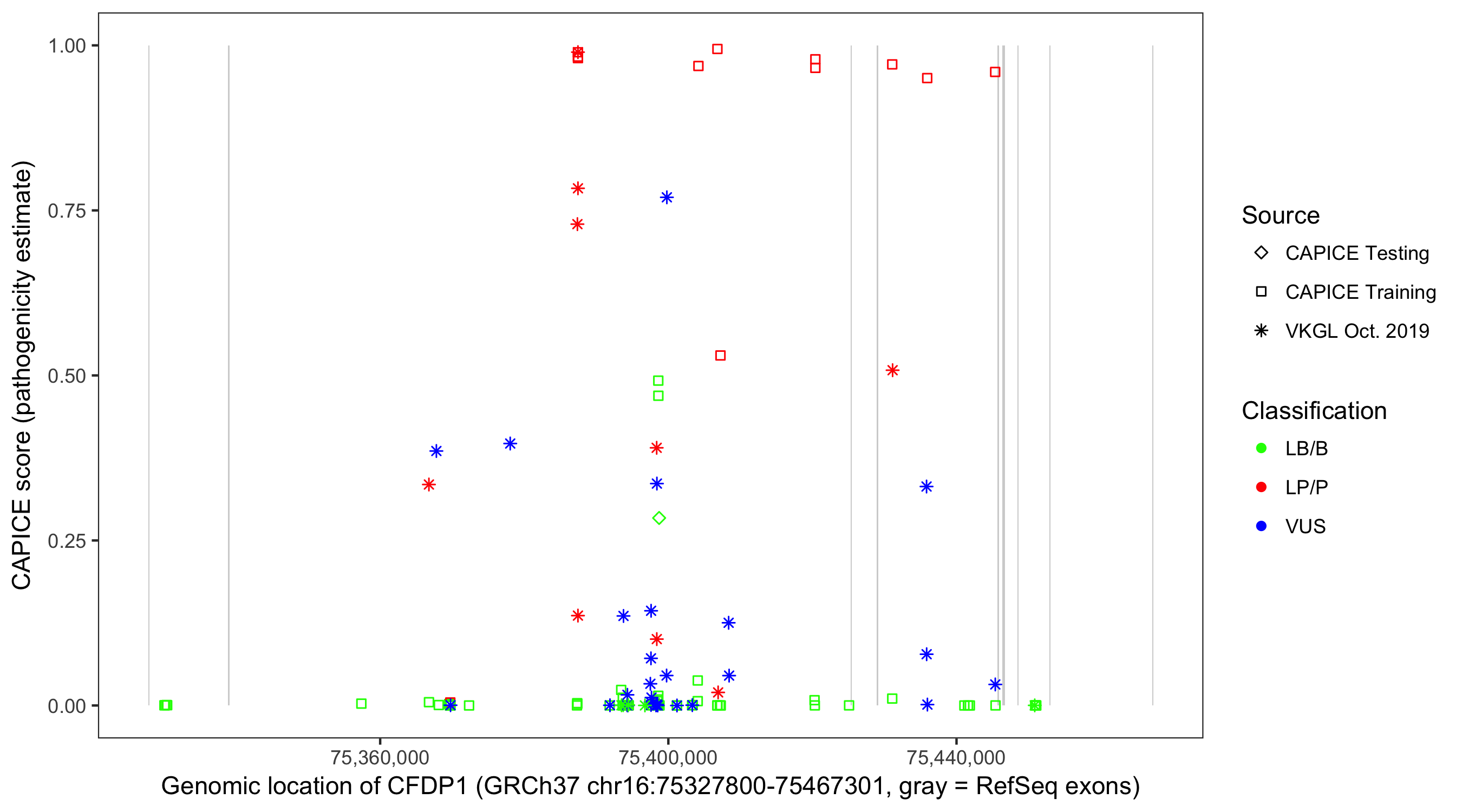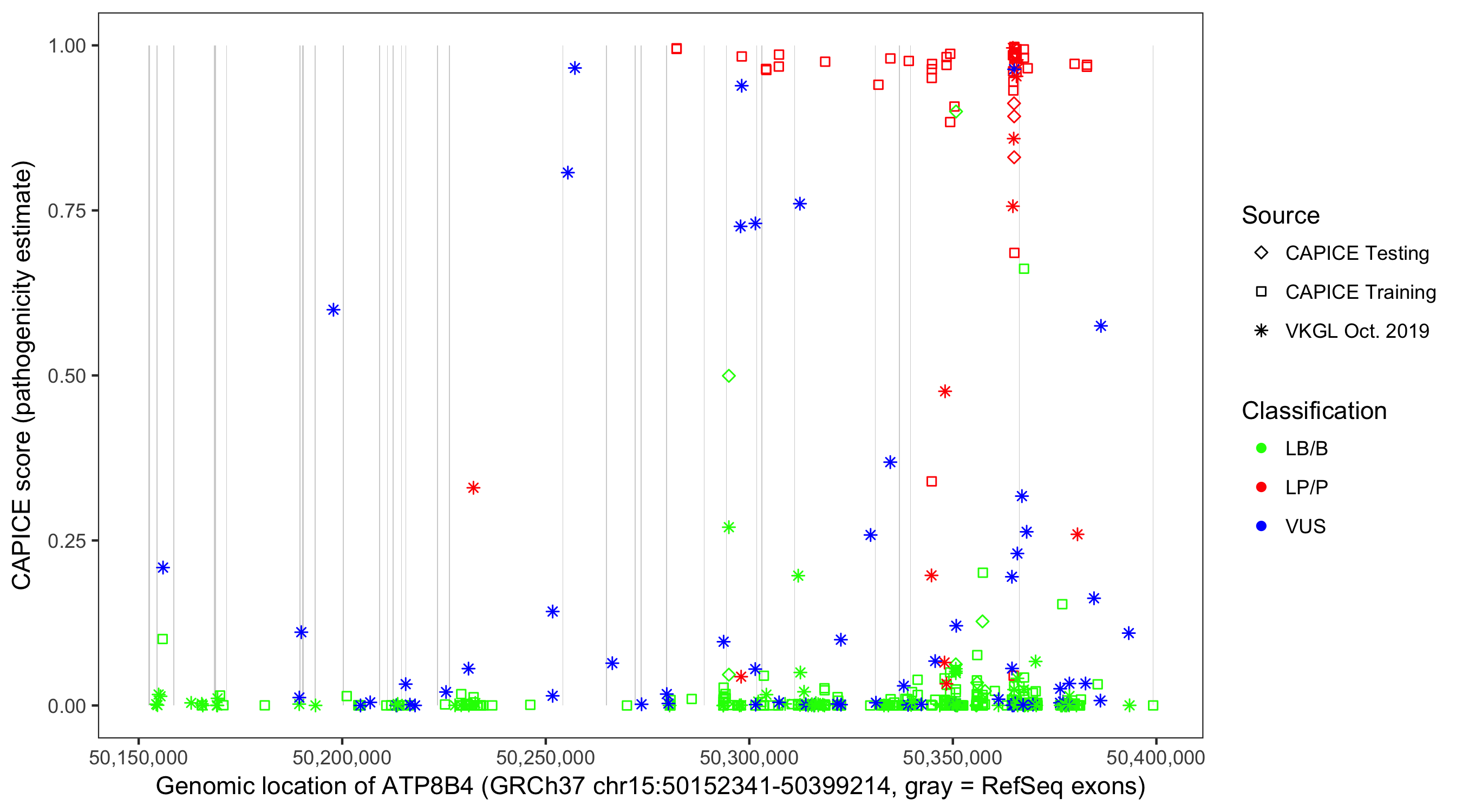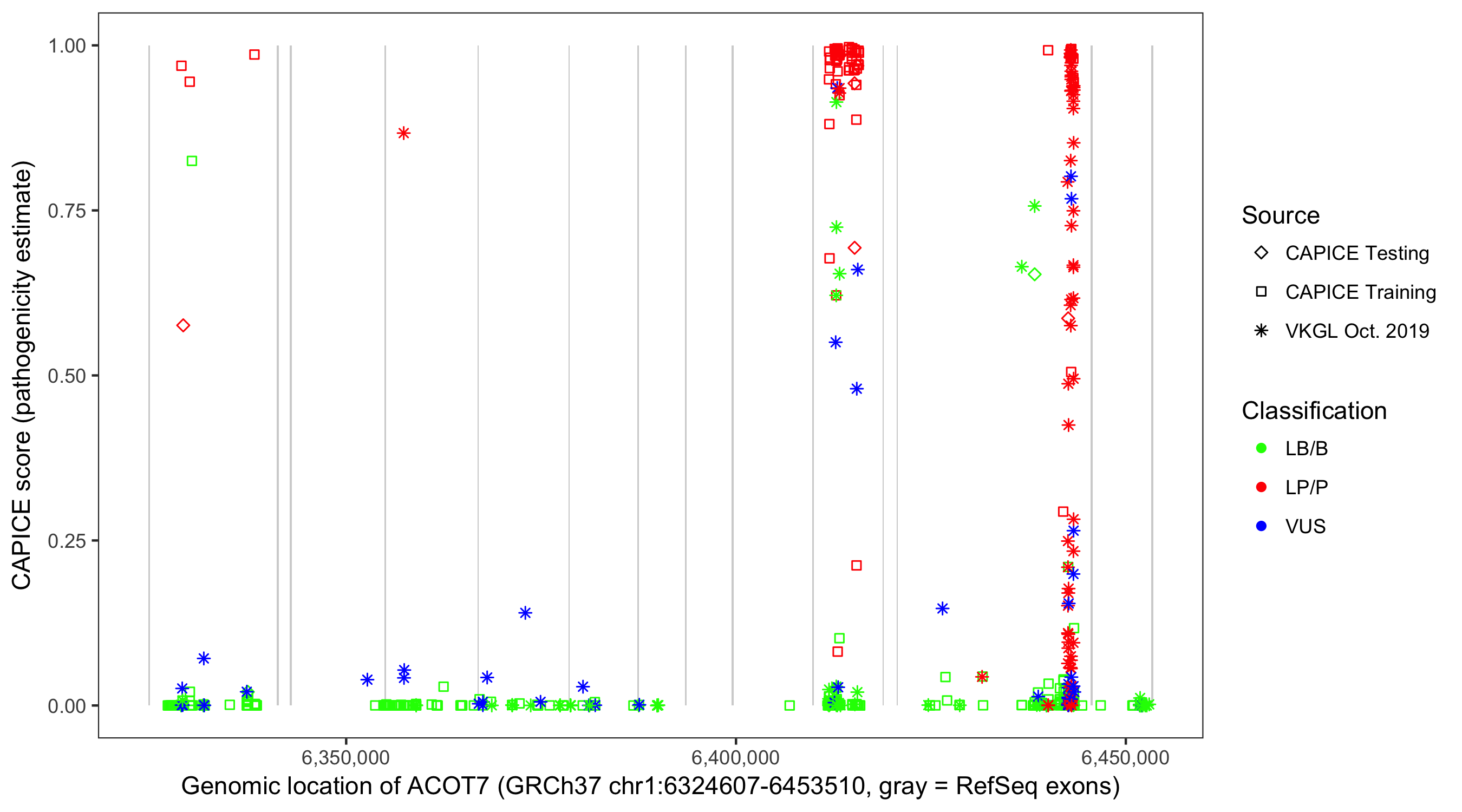 Shown are CAPICE train/test variants plus VKGL Oct 2019.