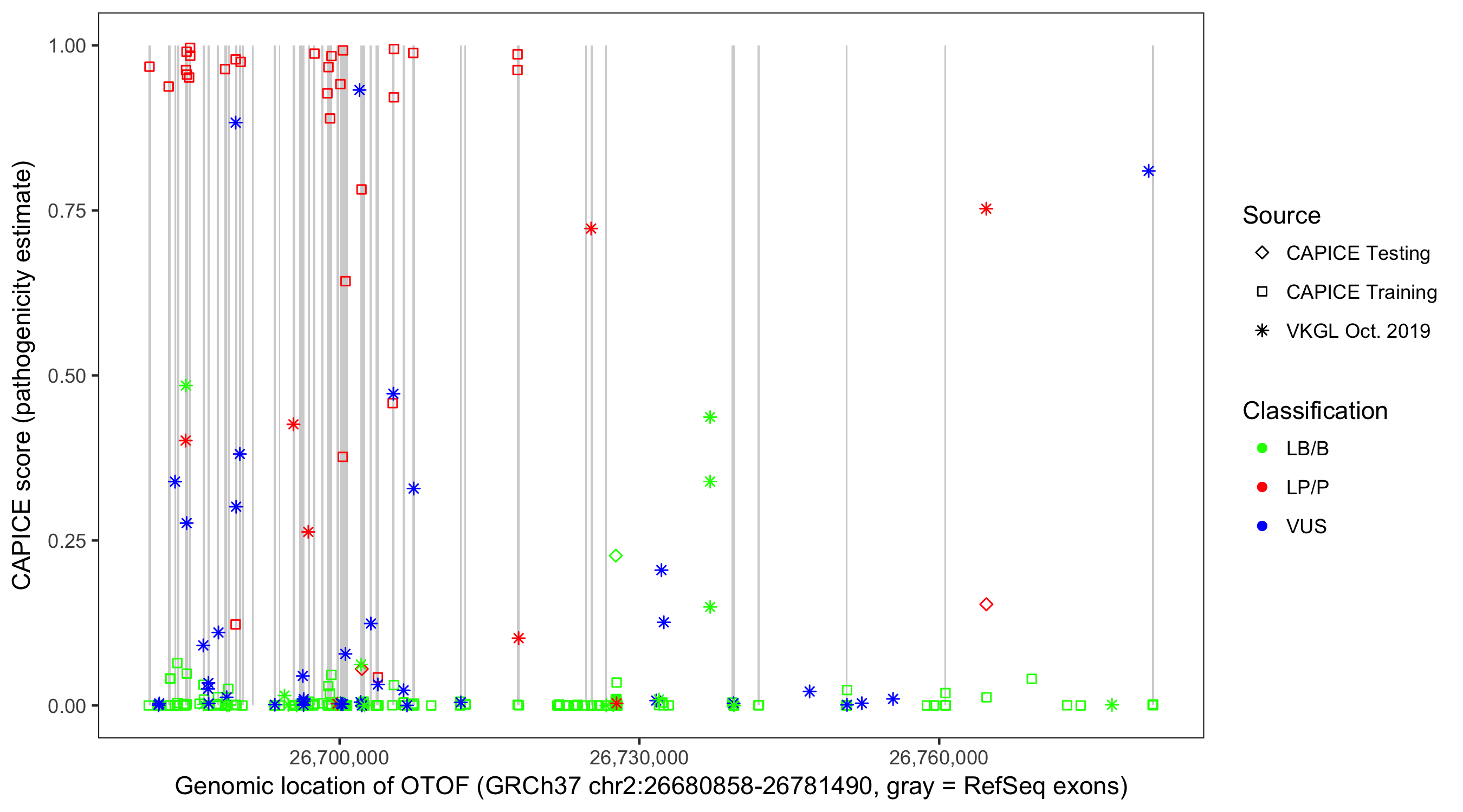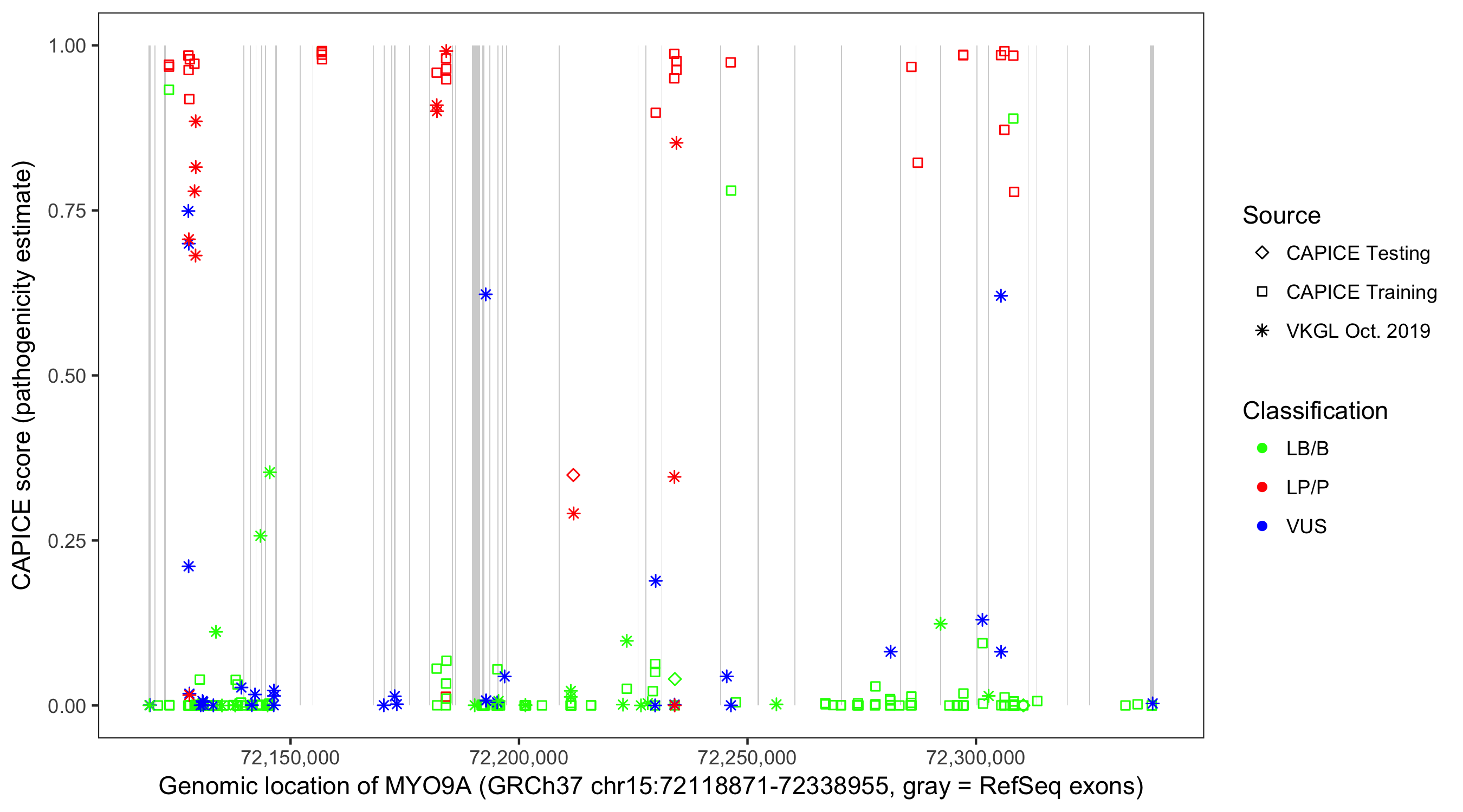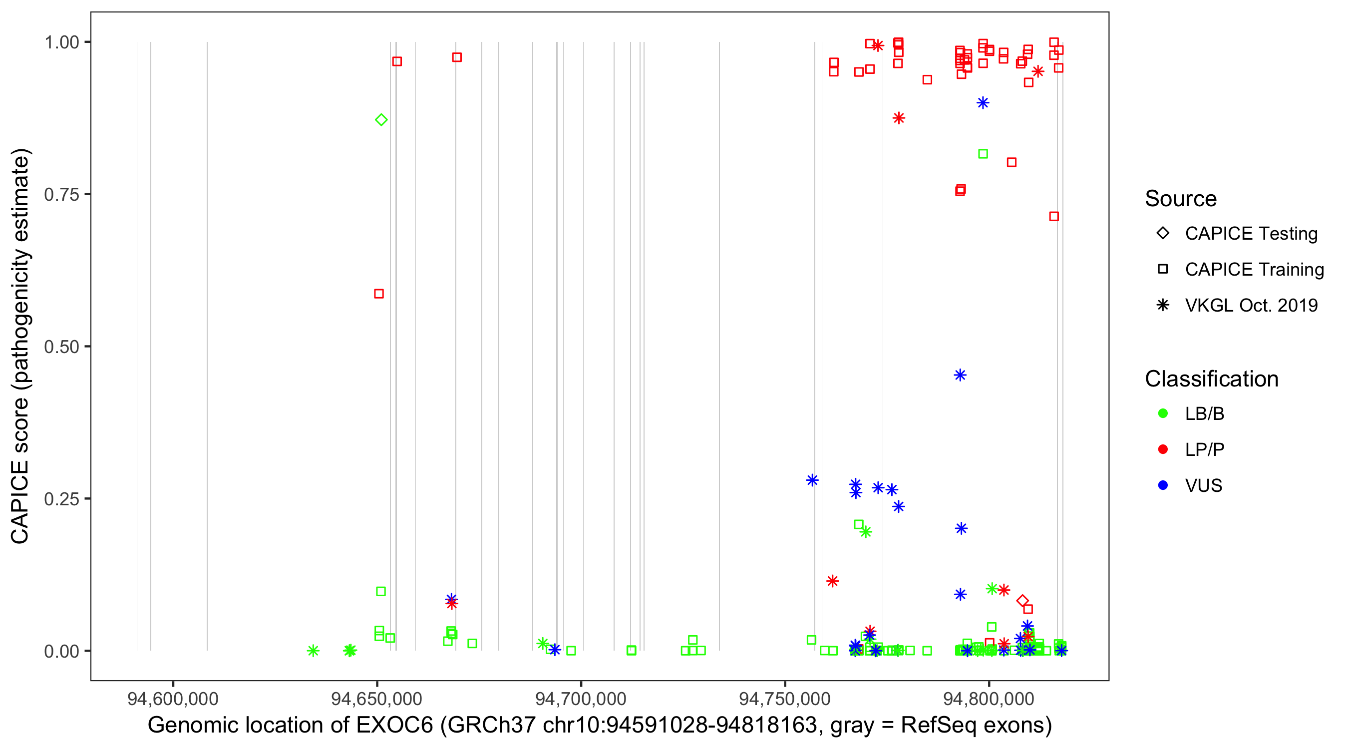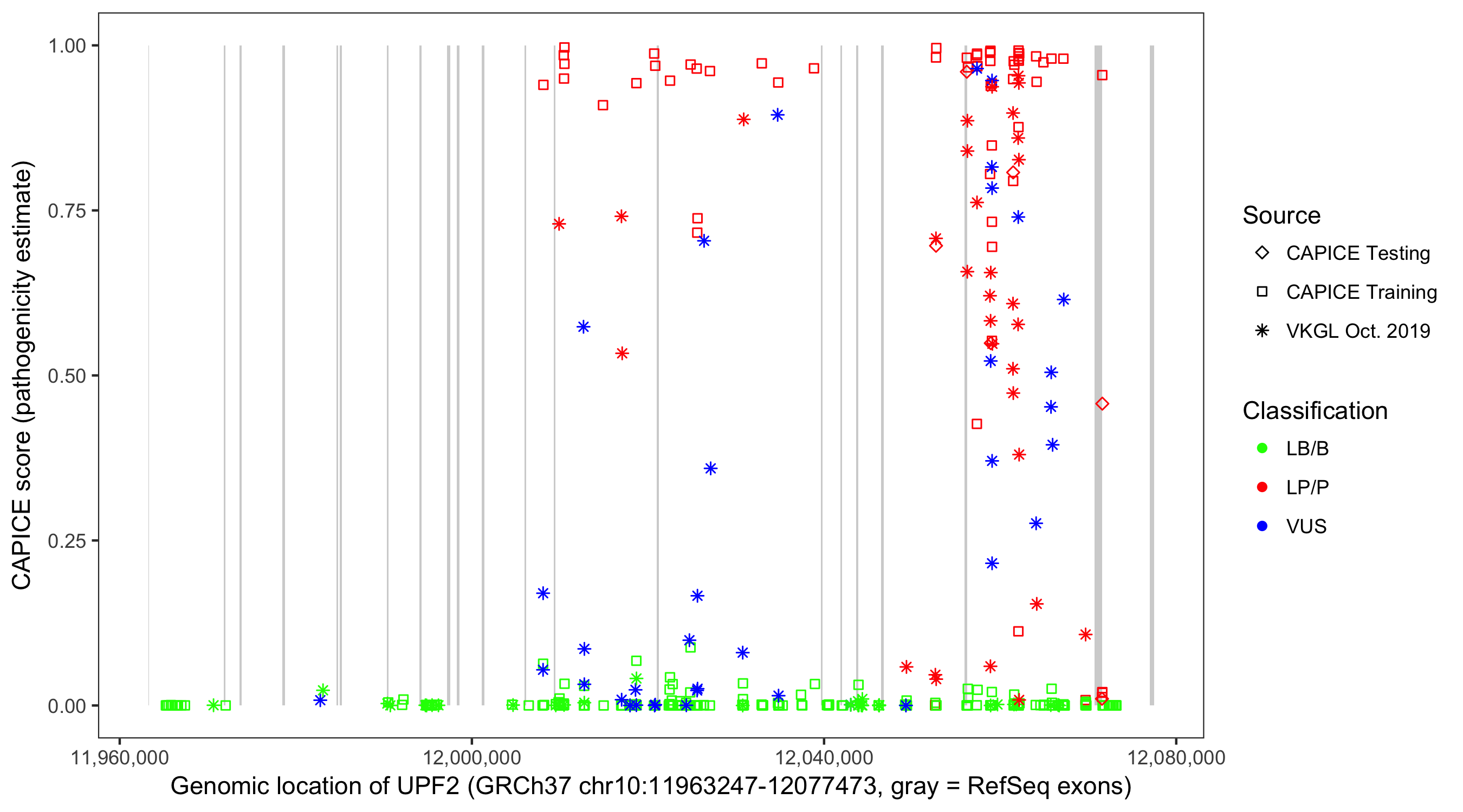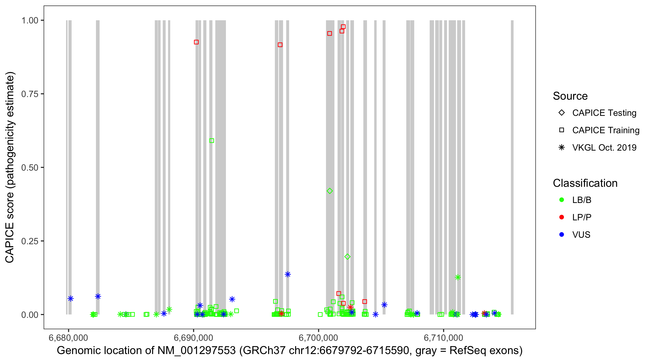 Shown are CAPICE train/test variants plus VKGL Oct 2019.