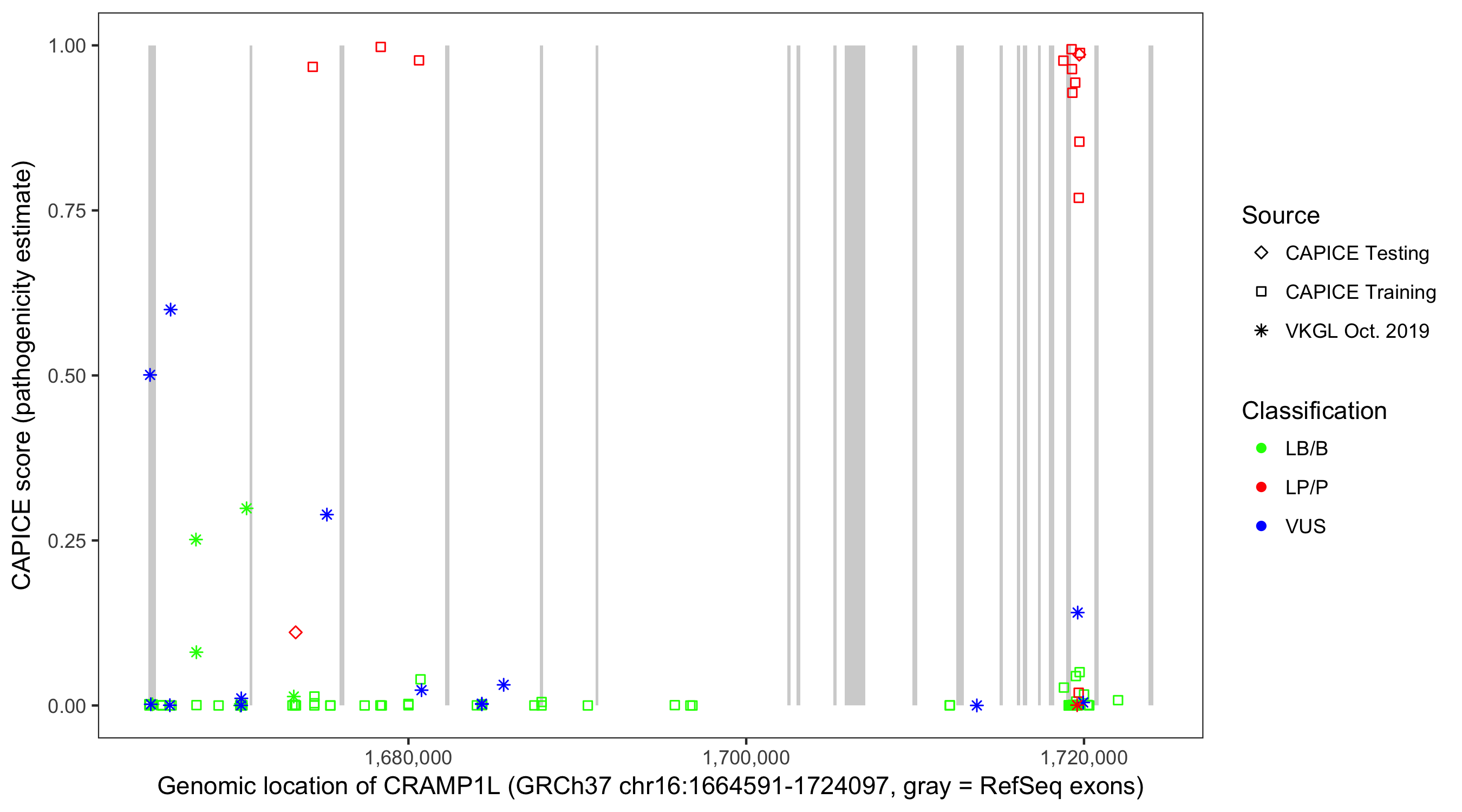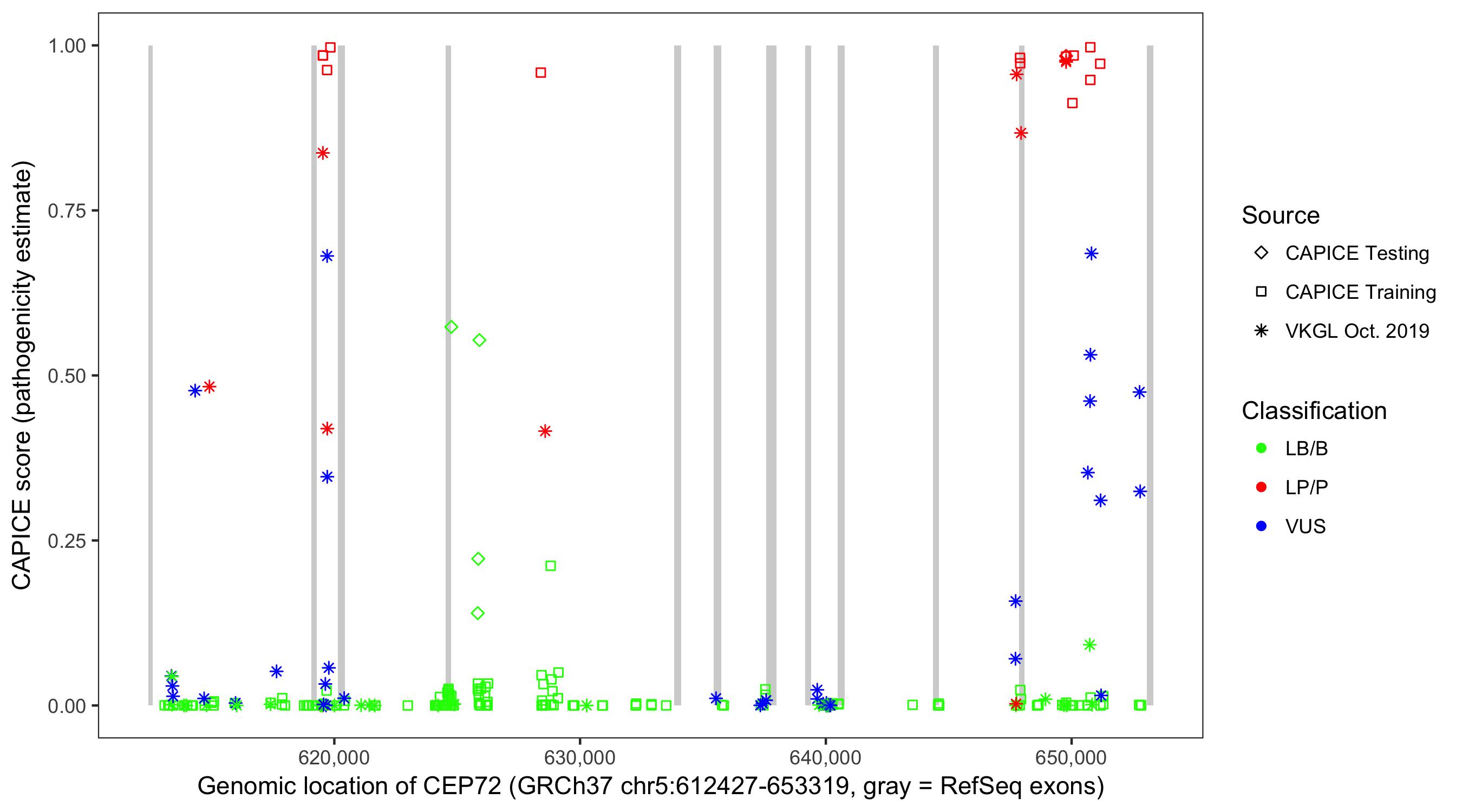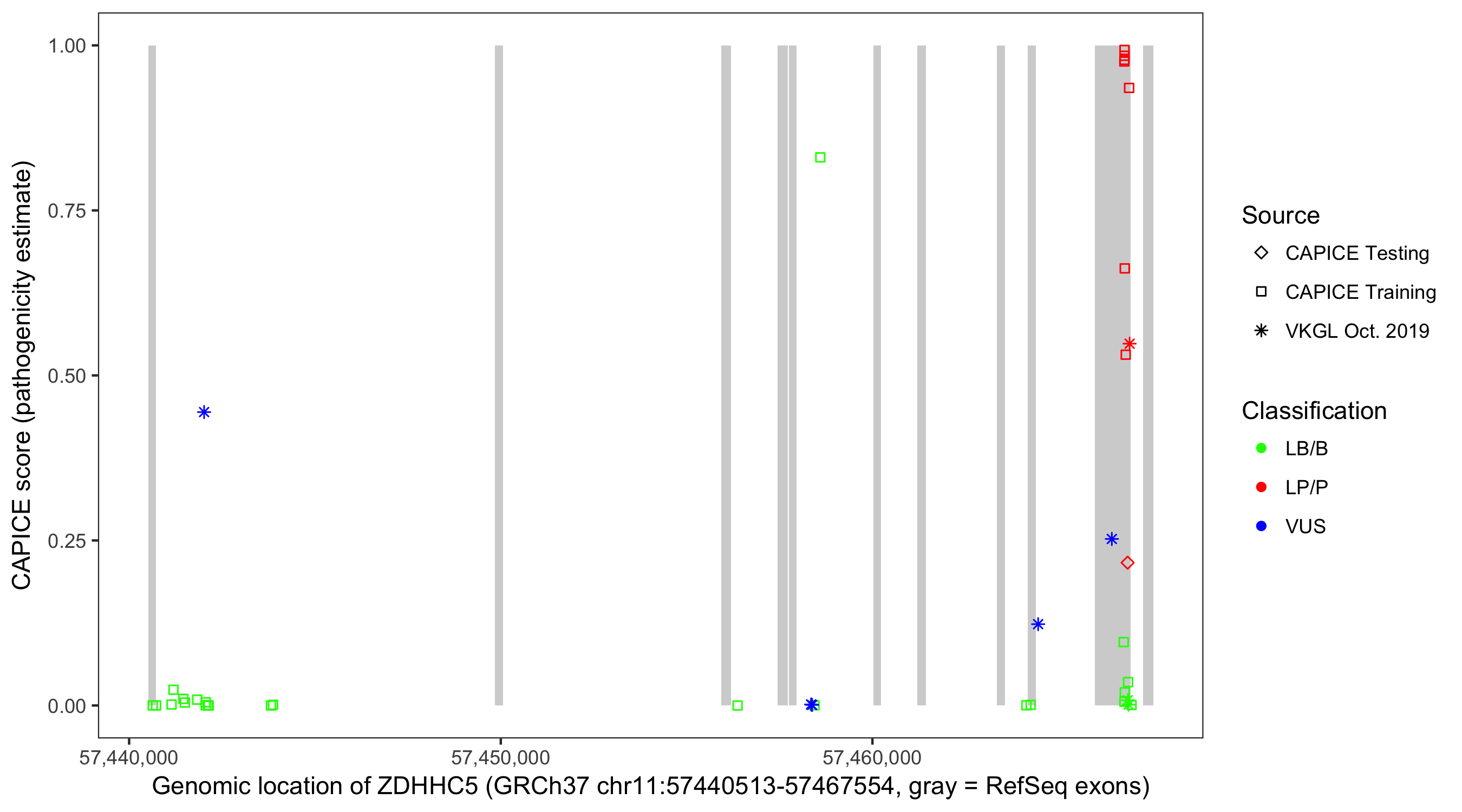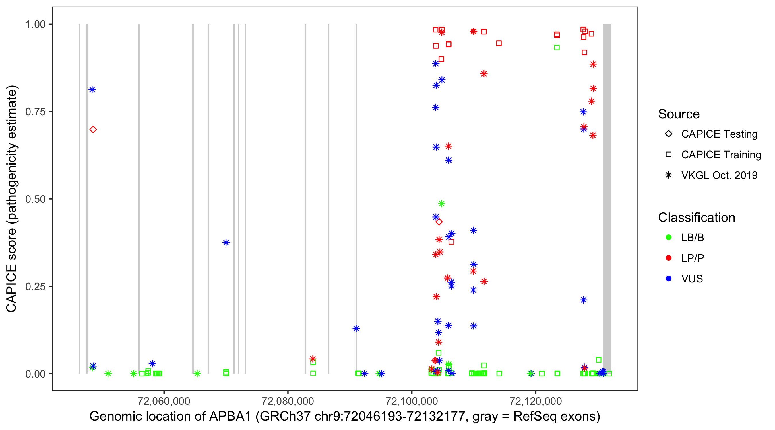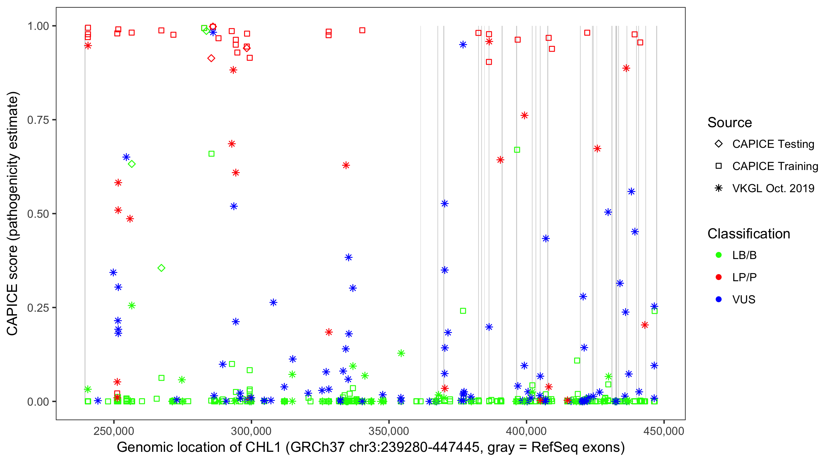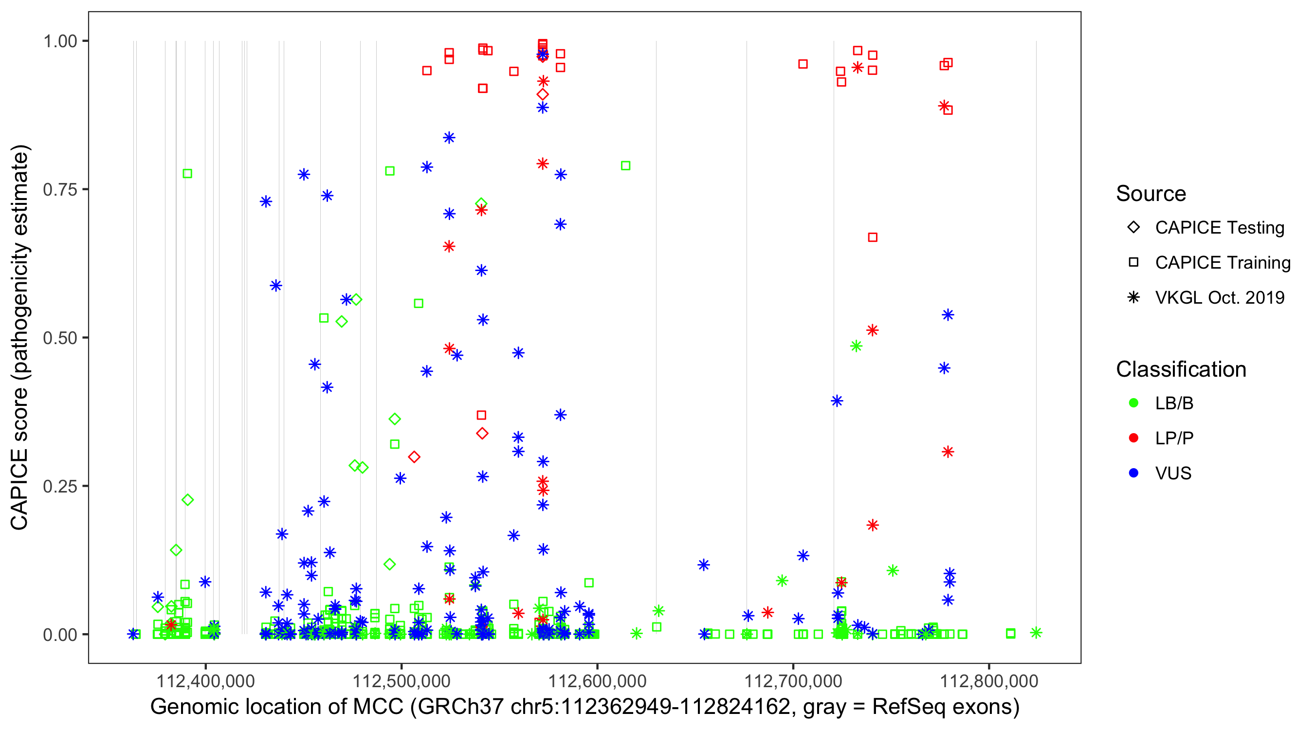 Shown are CAPICE train/test variants plus VKGL Oct 2019.