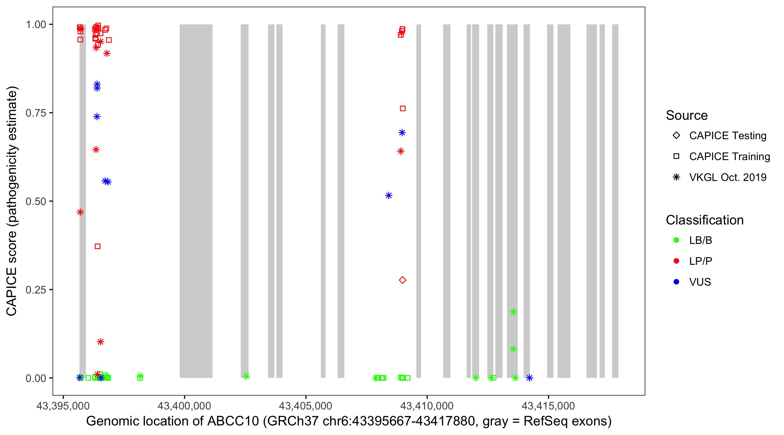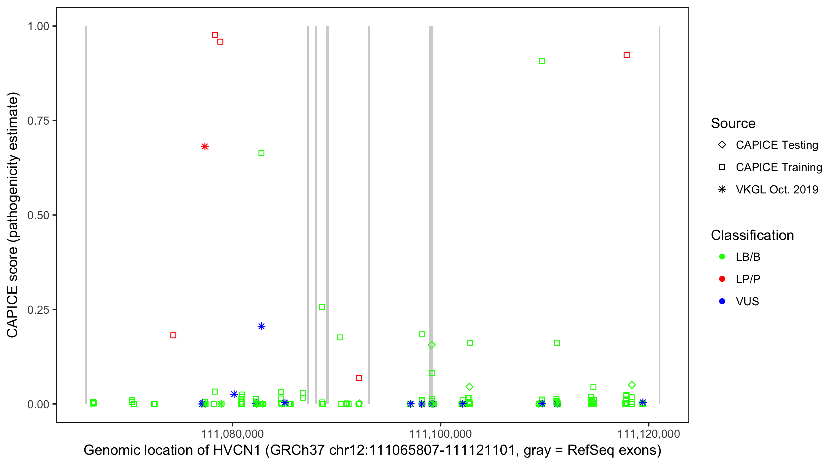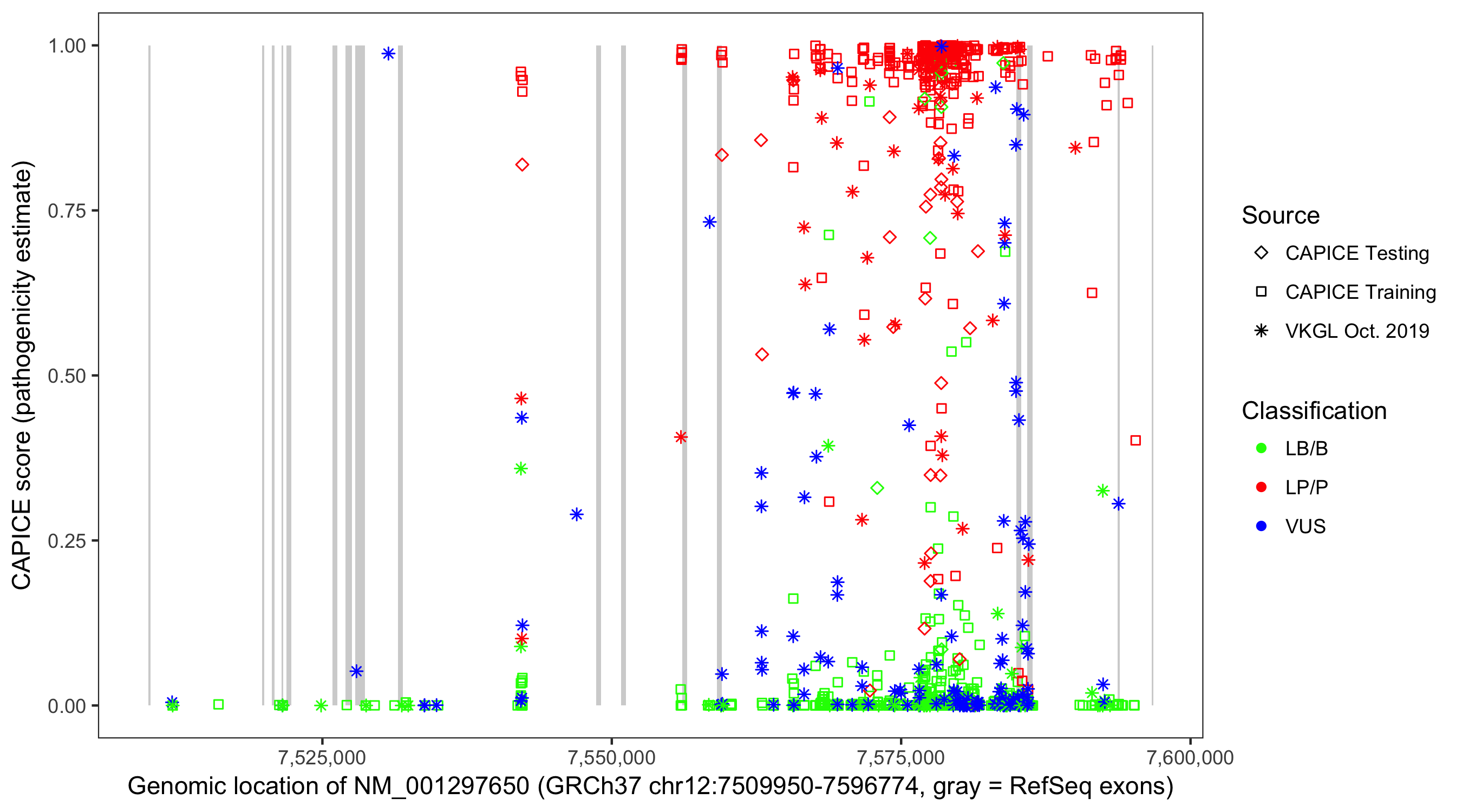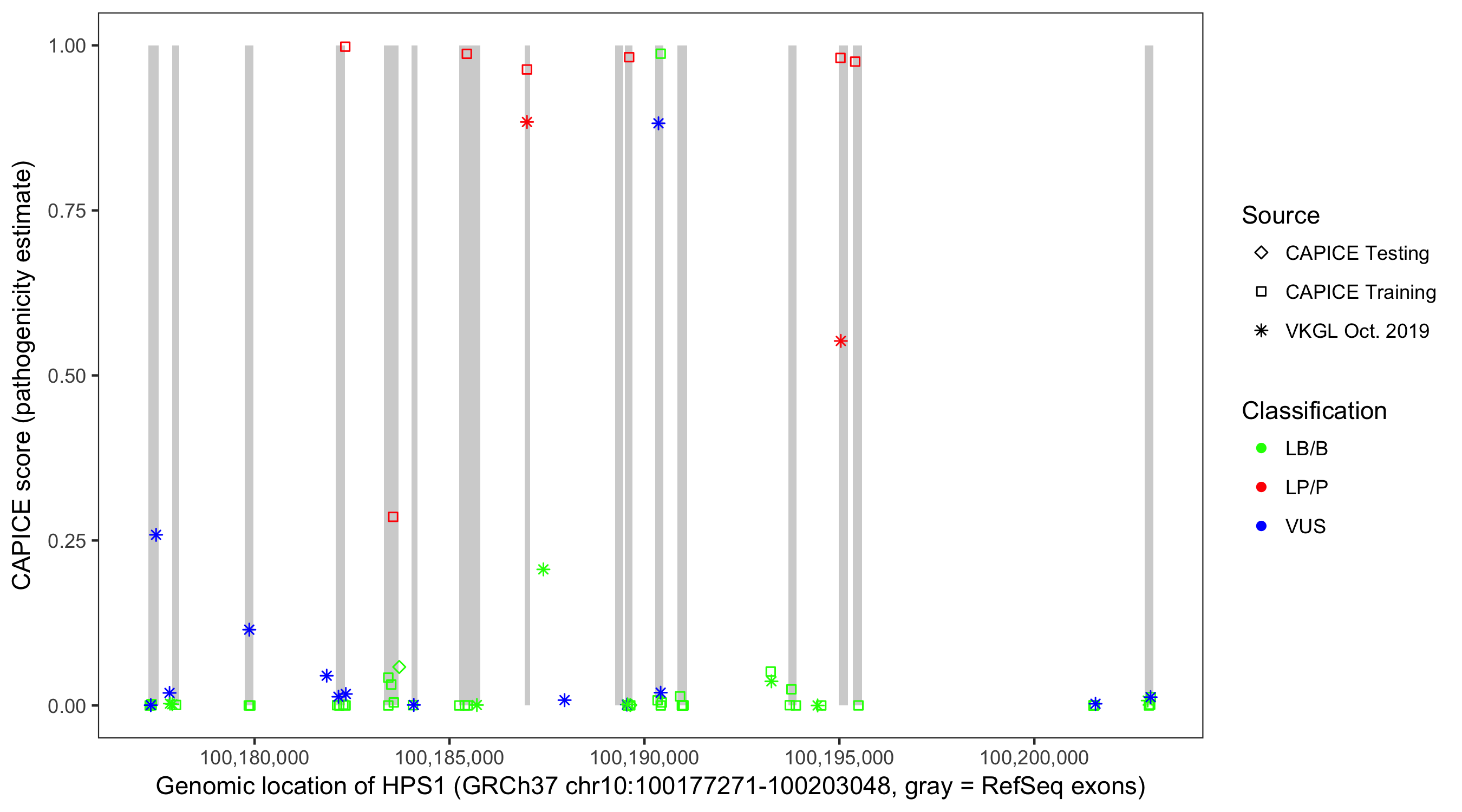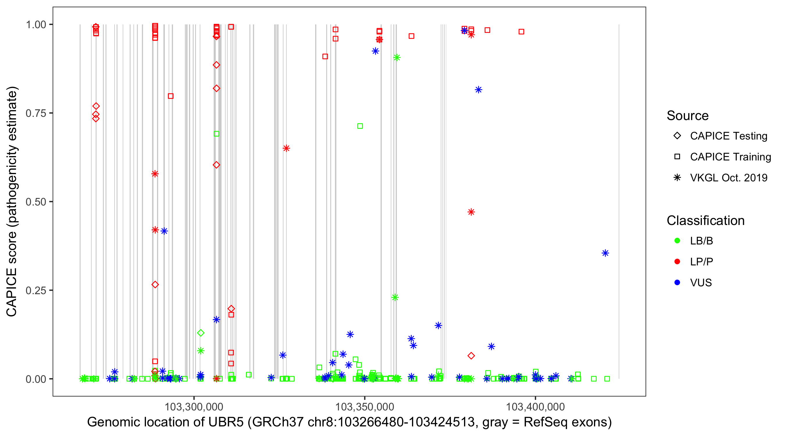 Shown are CAPICE train/test variants plus VKGL Oct 2019.