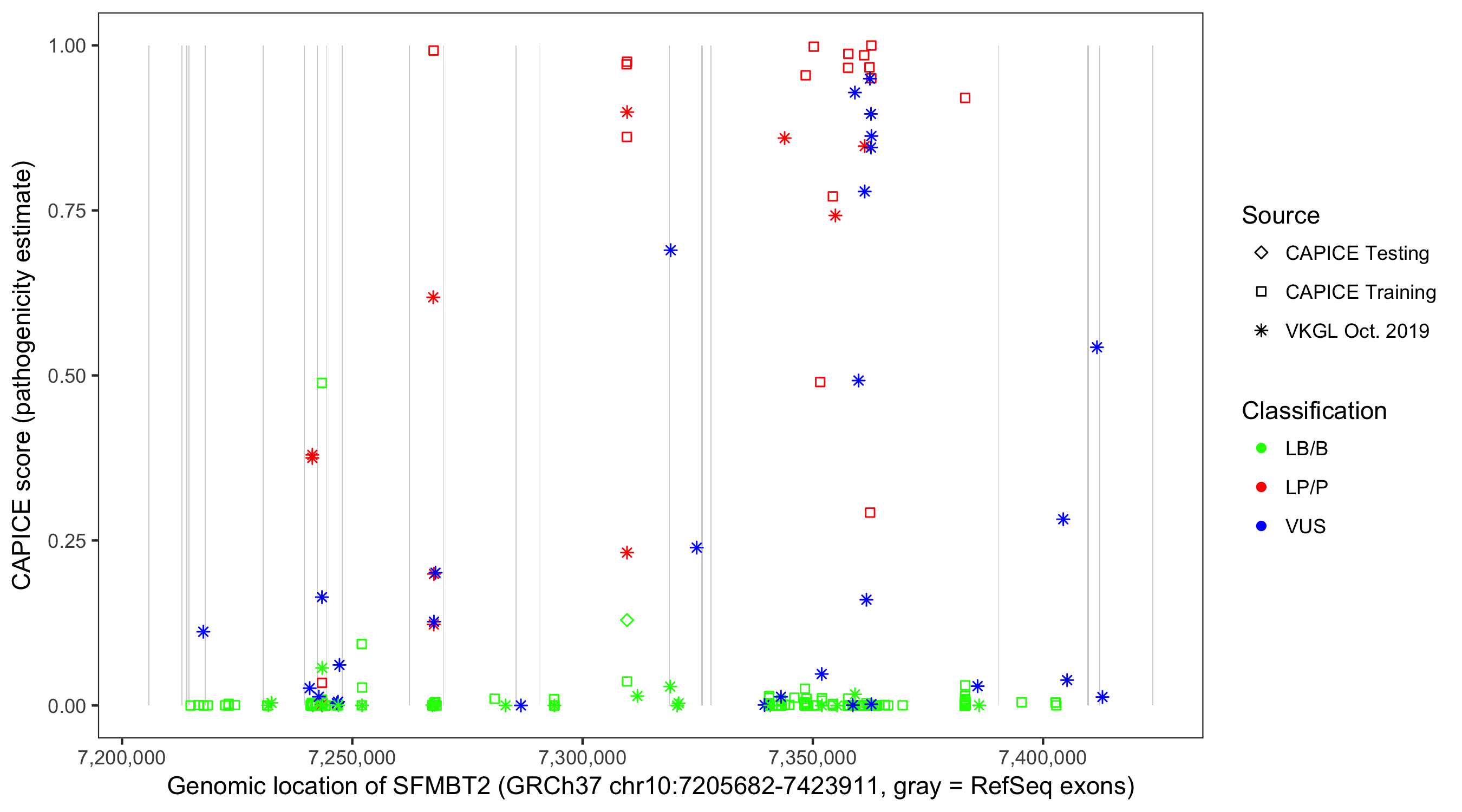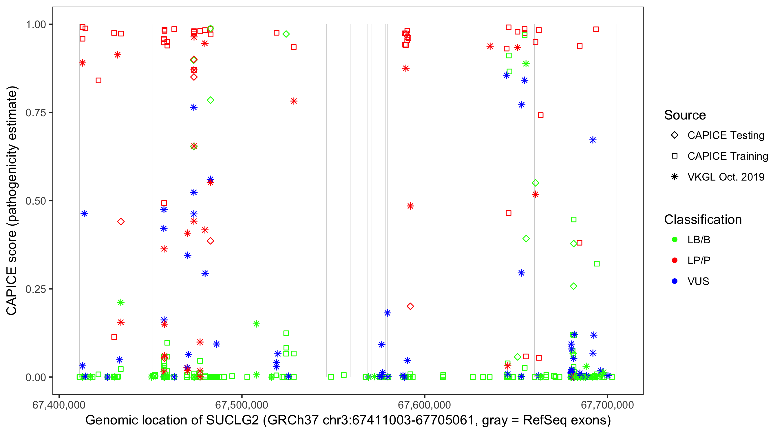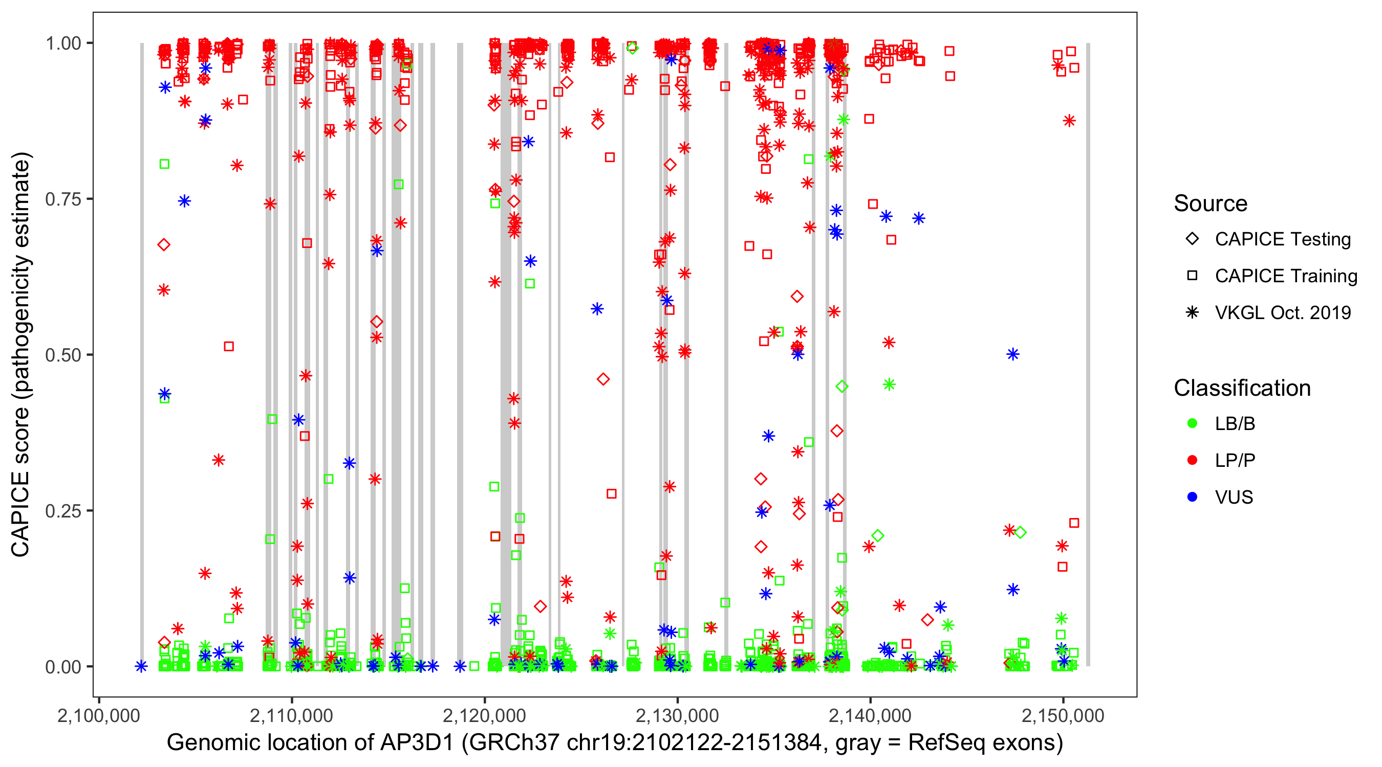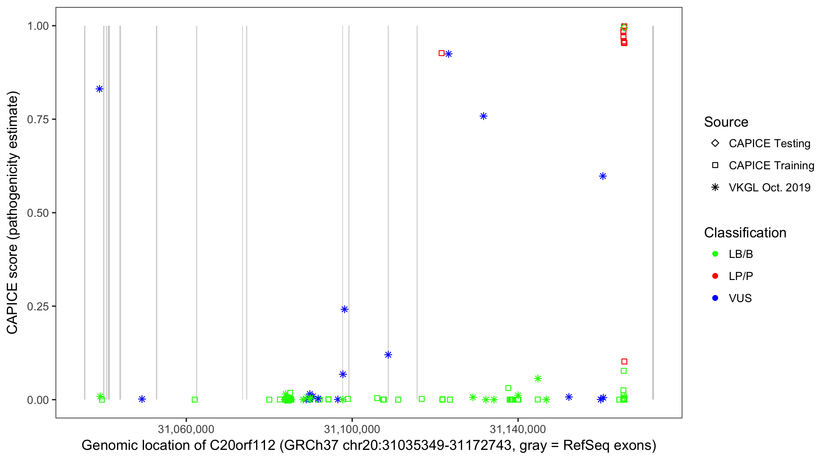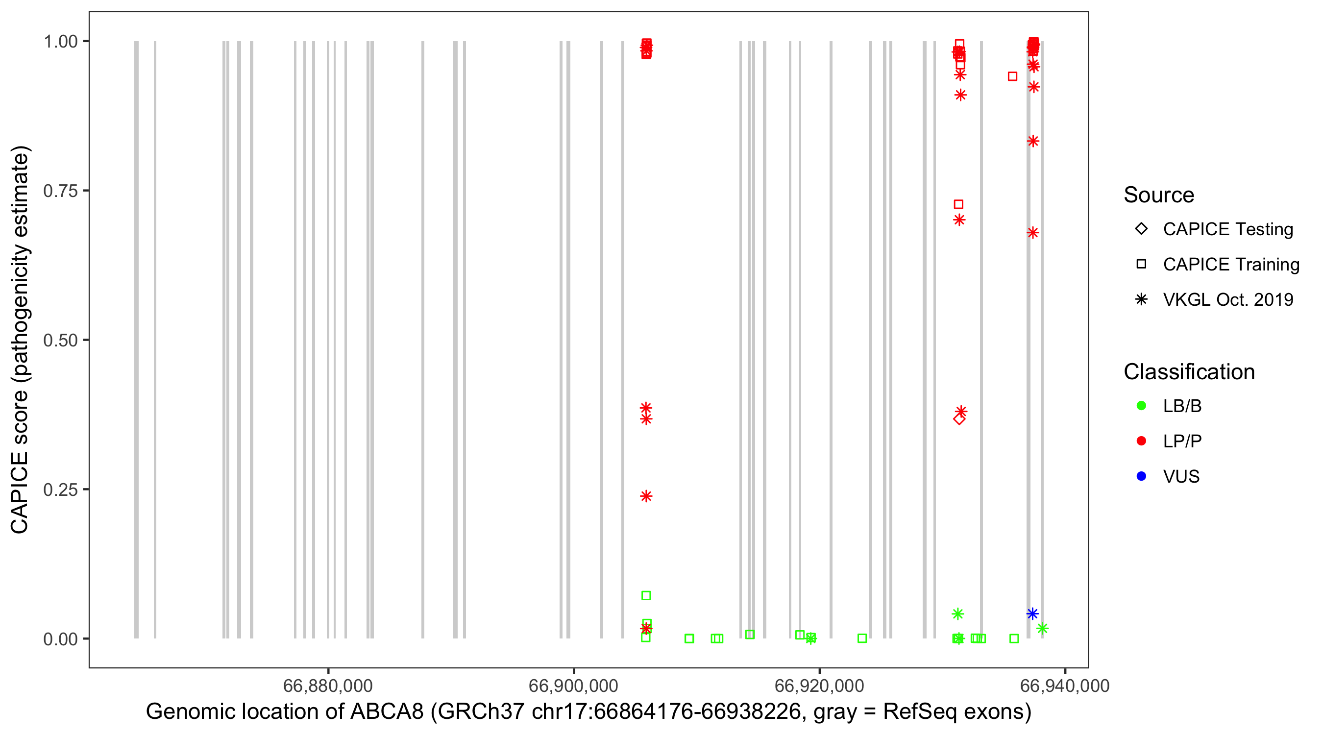 Shown are CAPICE train/test variants plus VKGL Oct 2019.