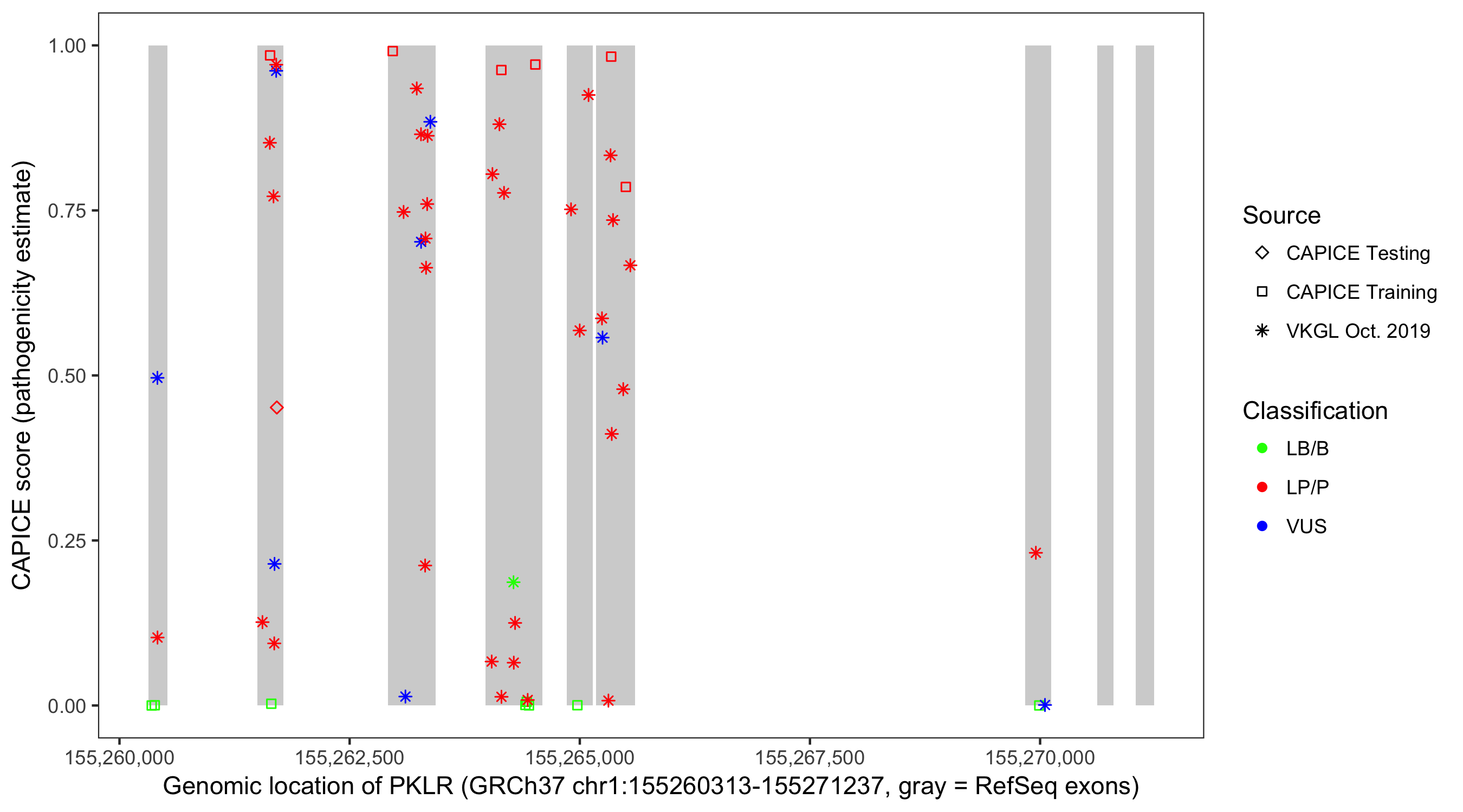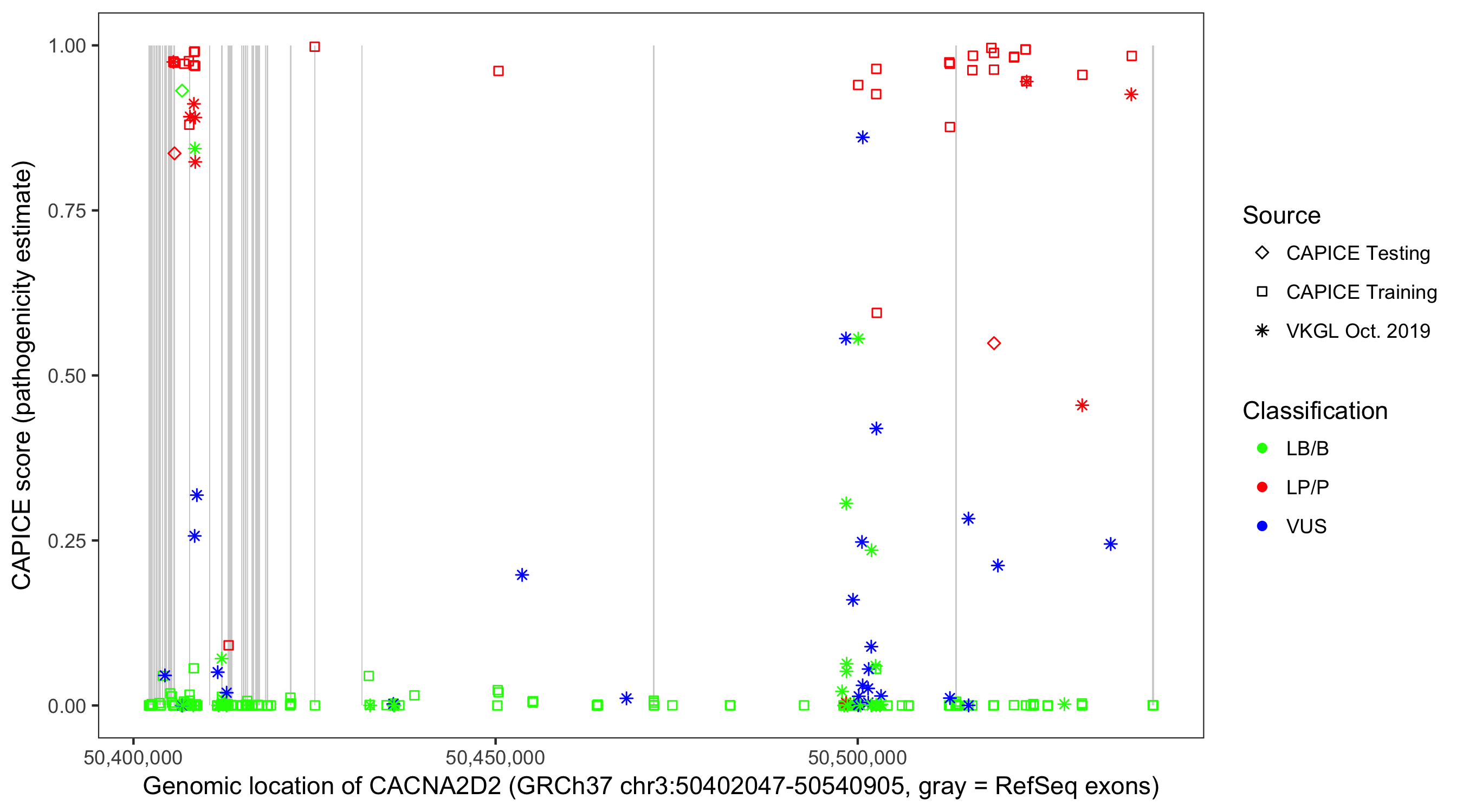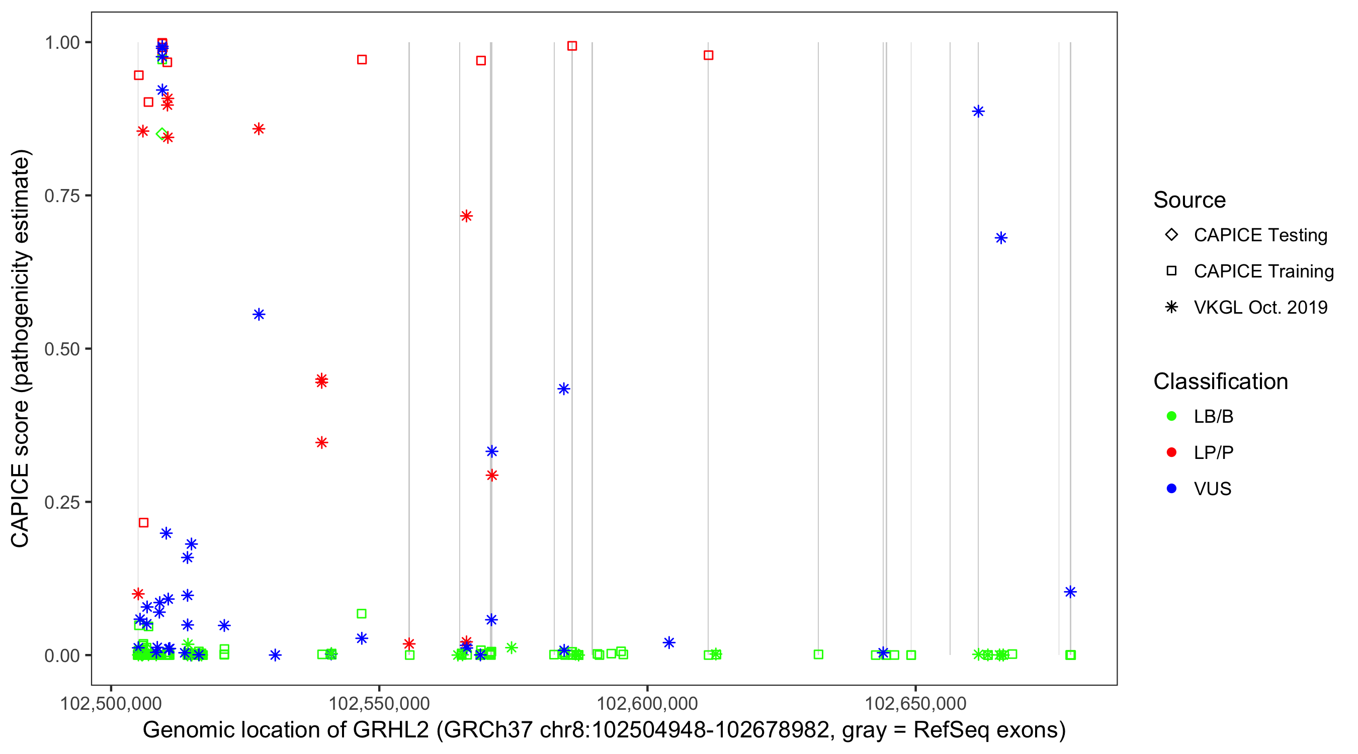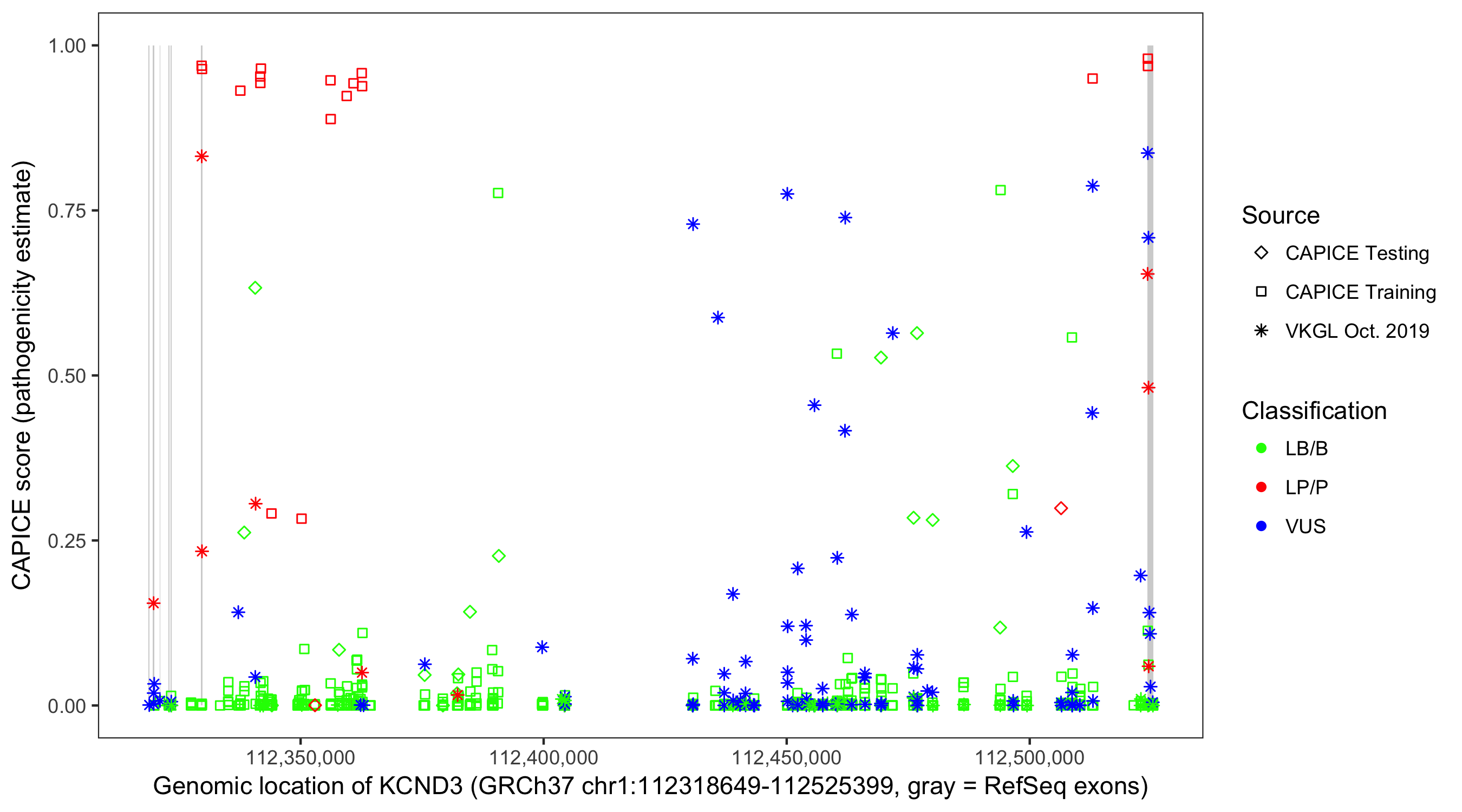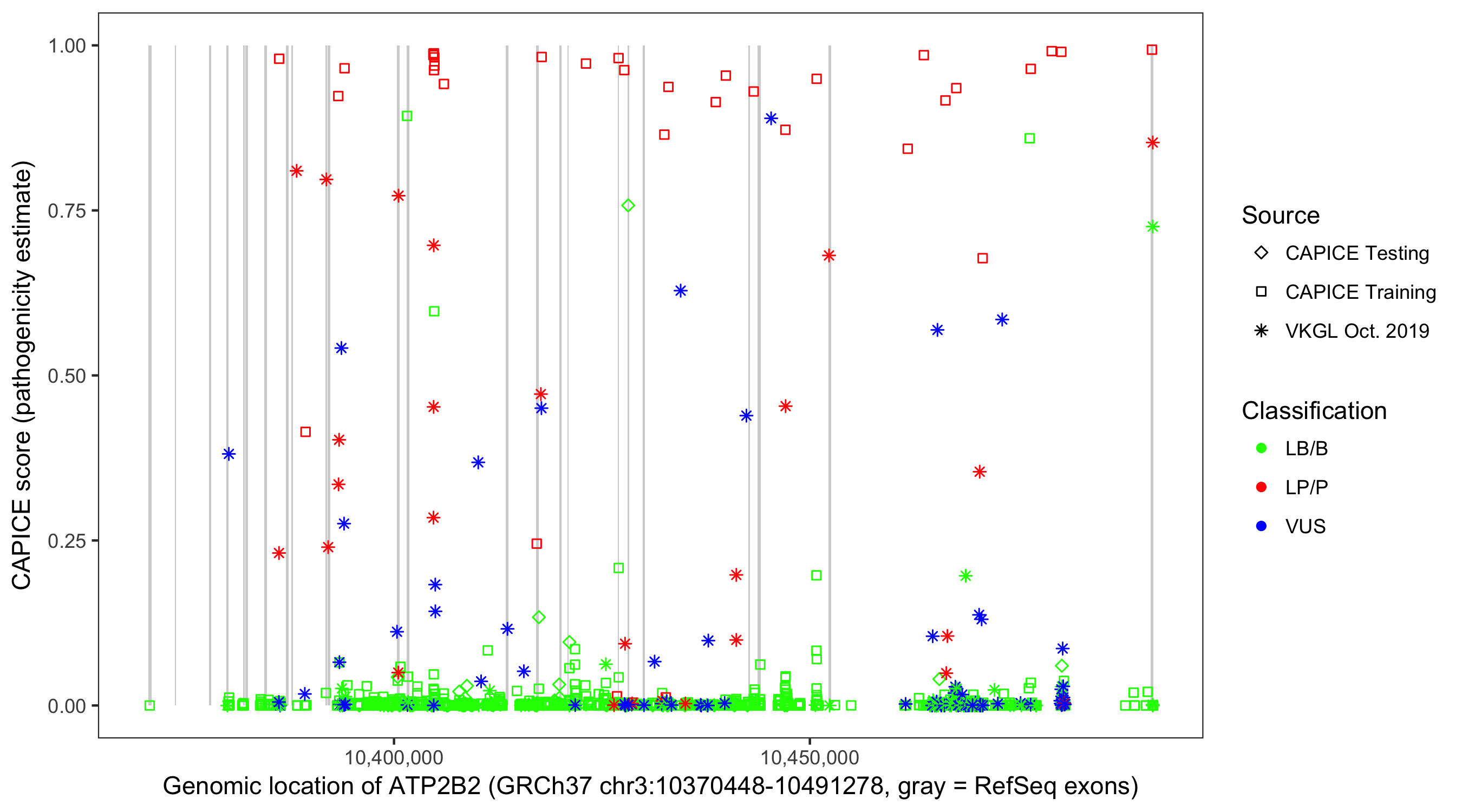 Shown are CAPICE train/test variants plus VKGL Oct 2019.