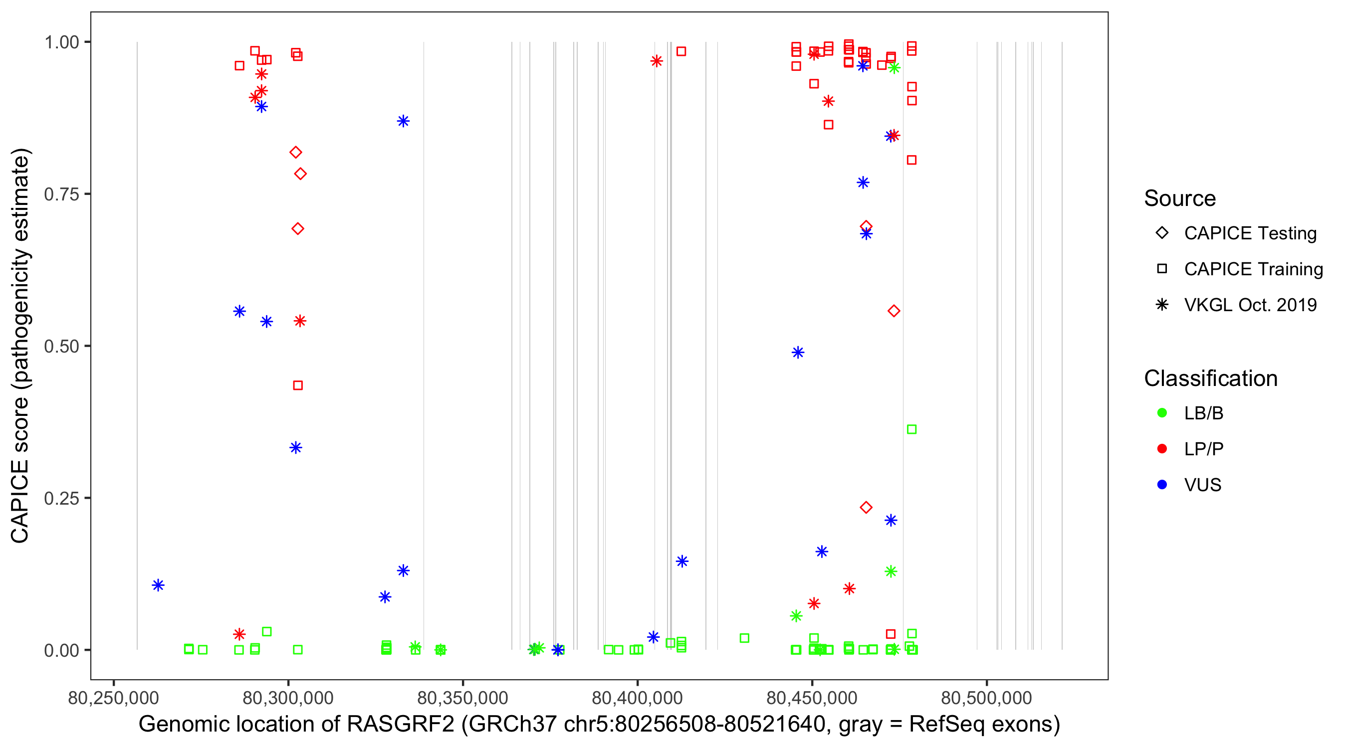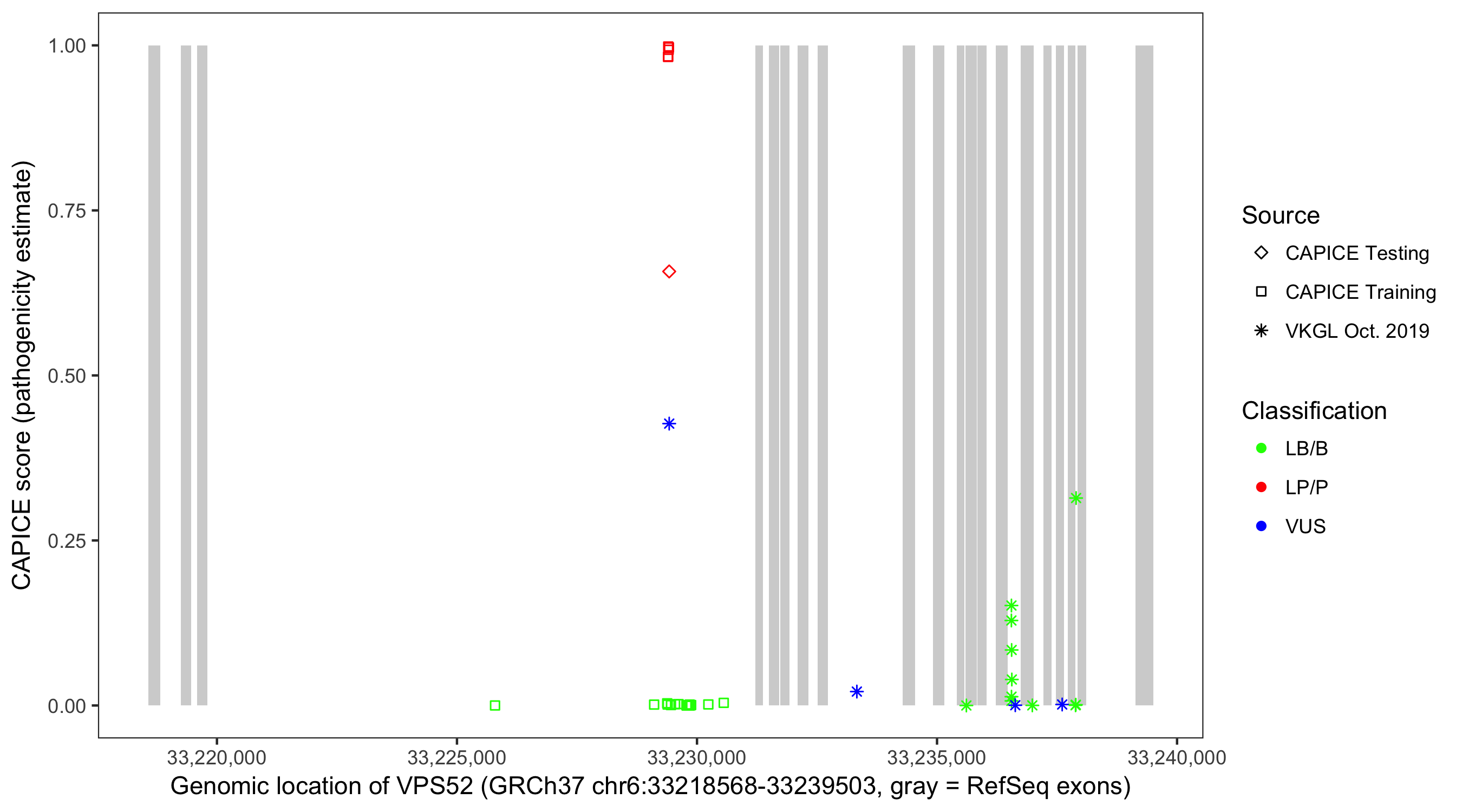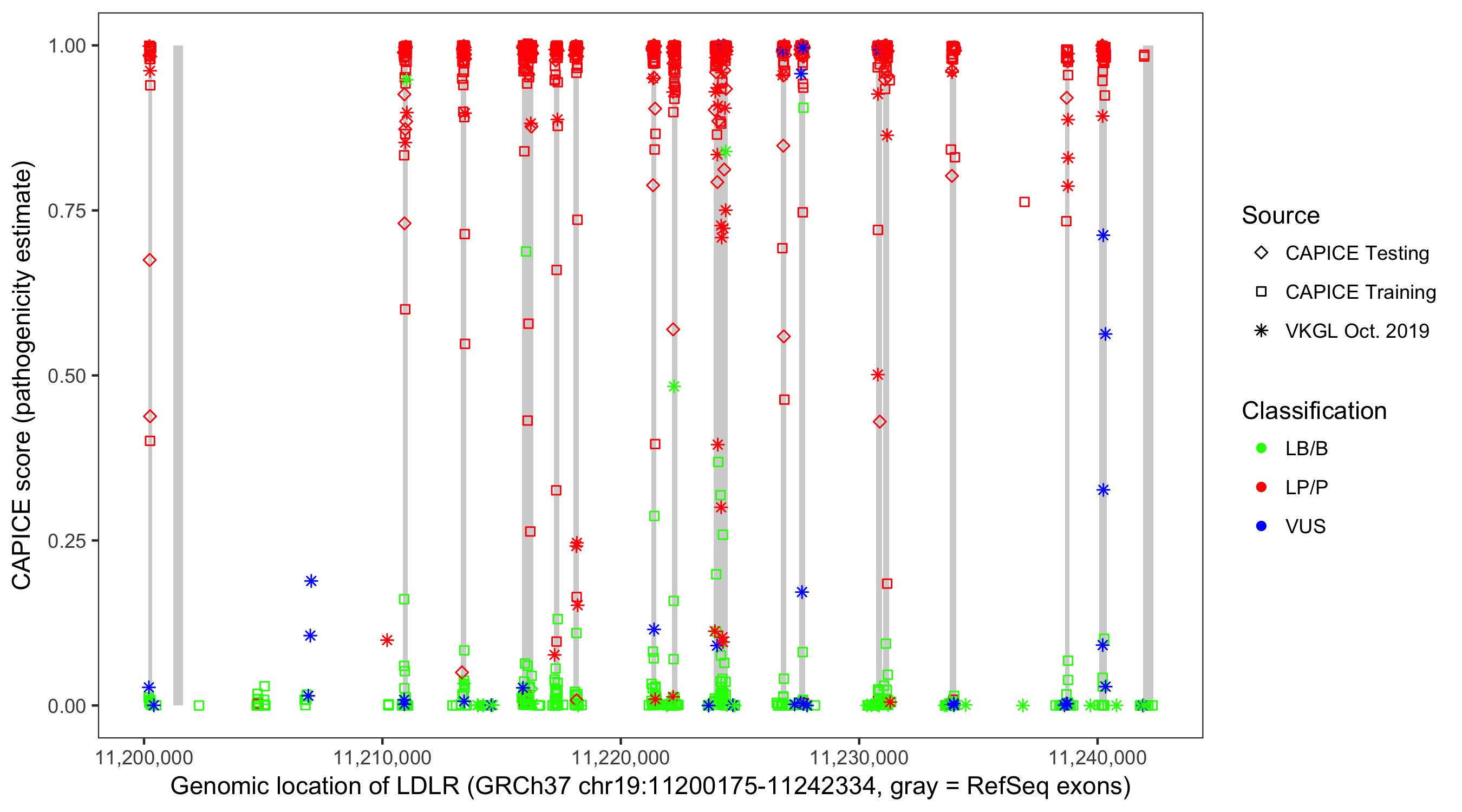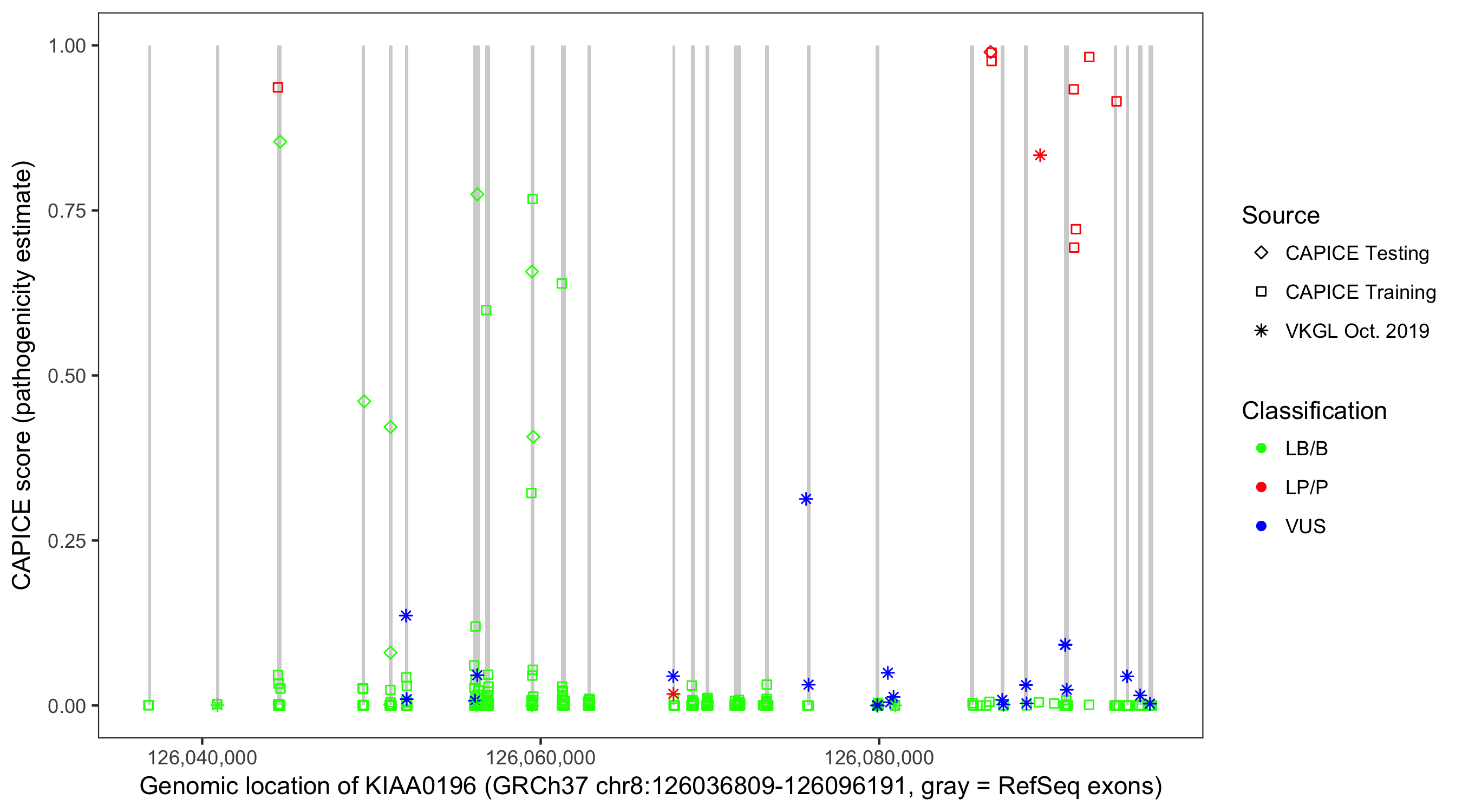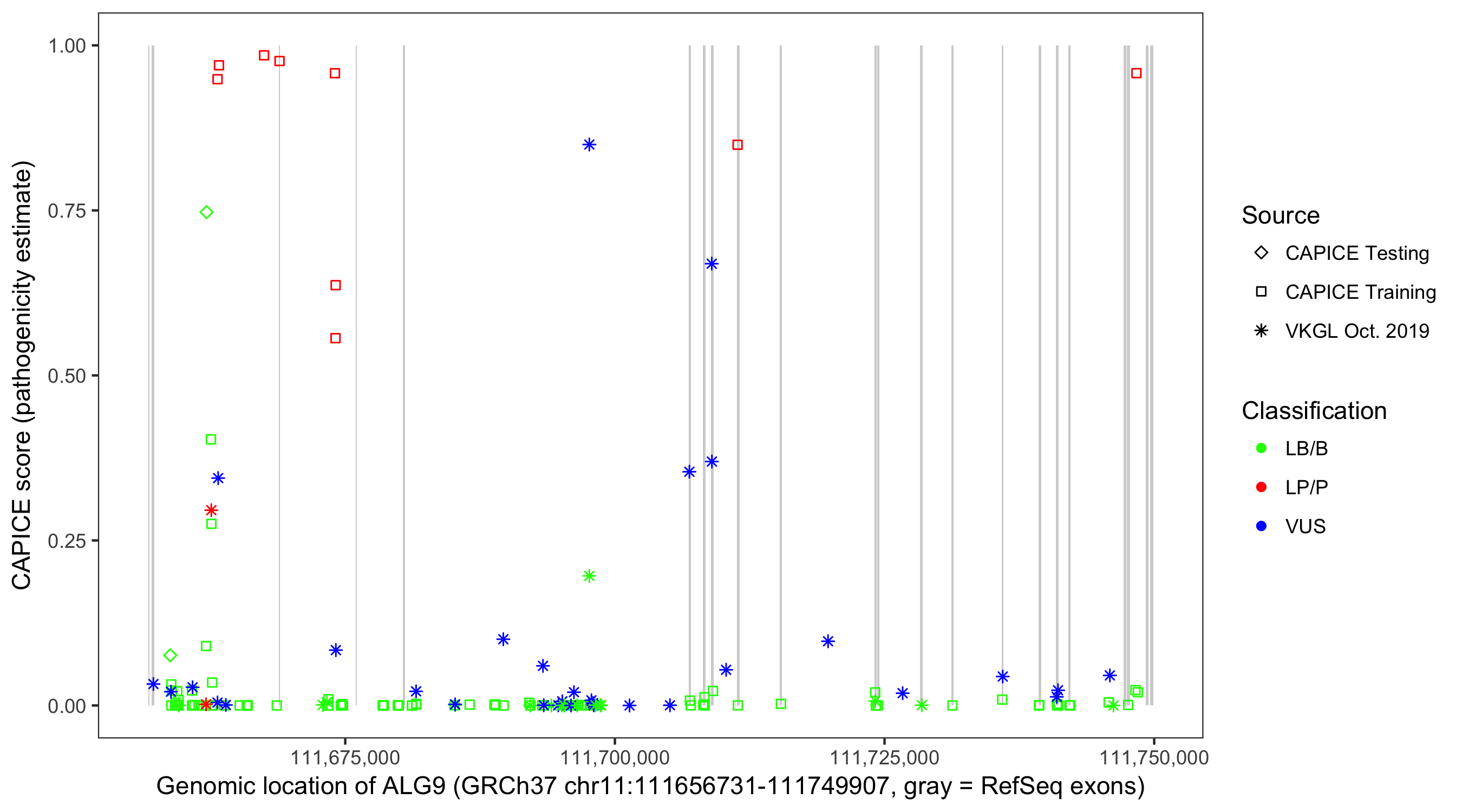 Shown are CAPICE train/test variants plus VKGL Oct 2019.