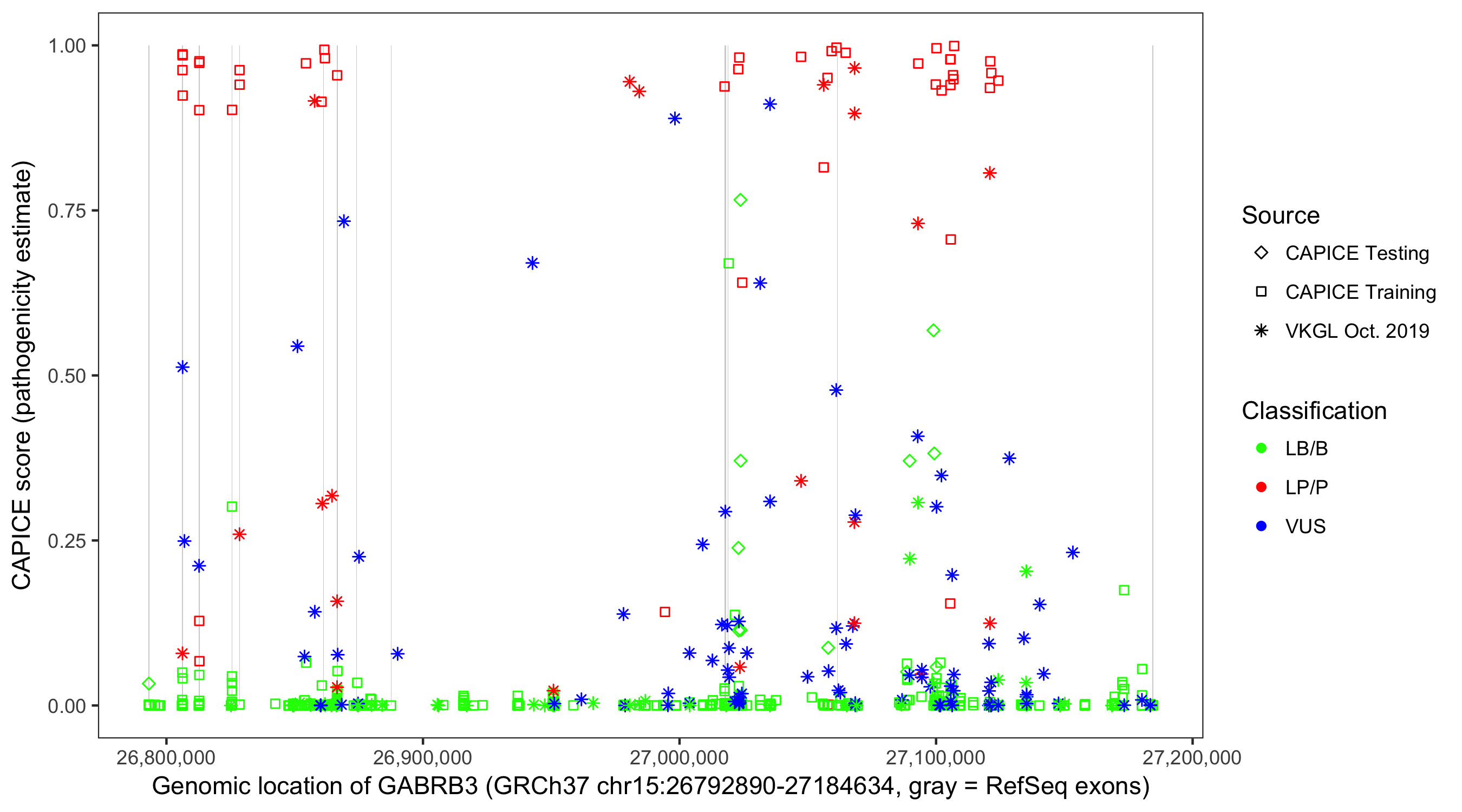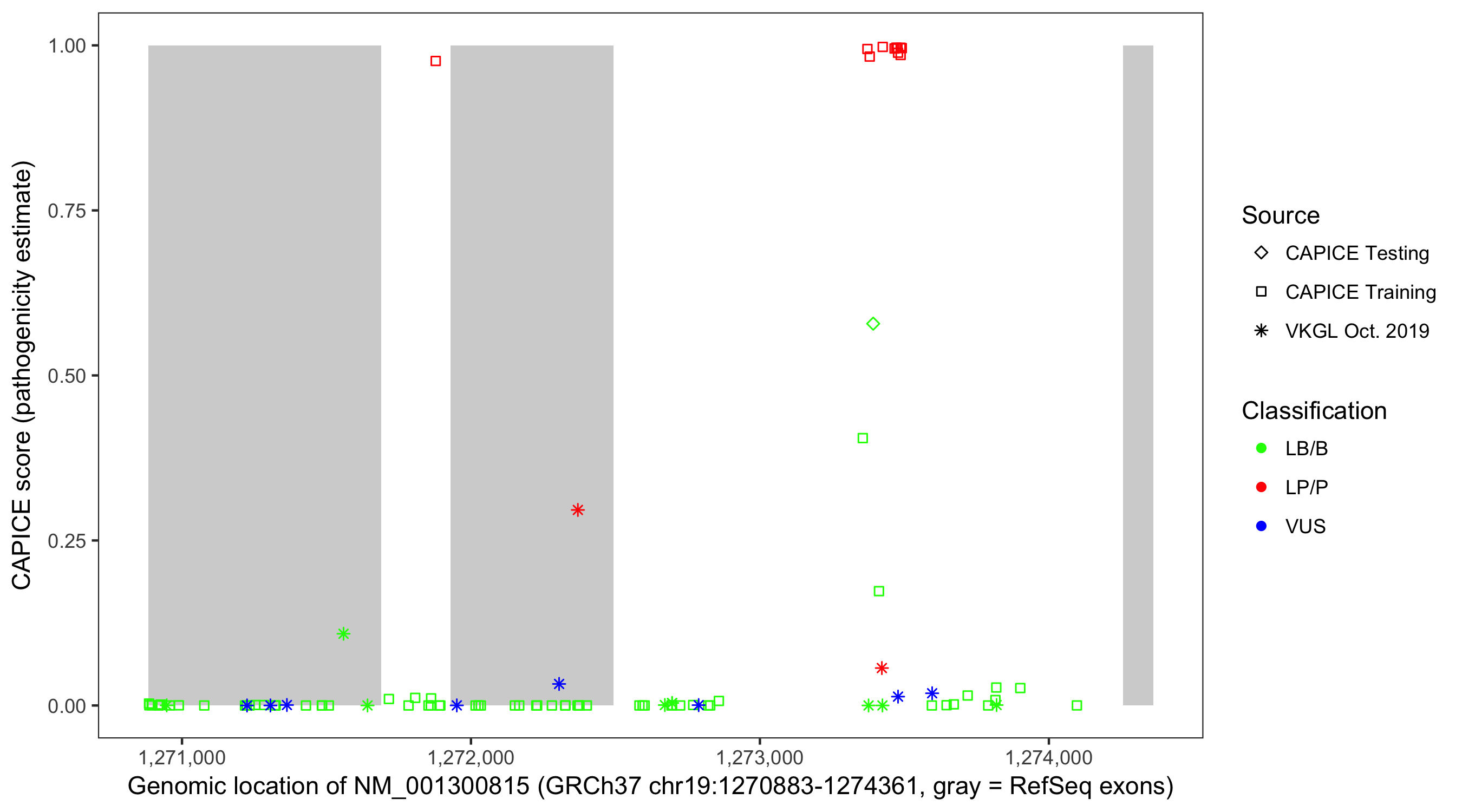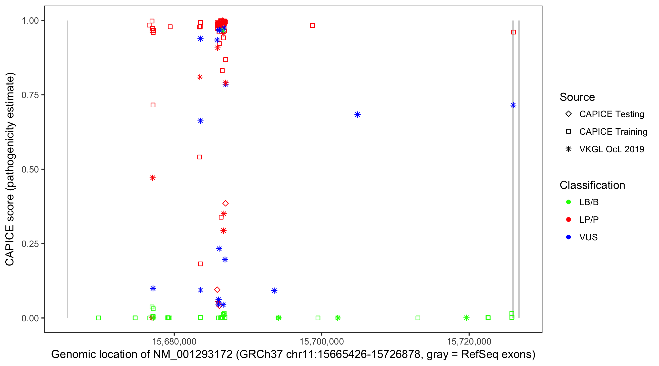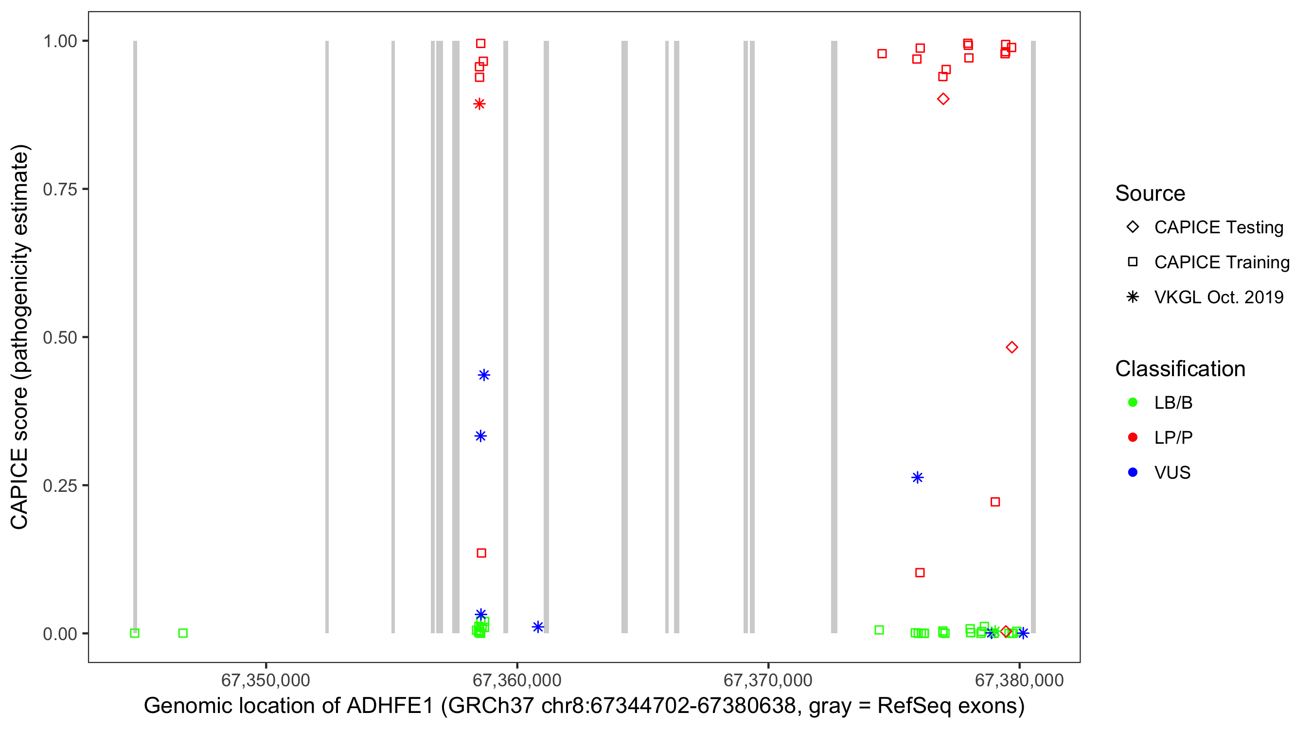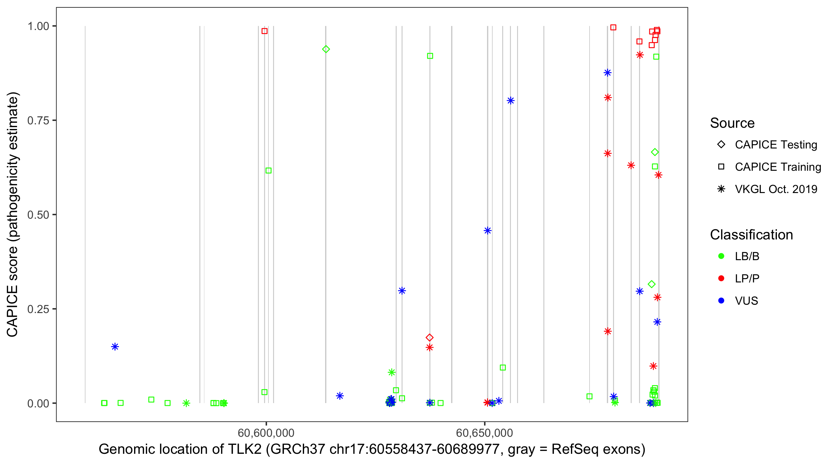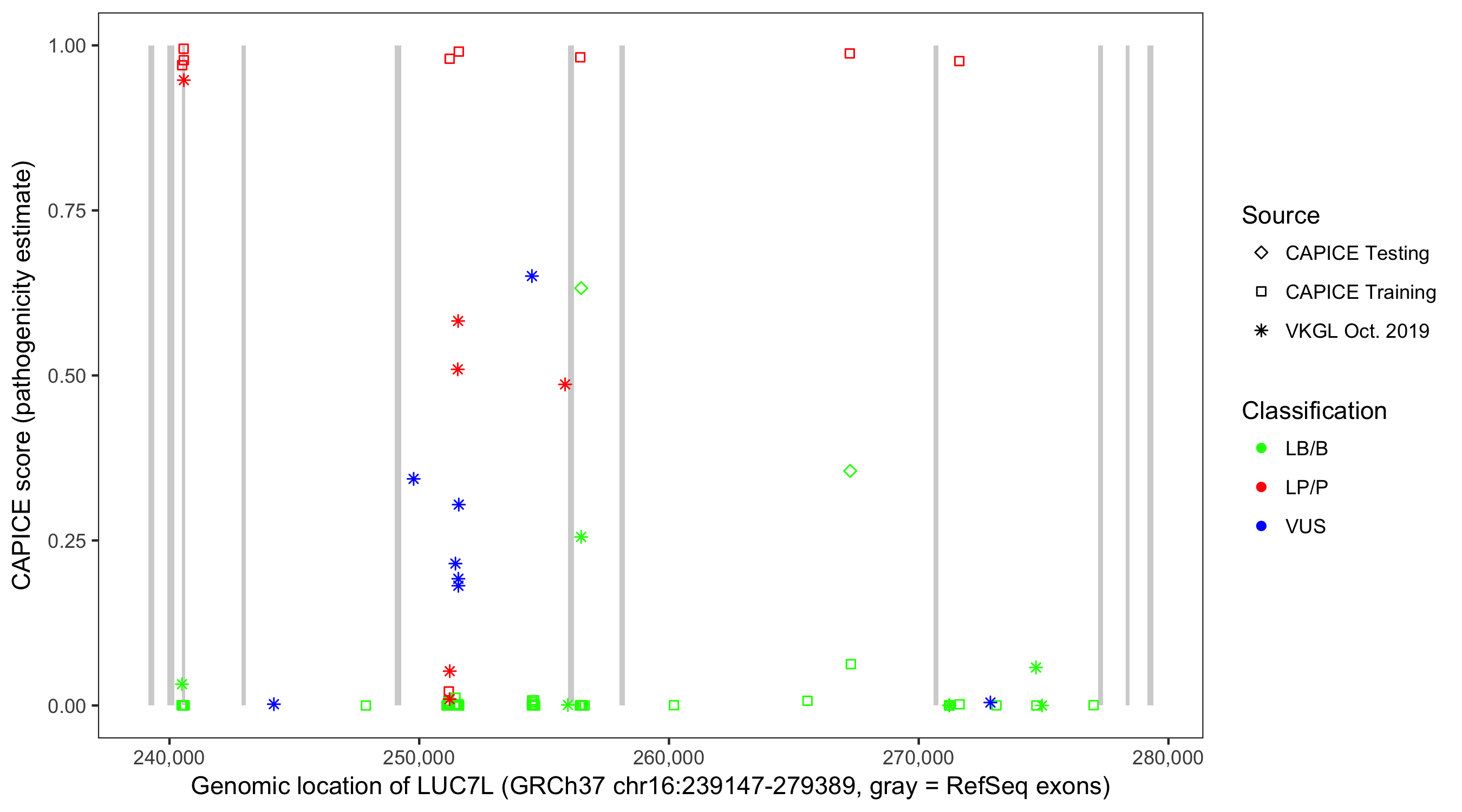 Shown are CAPICE train/test variants plus VKGL Oct 2019.