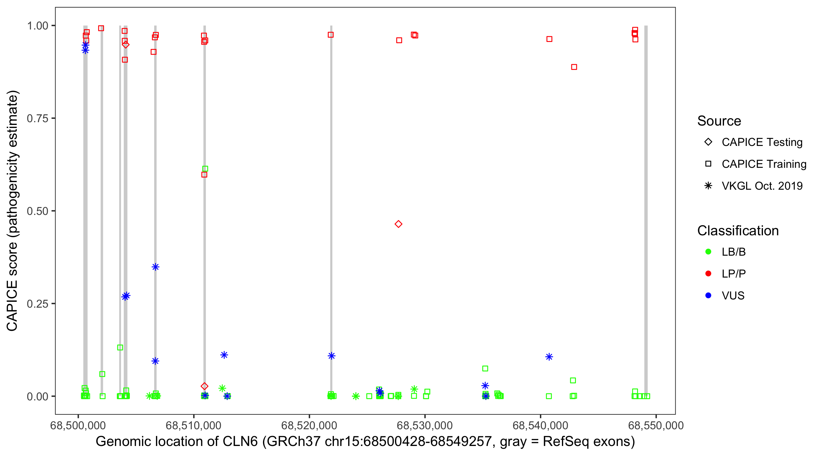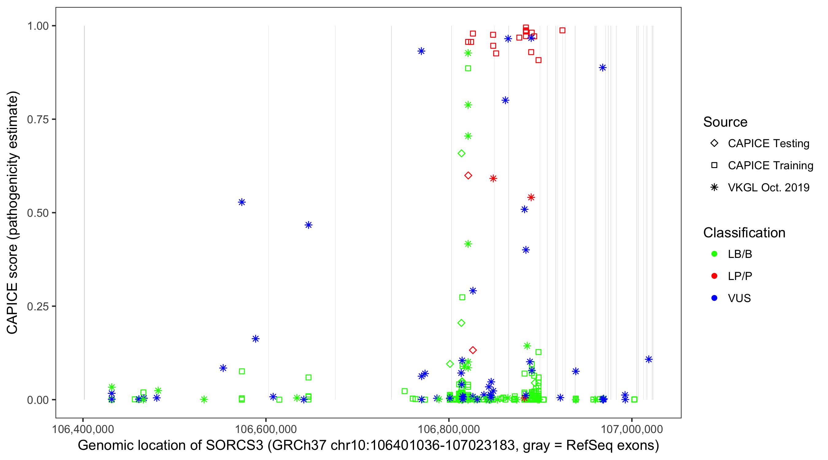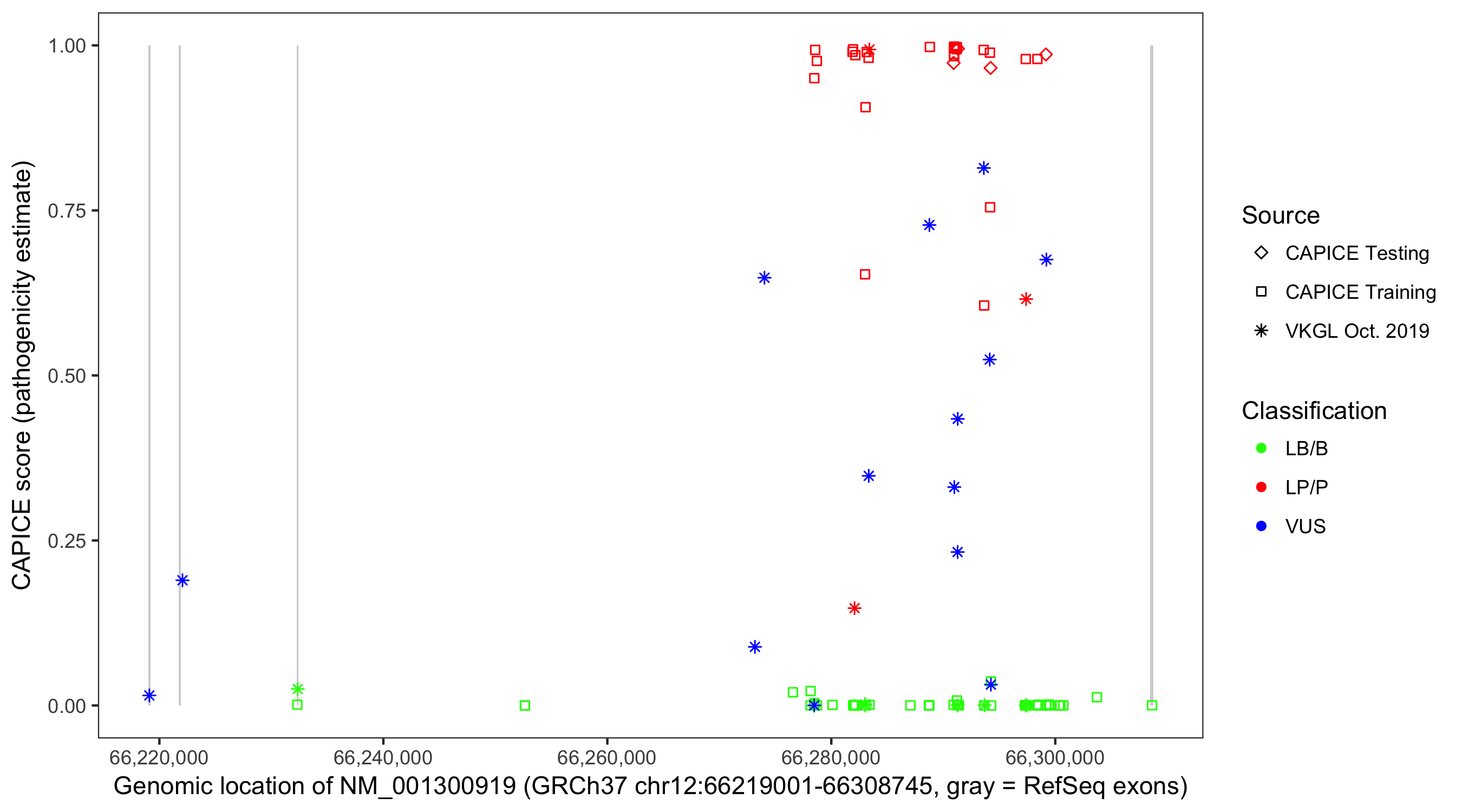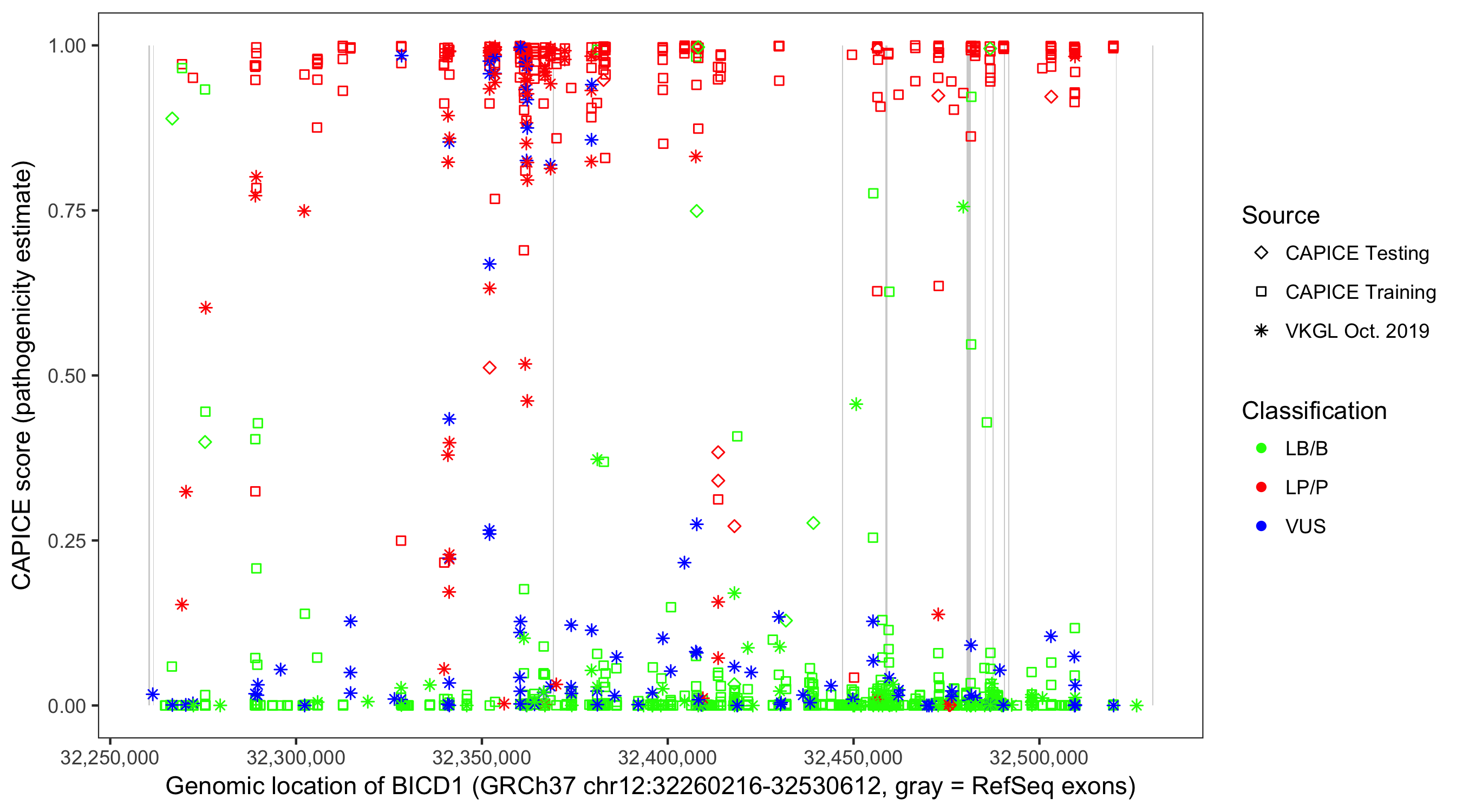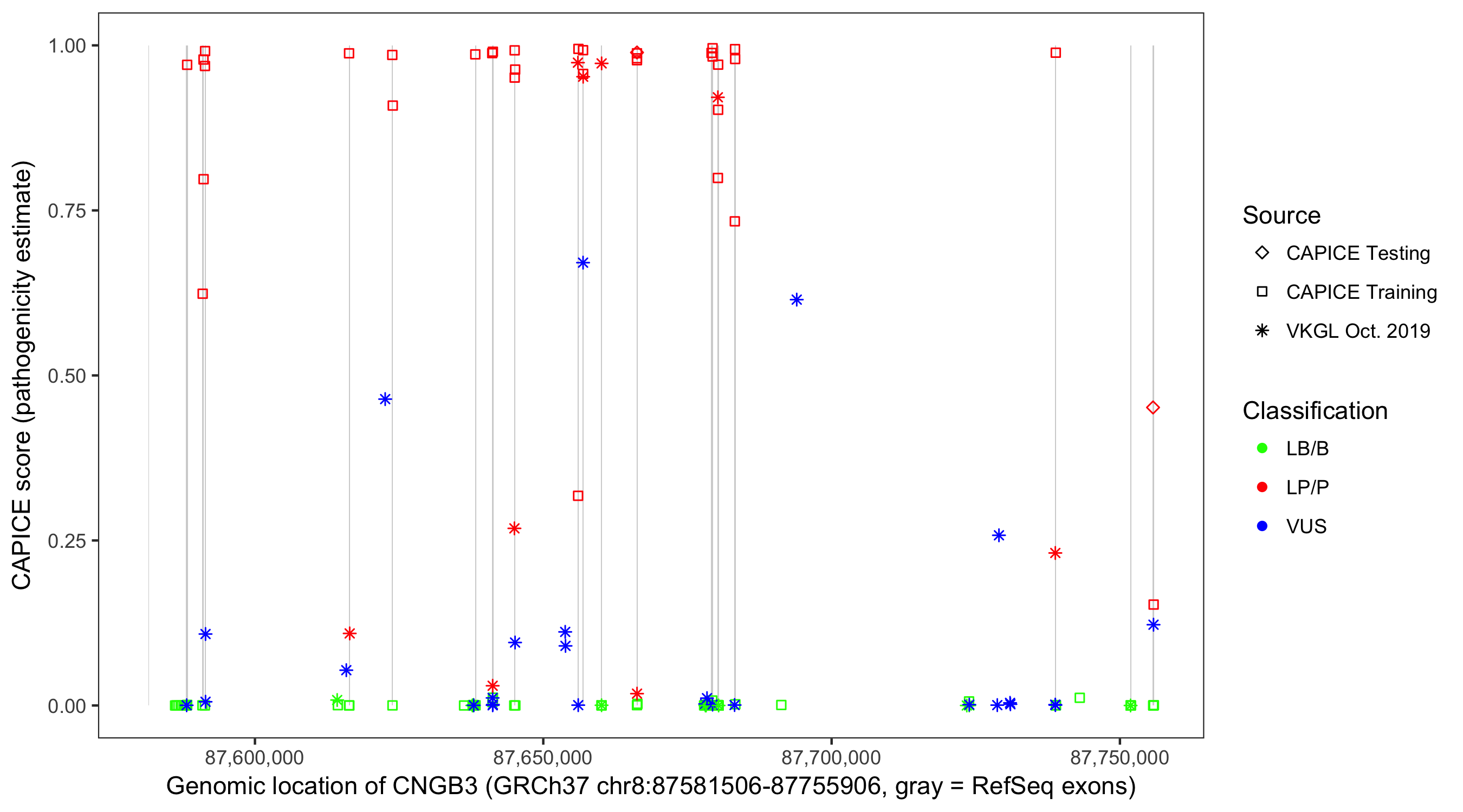 Shown are CAPICE train/test variants plus VKGL Oct 2019.