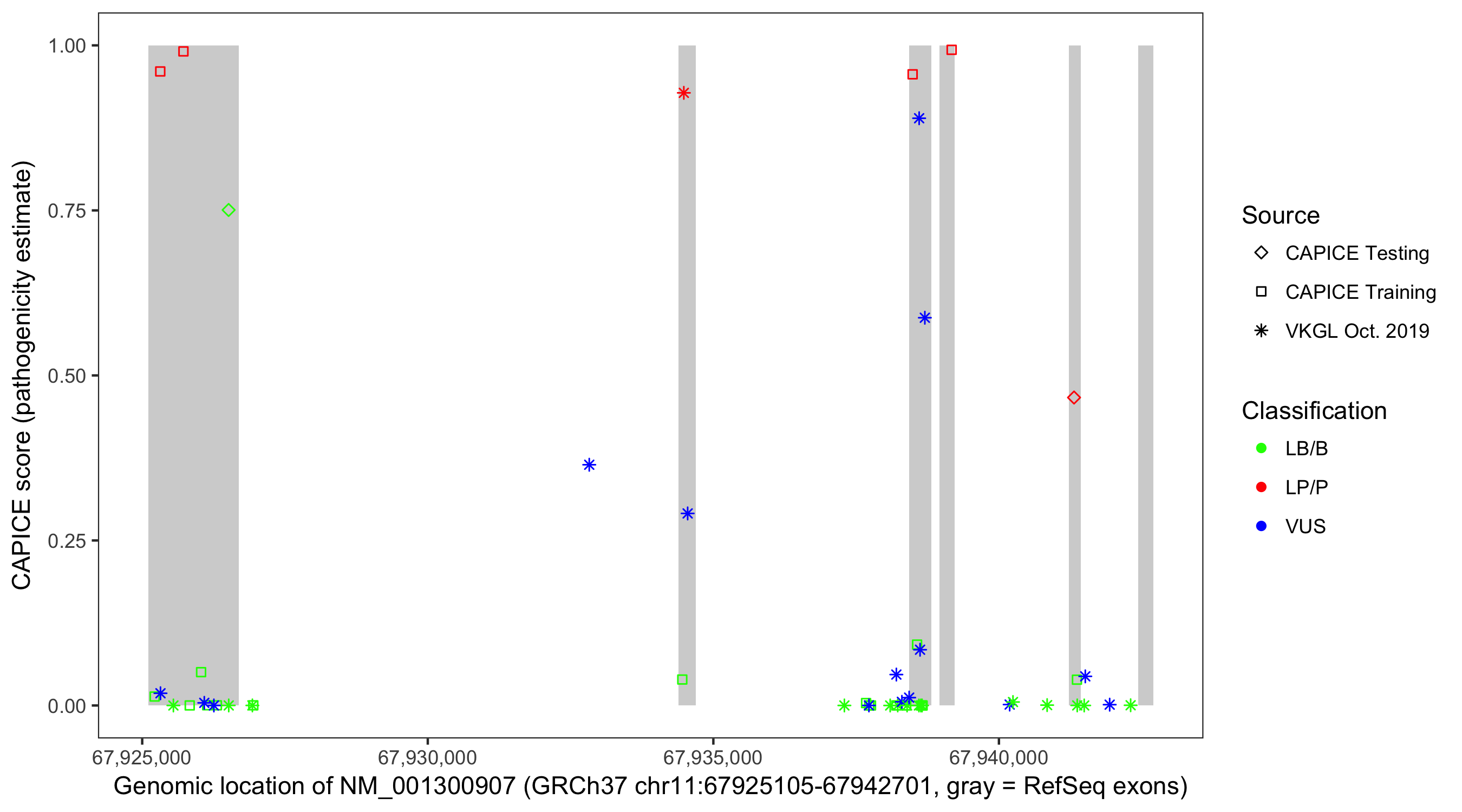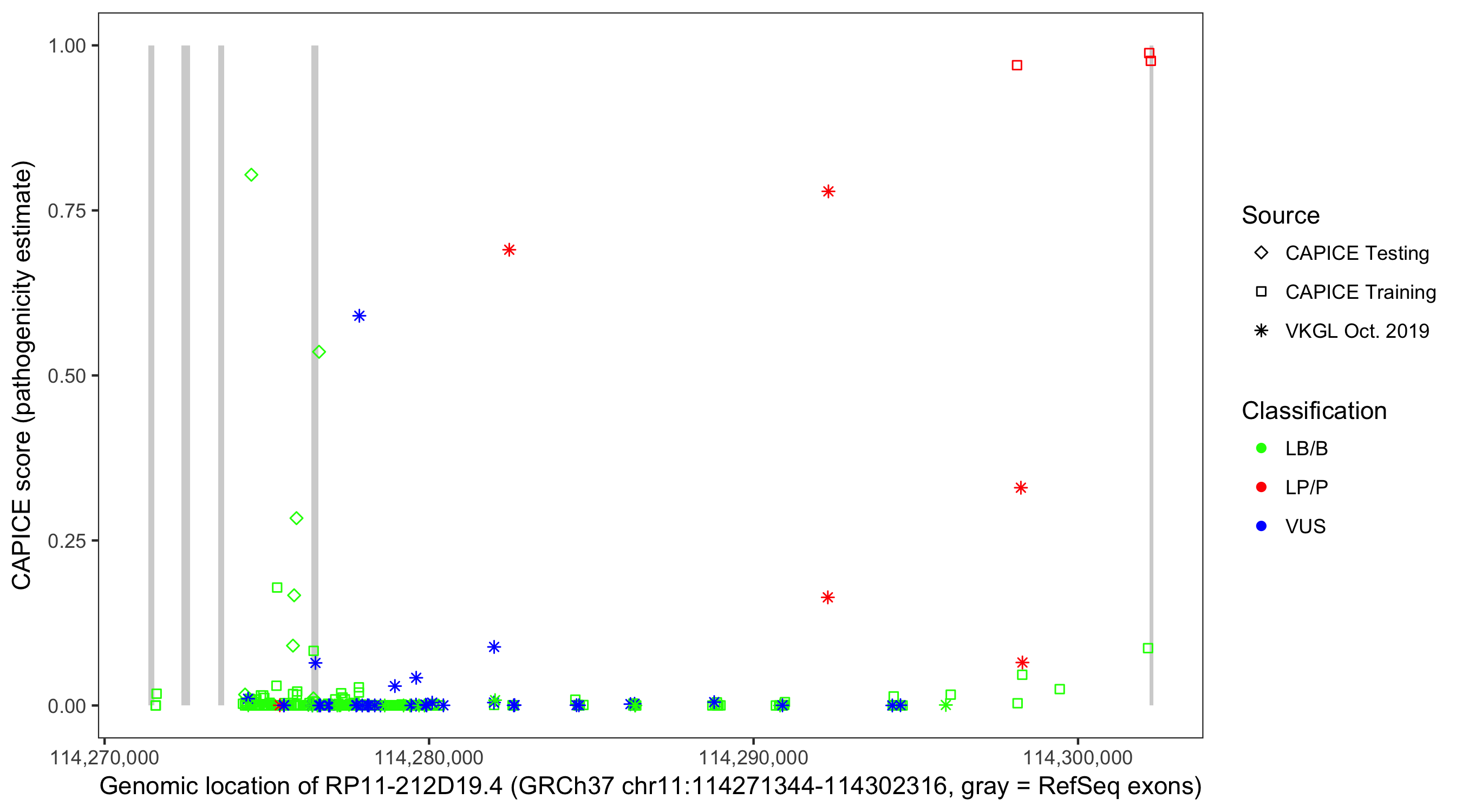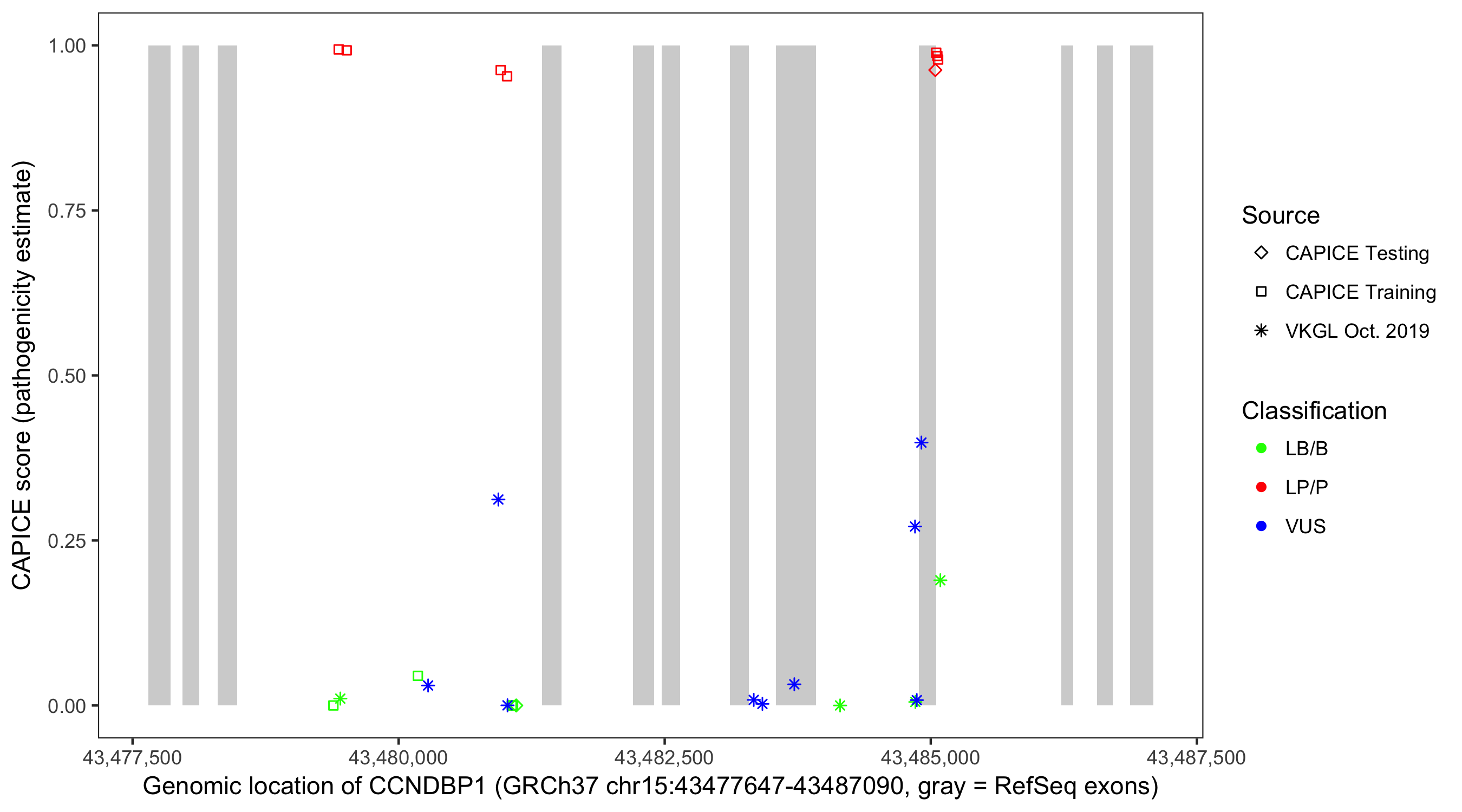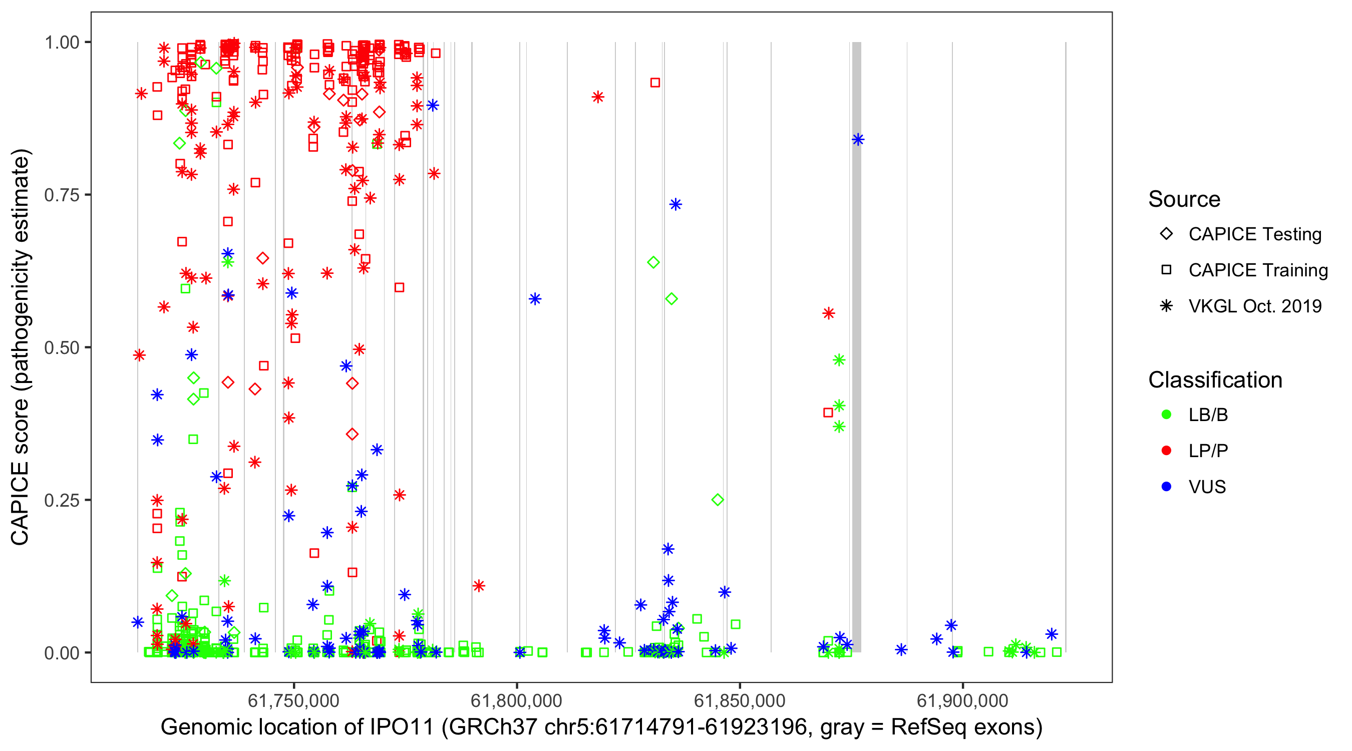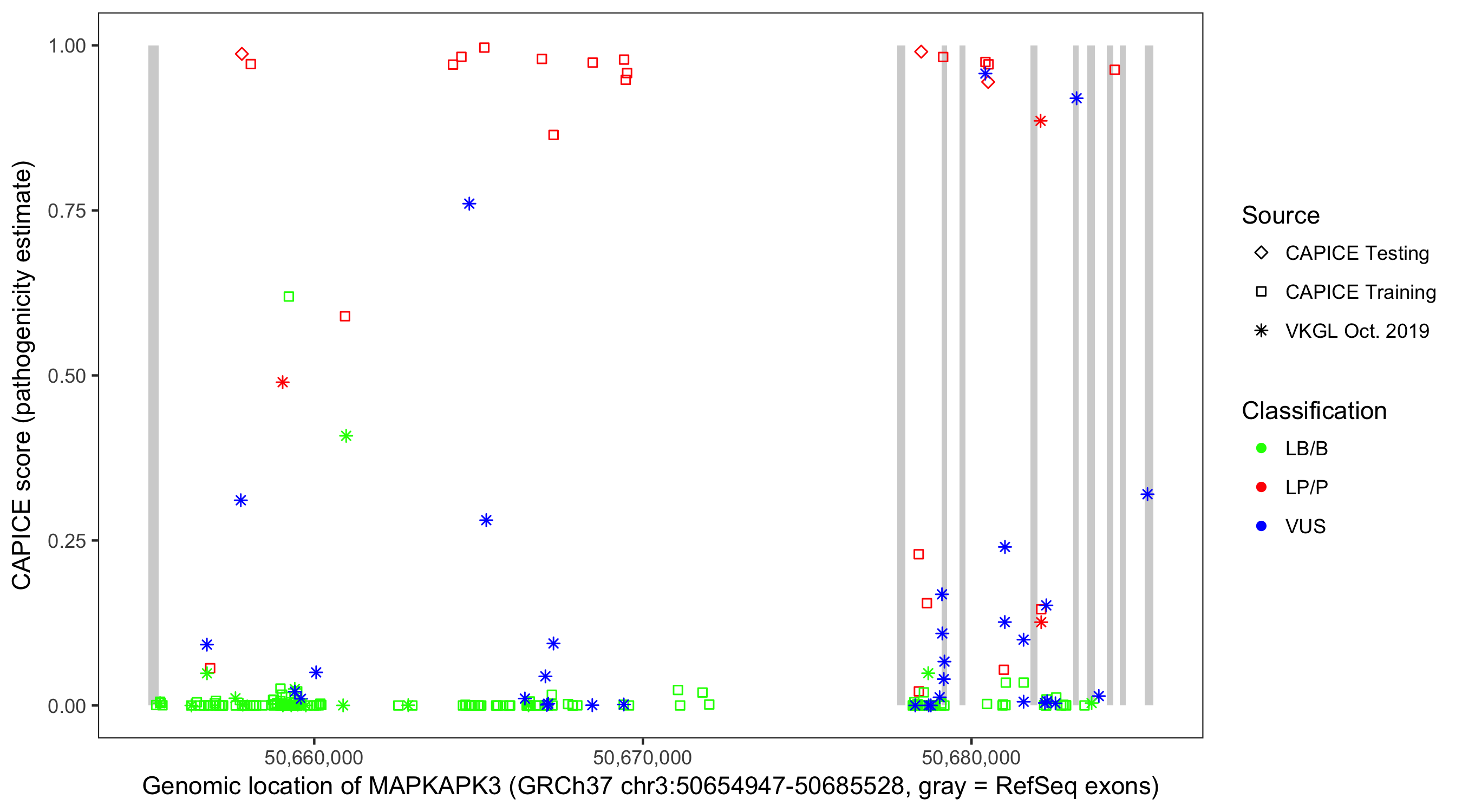 Shown are CAPICE train/test variants plus VKGL Oct 2019.