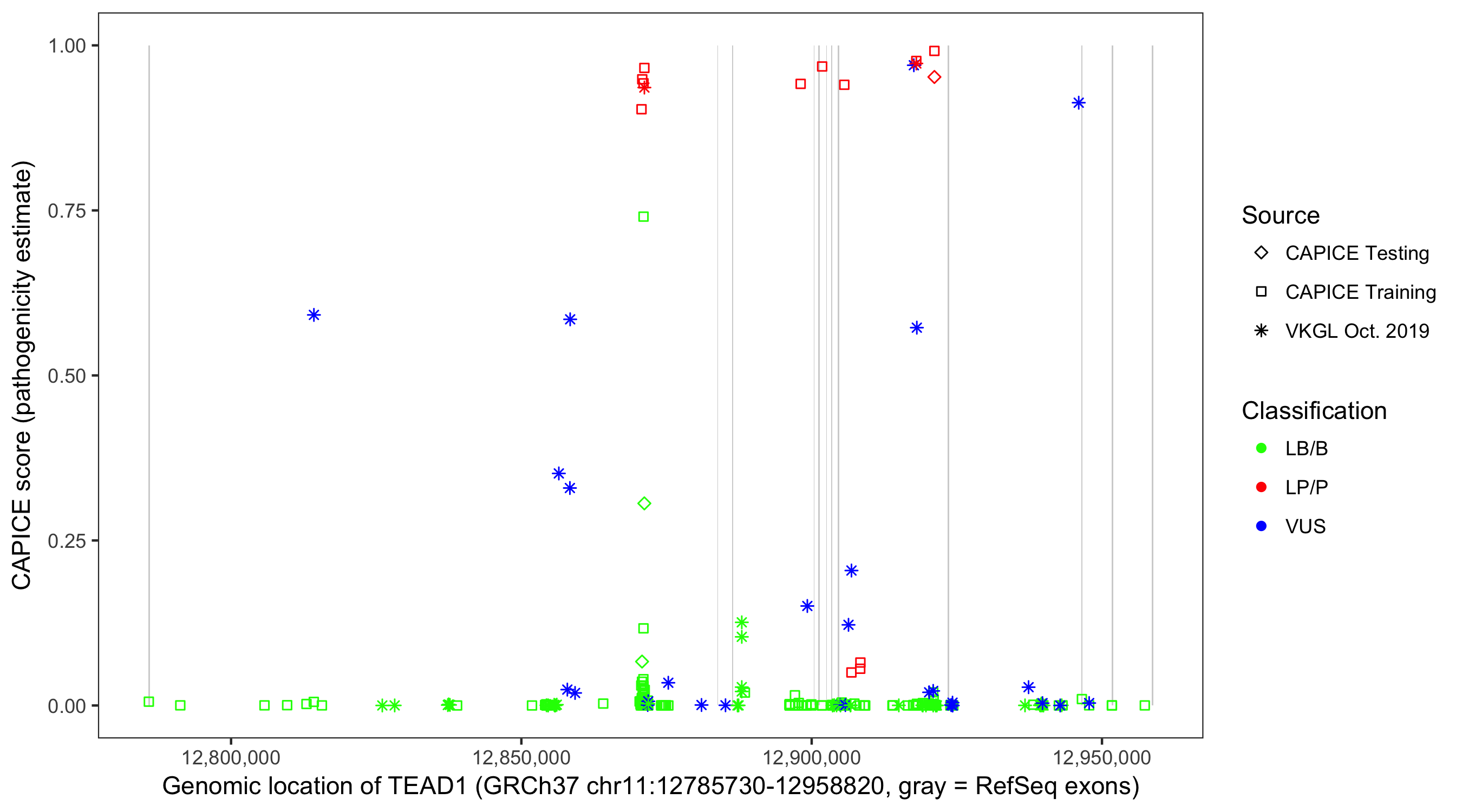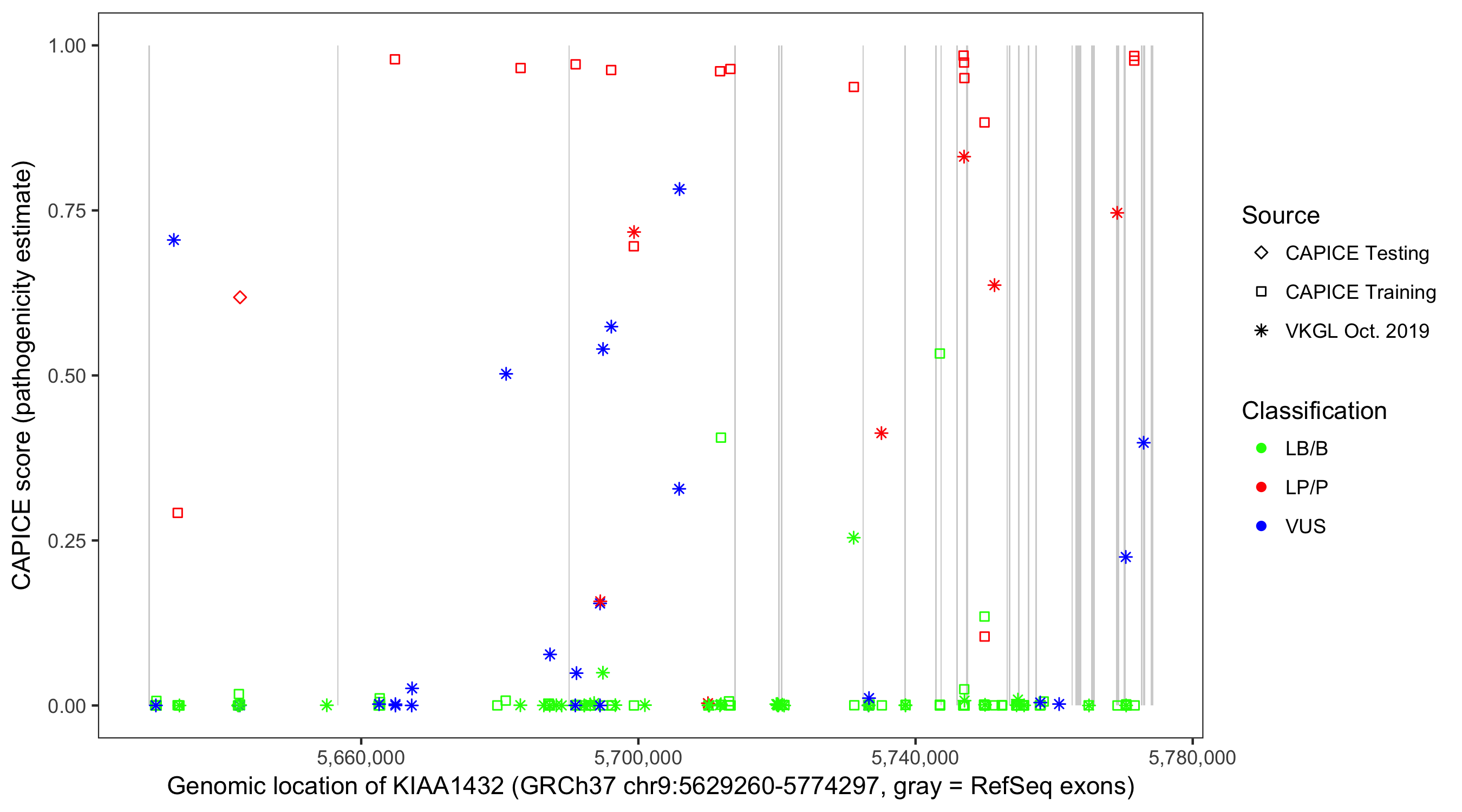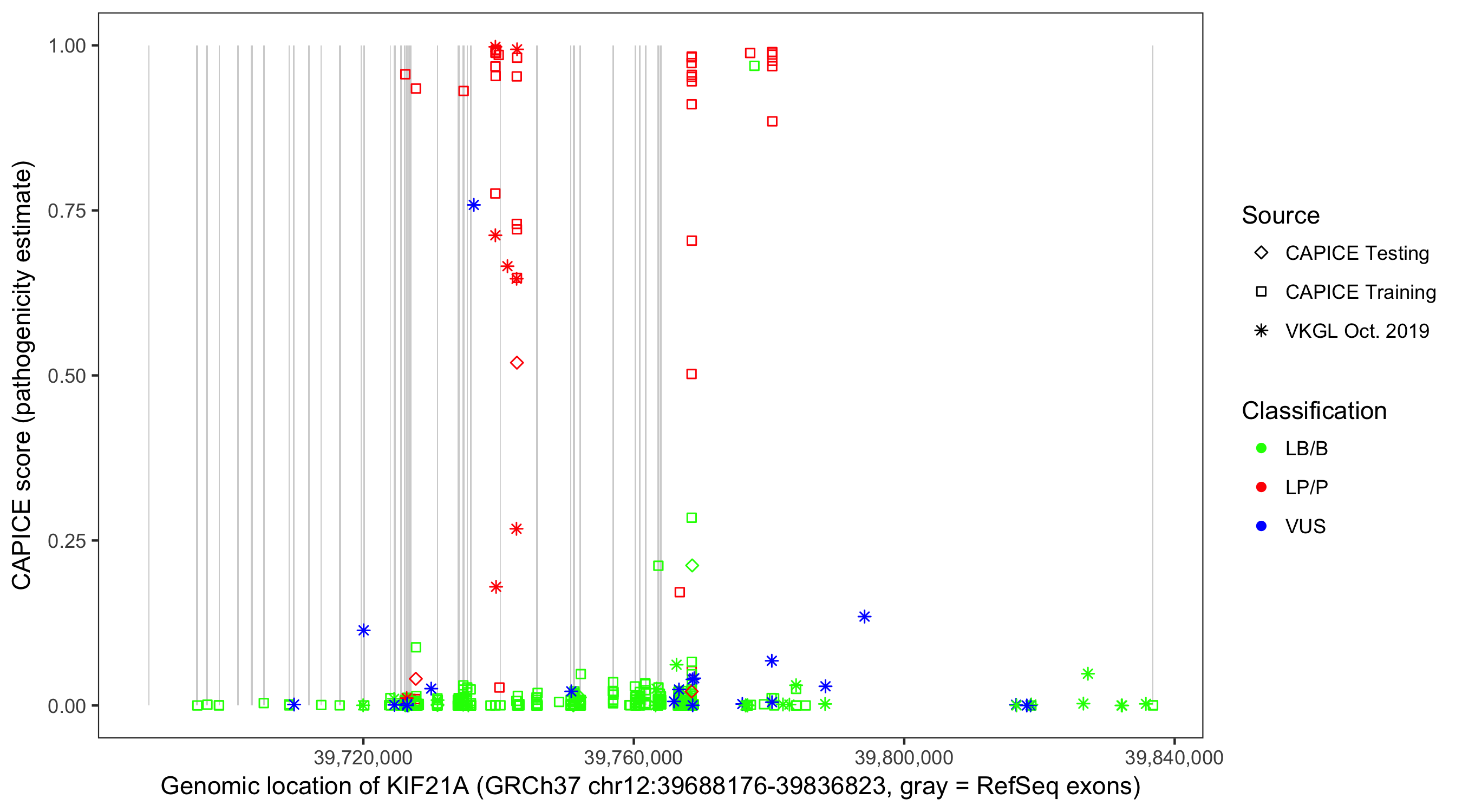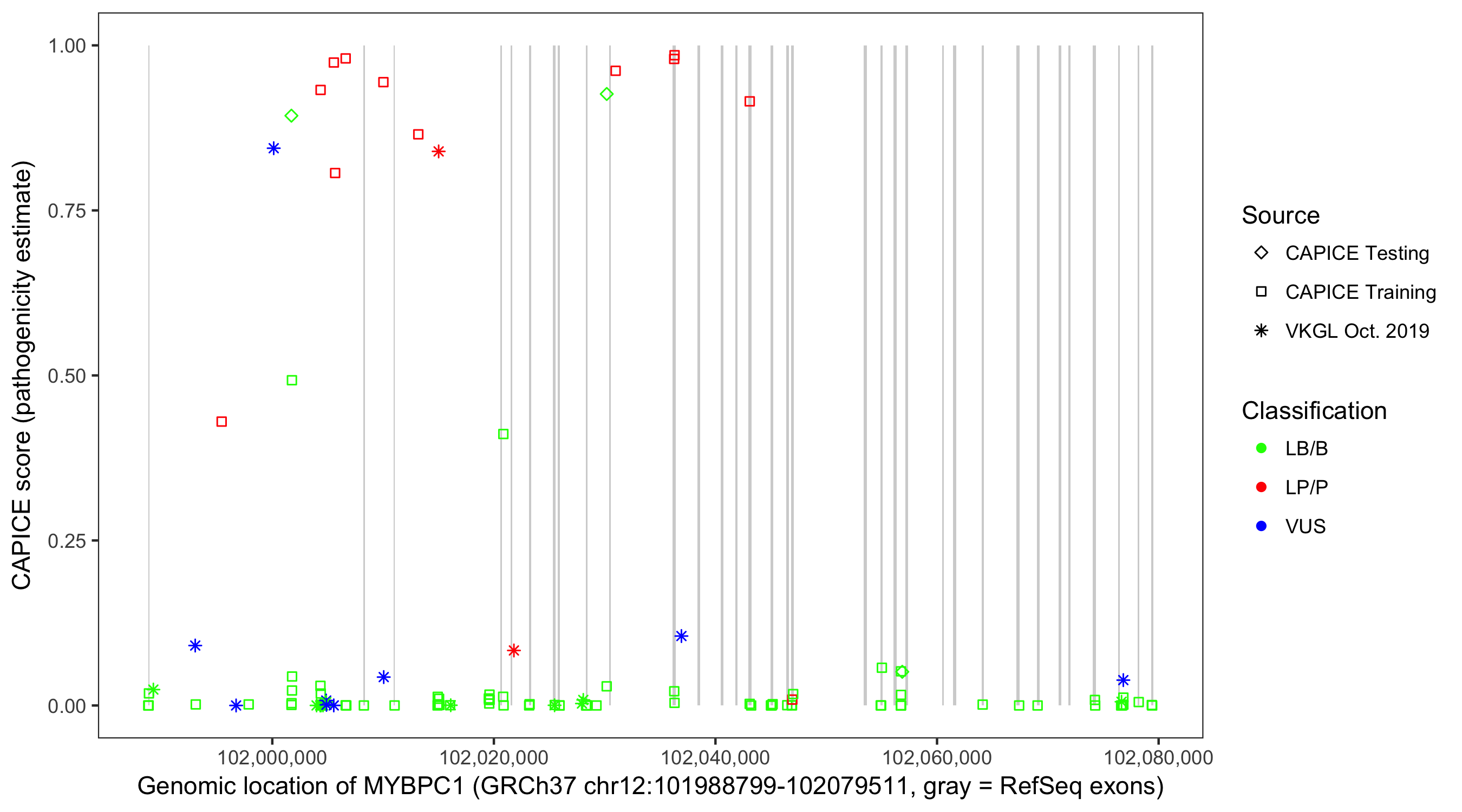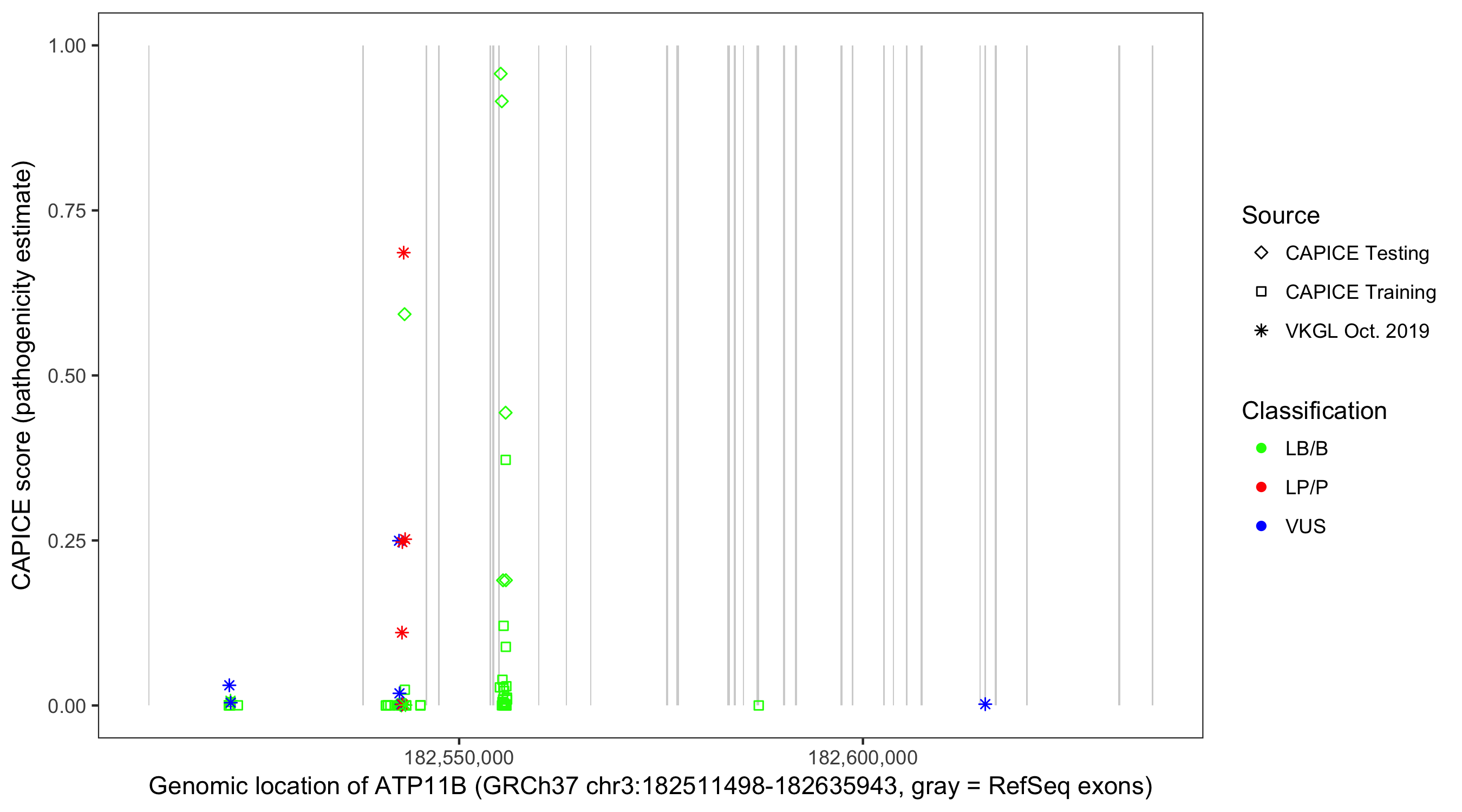 Shown are CAPICE train/test variants plus VKGL Oct 2019.