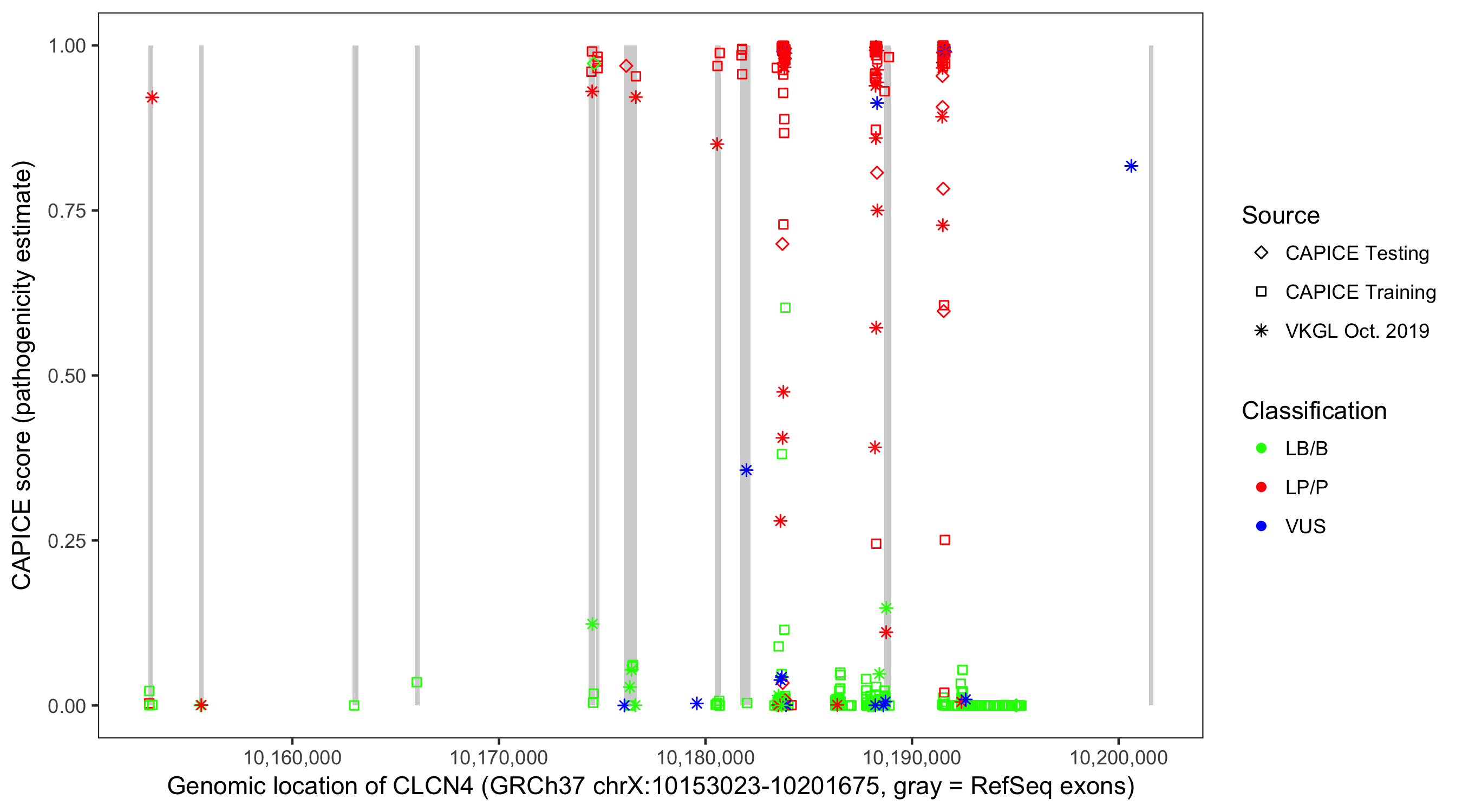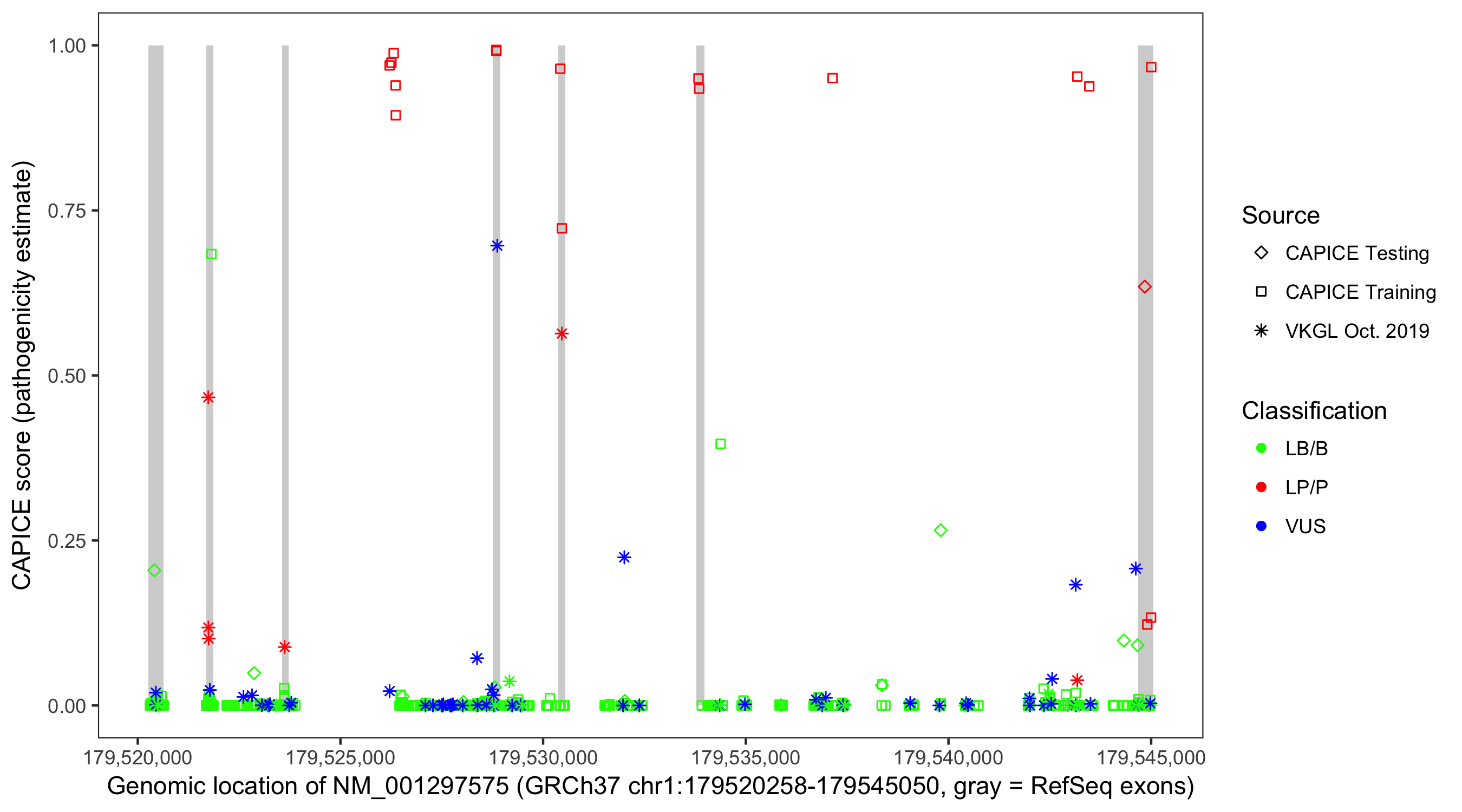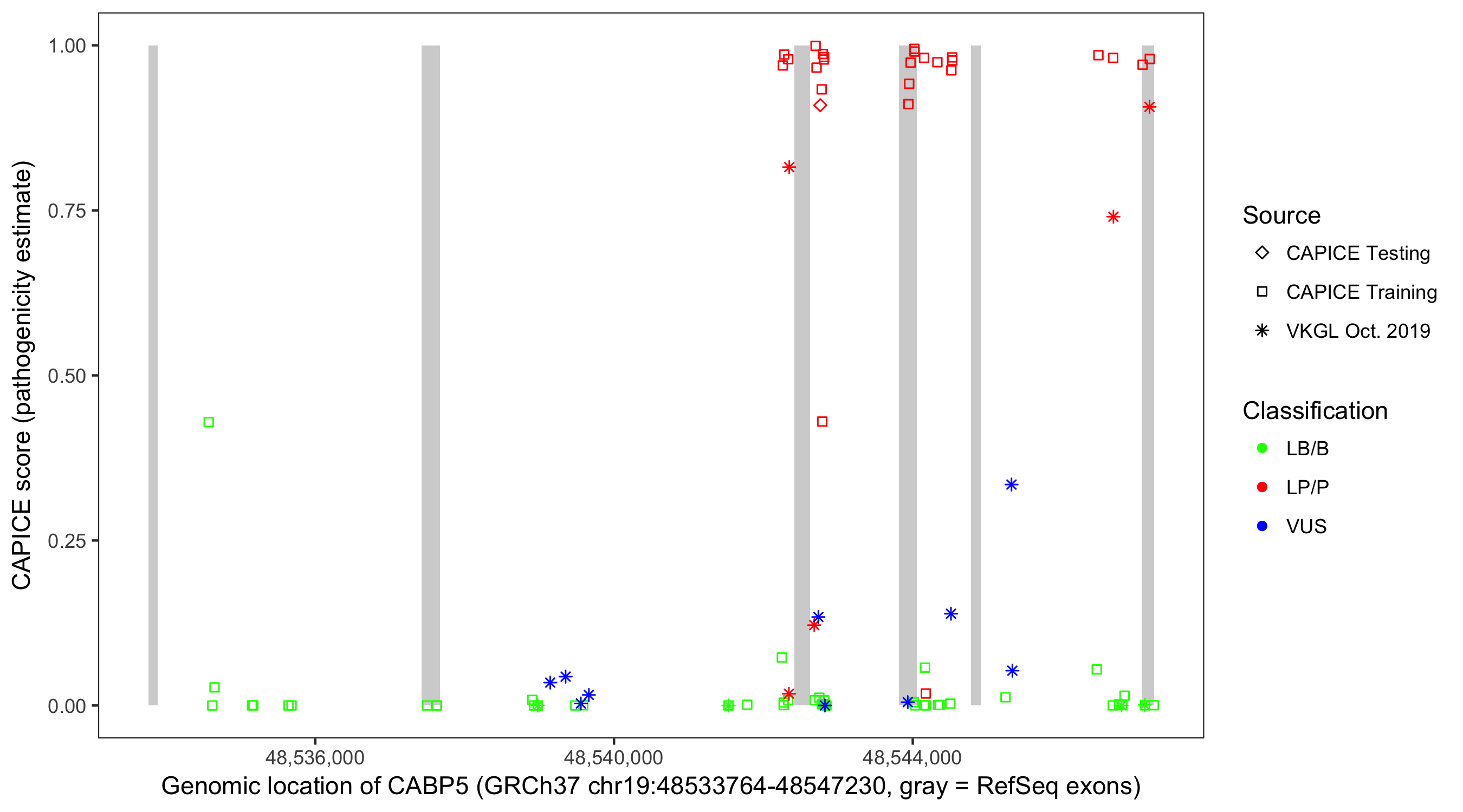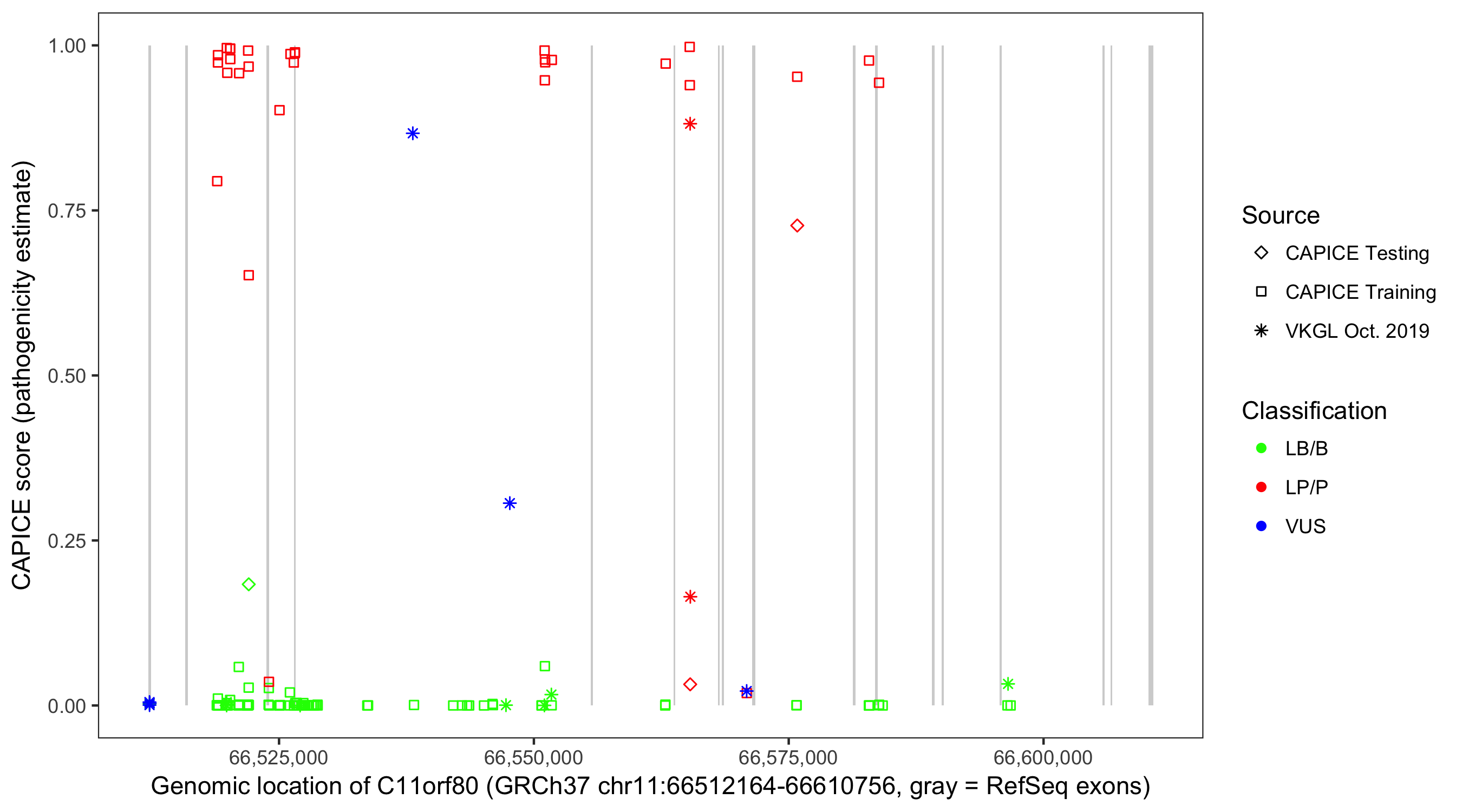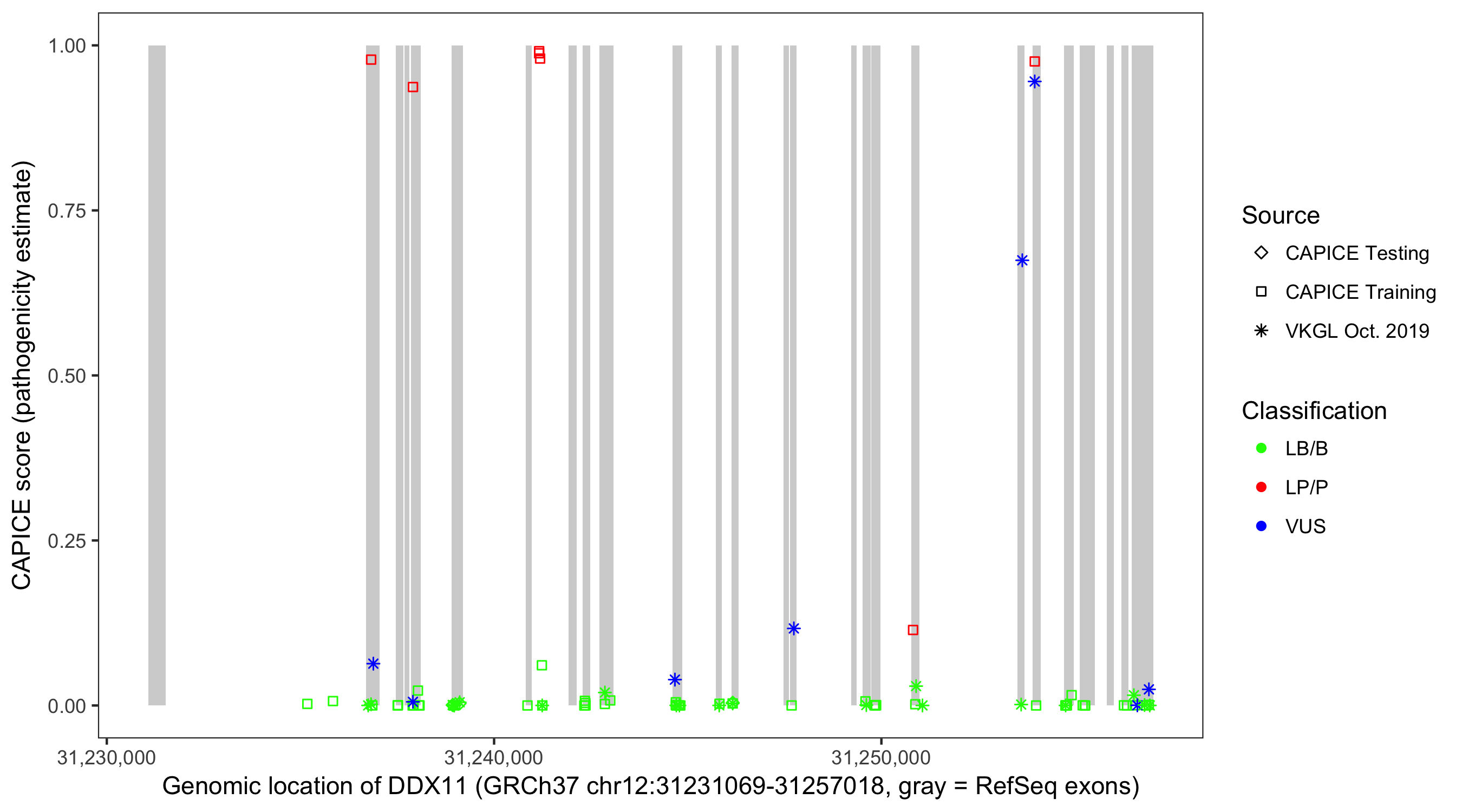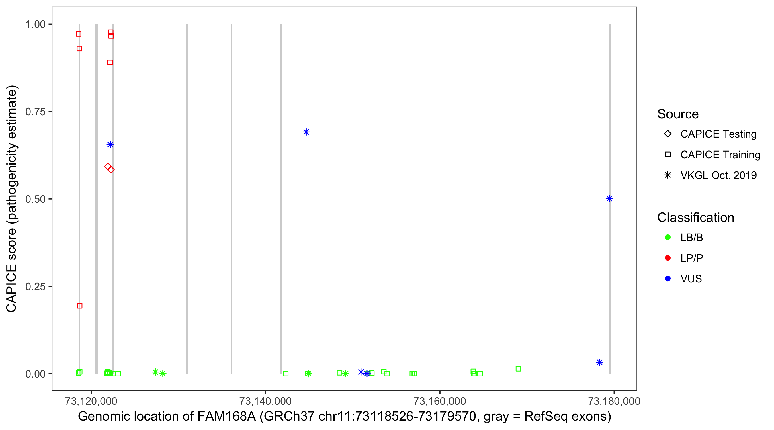 Shown are CAPICE train/test variants plus VKGL Oct 2019.