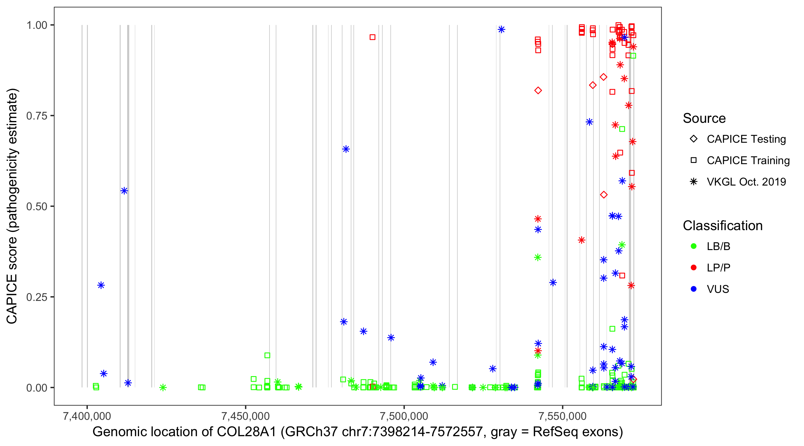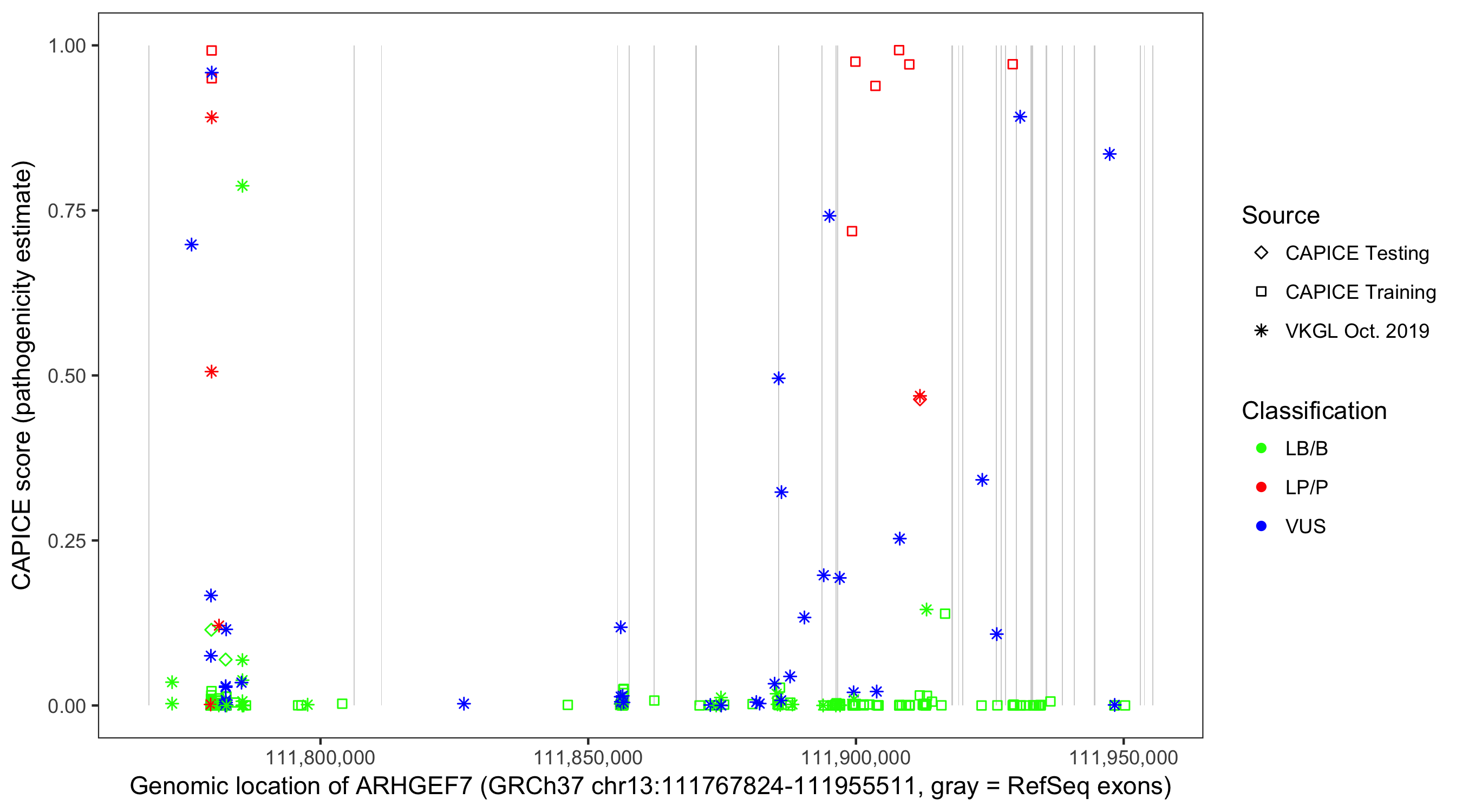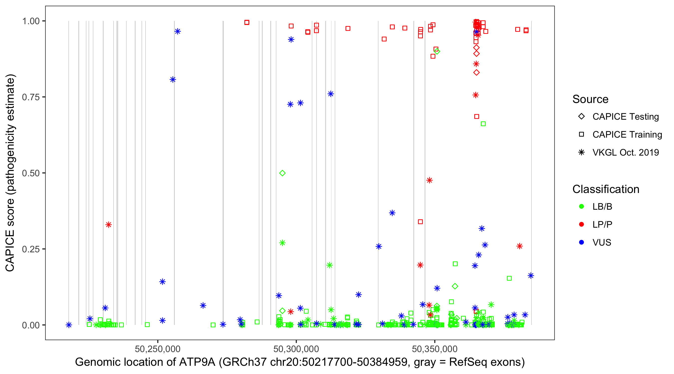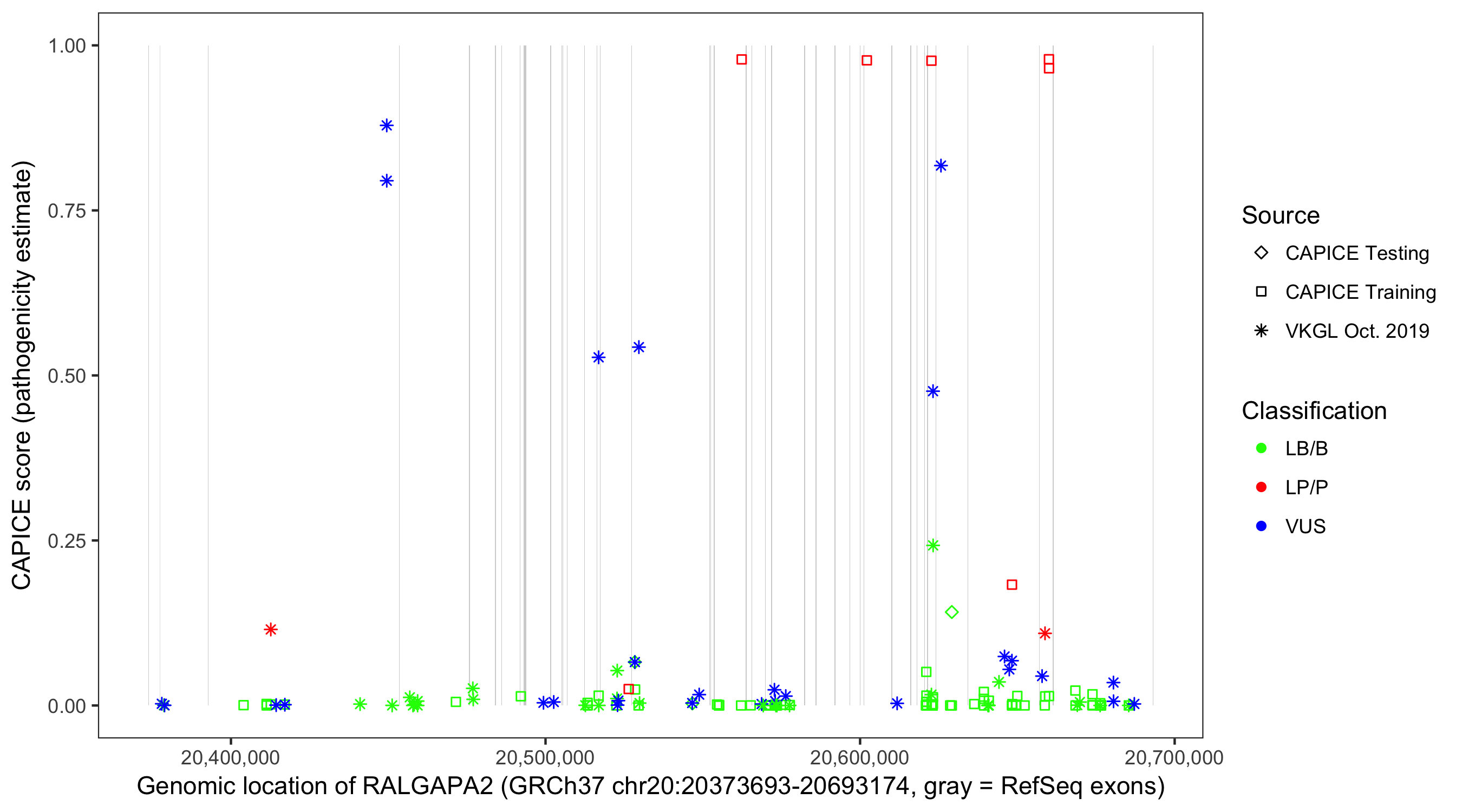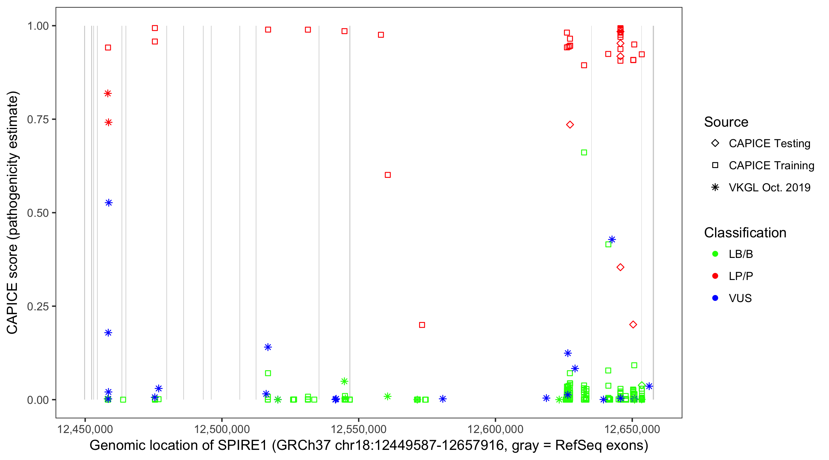 Shown are CAPICE train/test variants plus VKGL Oct 2019.
