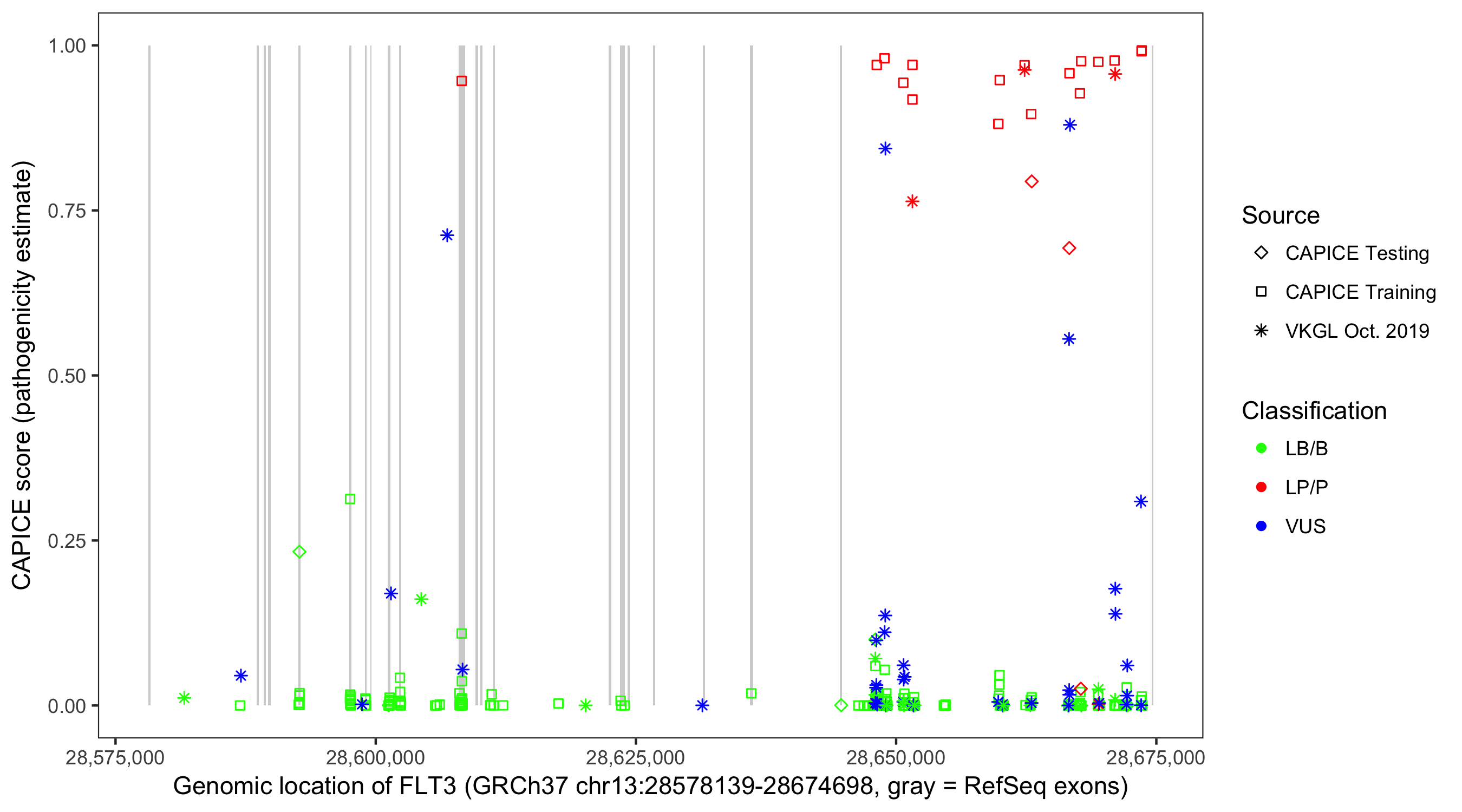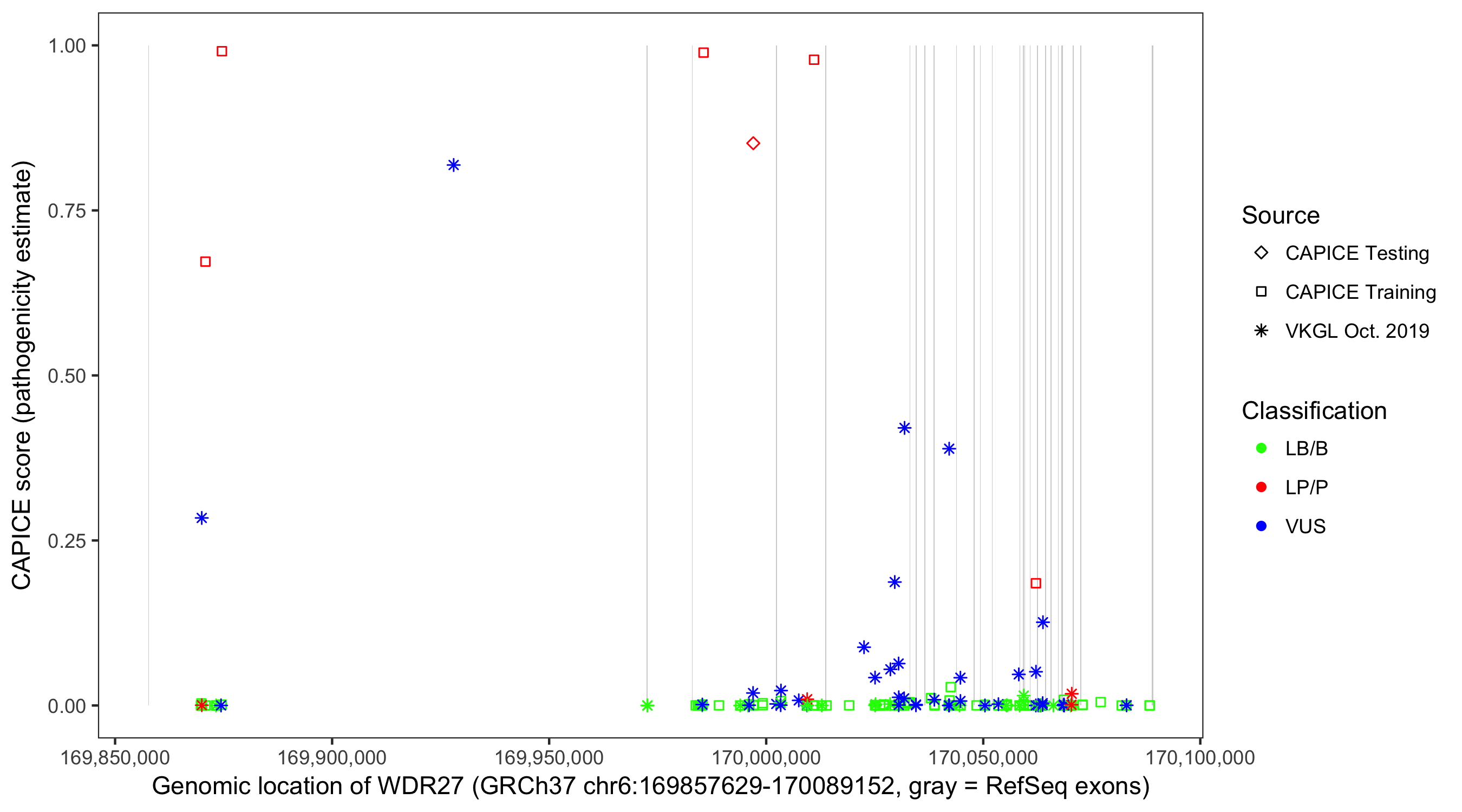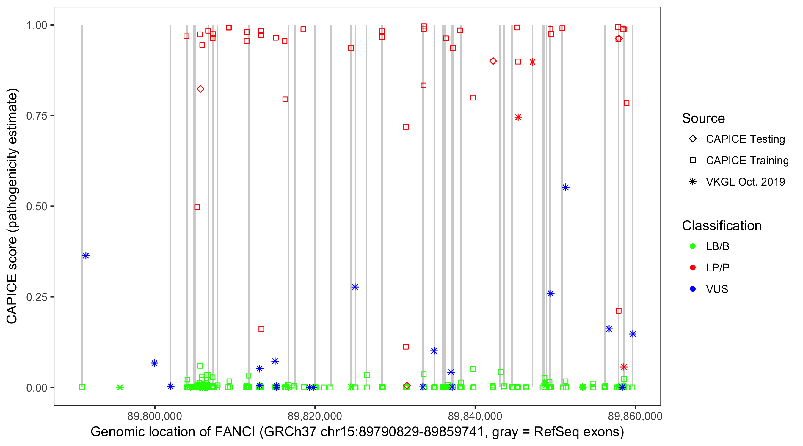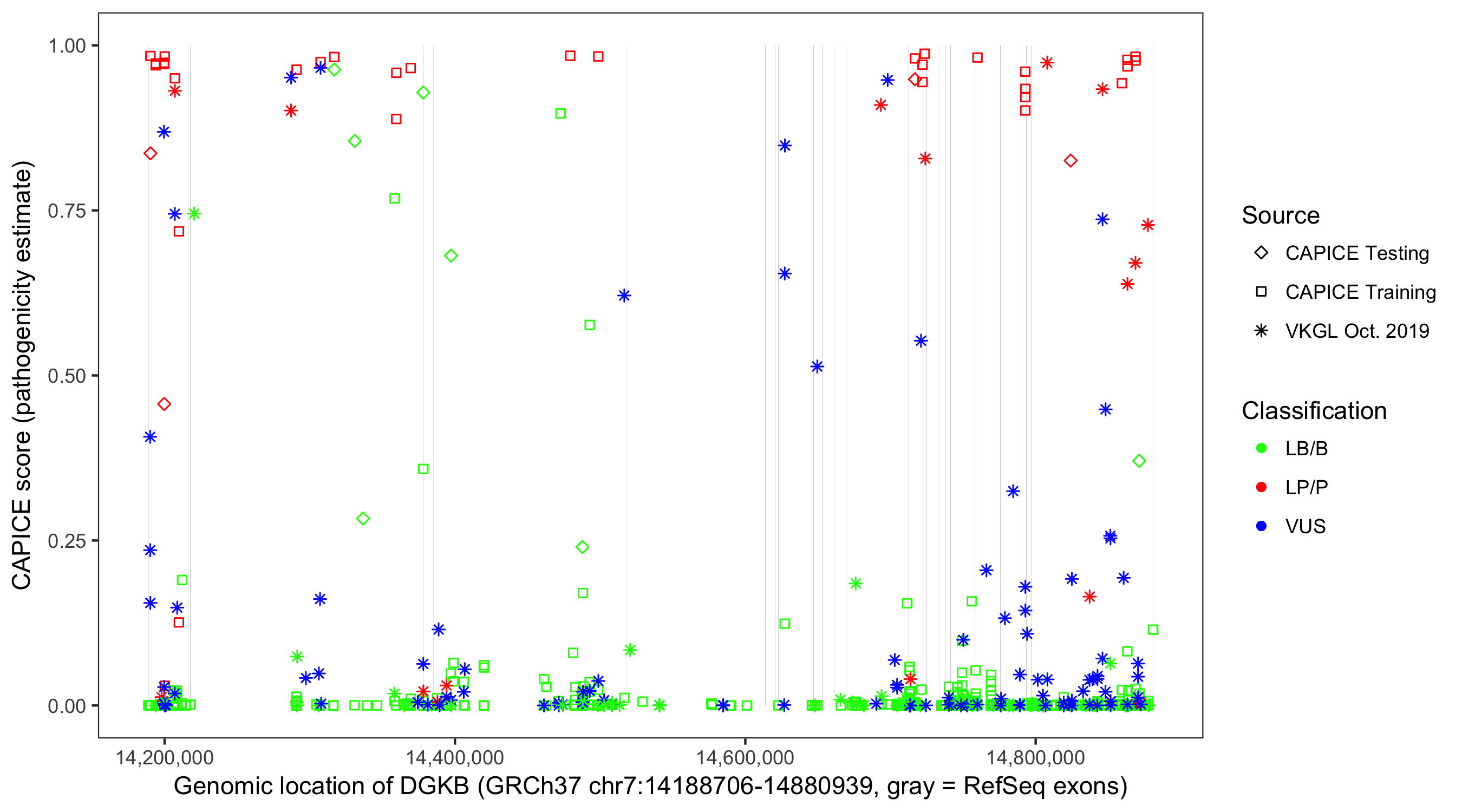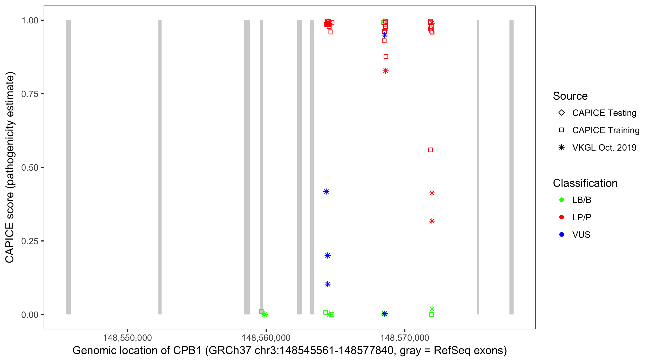 Shown are CAPICE train/test variants plus VKGL Oct 2019.