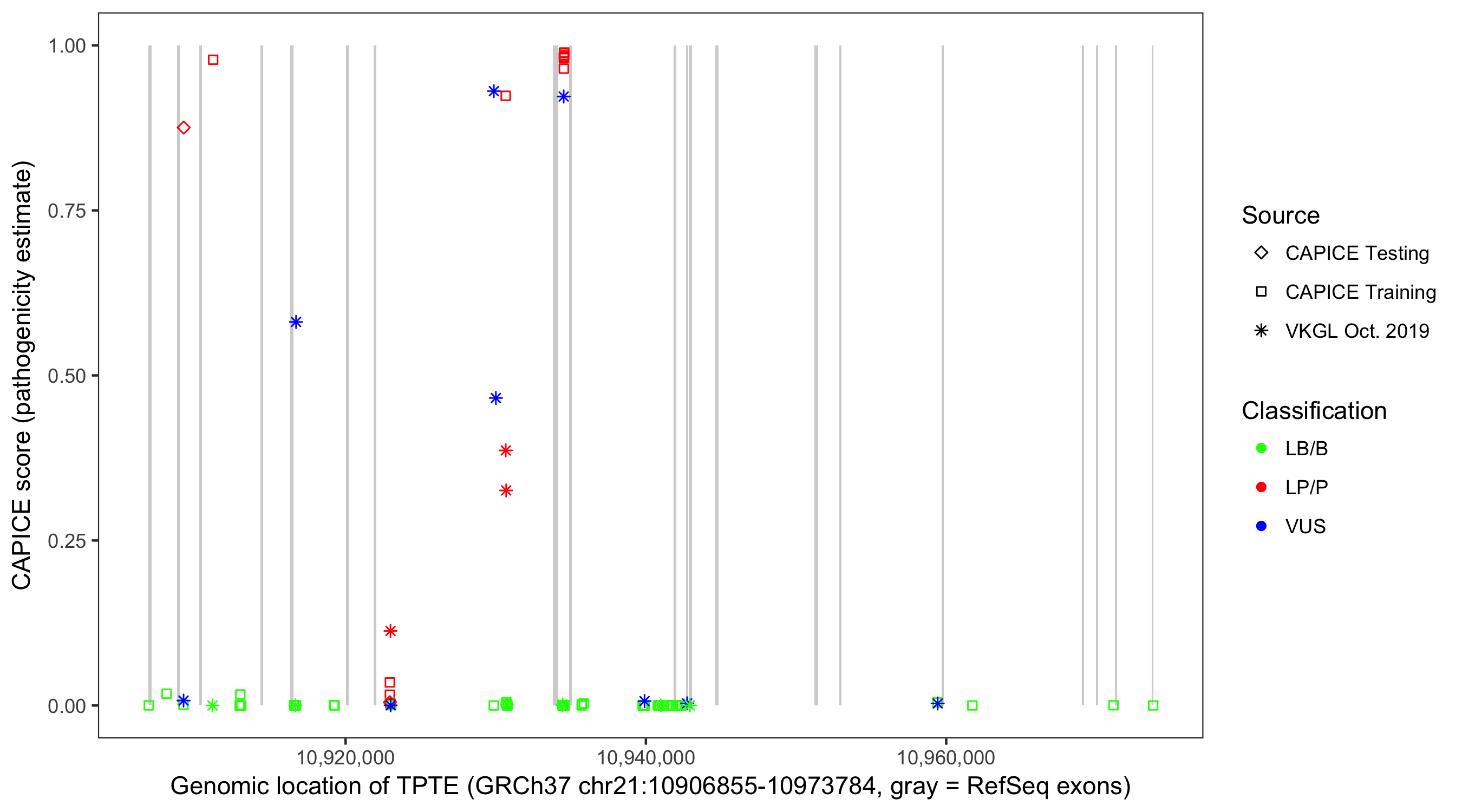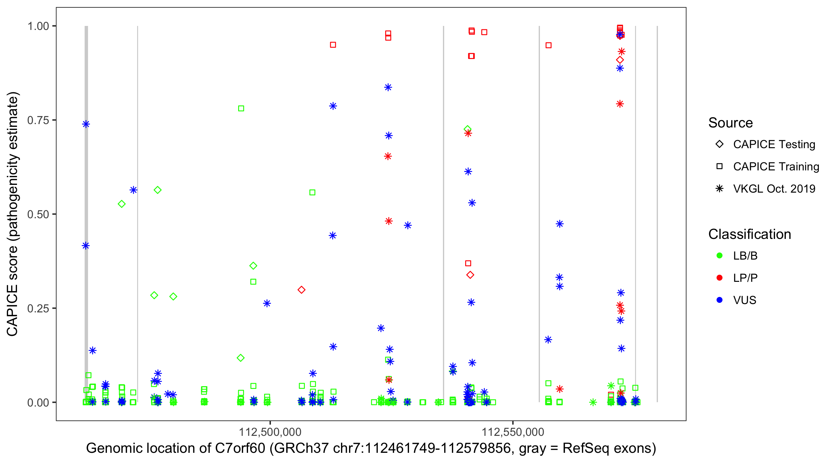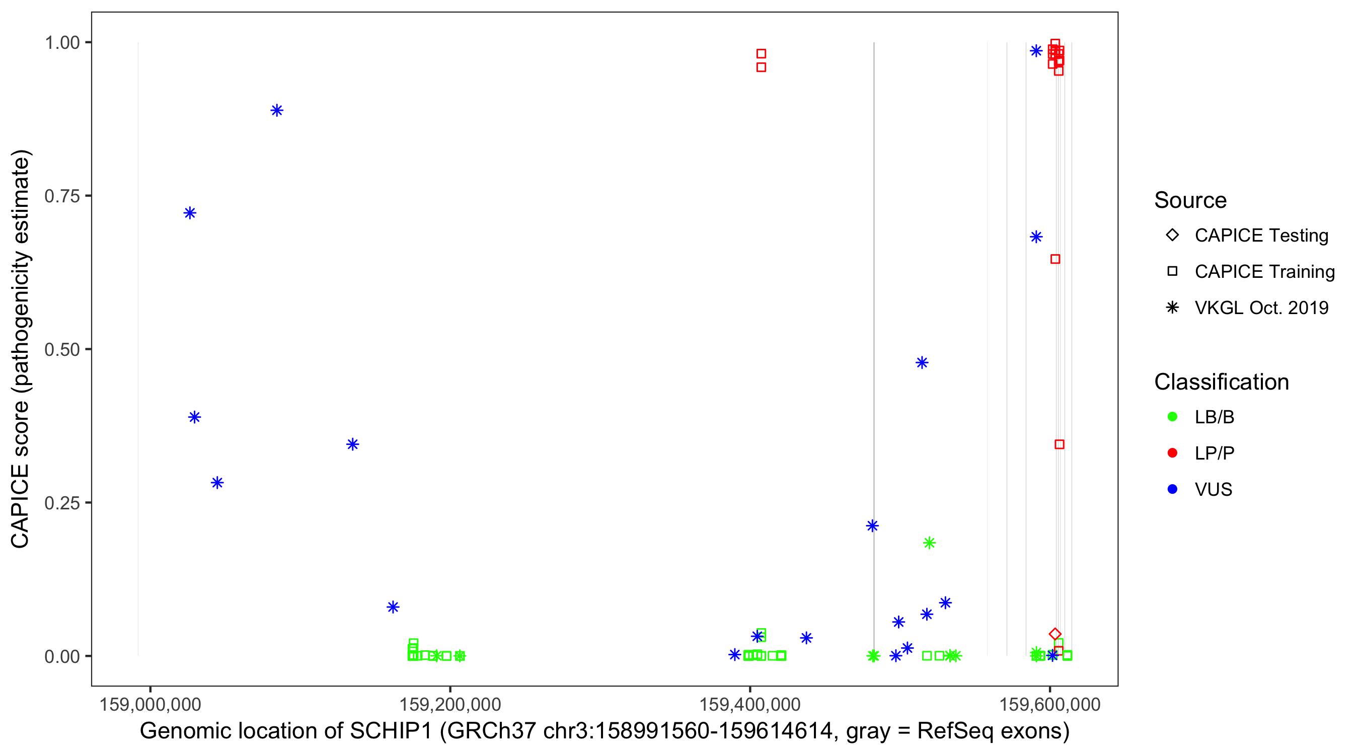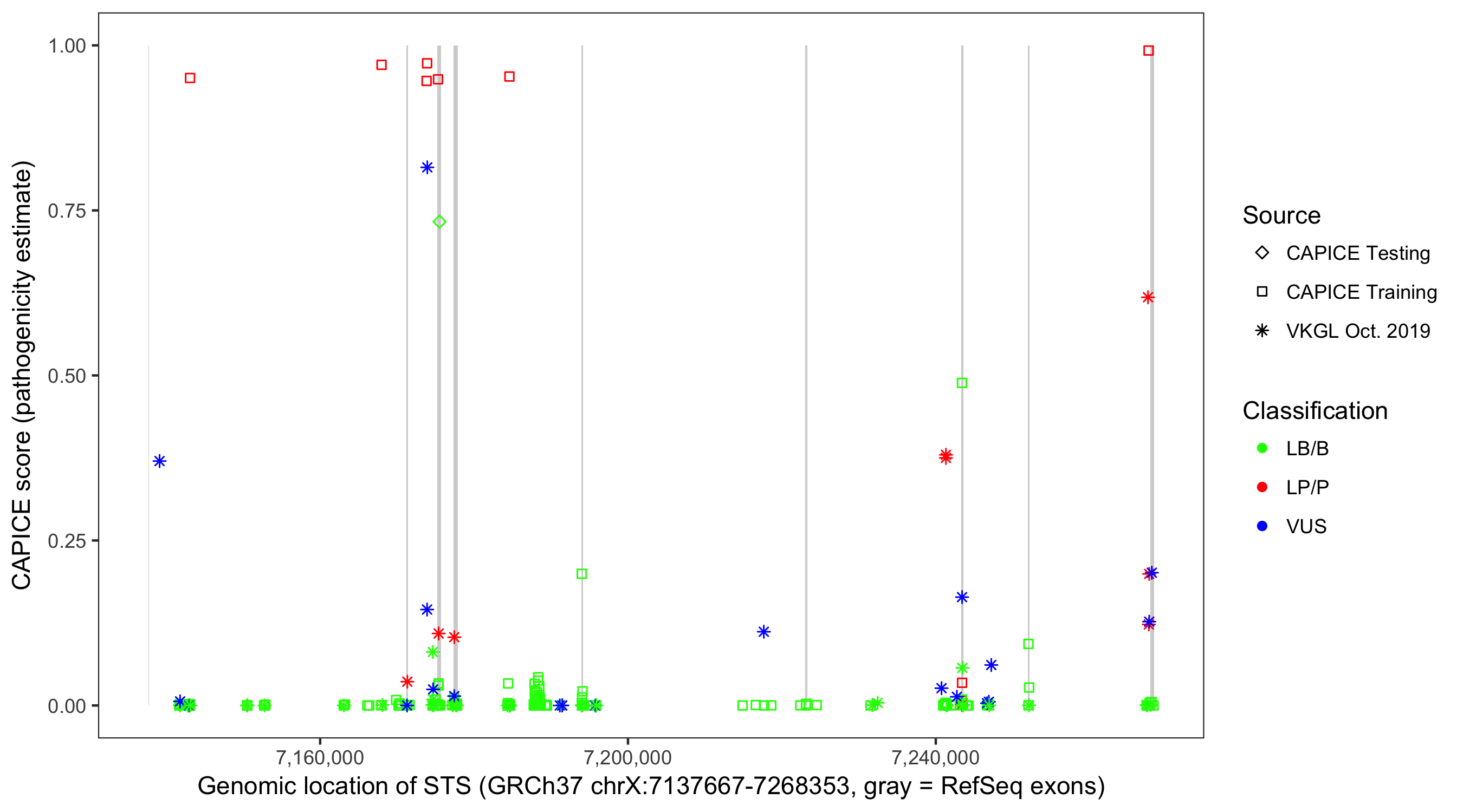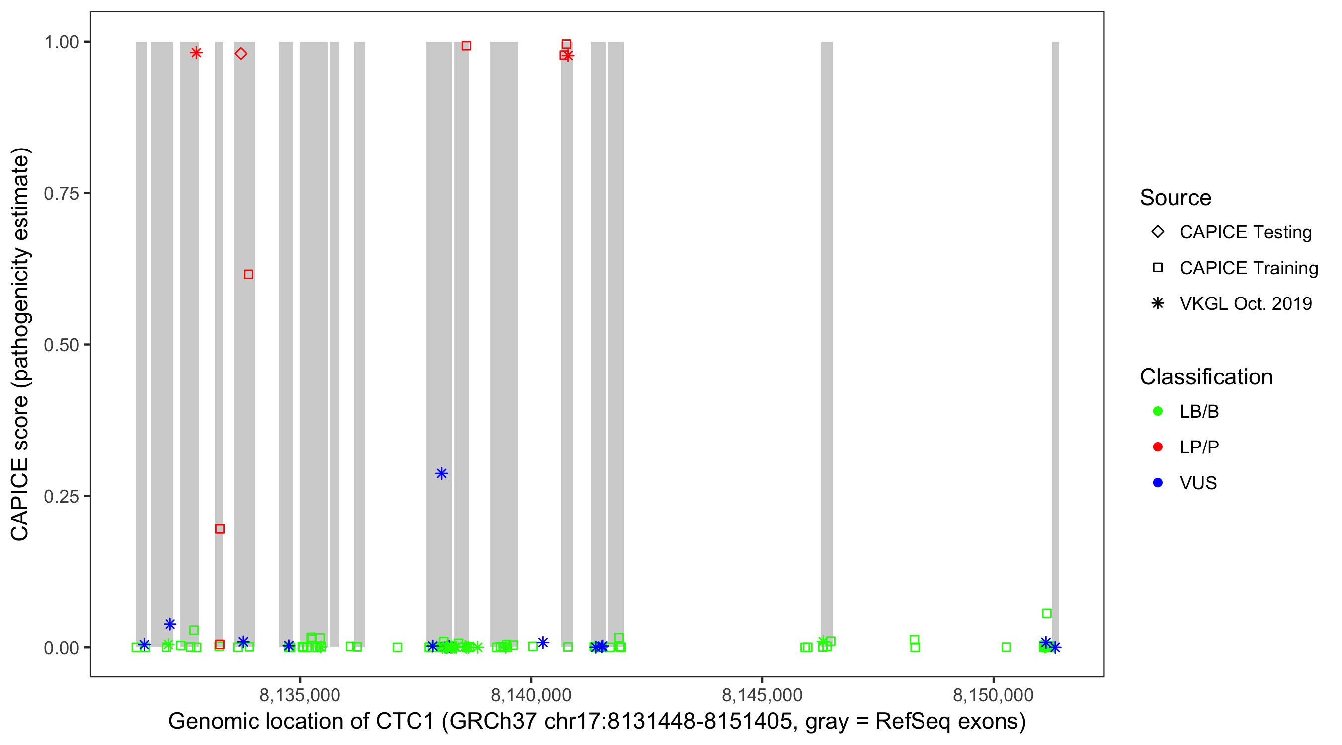 Shown are CAPICE train/test variants plus VKGL Oct 2019.