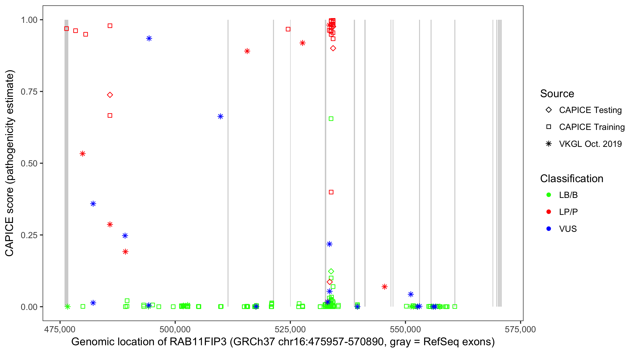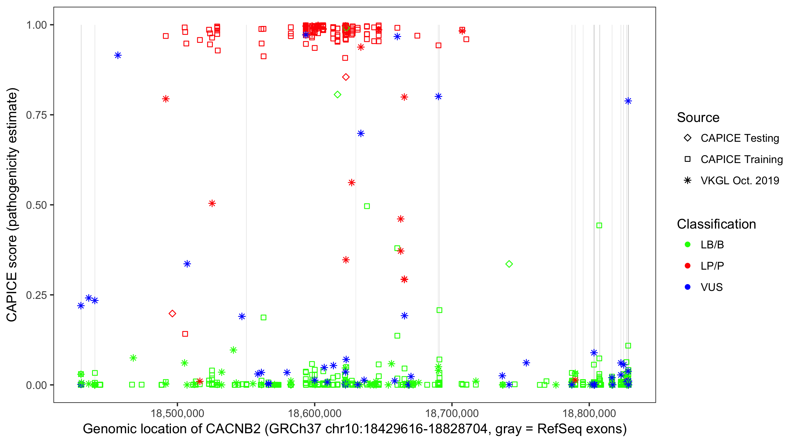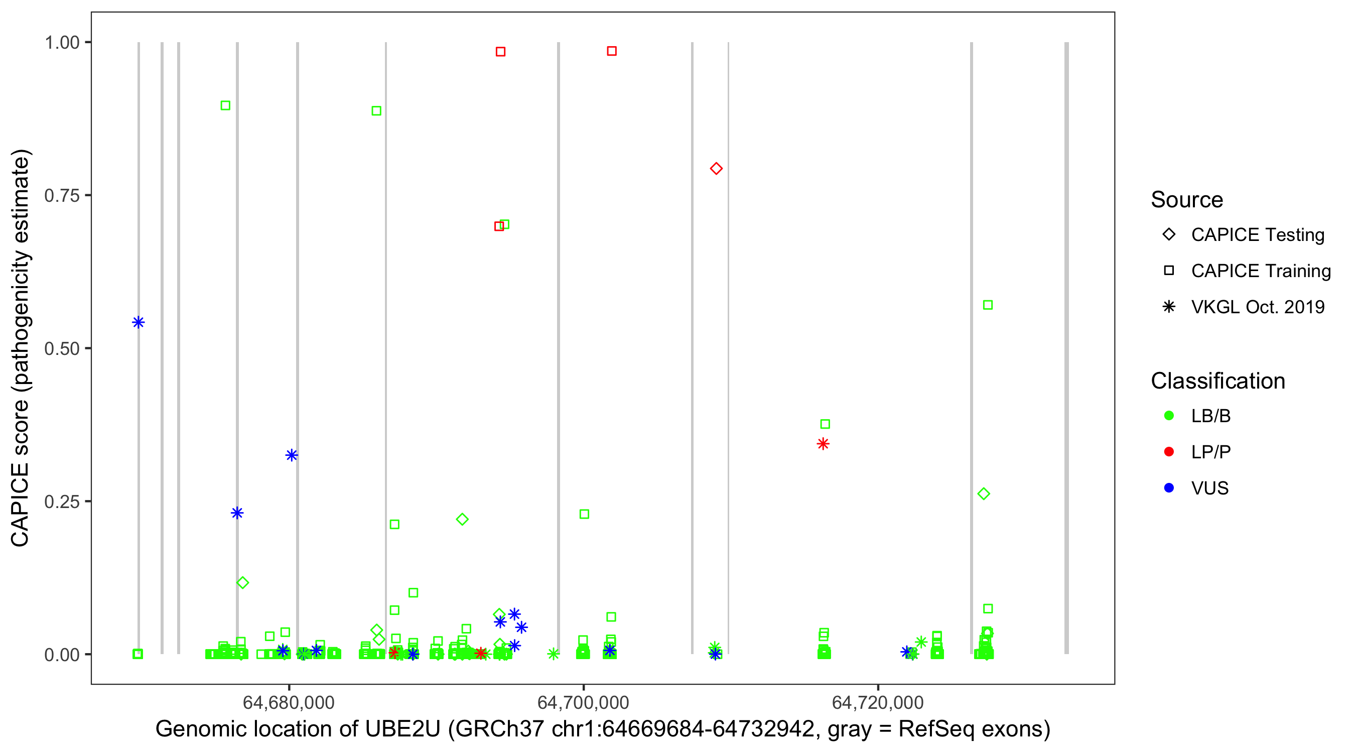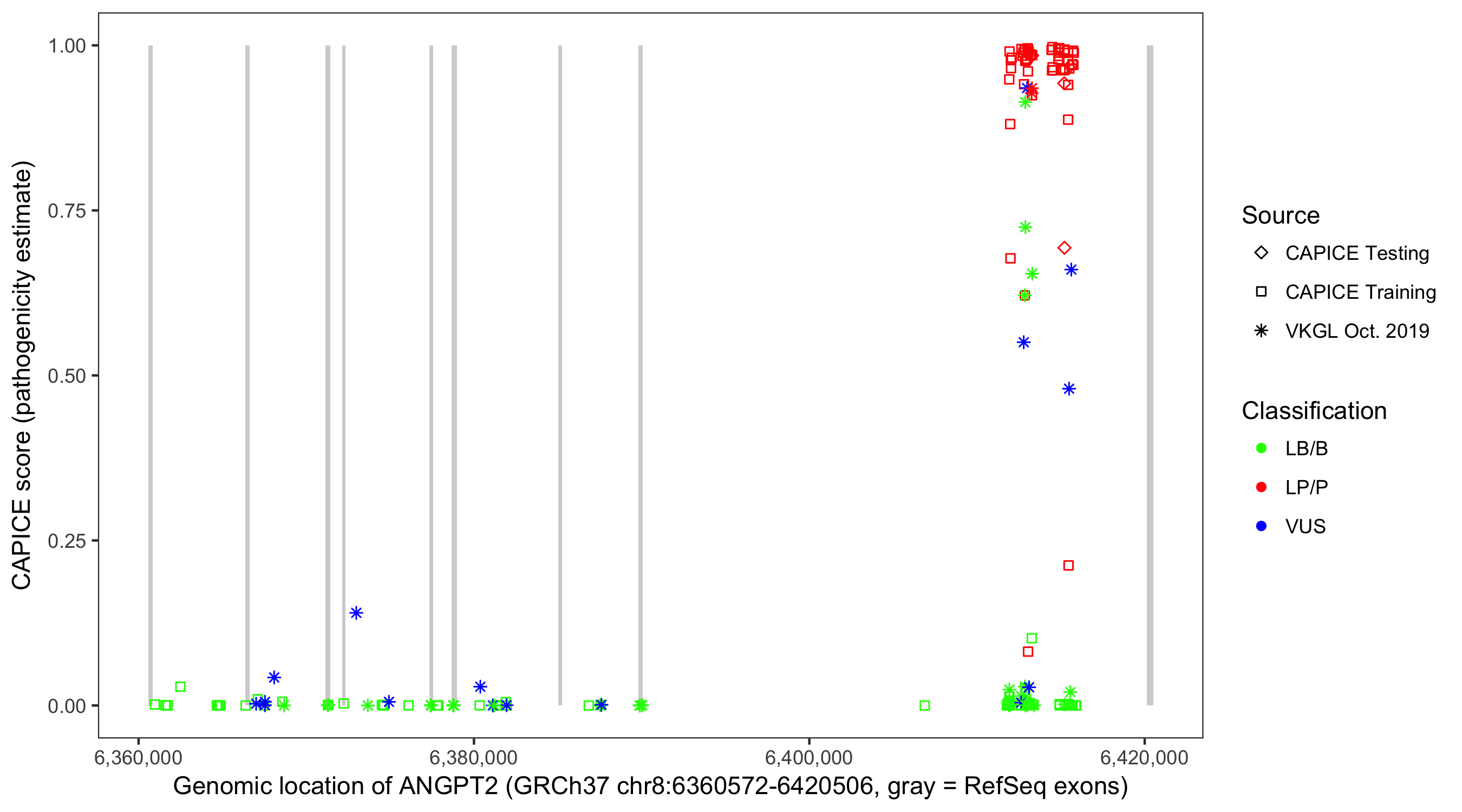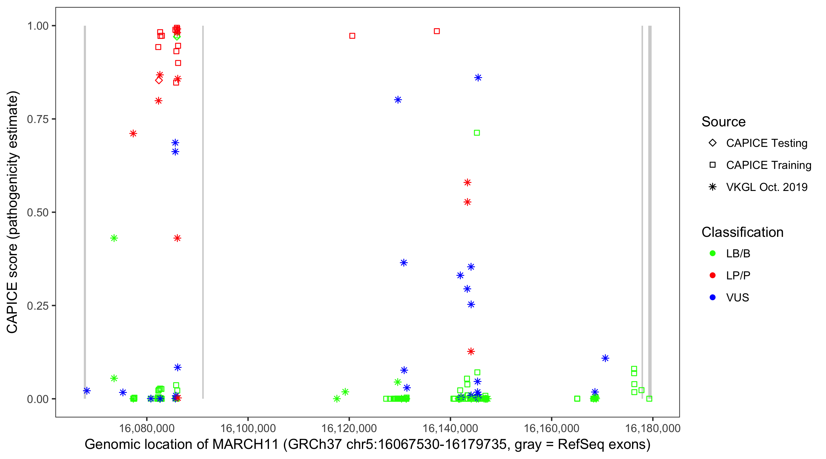 Shown are CAPICE train/test variants plus VKGL Oct 2019.