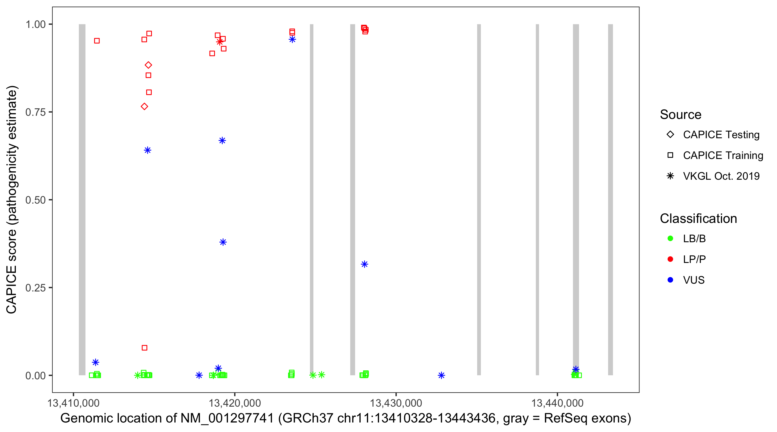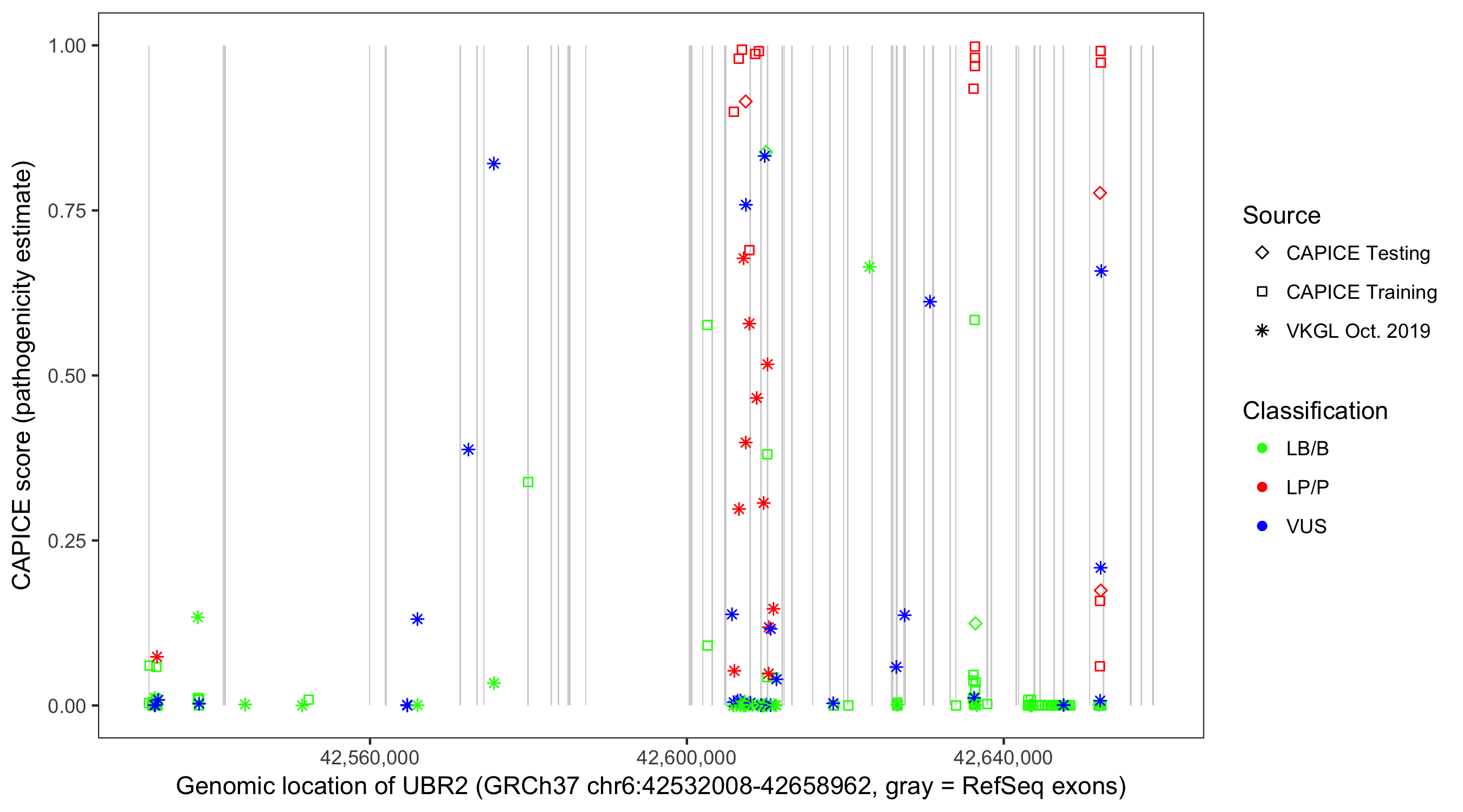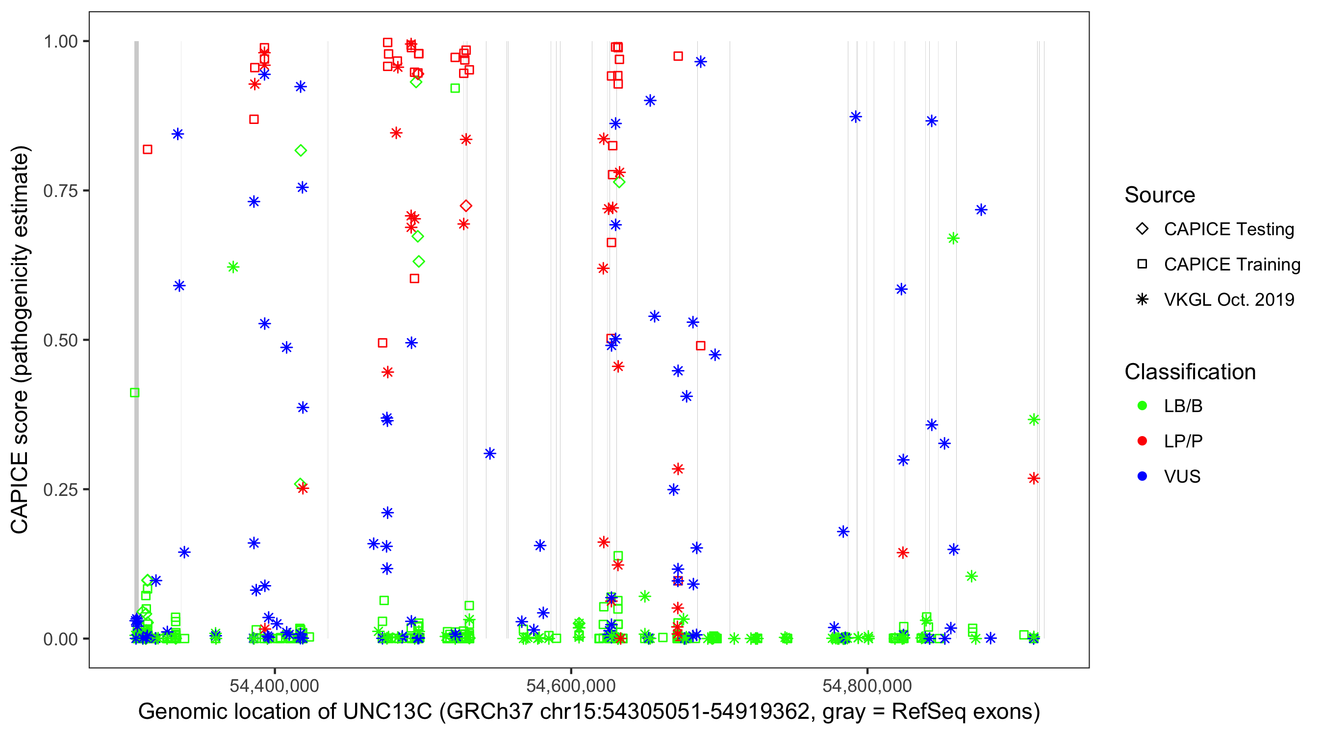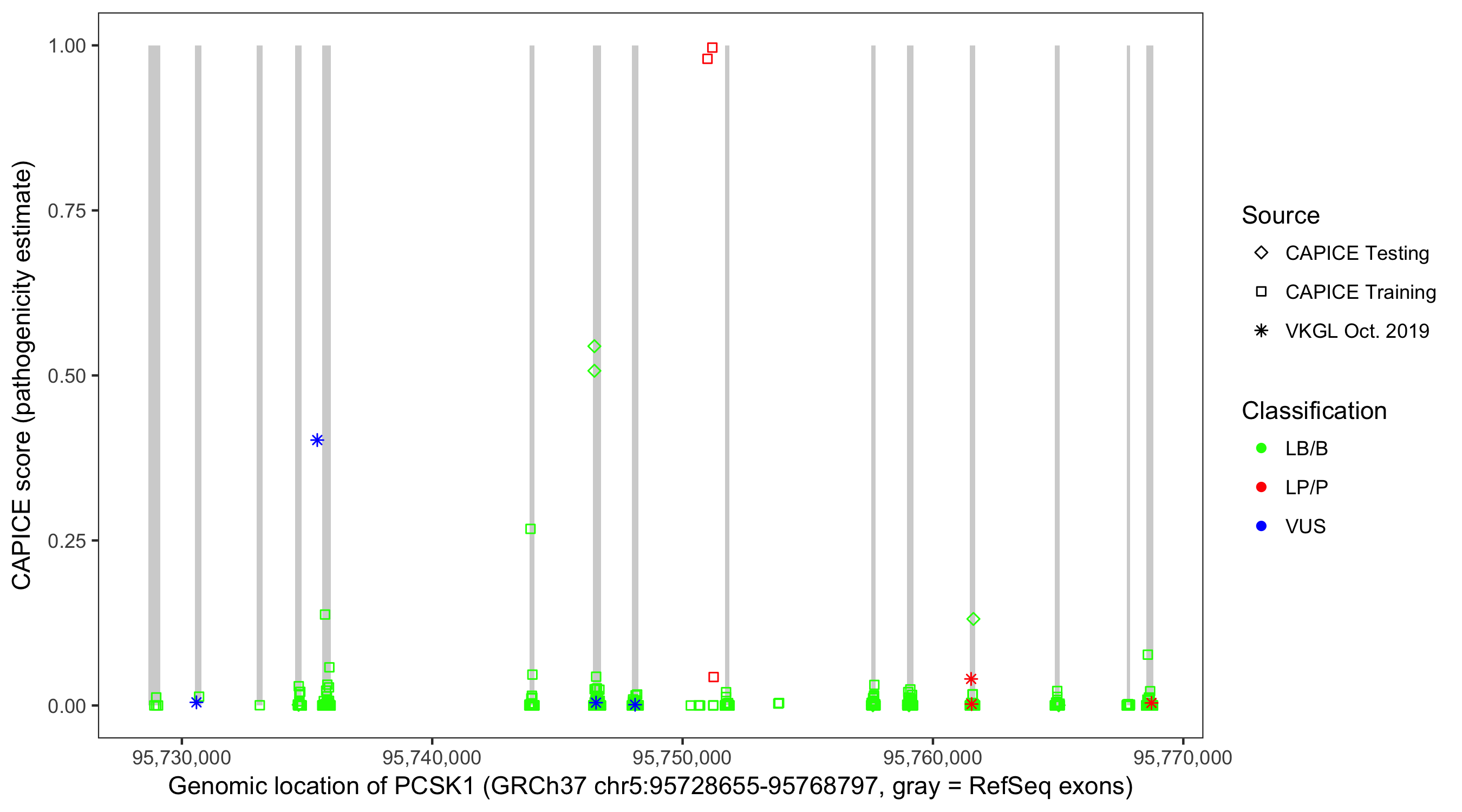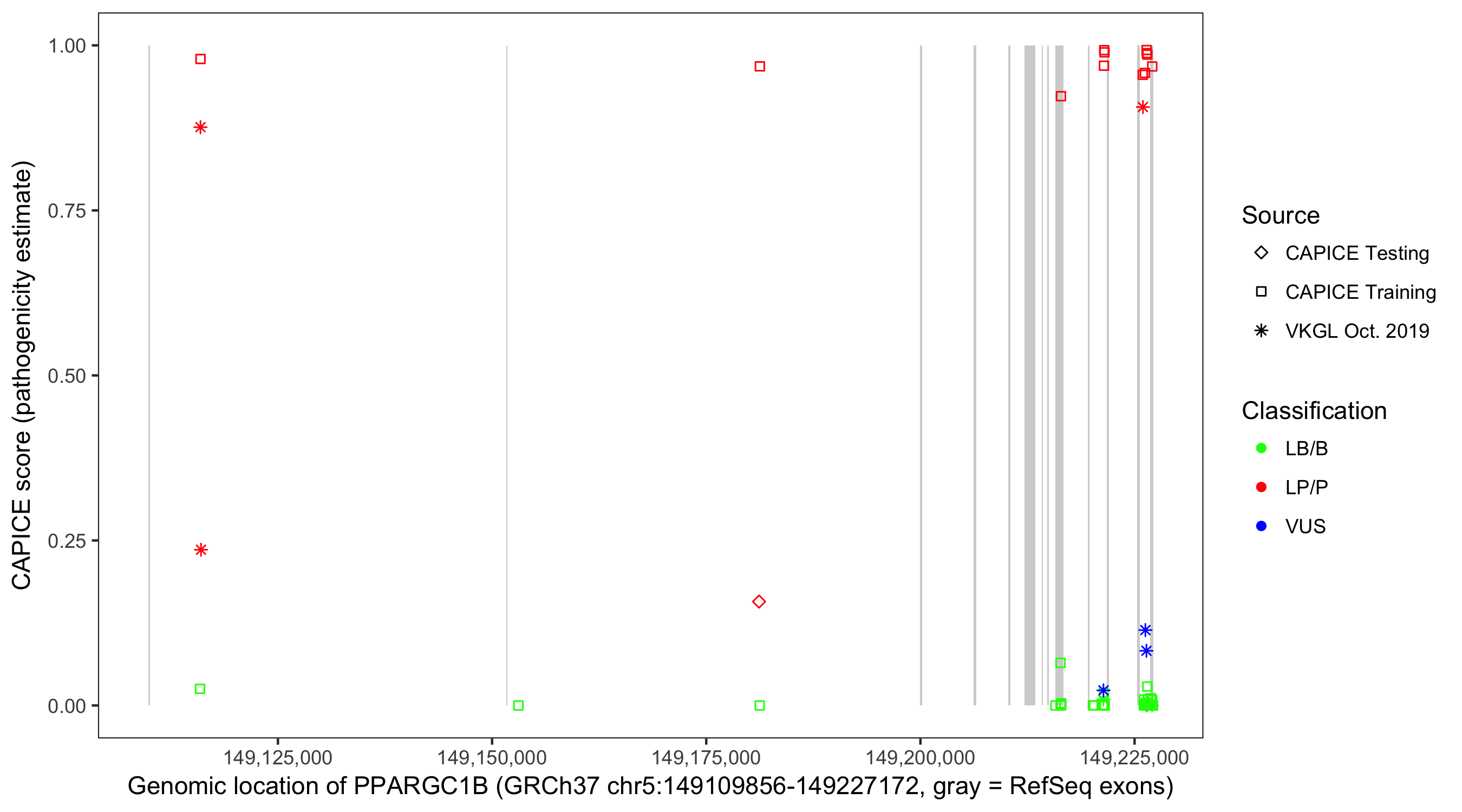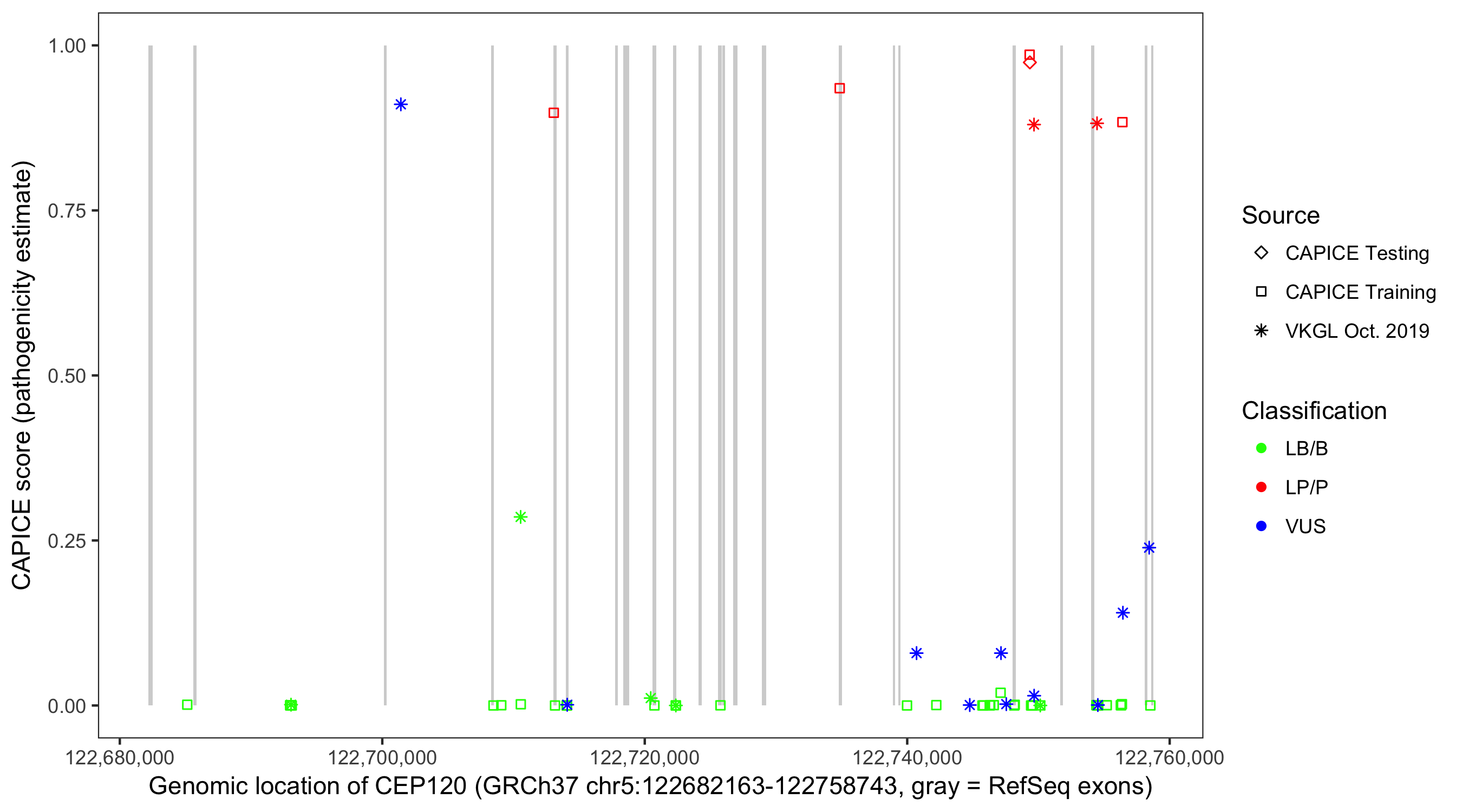 Shown are CAPICE train/test variants plus VKGL Oct 2019.