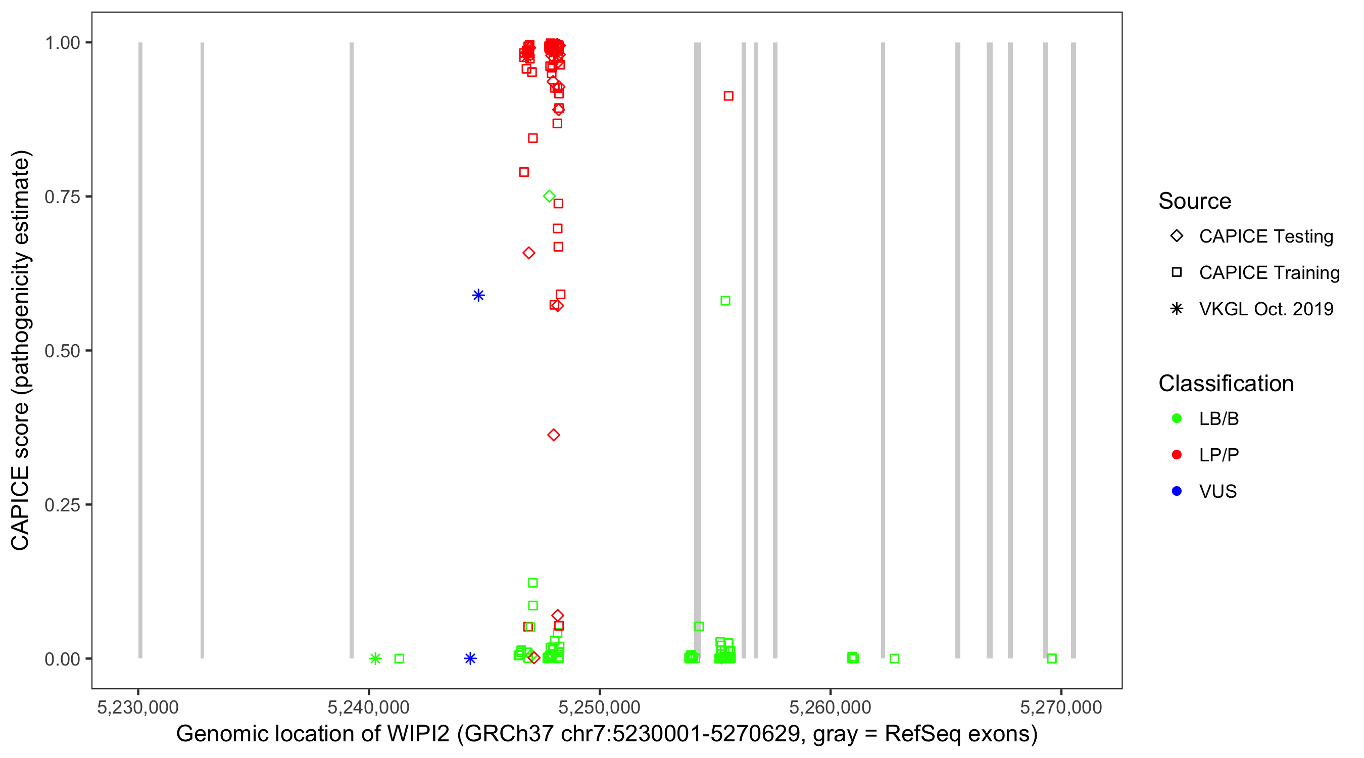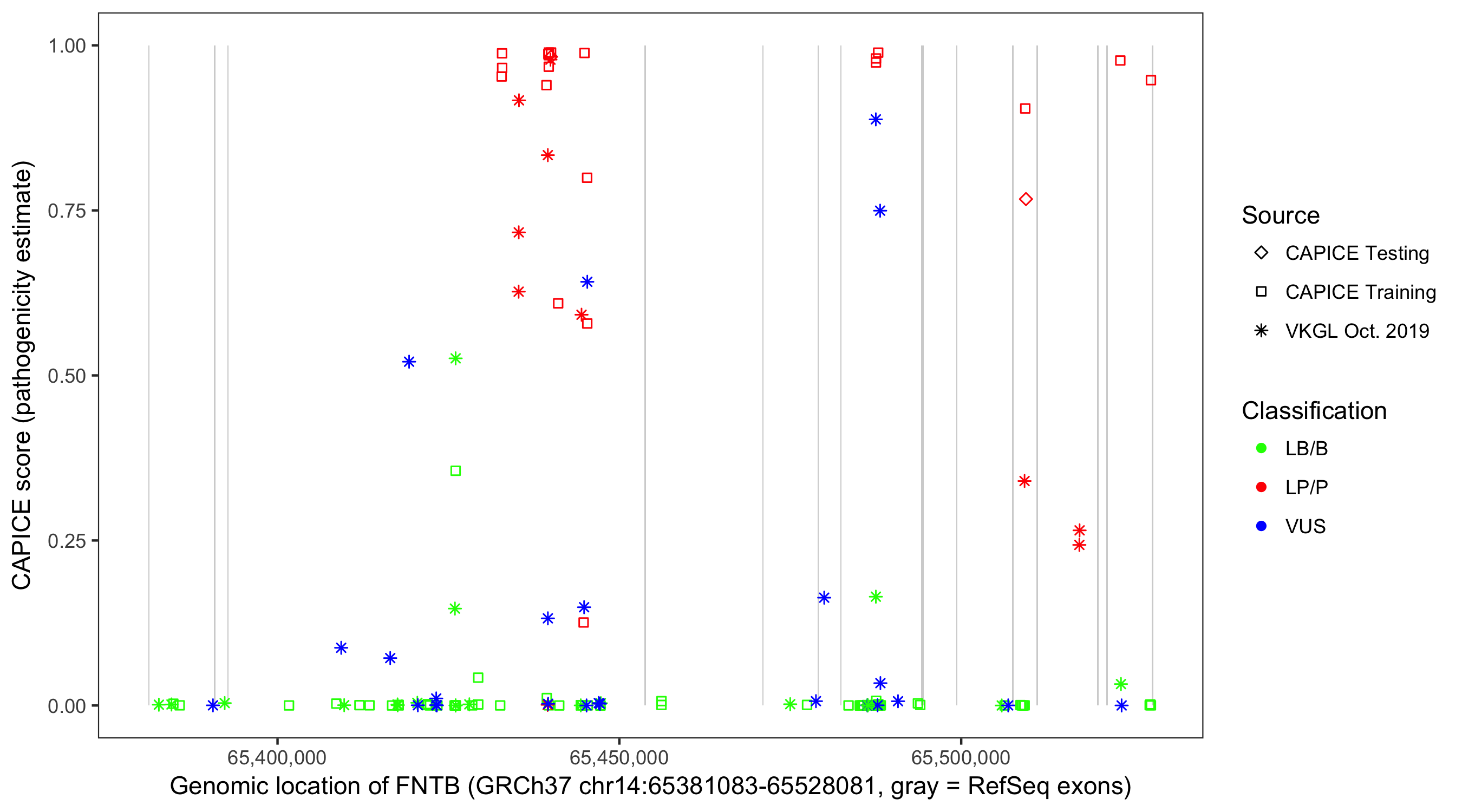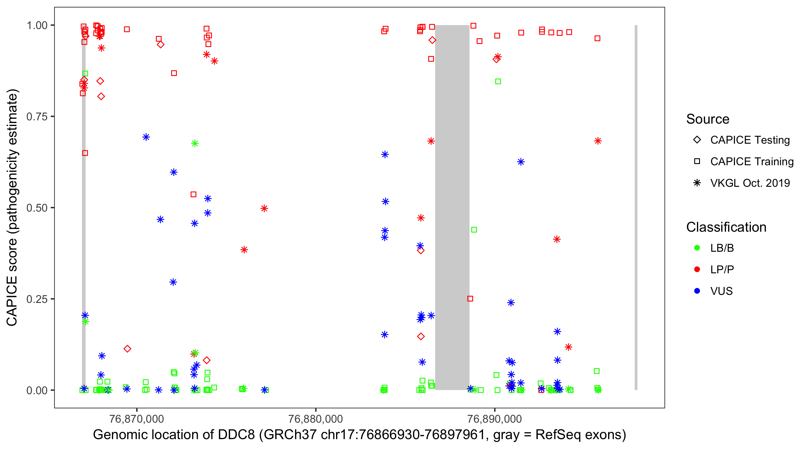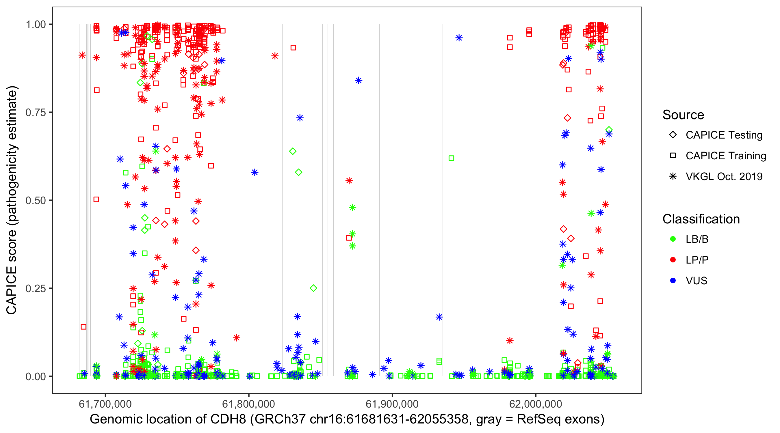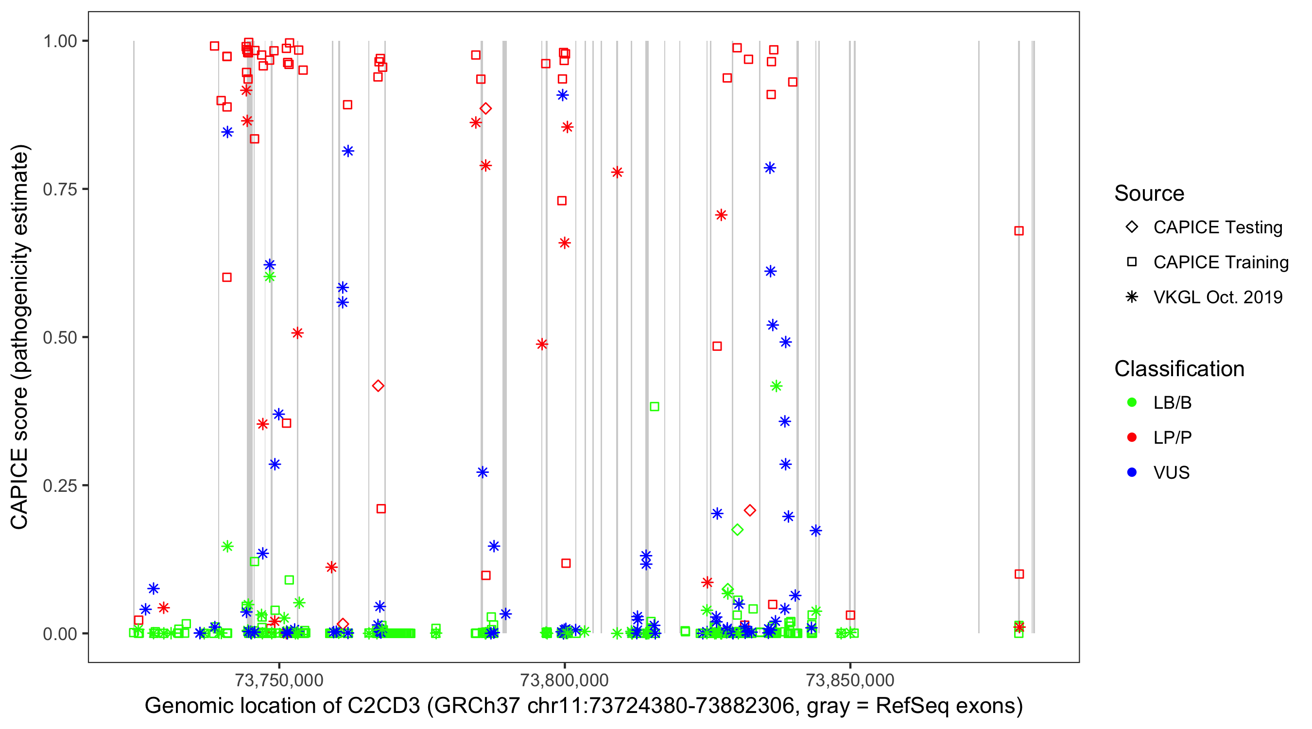 Shown are CAPICE train/test variants plus VKGL Oct 2019.