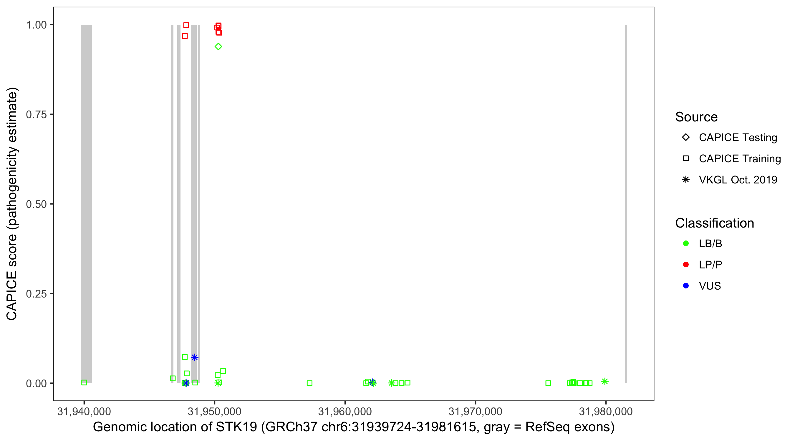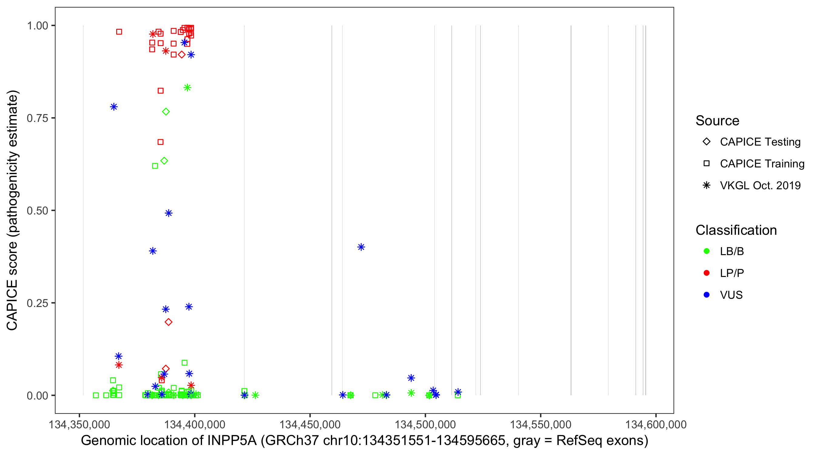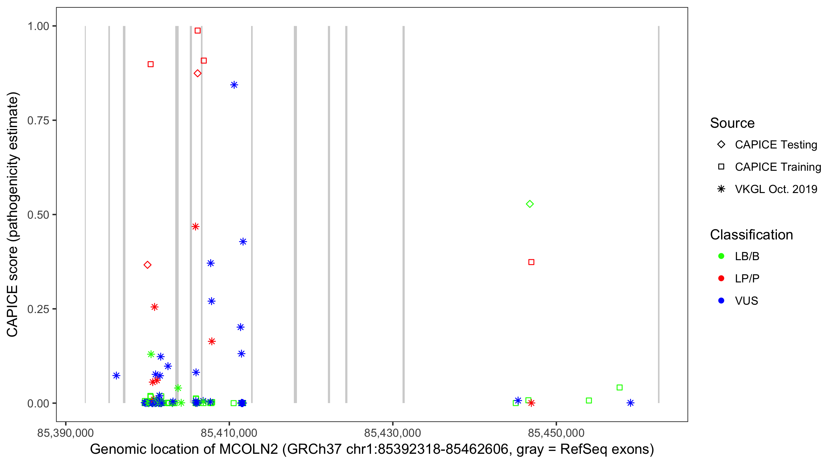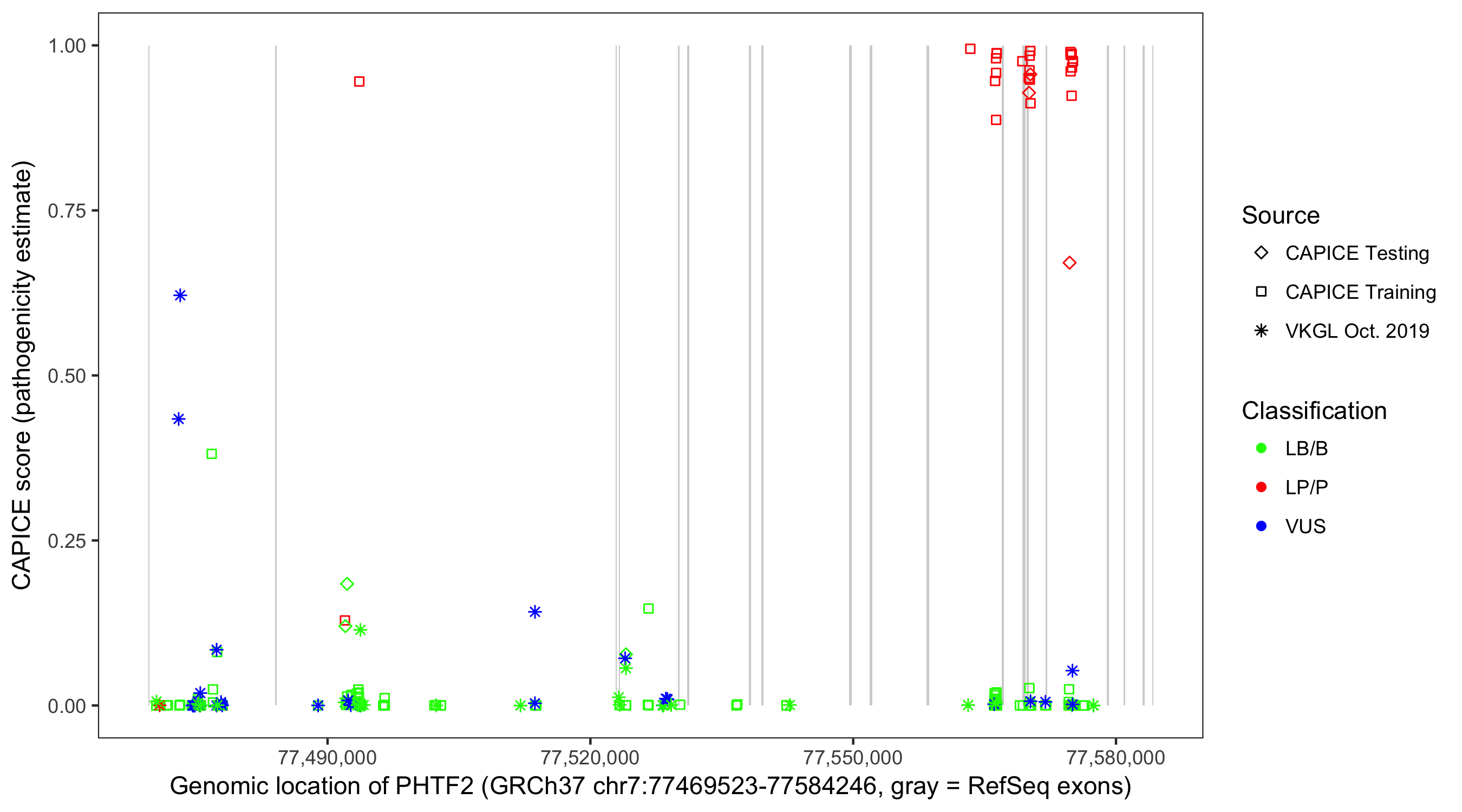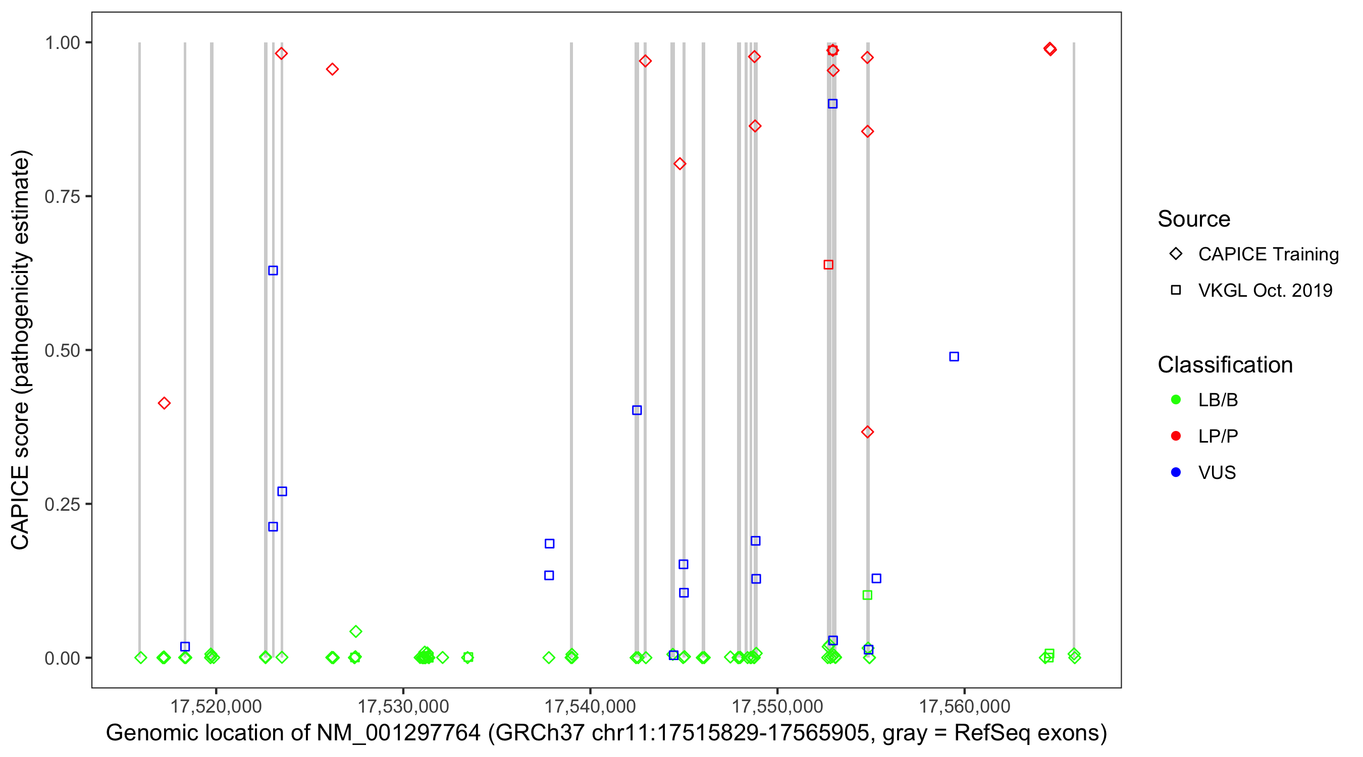 Shown are CAPICE train/test variants plus VKGL Oct 2019.