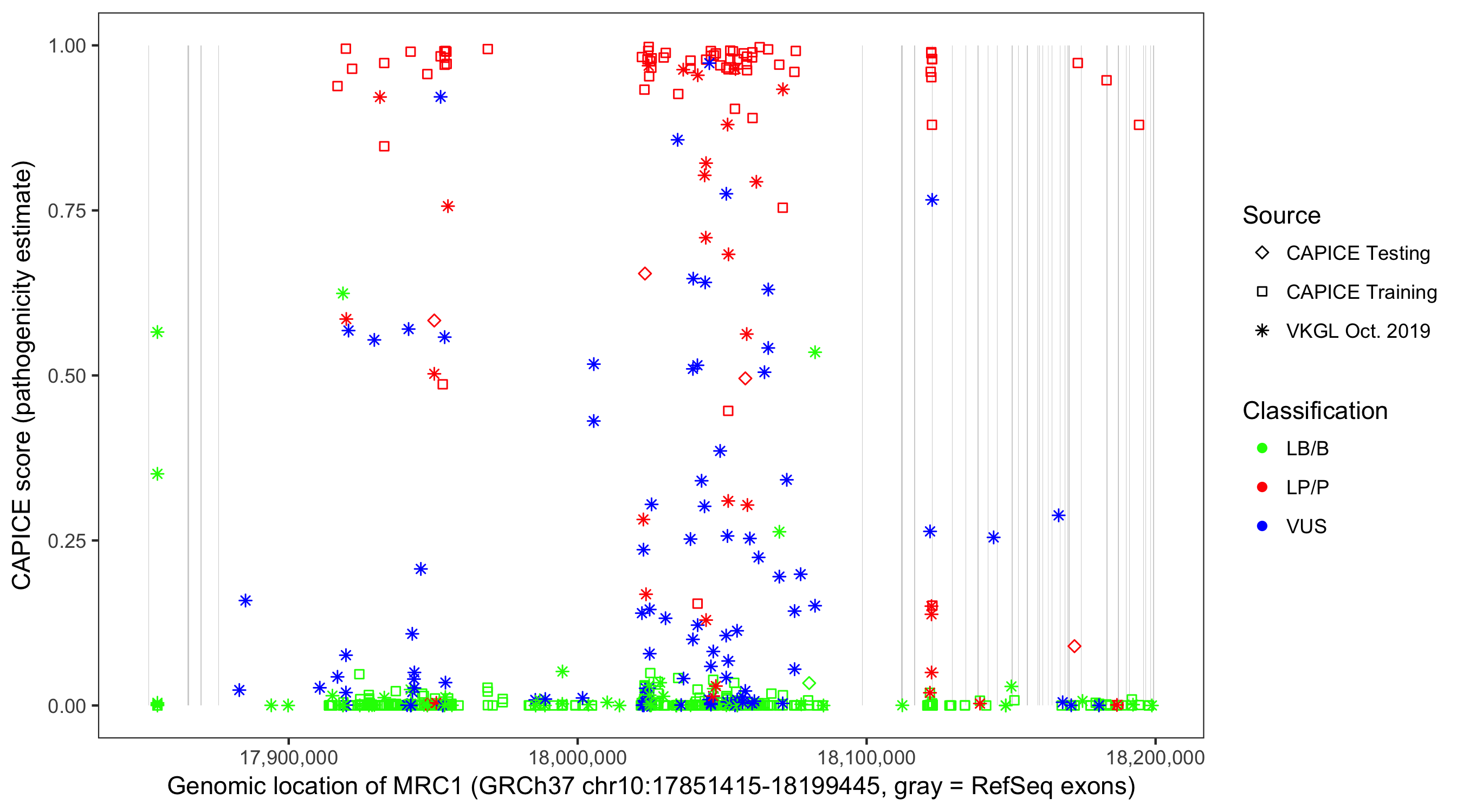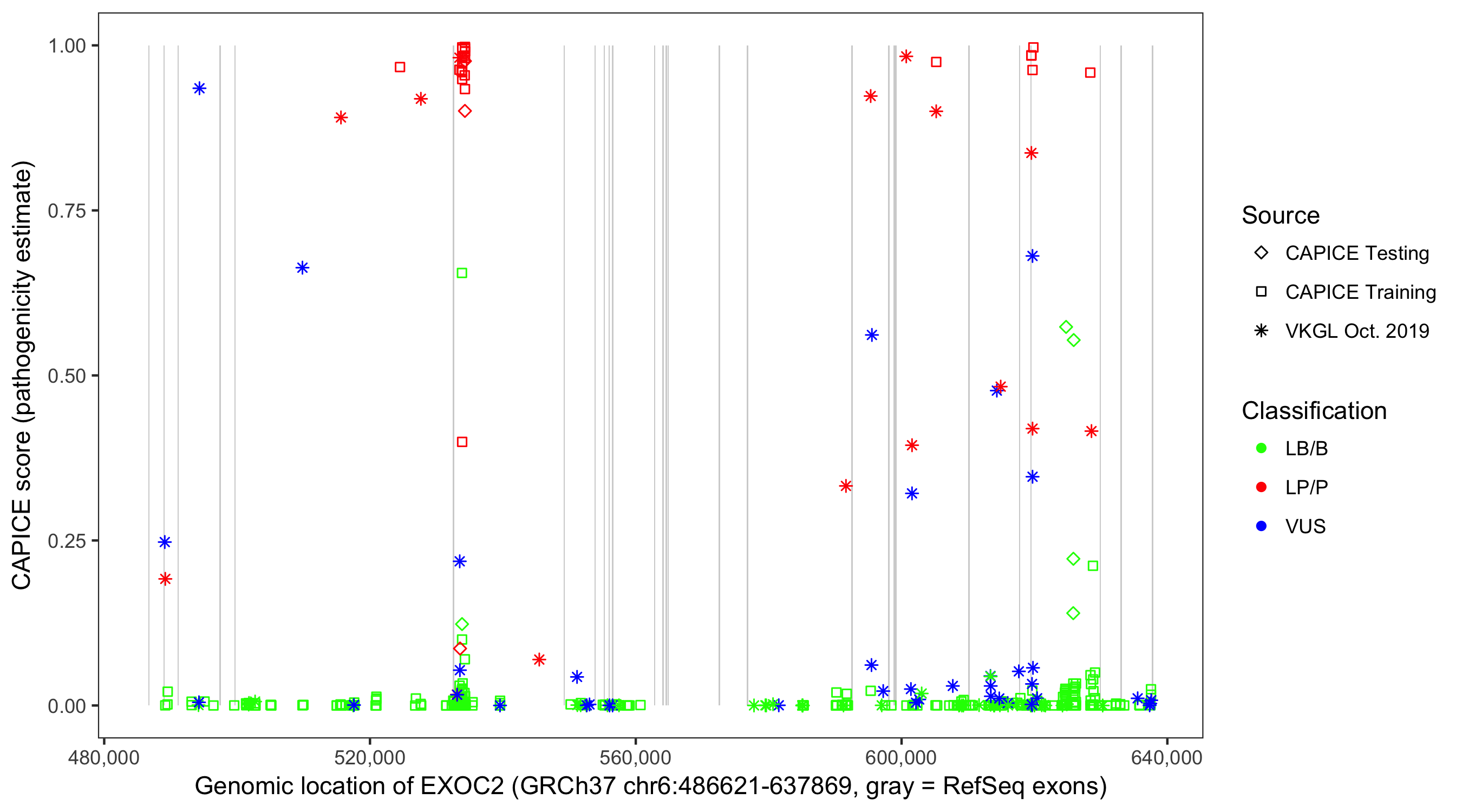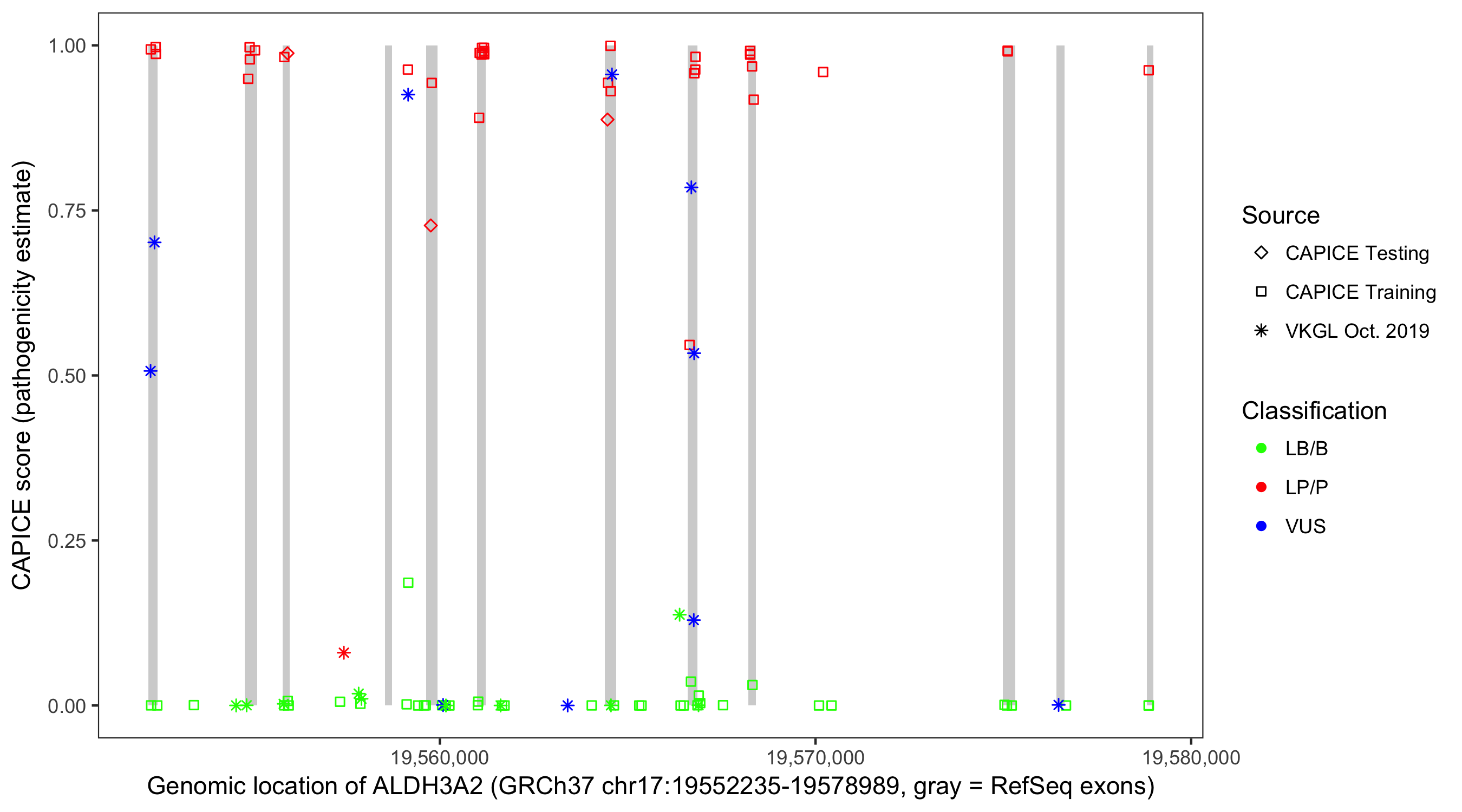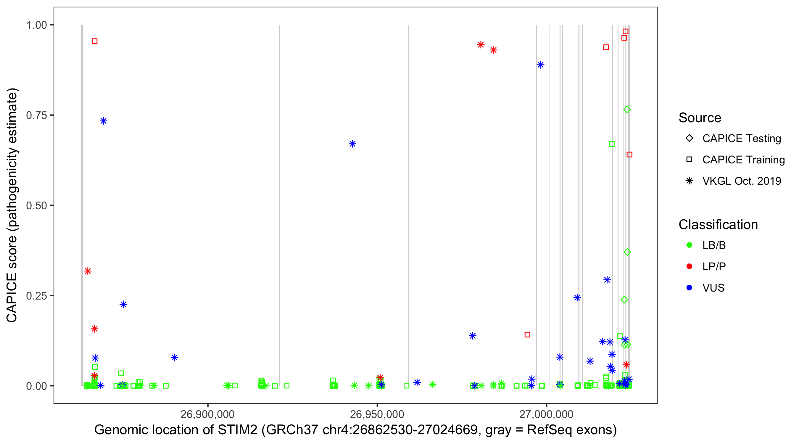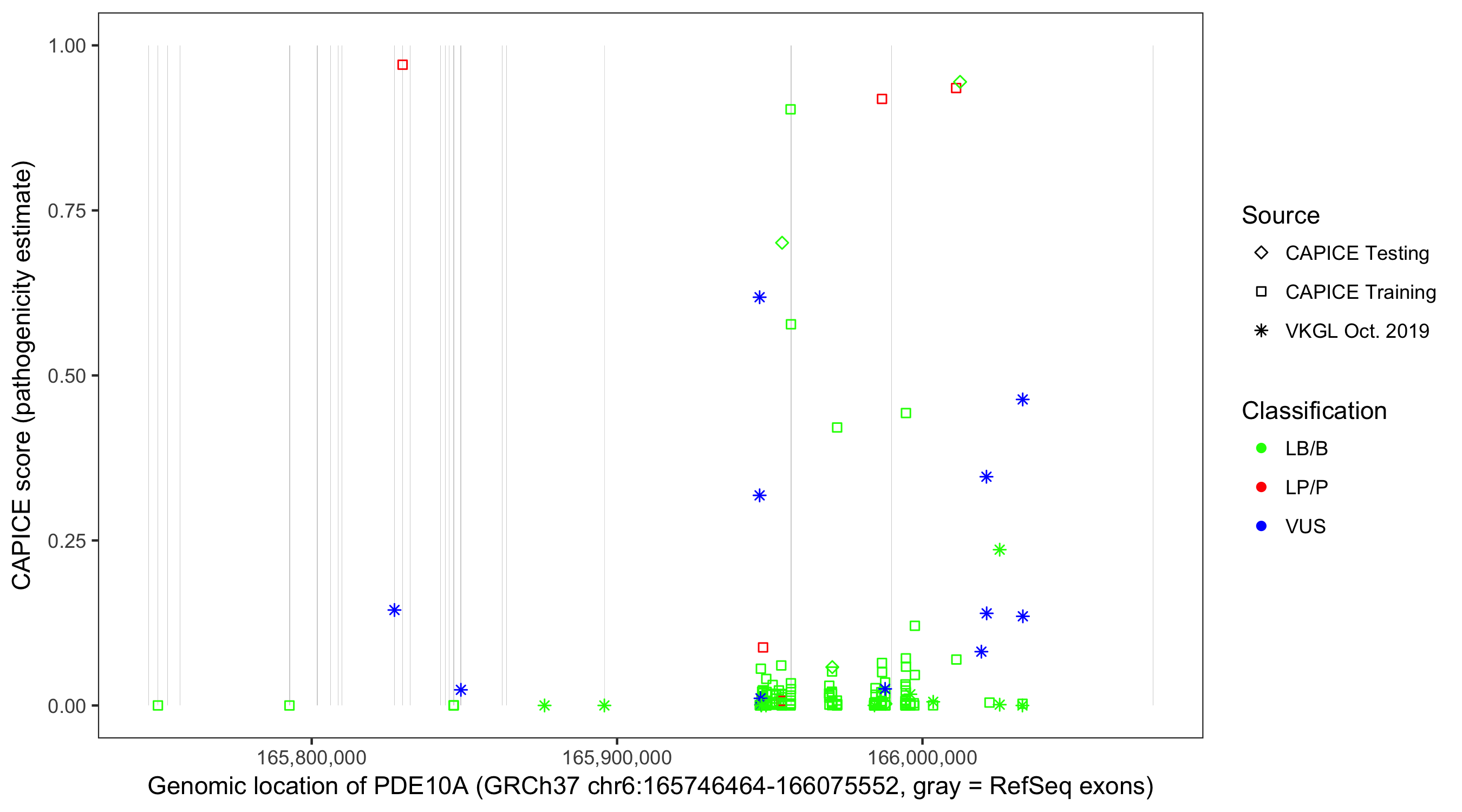 Shown are CAPICE train/test variants plus VKGL Oct 2019.