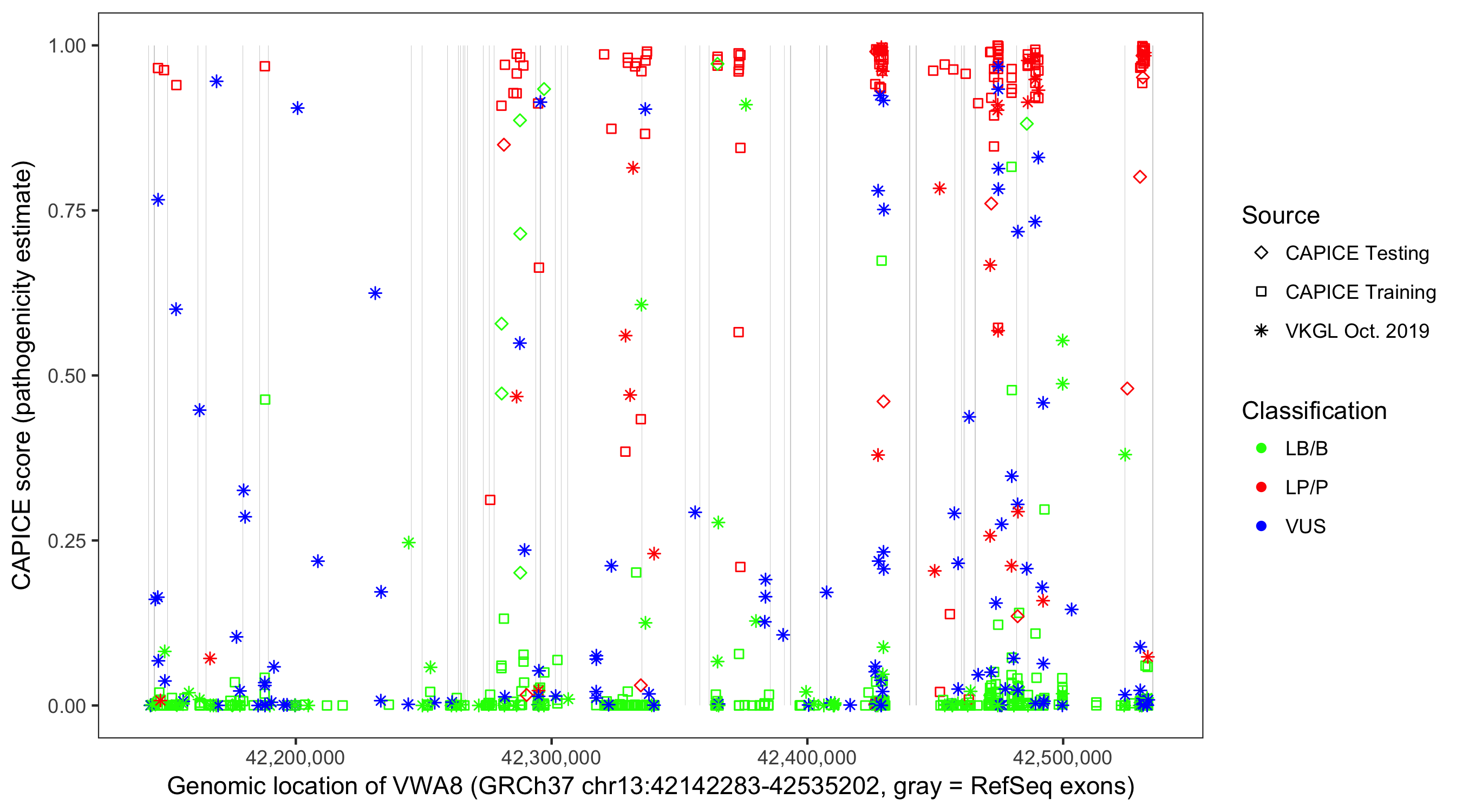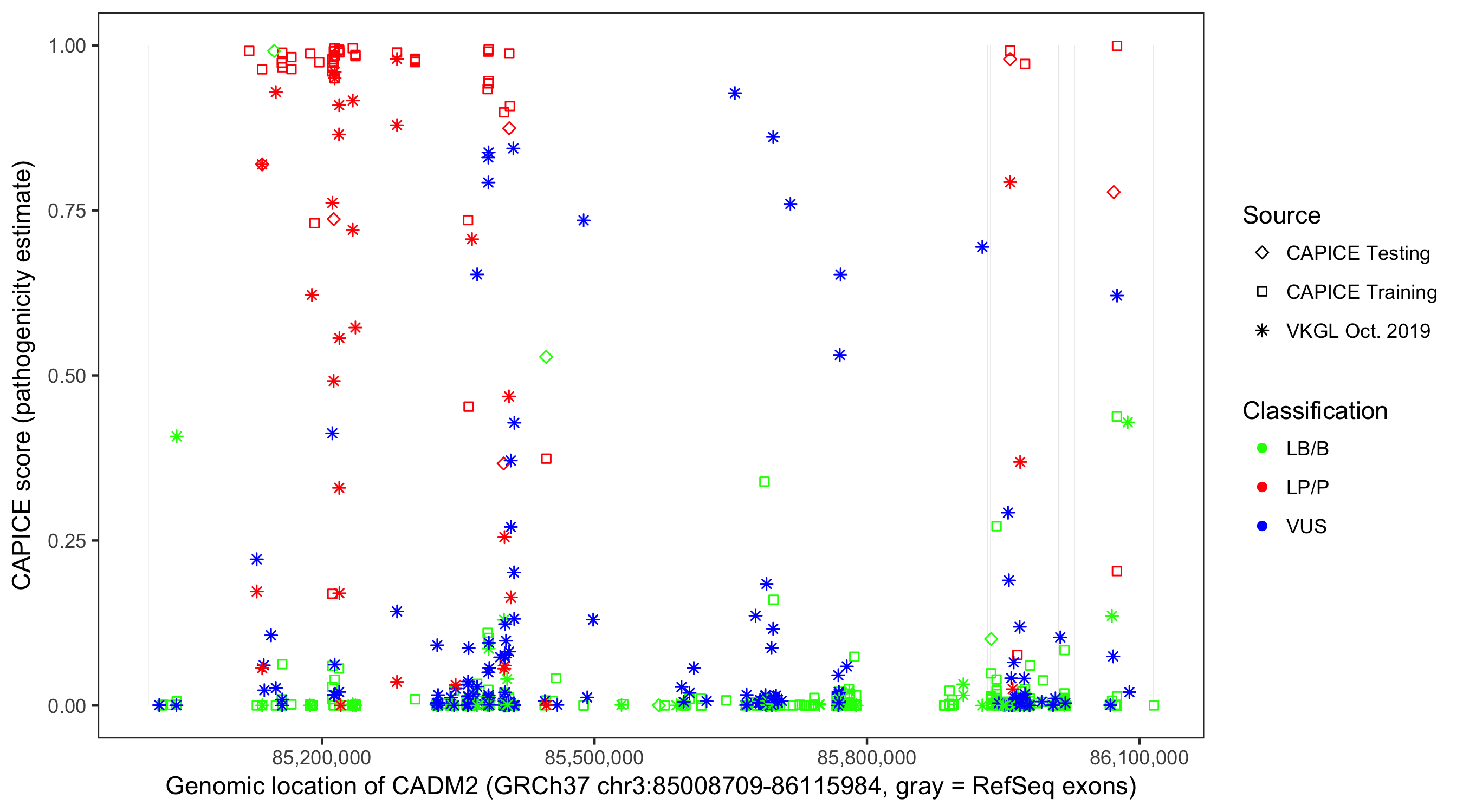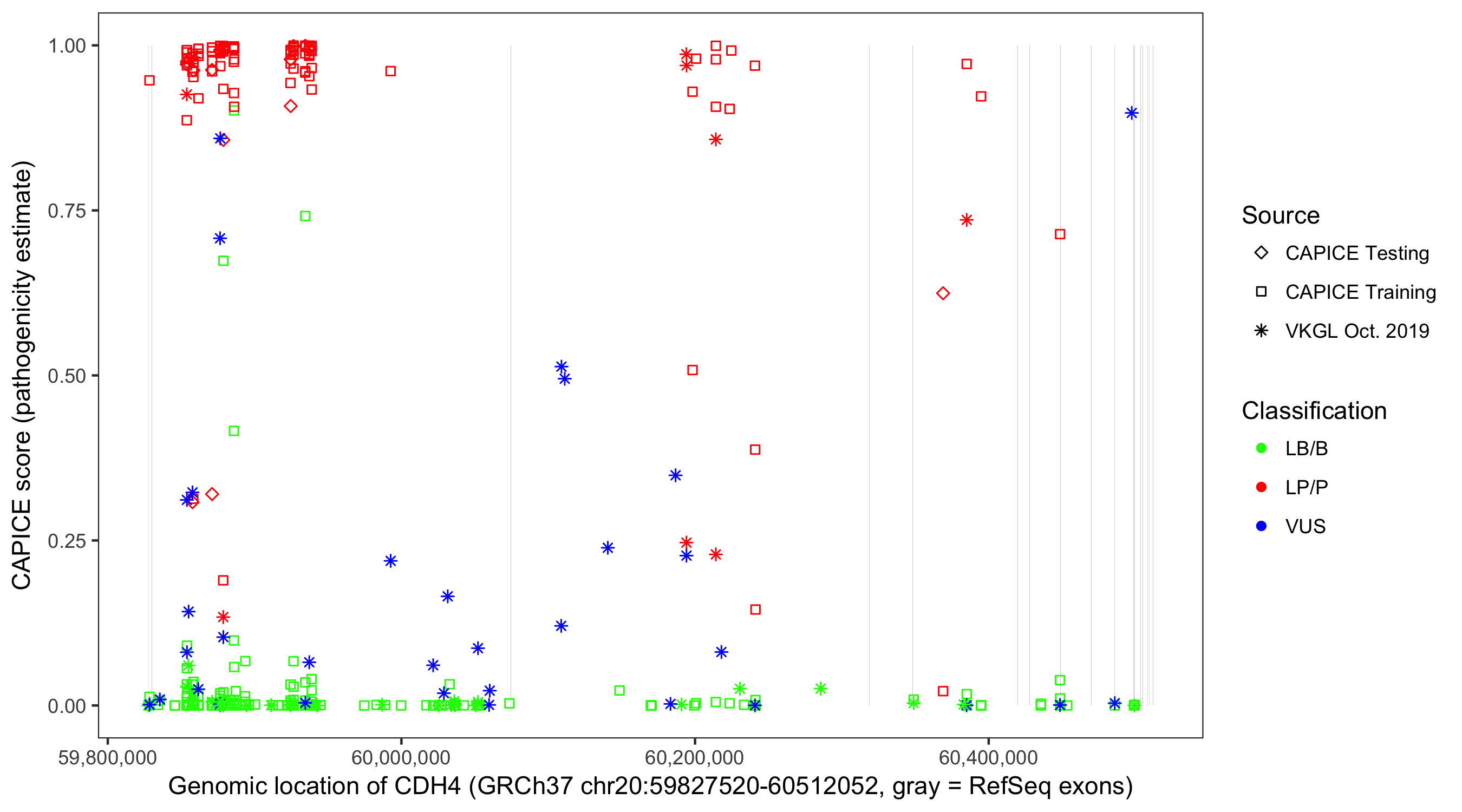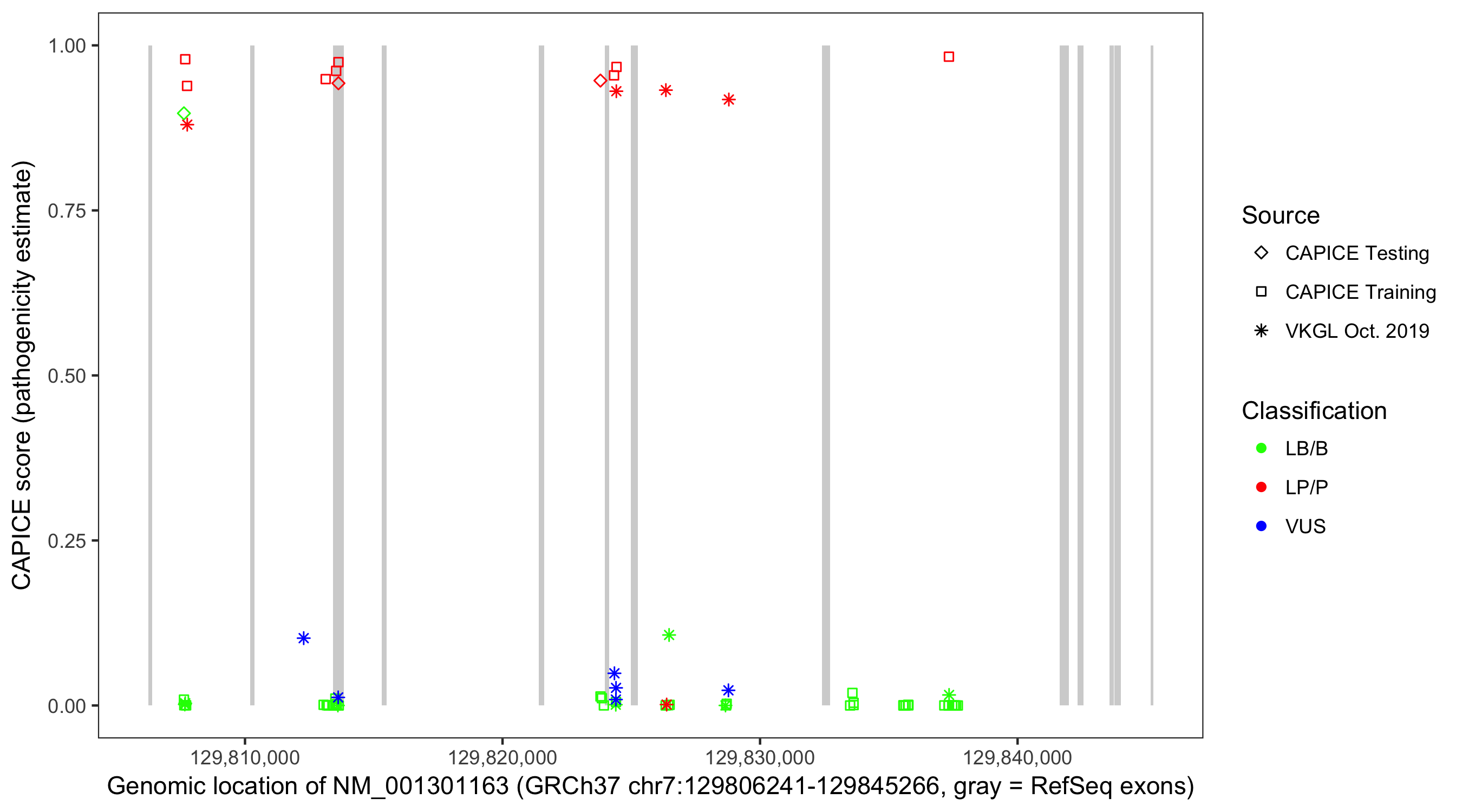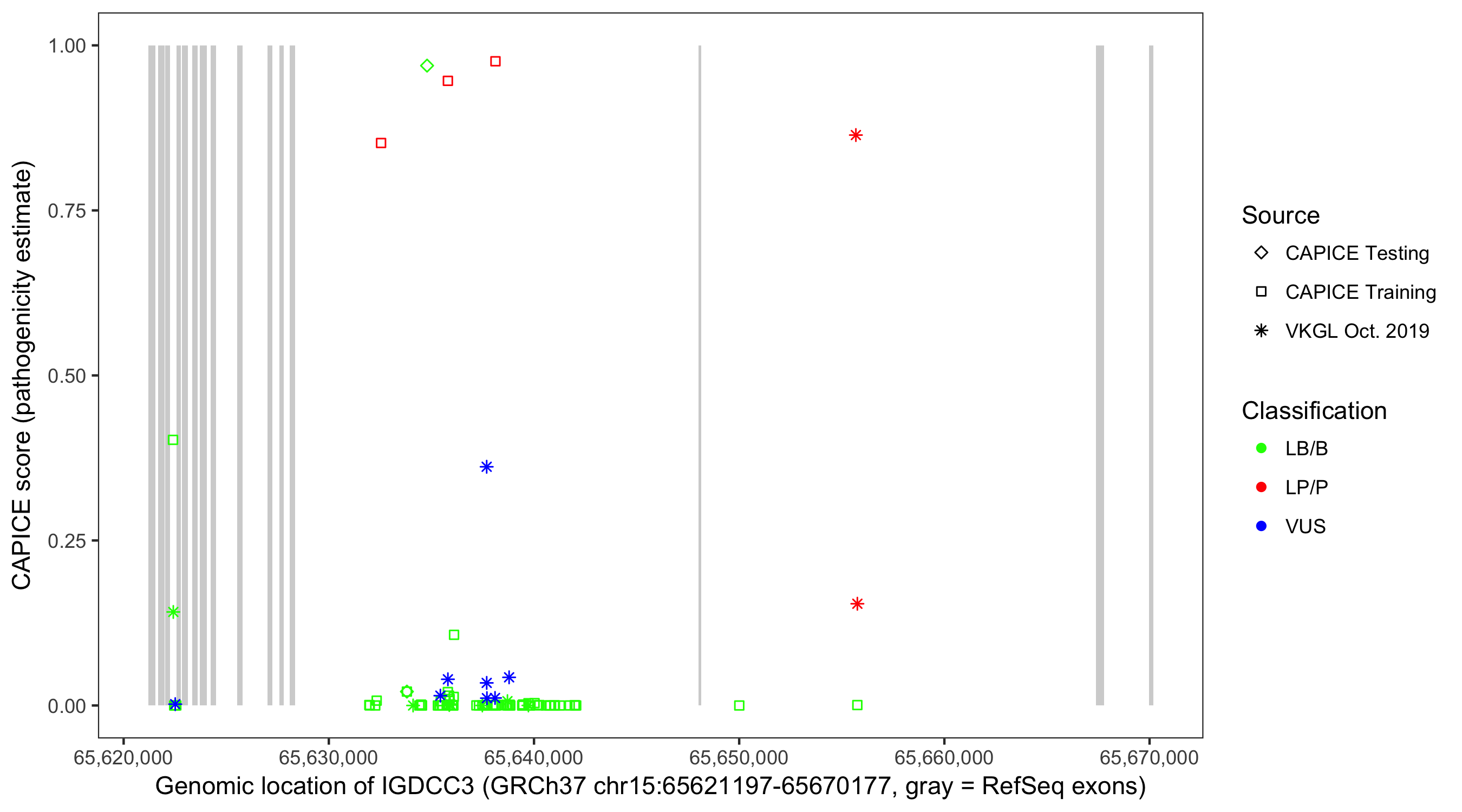 Shown are CAPICE train/test variants plus VKGL Oct 2019.
