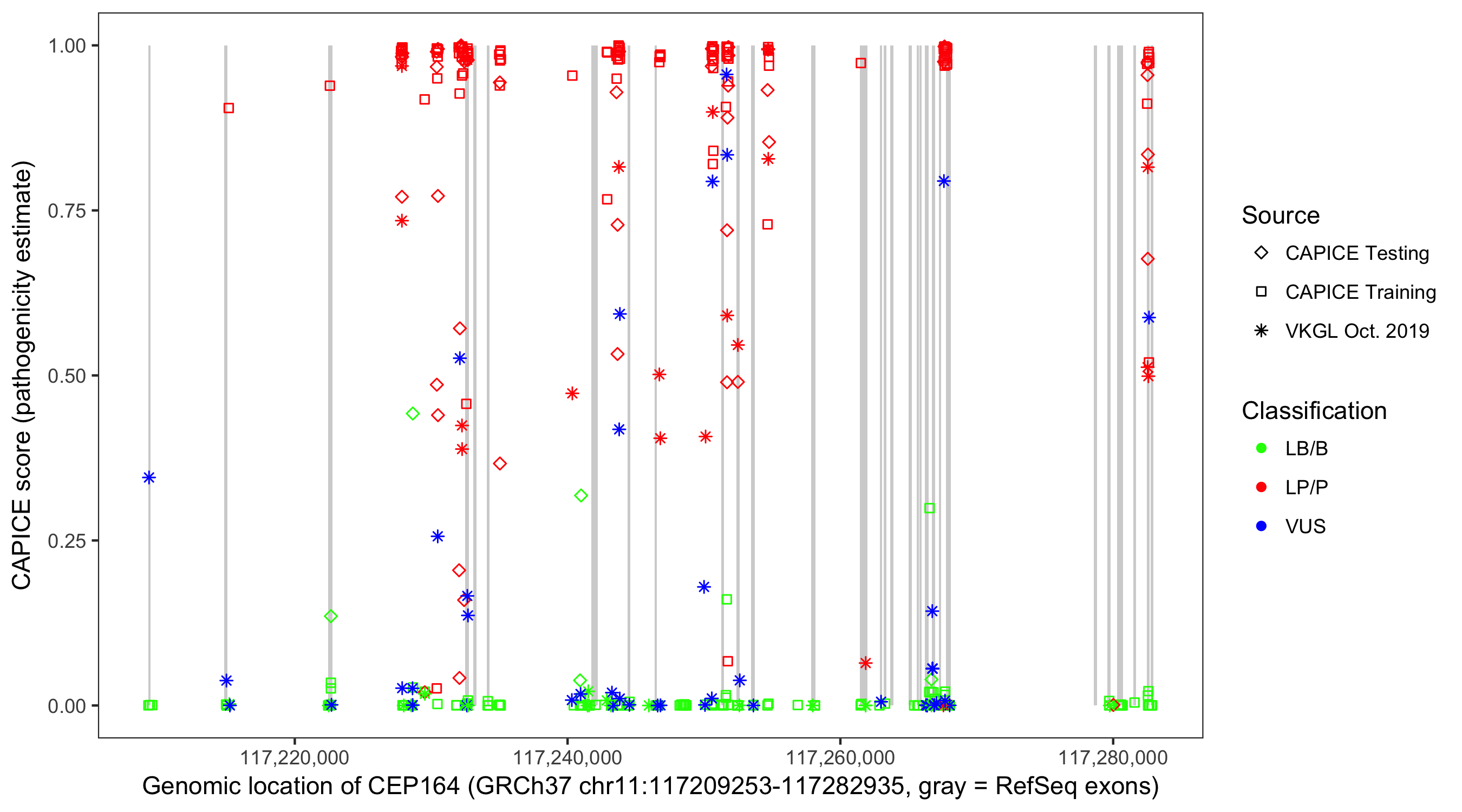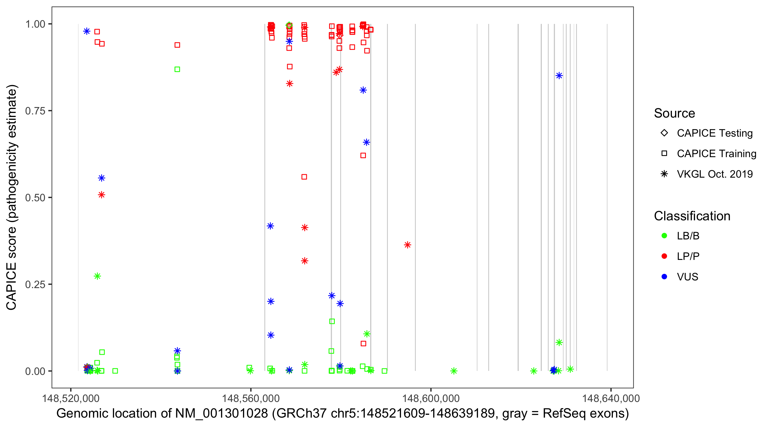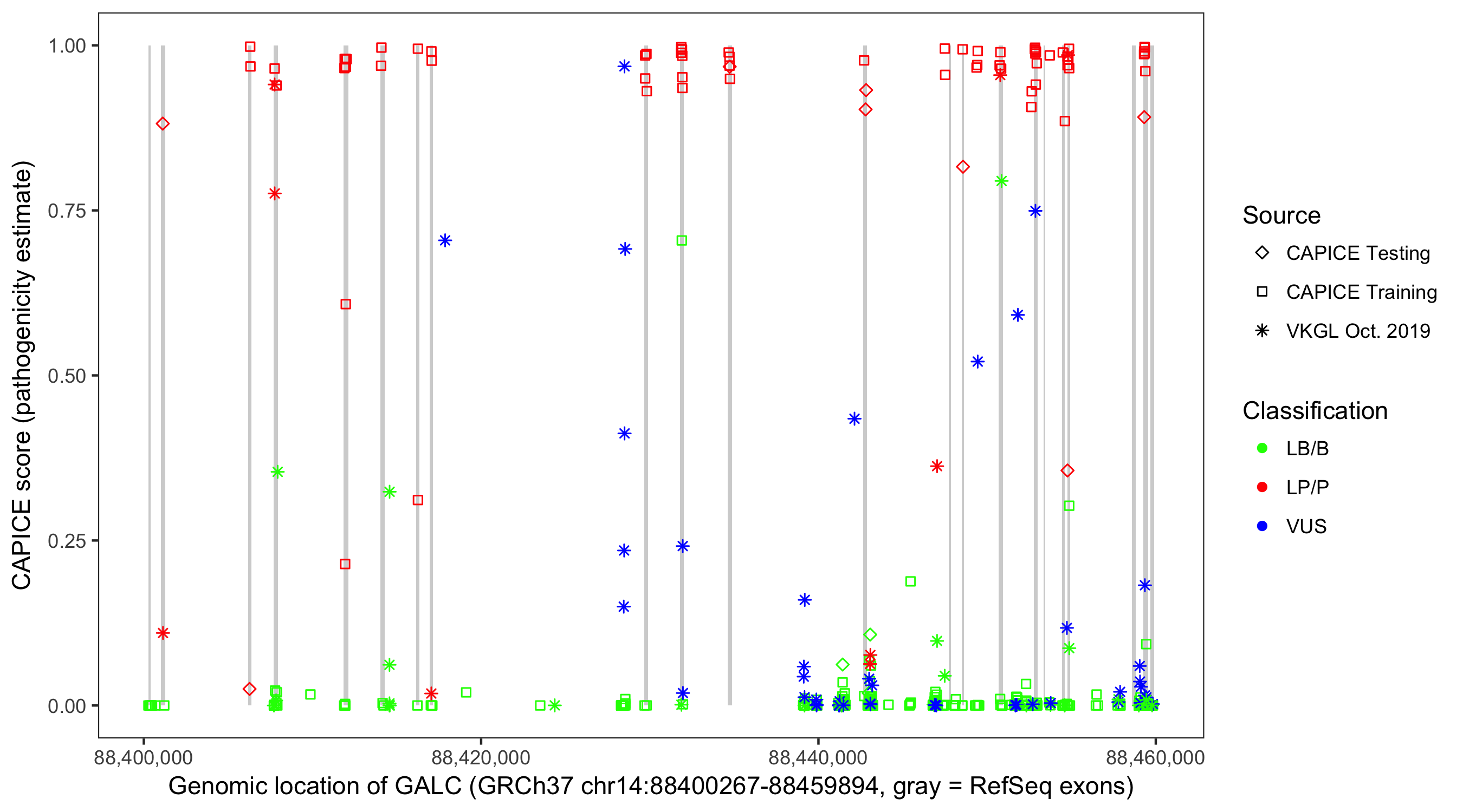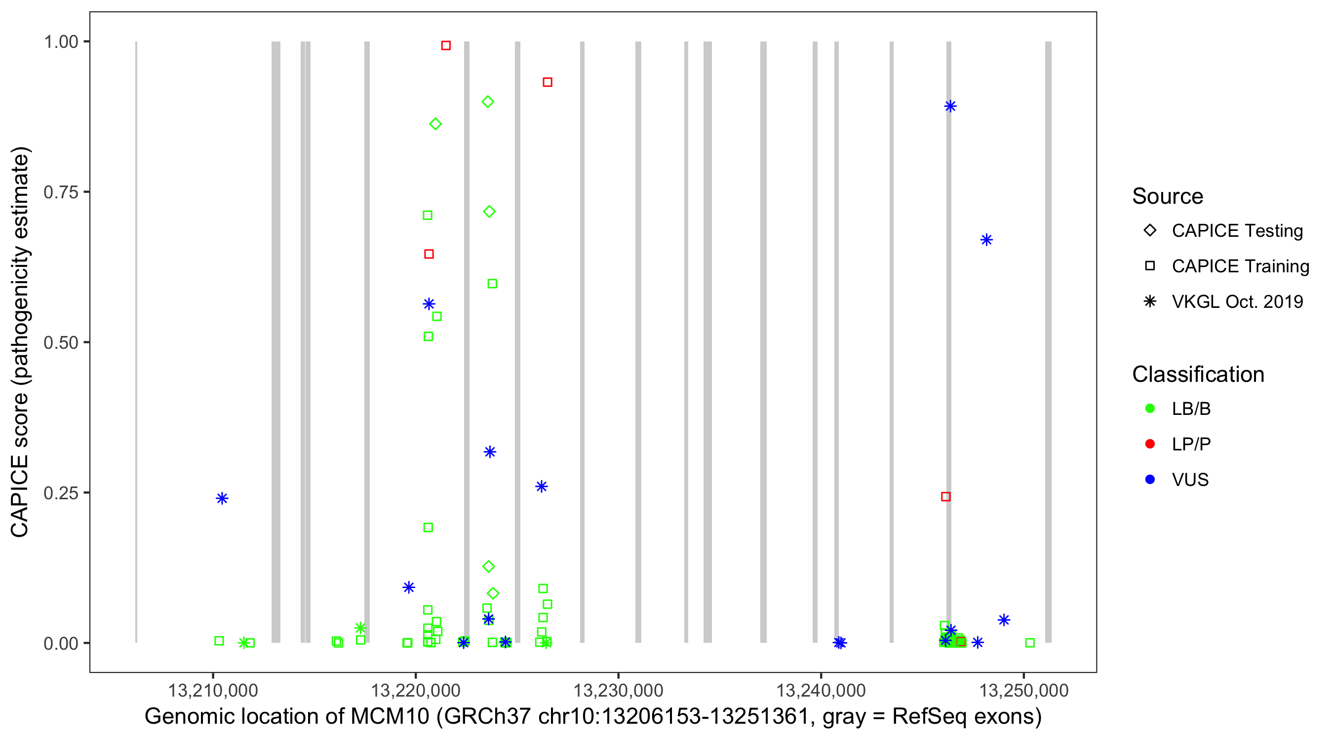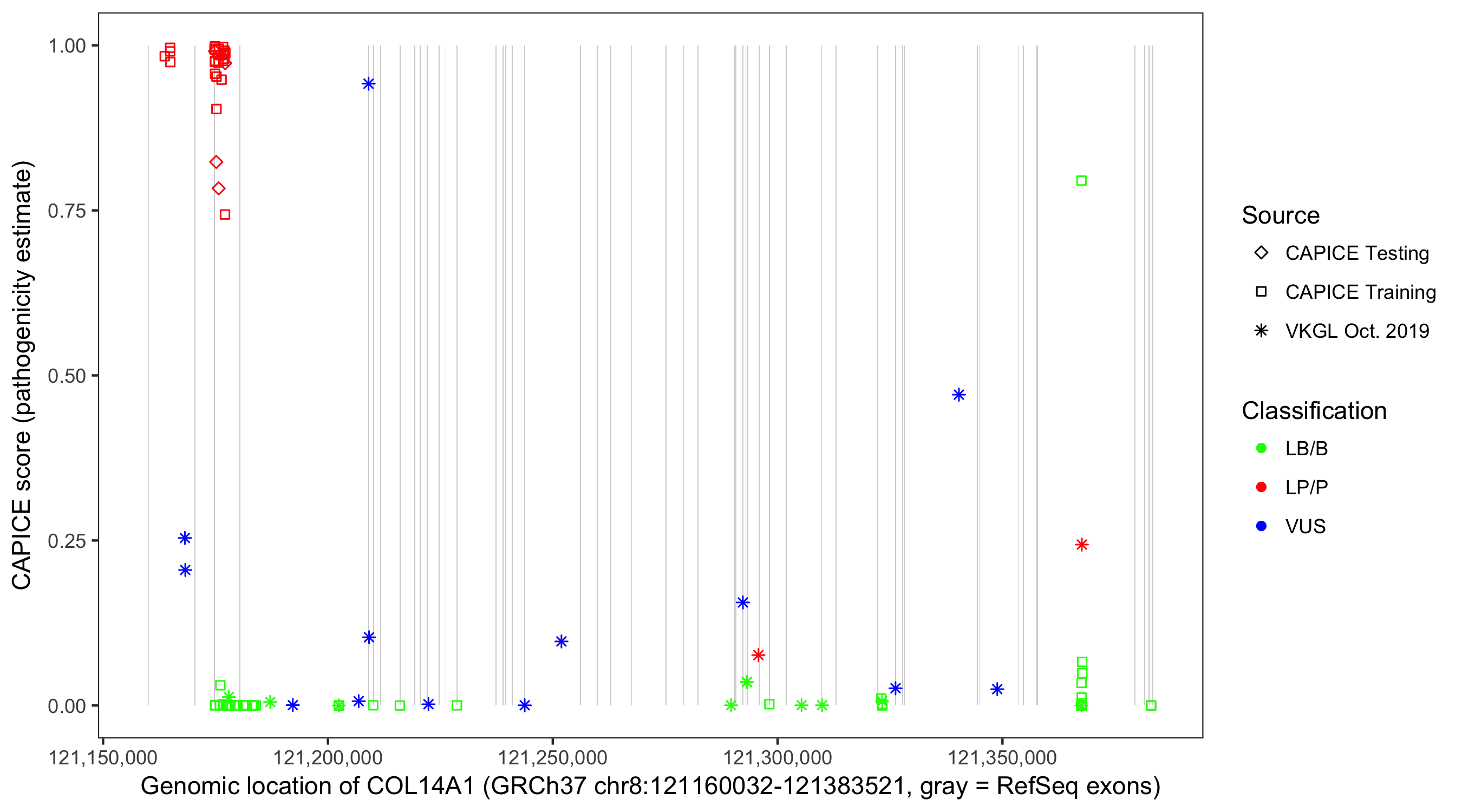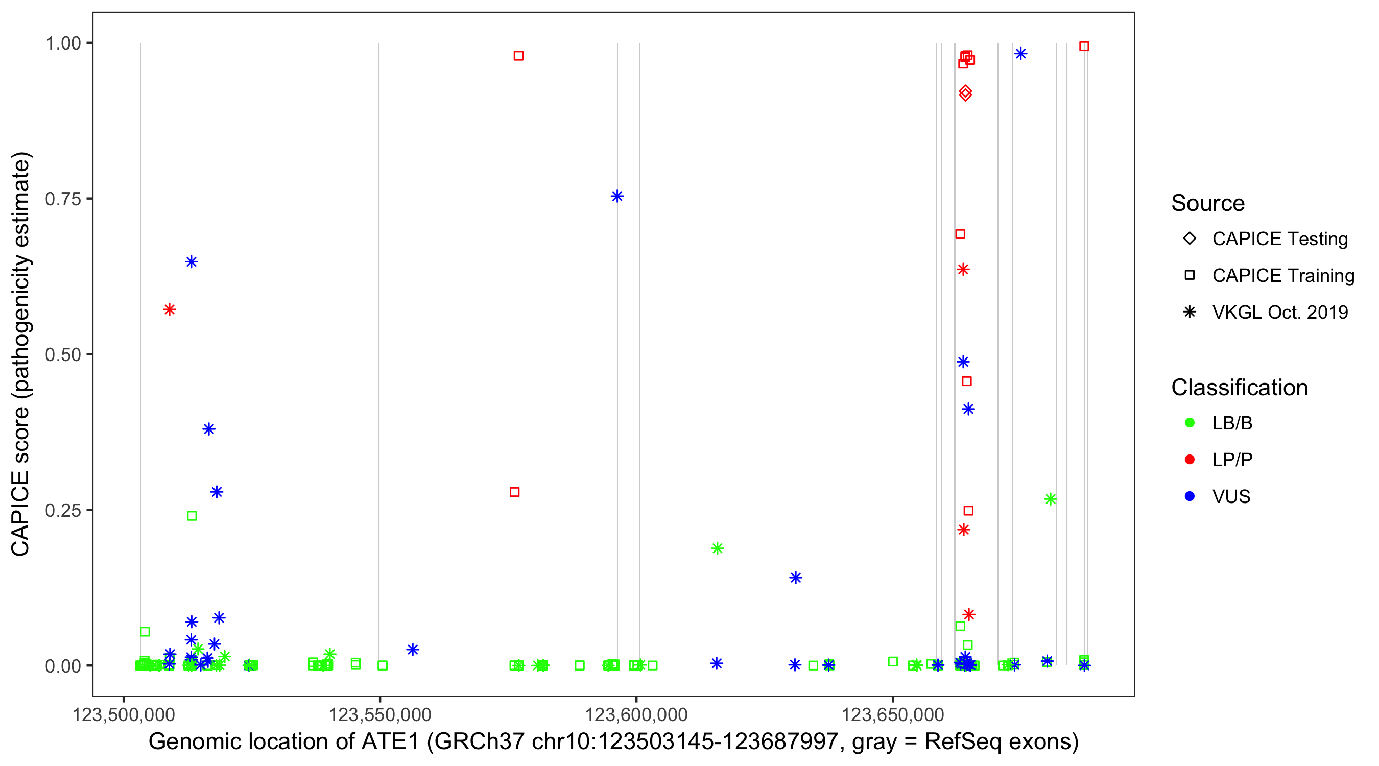 Shown are CAPICE train/test variants plus VKGL Oct 2019.