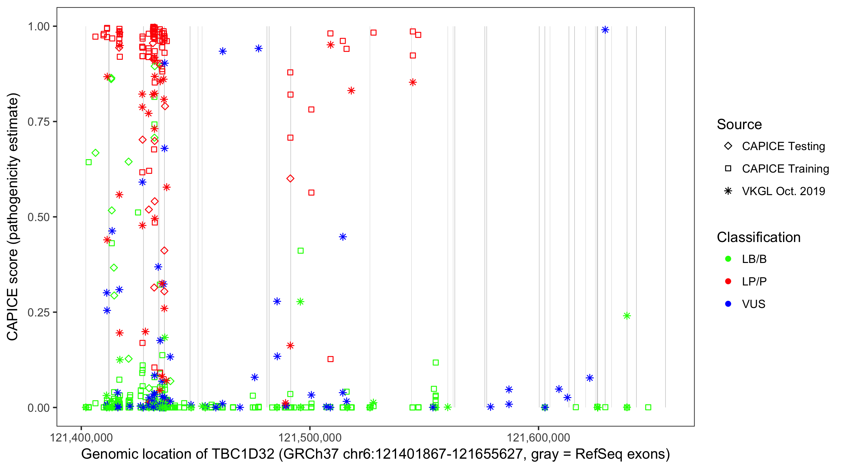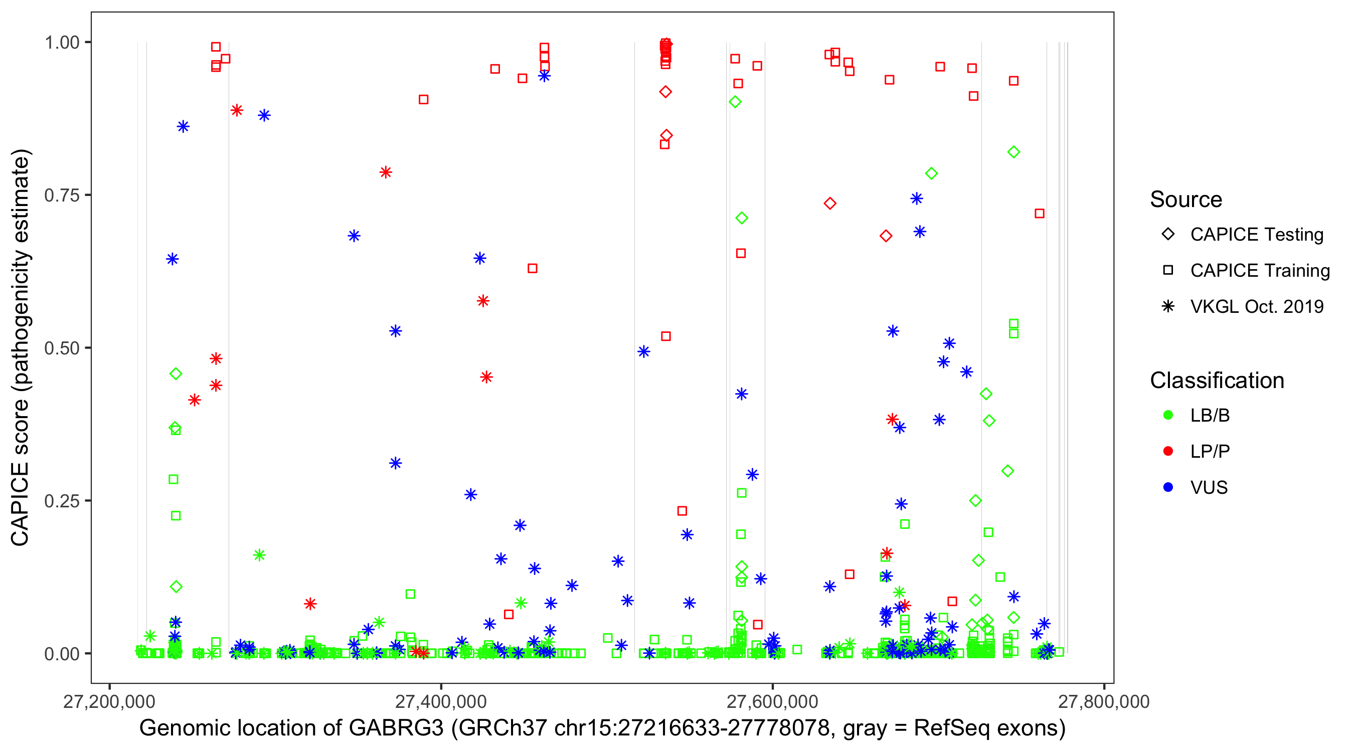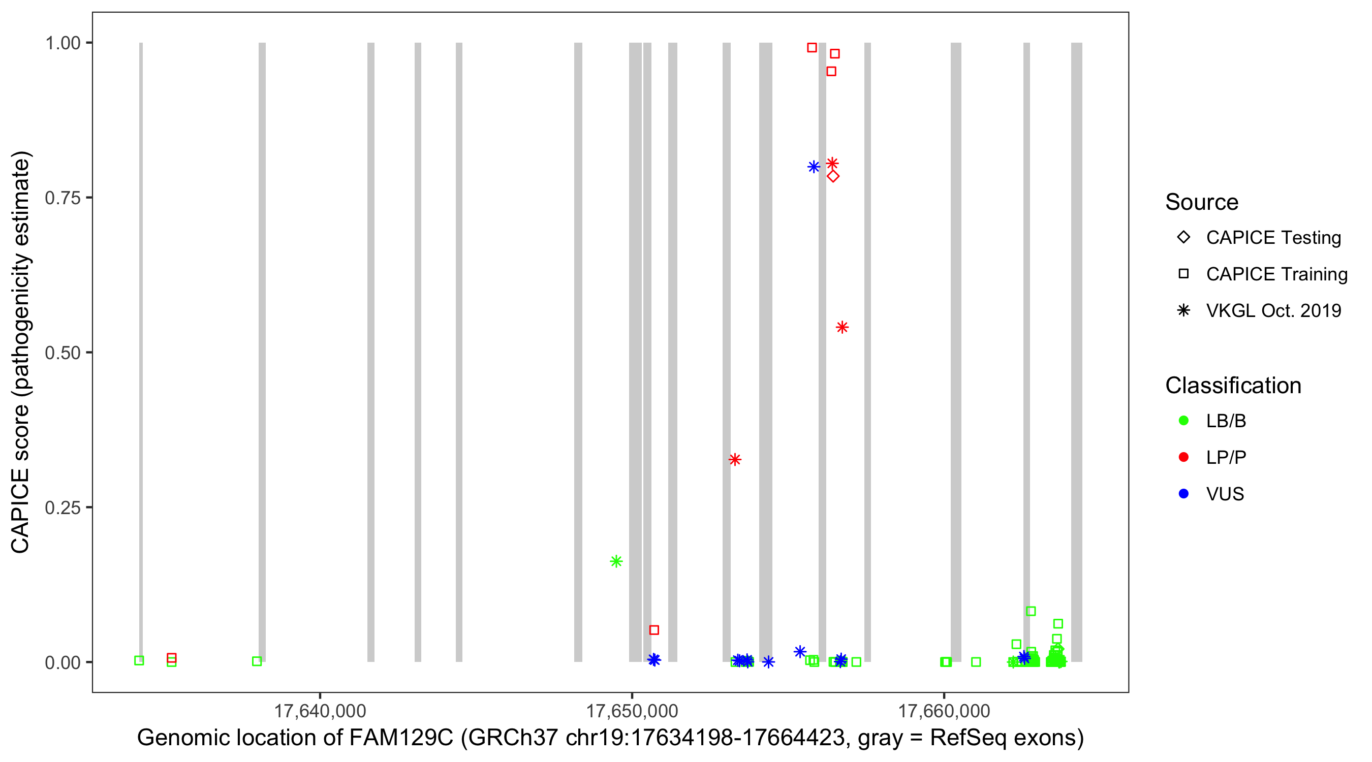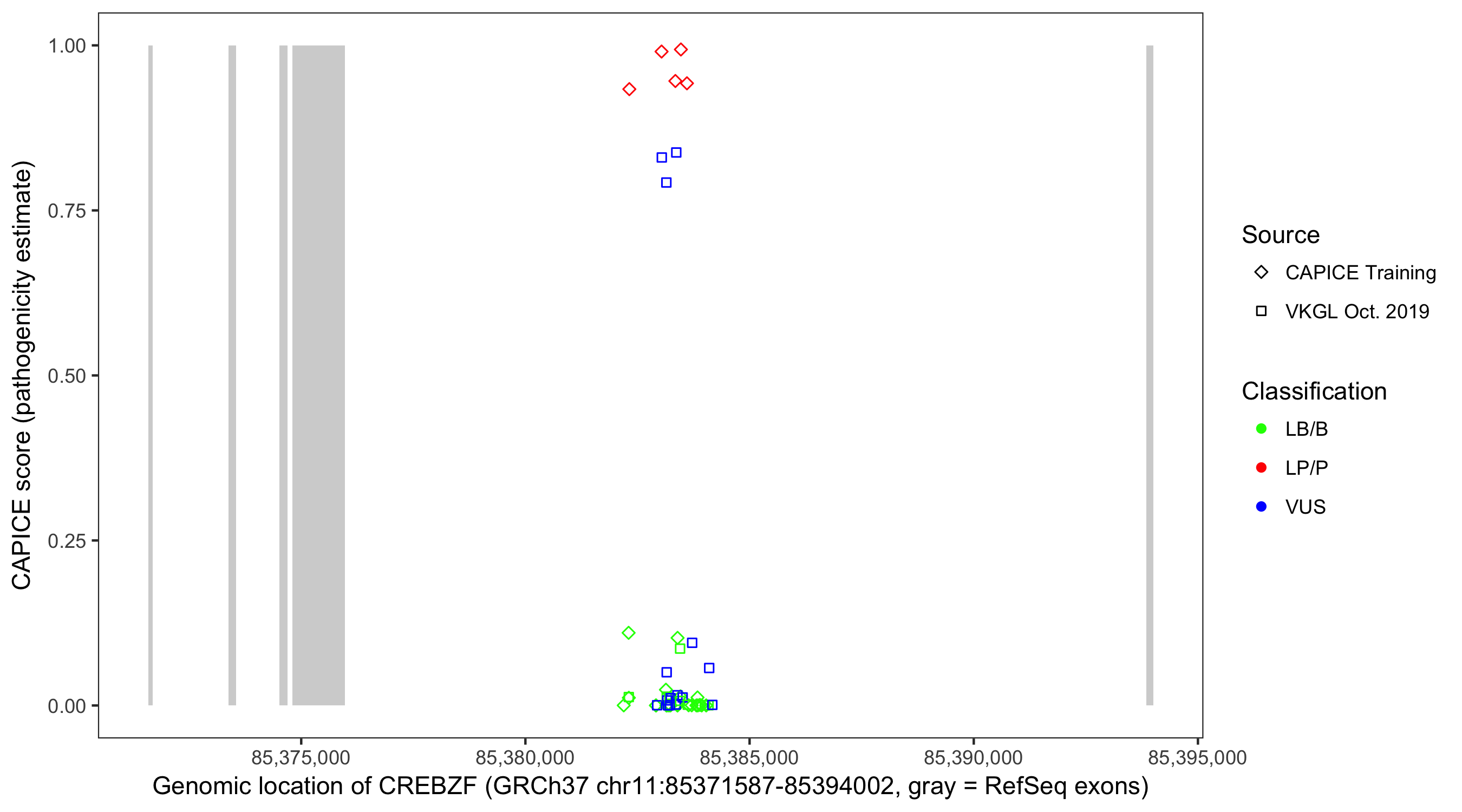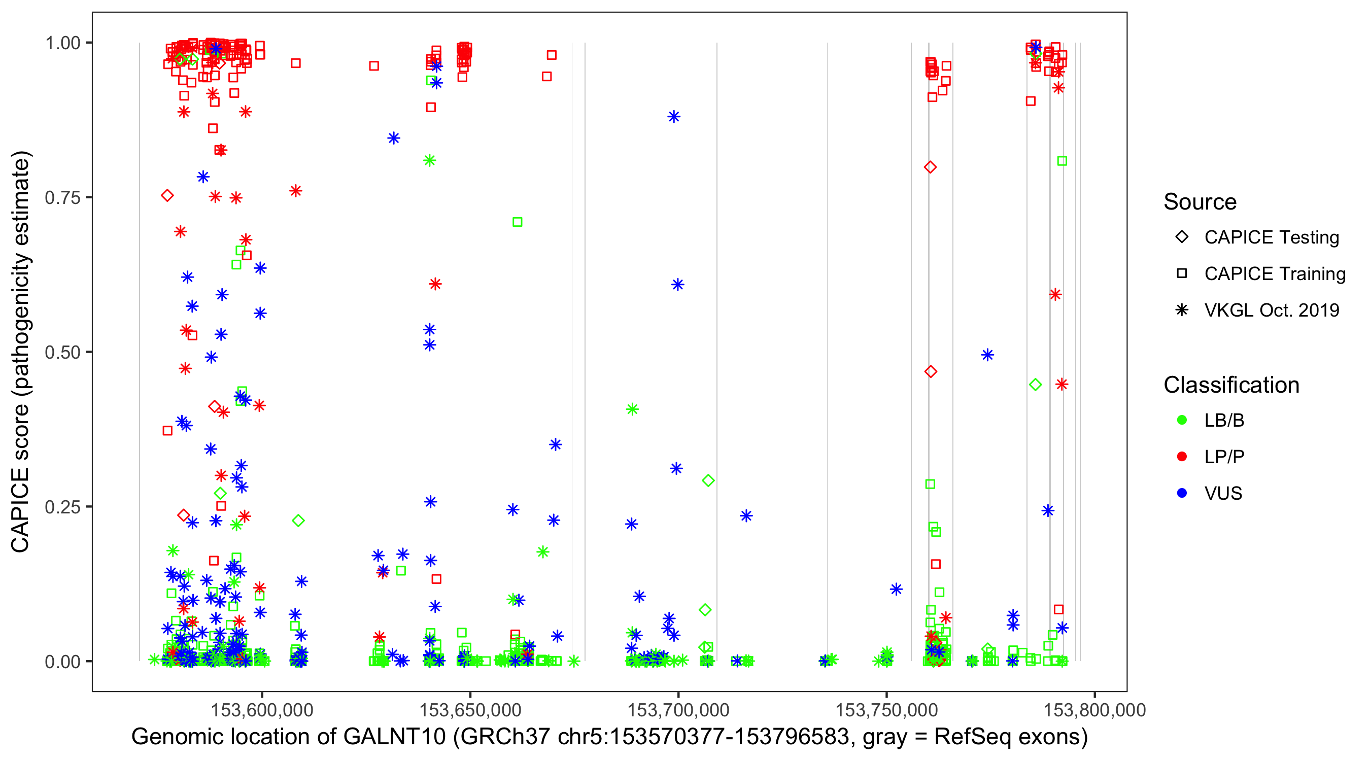 Shown are CAPICE train/test variants plus VKGL Oct 2019.