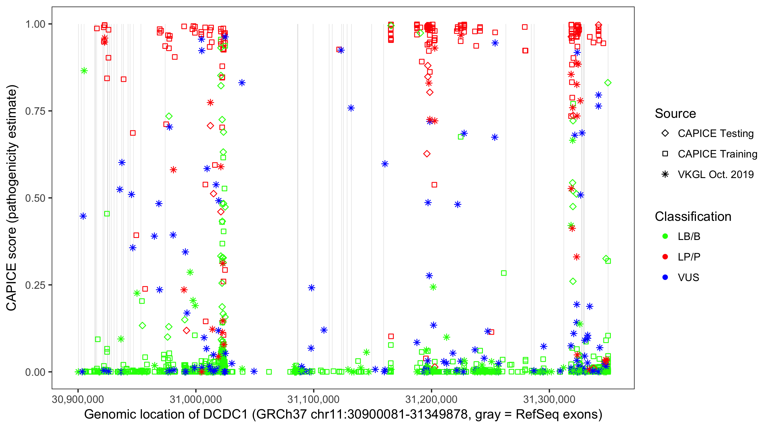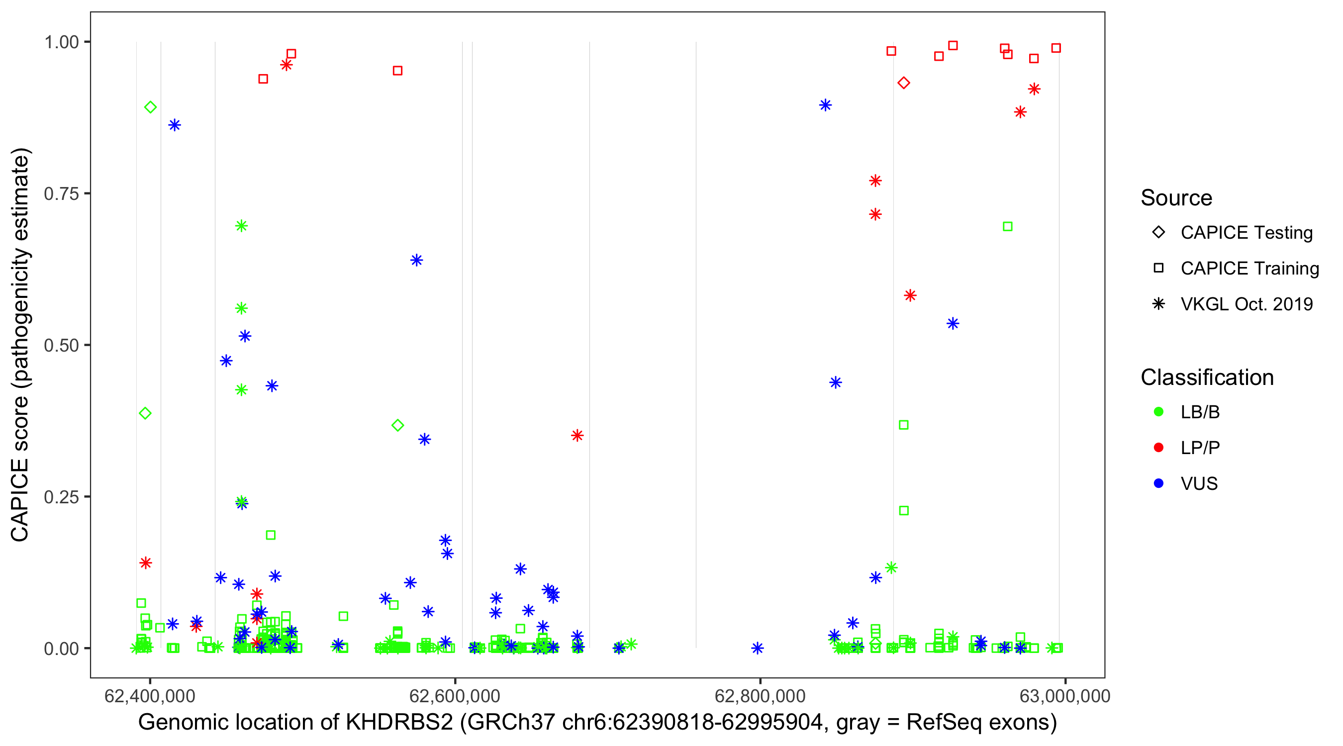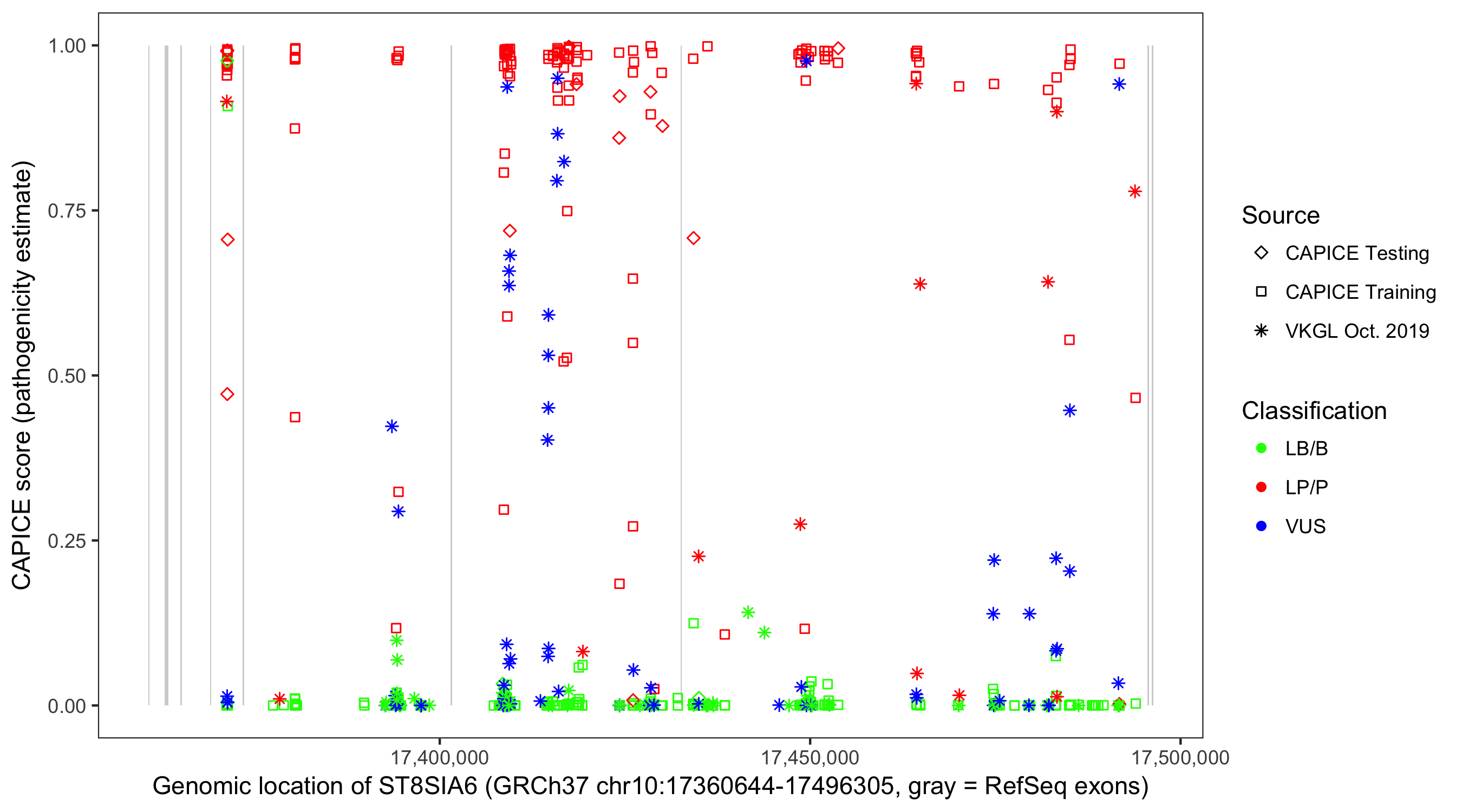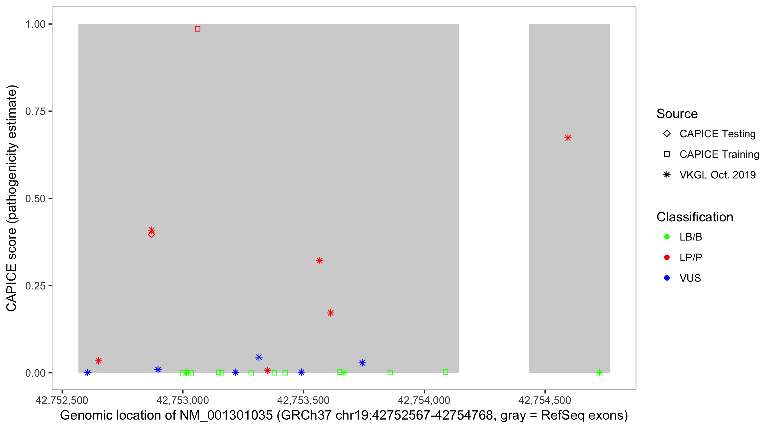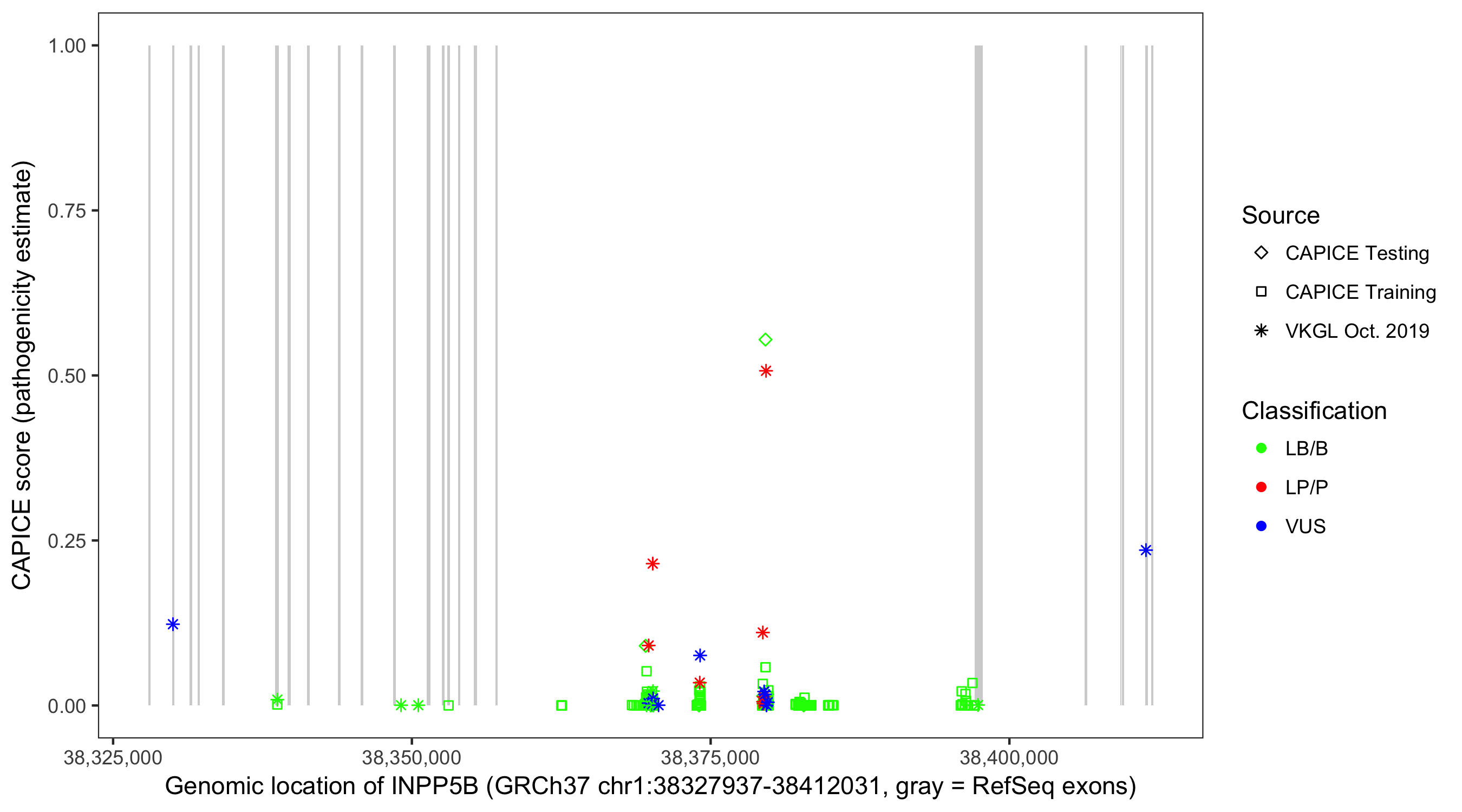 Shown are CAPICE train/test variants plus VKGL Oct 2019.