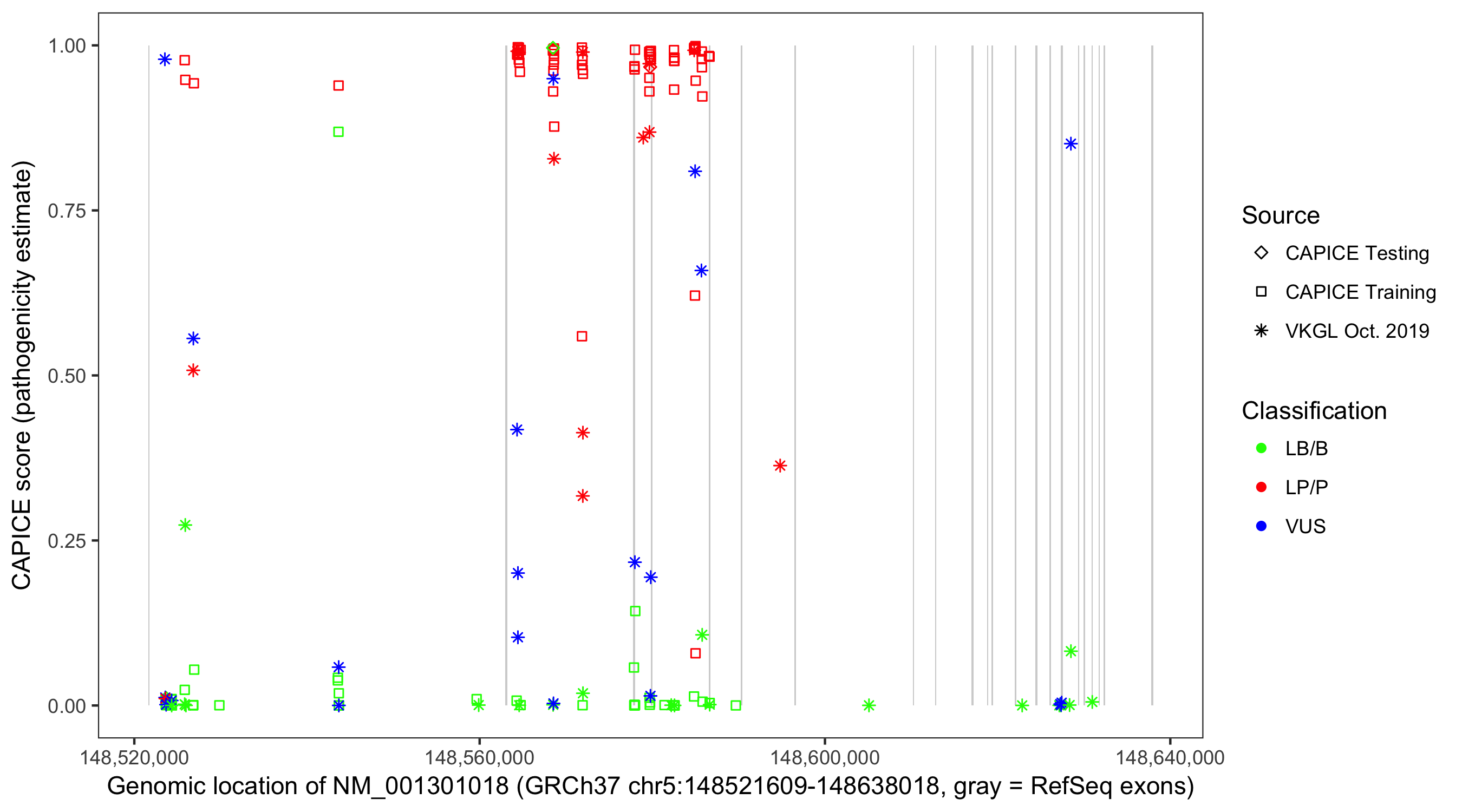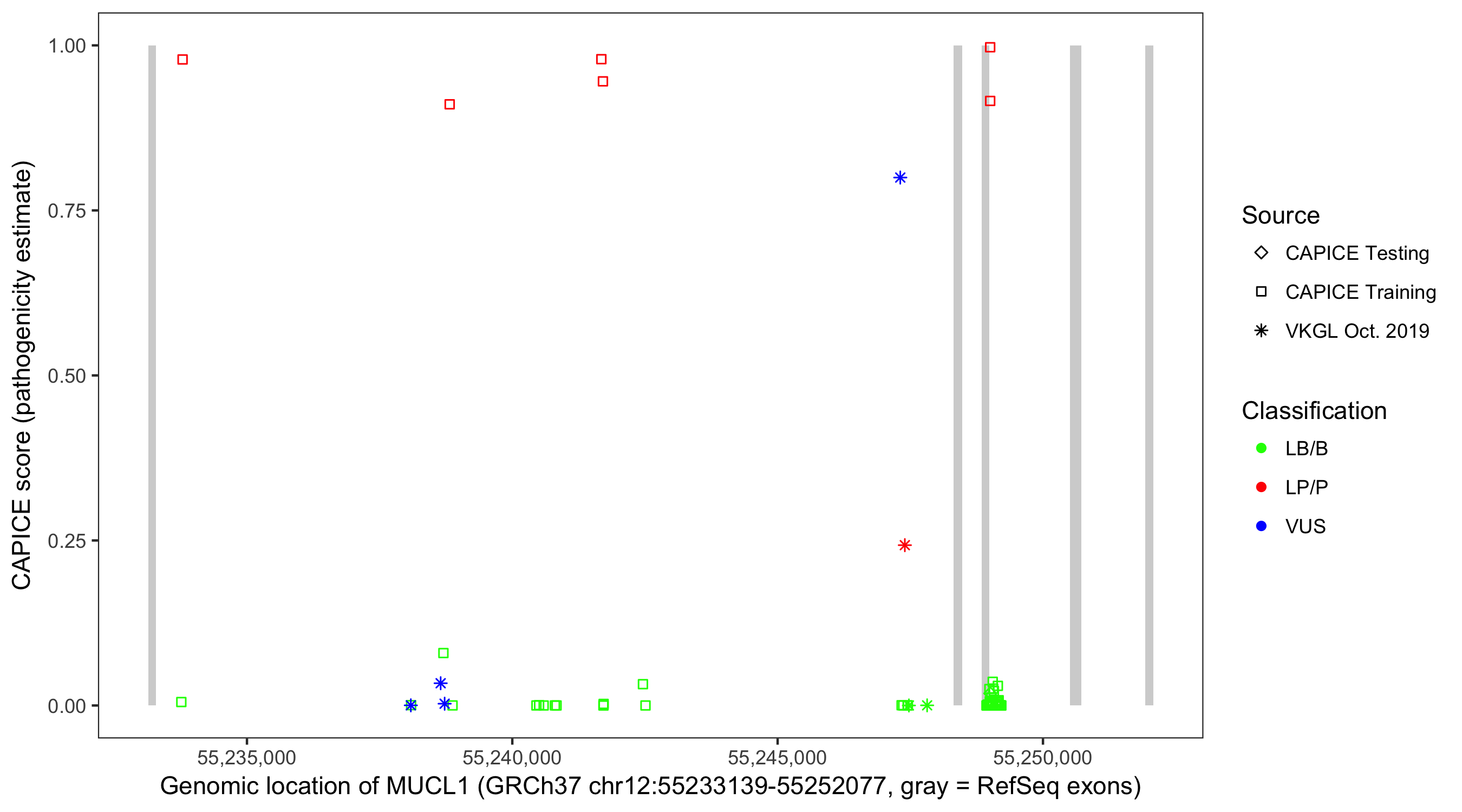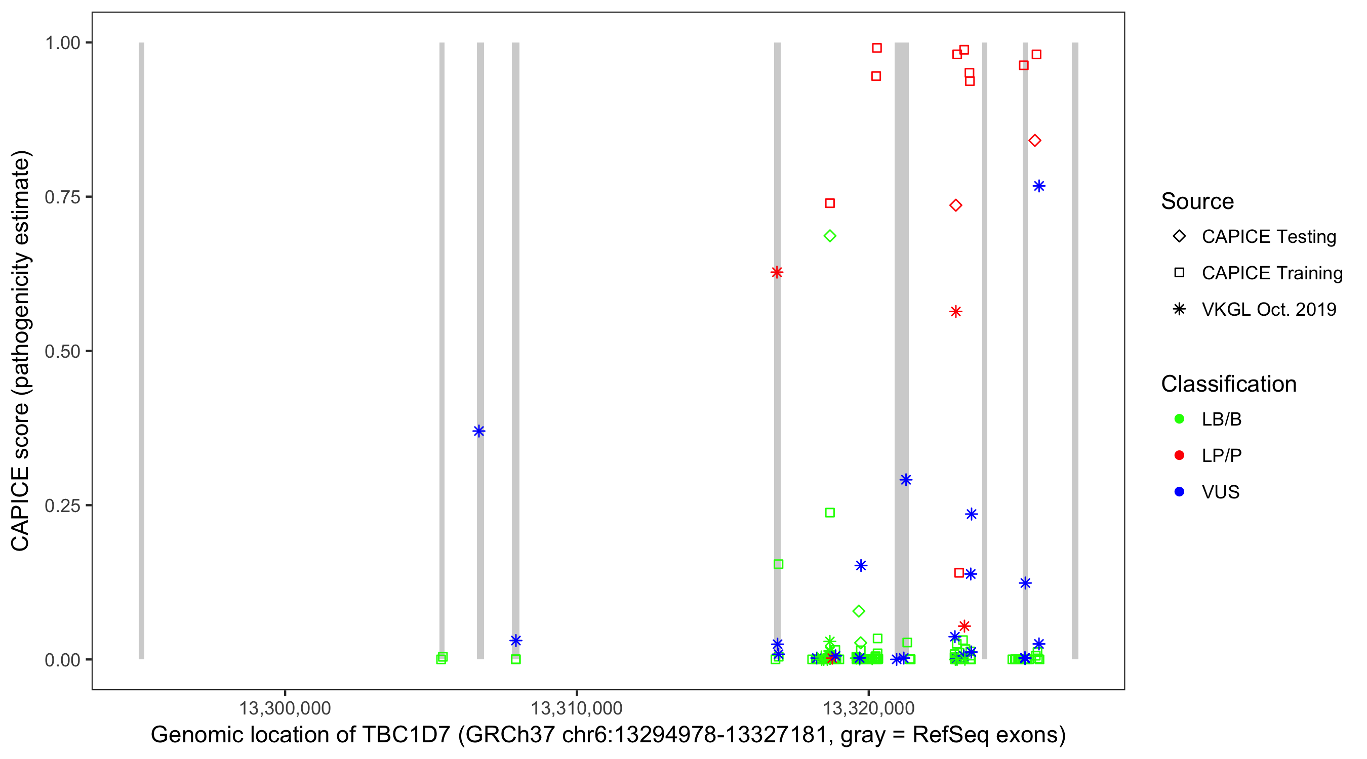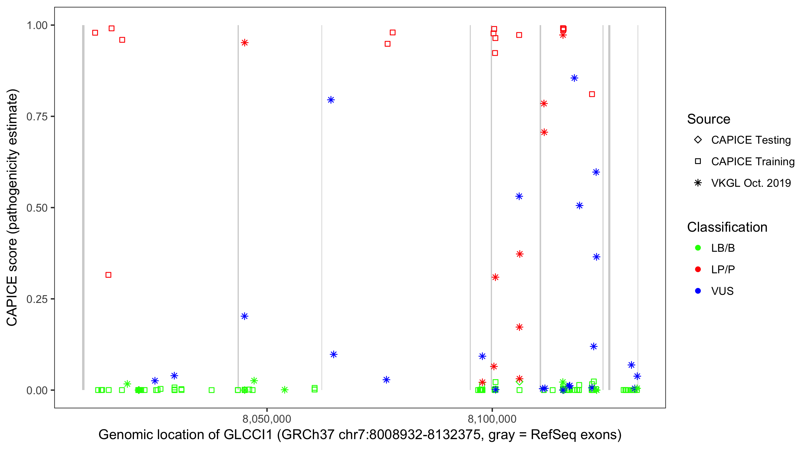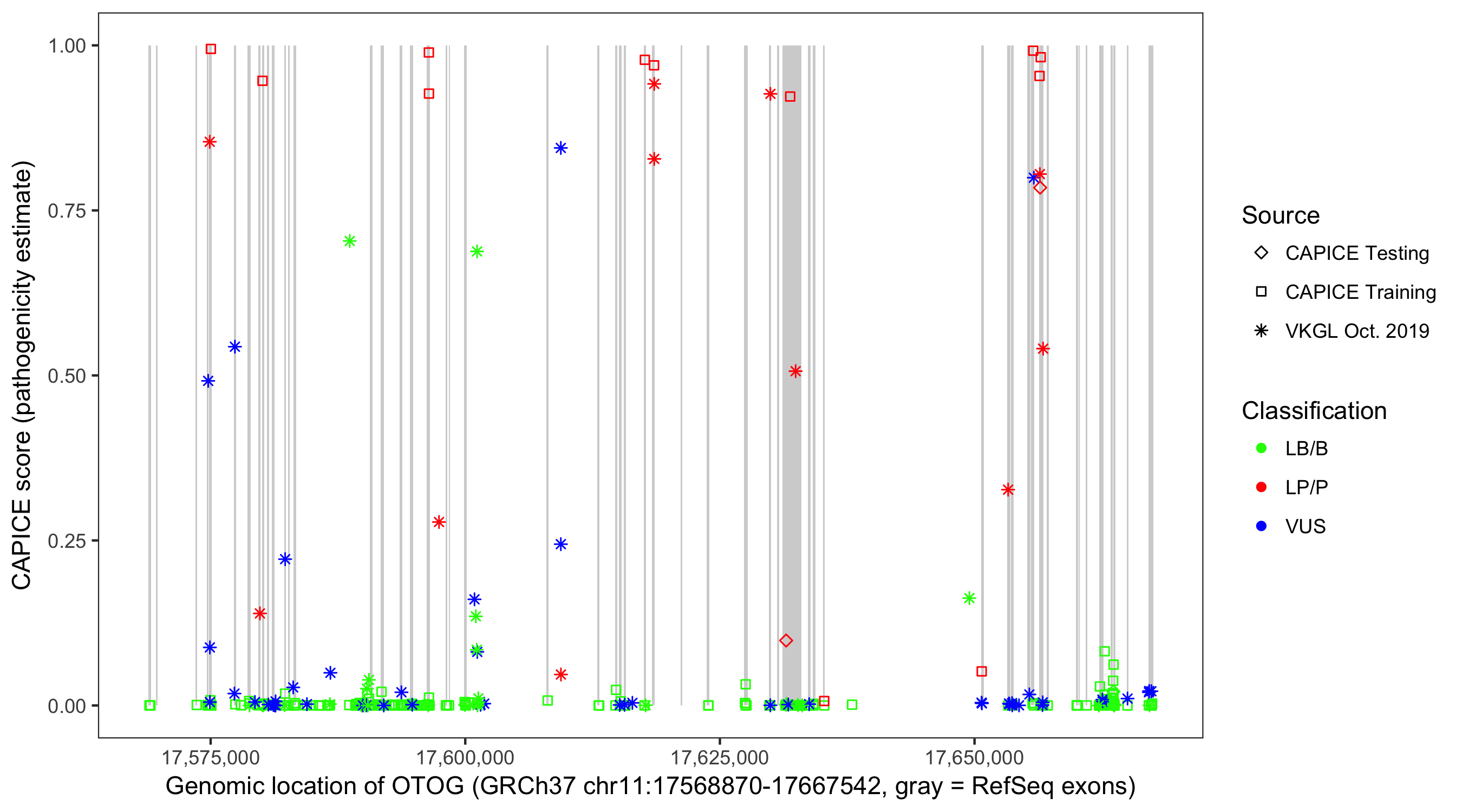 Shown are CAPICE train/test variants plus VKGL Oct 2019.