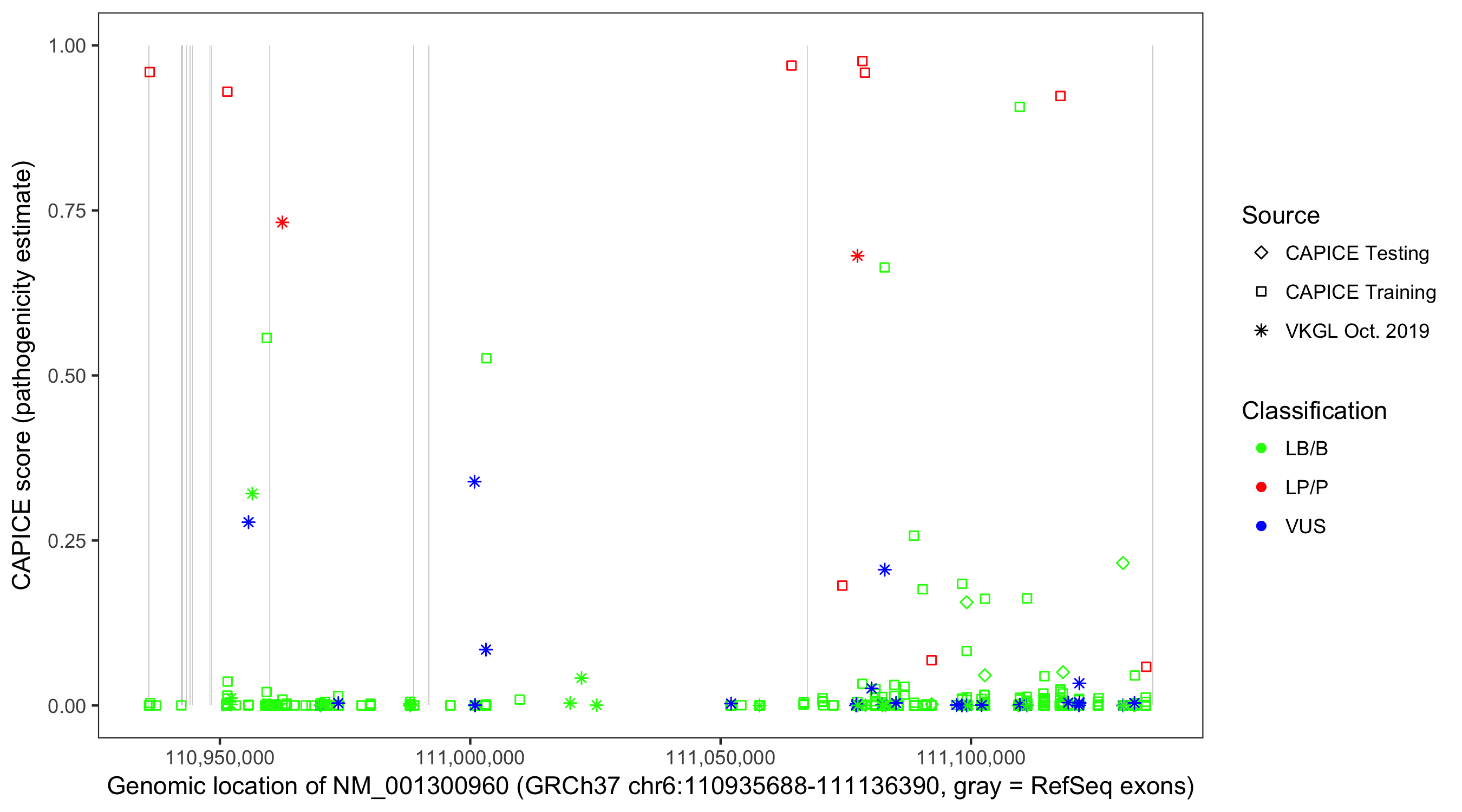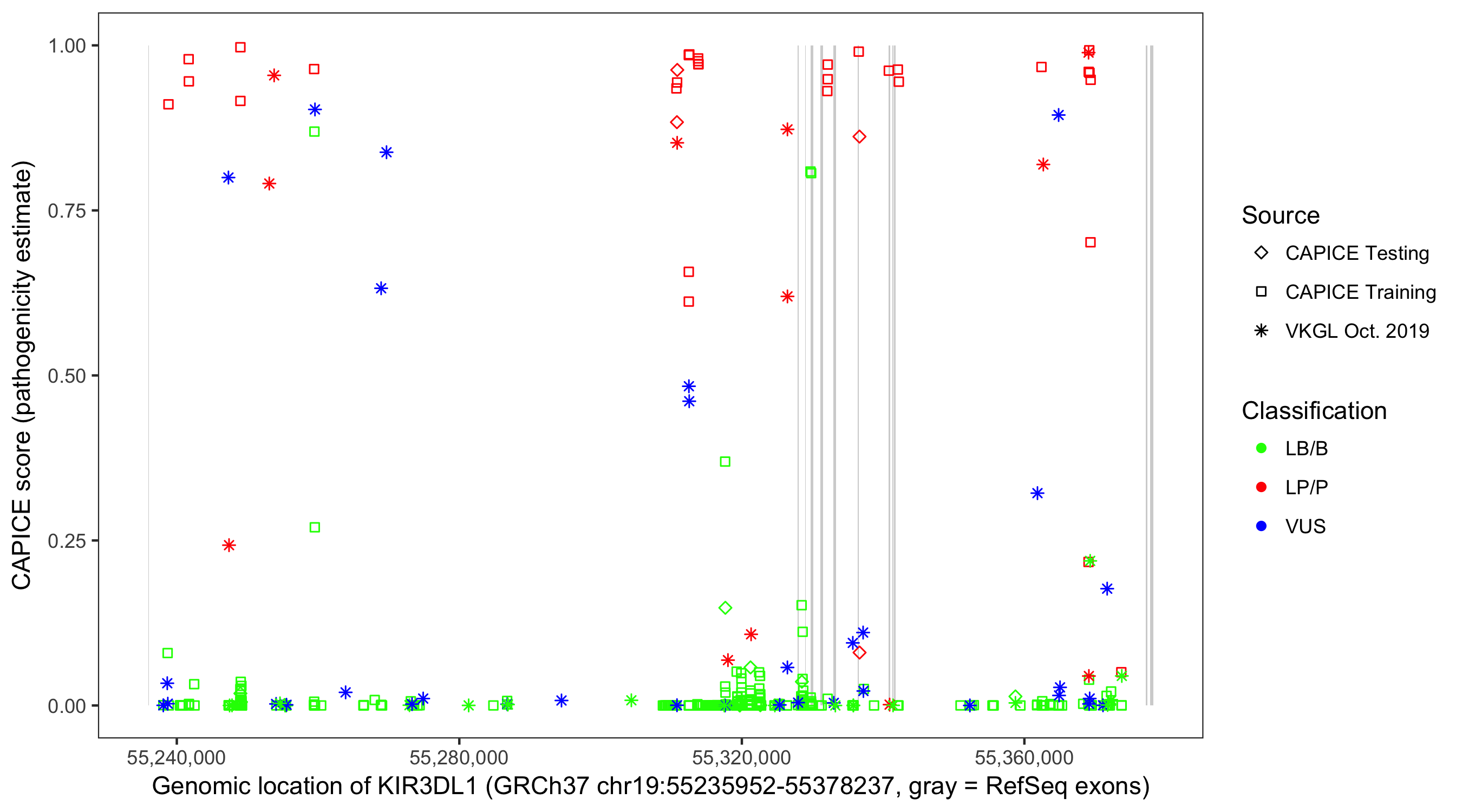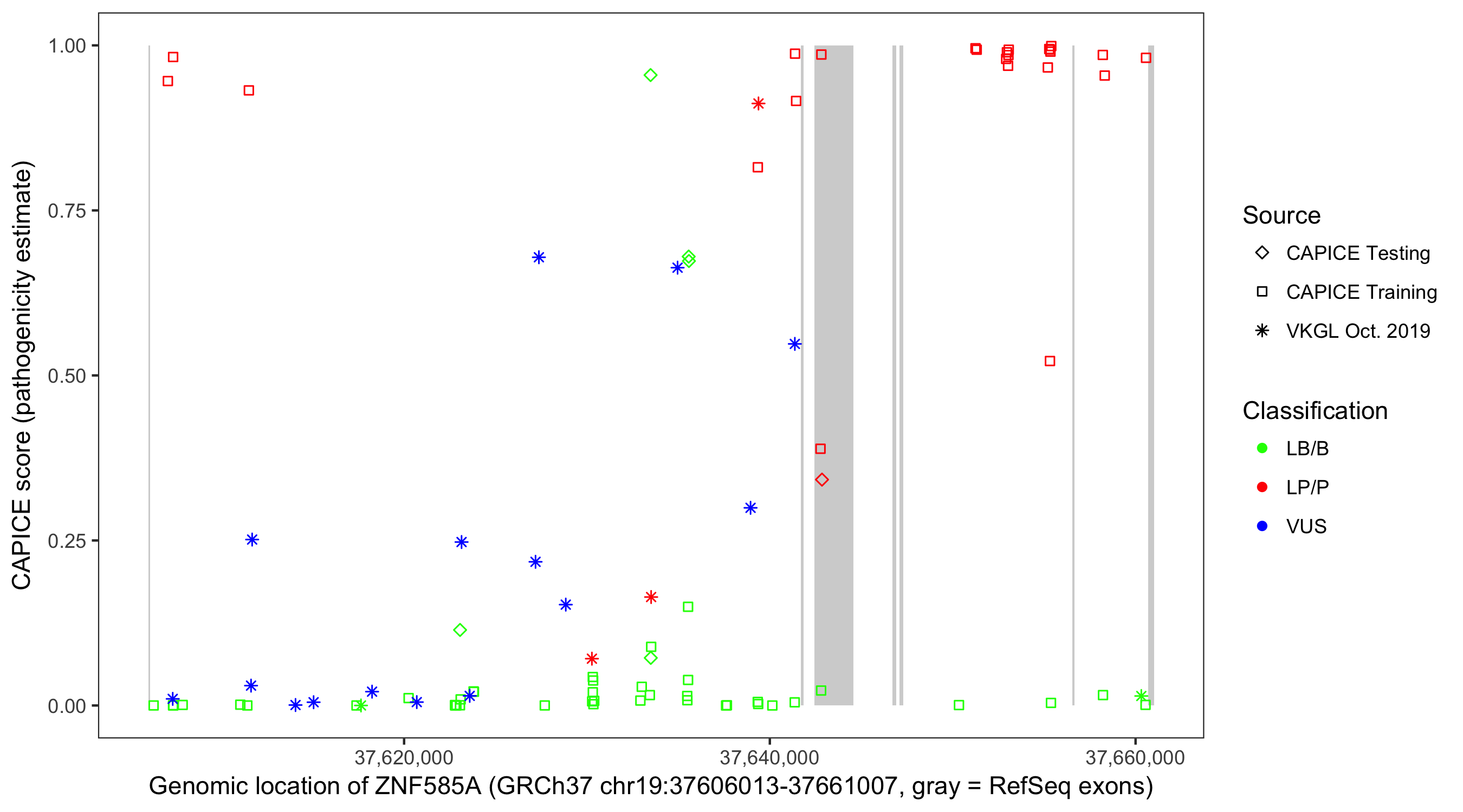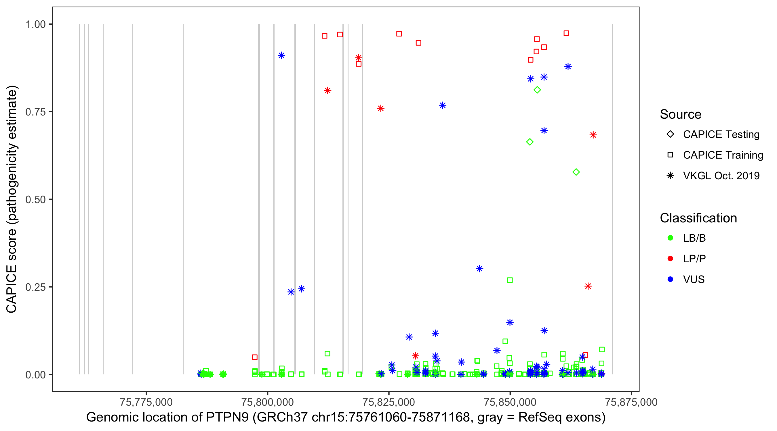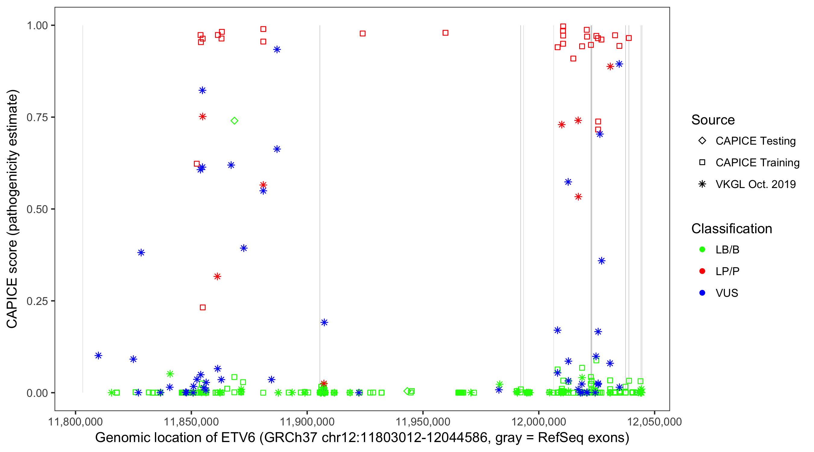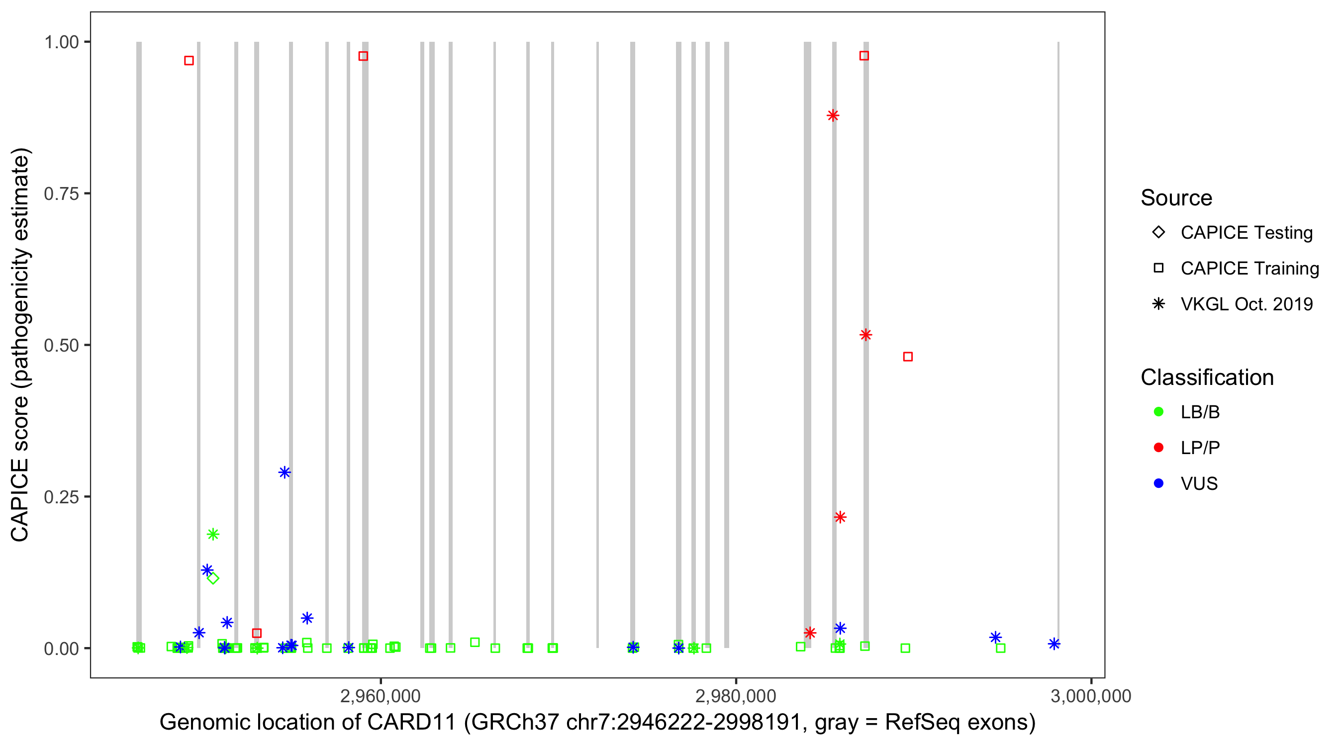Shown are CAPICE train/test variants plus VKGL Oct 2019.