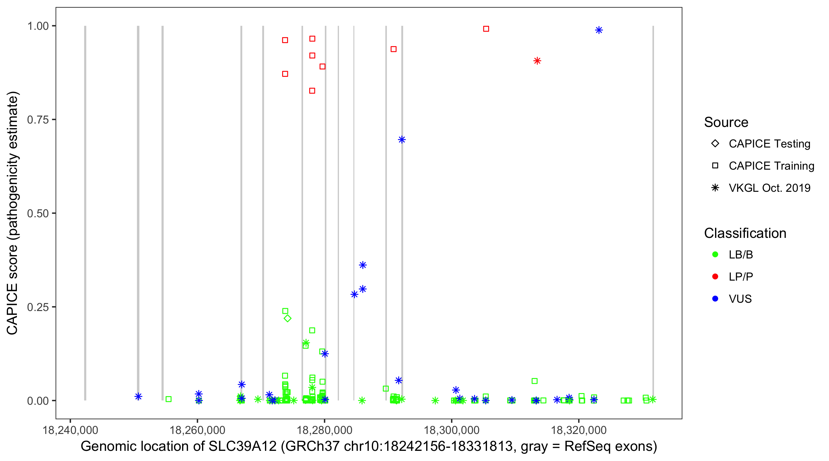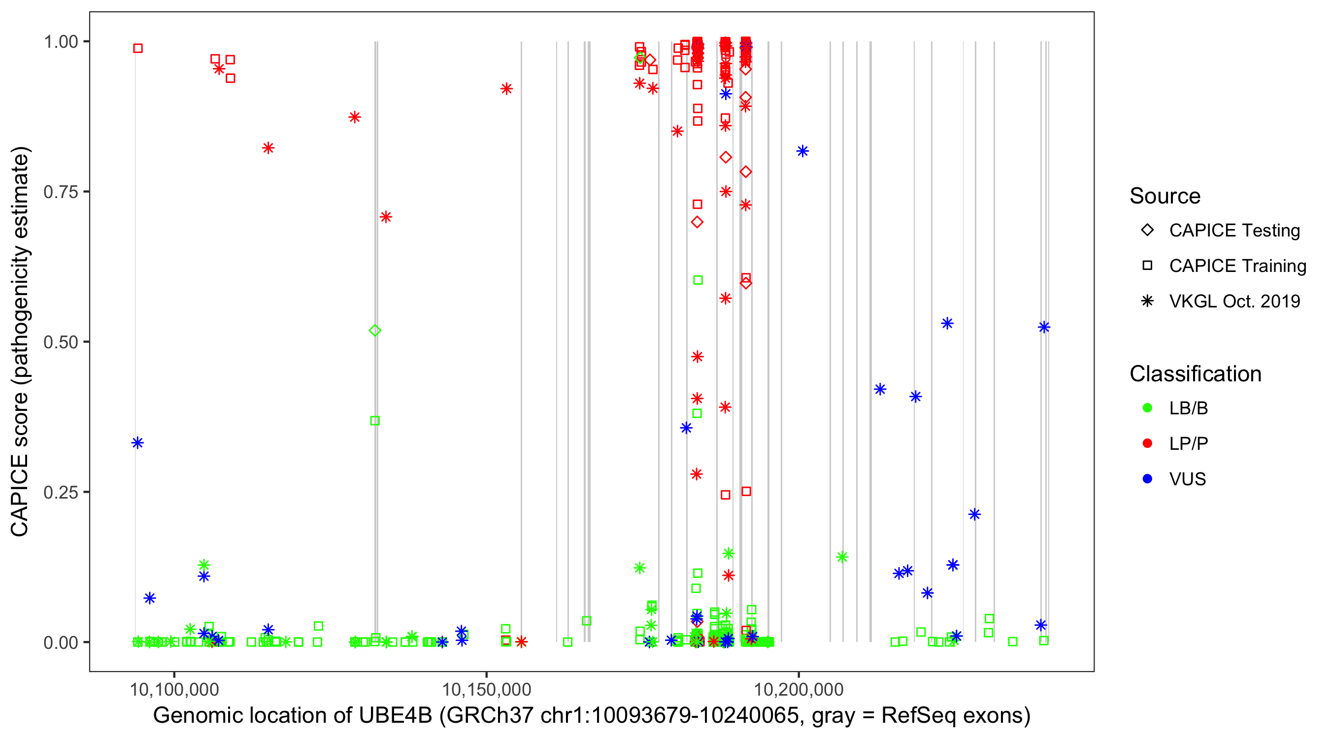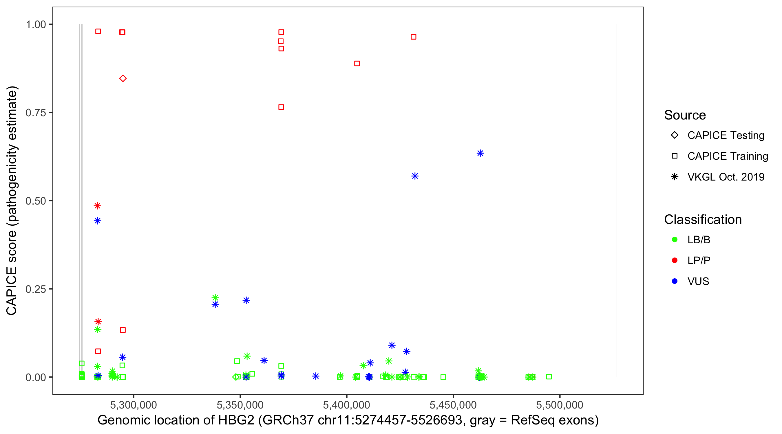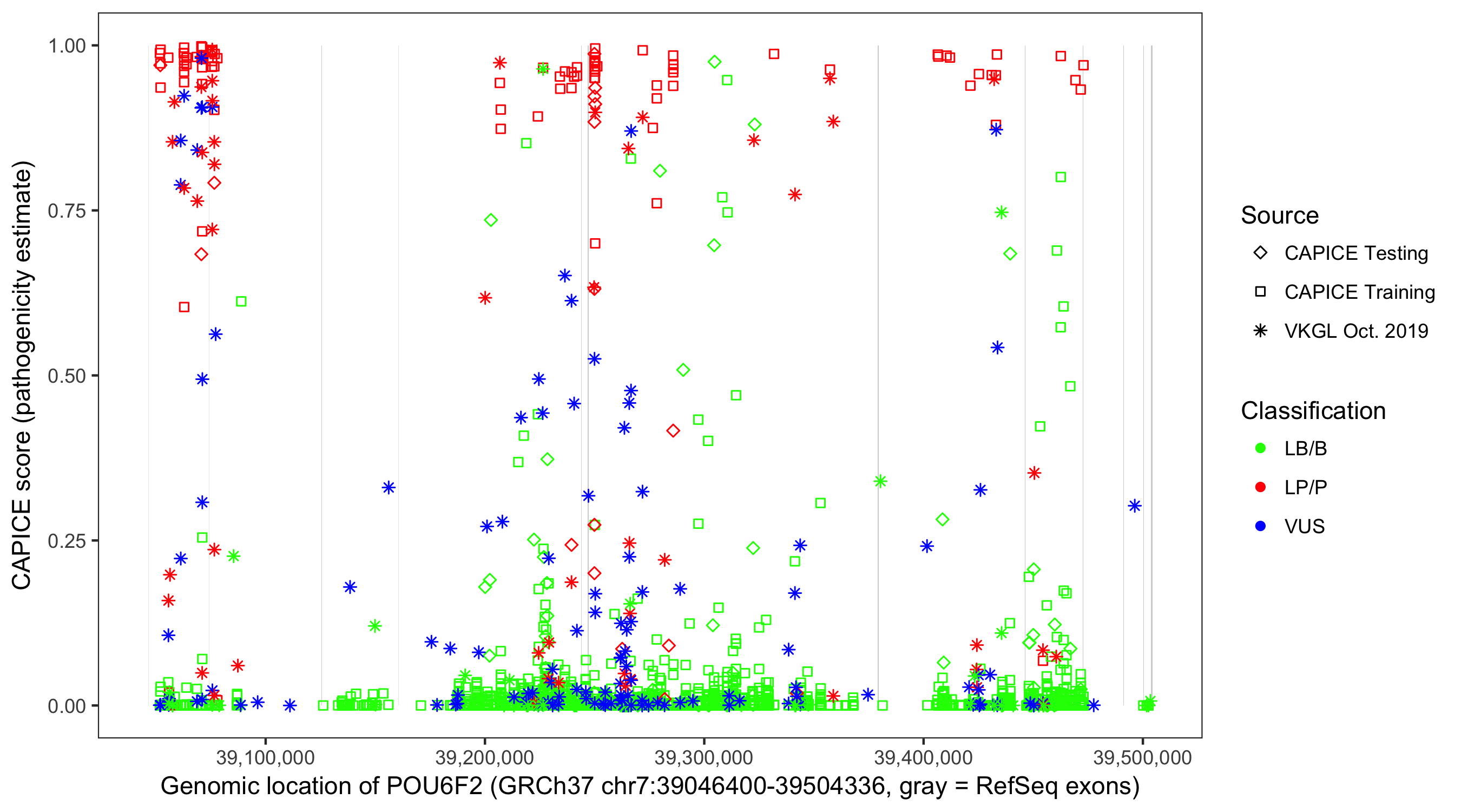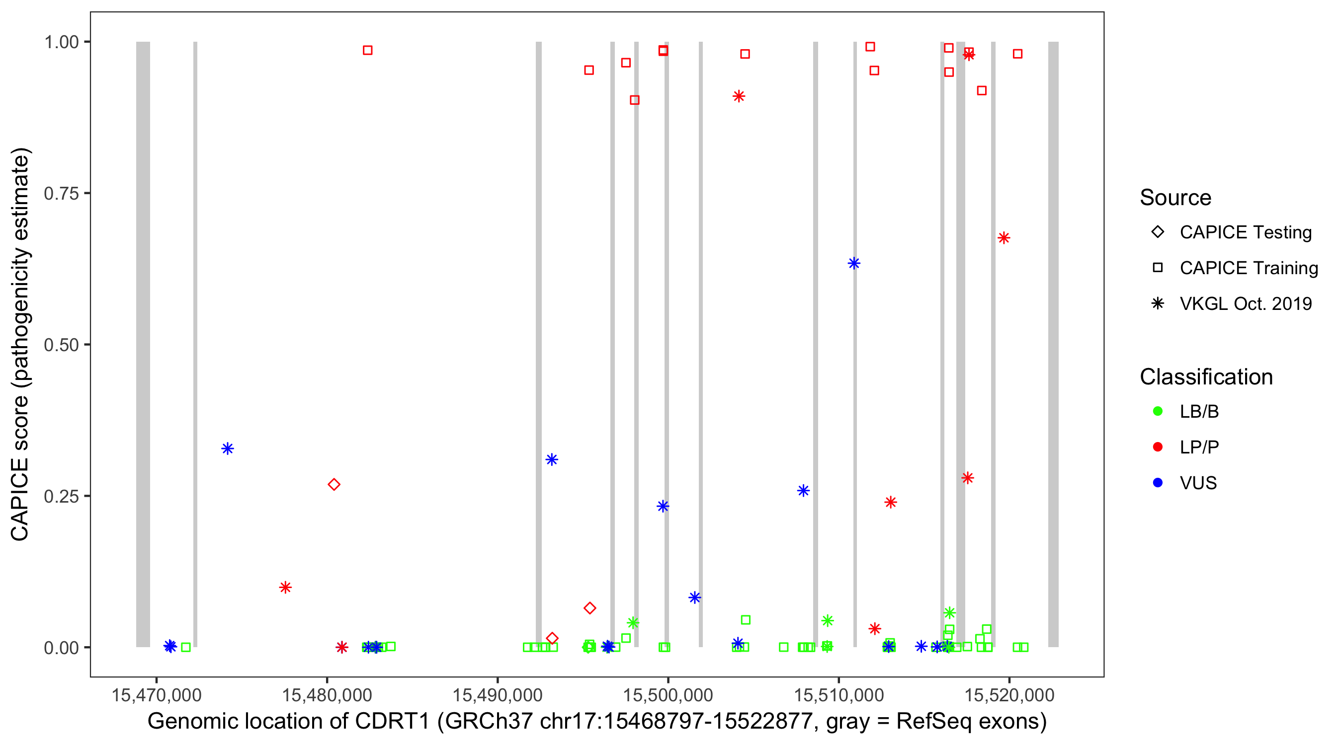 Shown are CAPICE train/test variants plus VKGL Oct 2019.