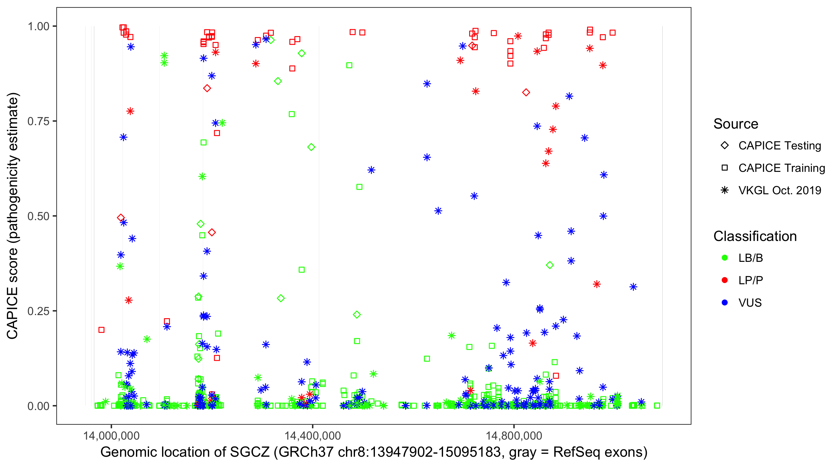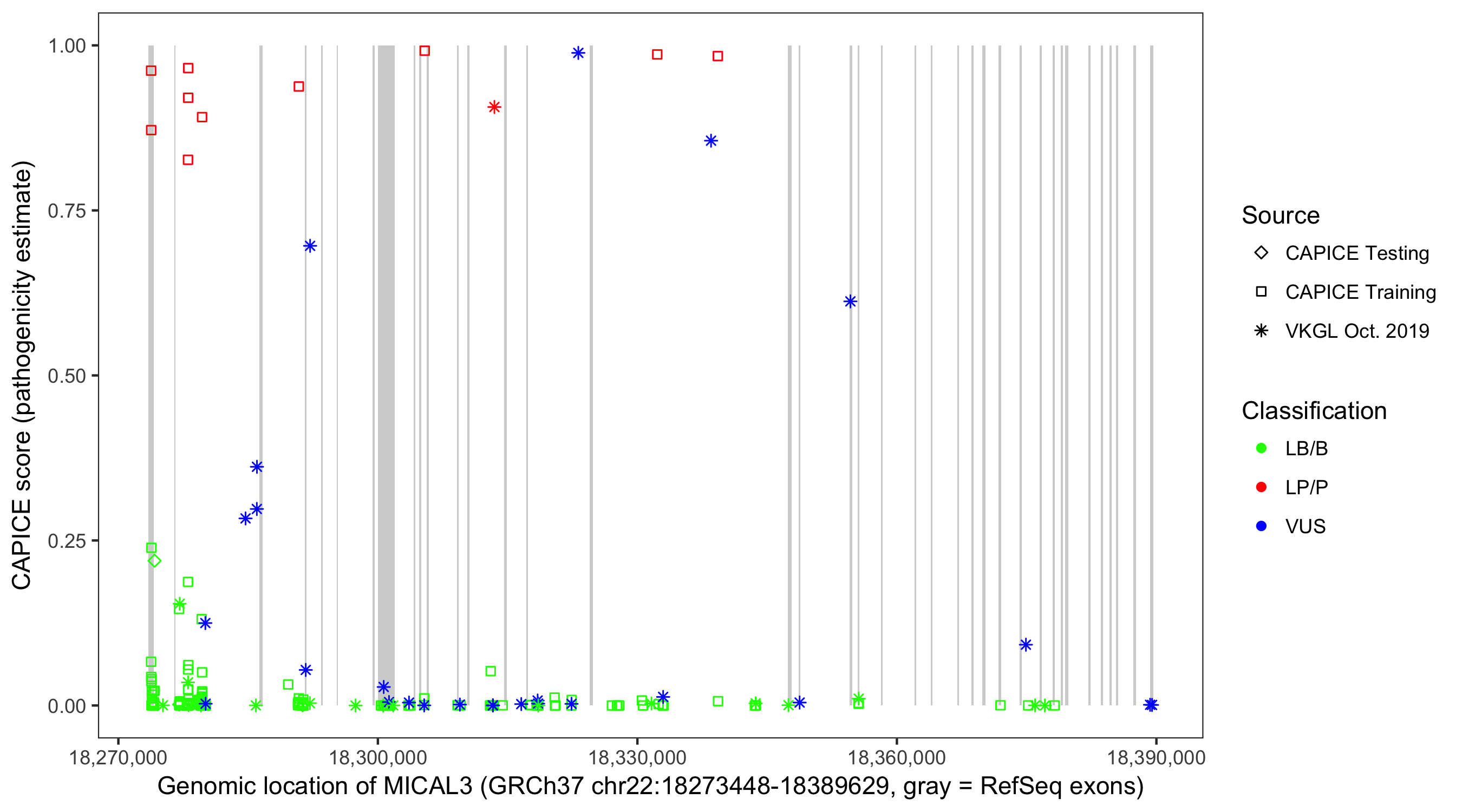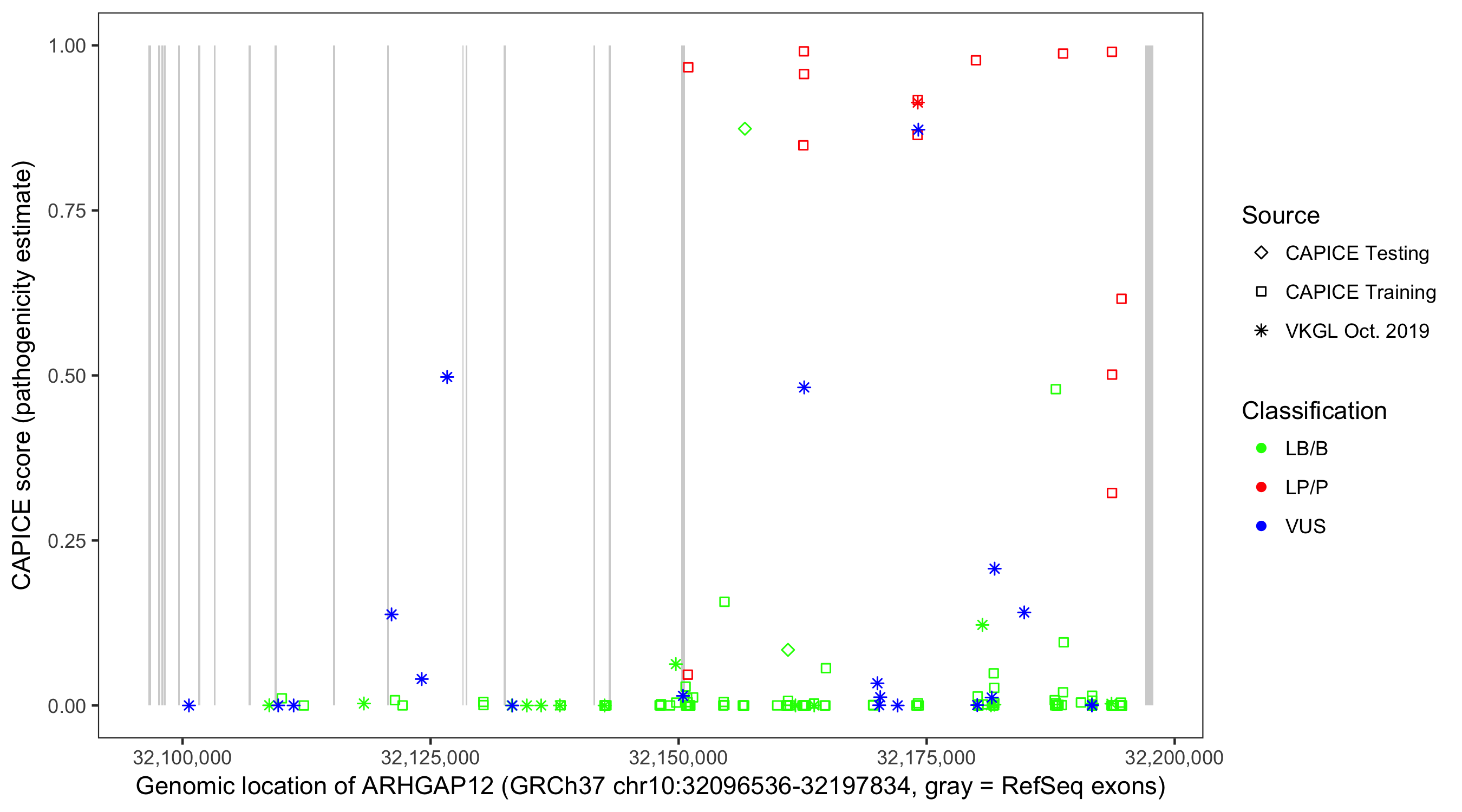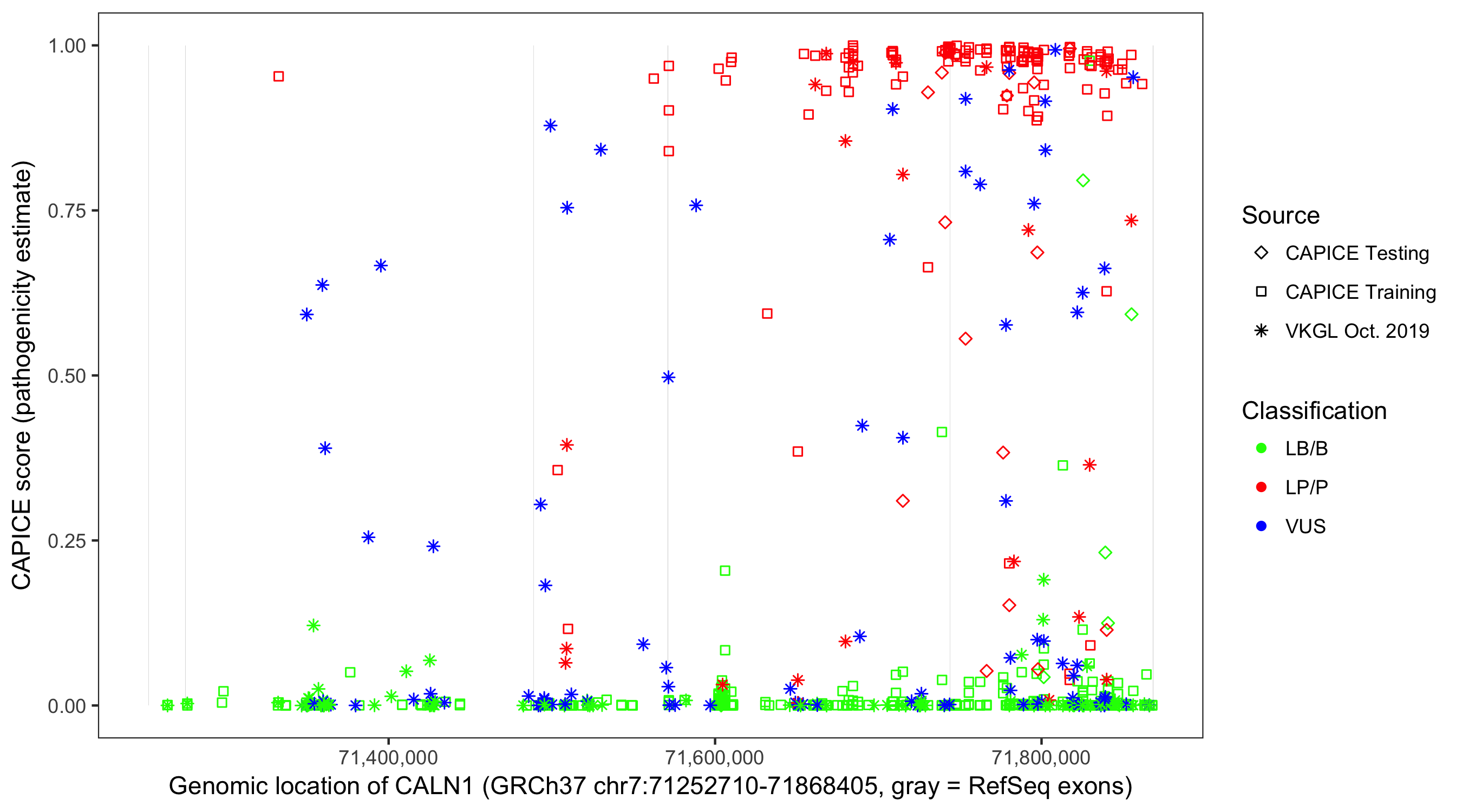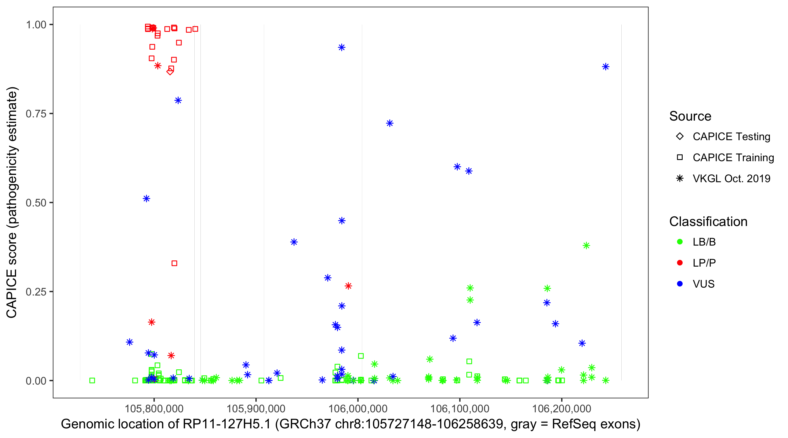 Shown are CAPICE train/test variants plus VKGL Oct 2019.