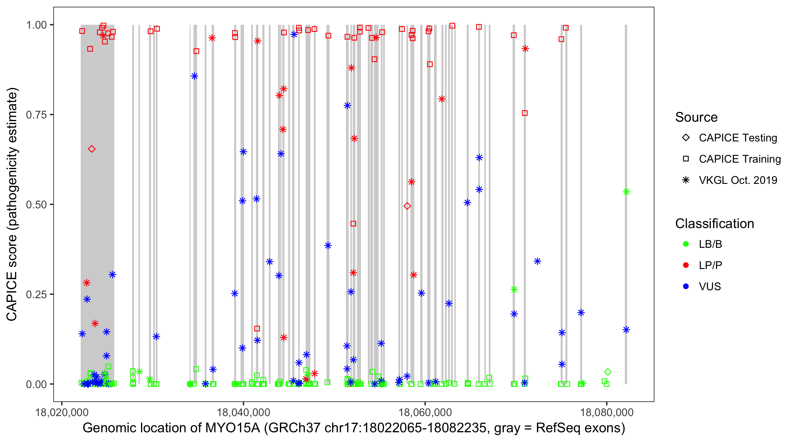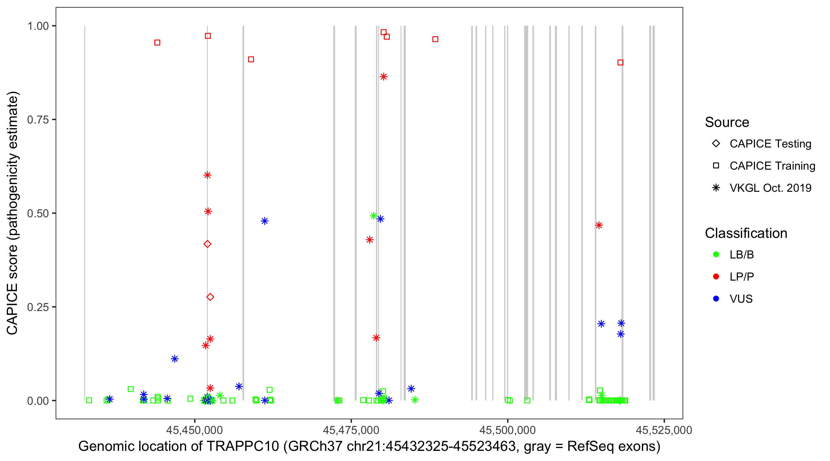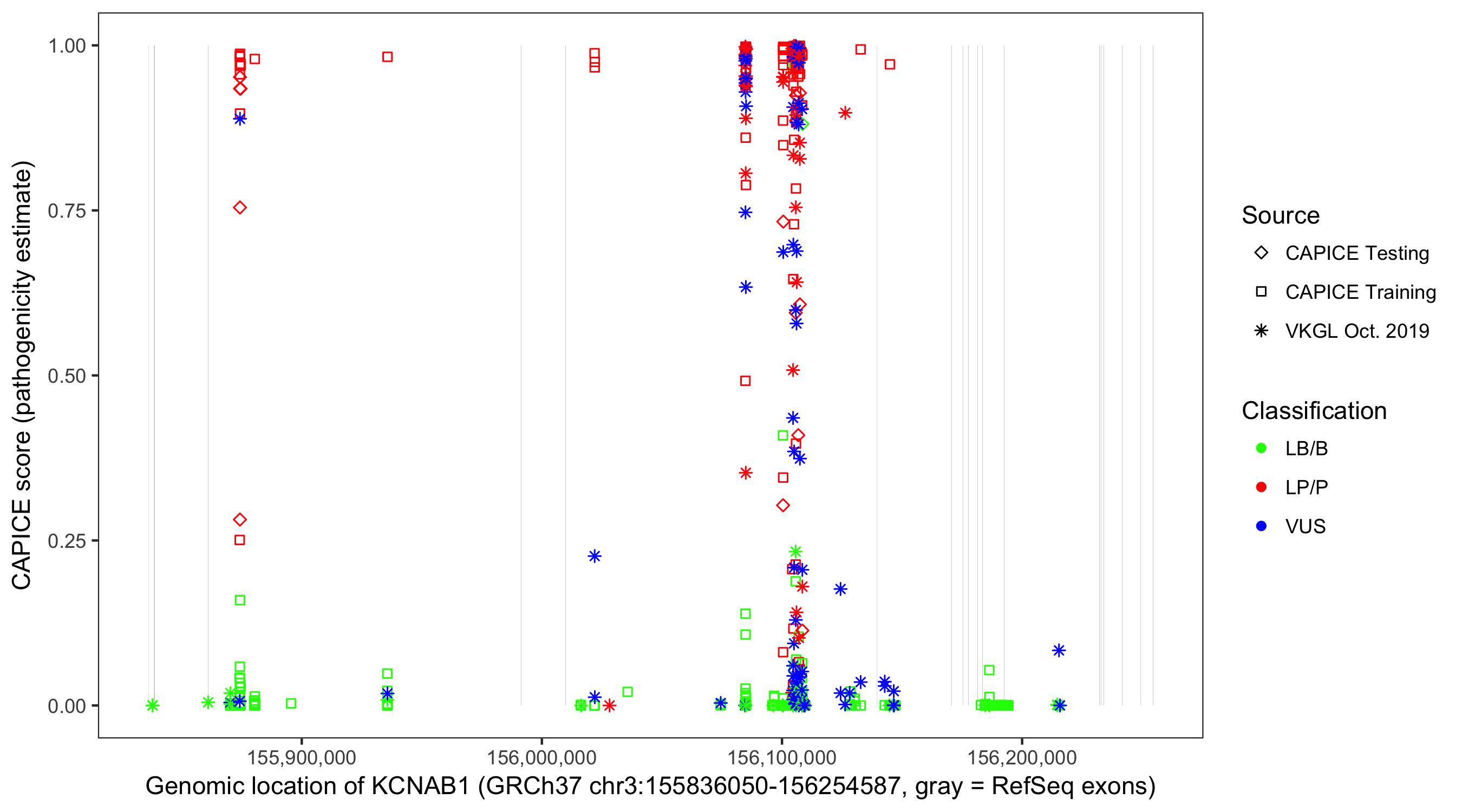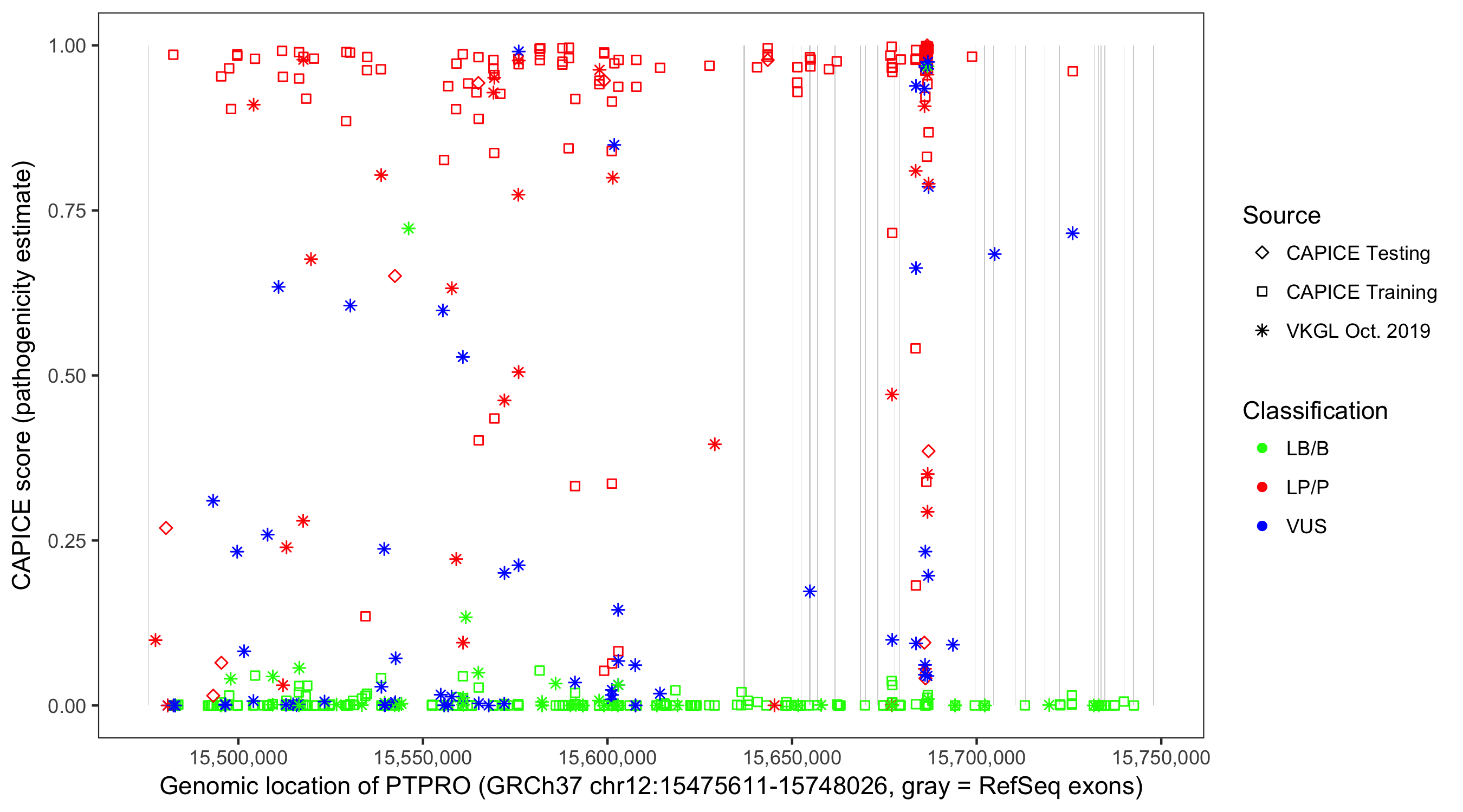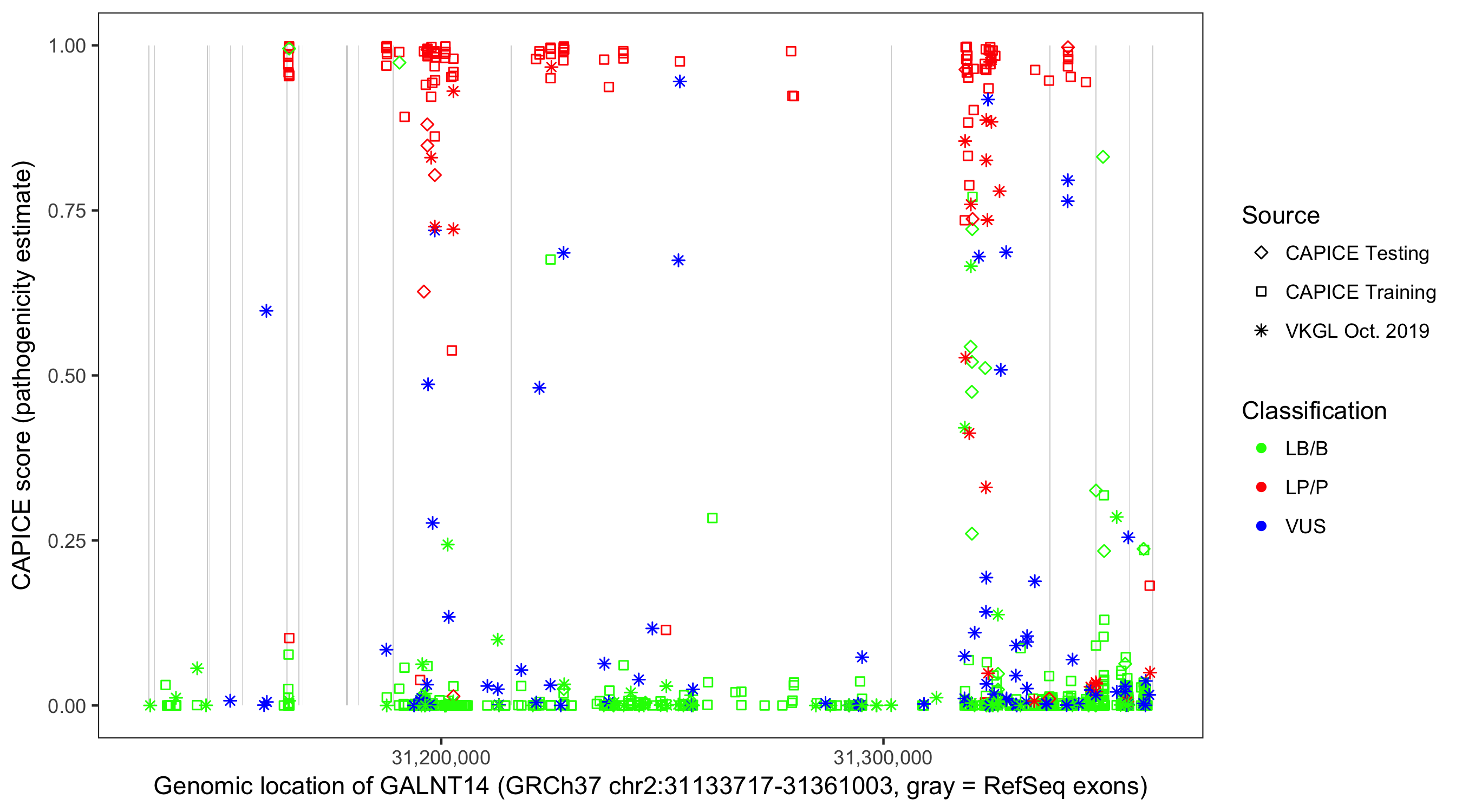 Shown are CAPICE train/test variants plus VKGL Oct 2019.