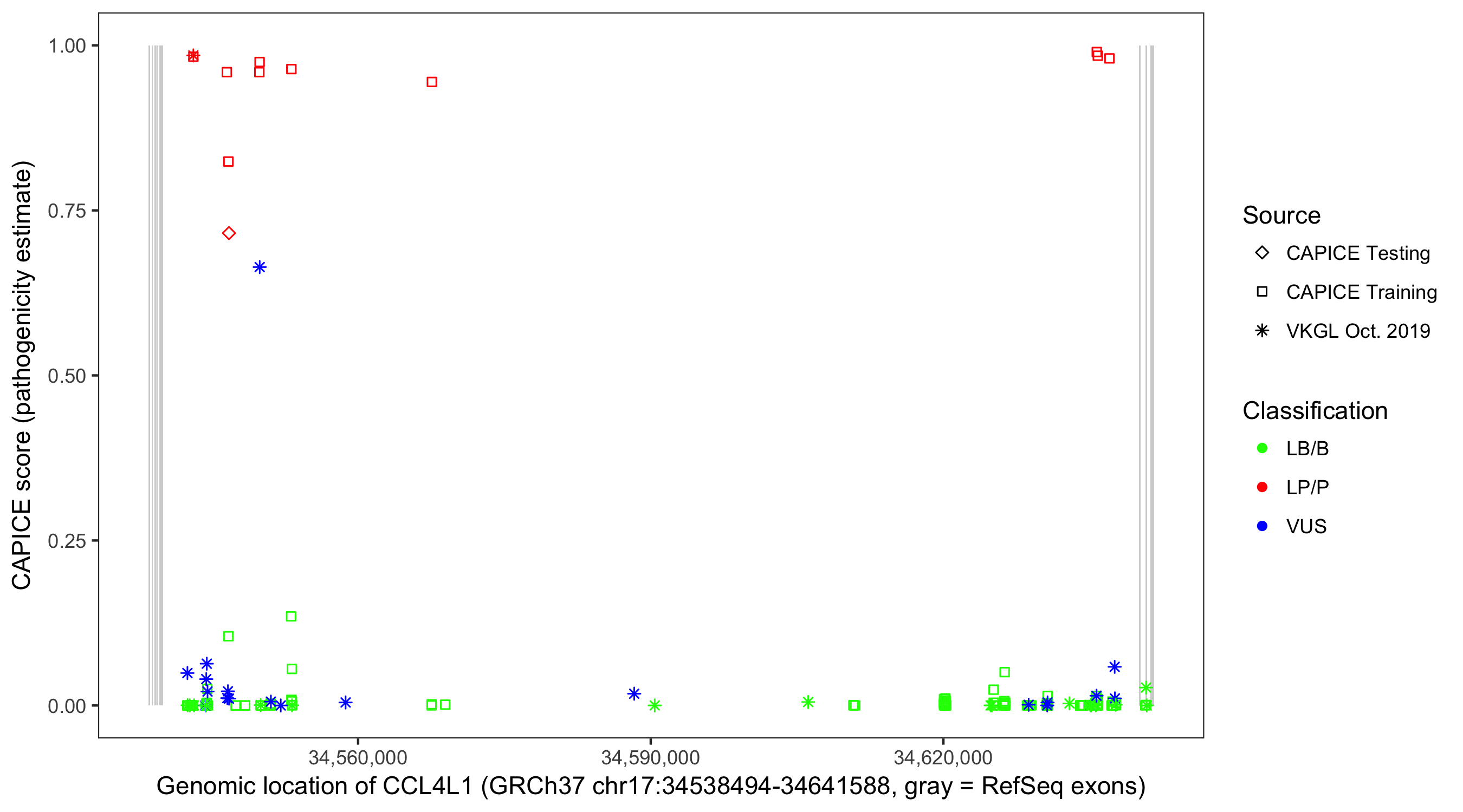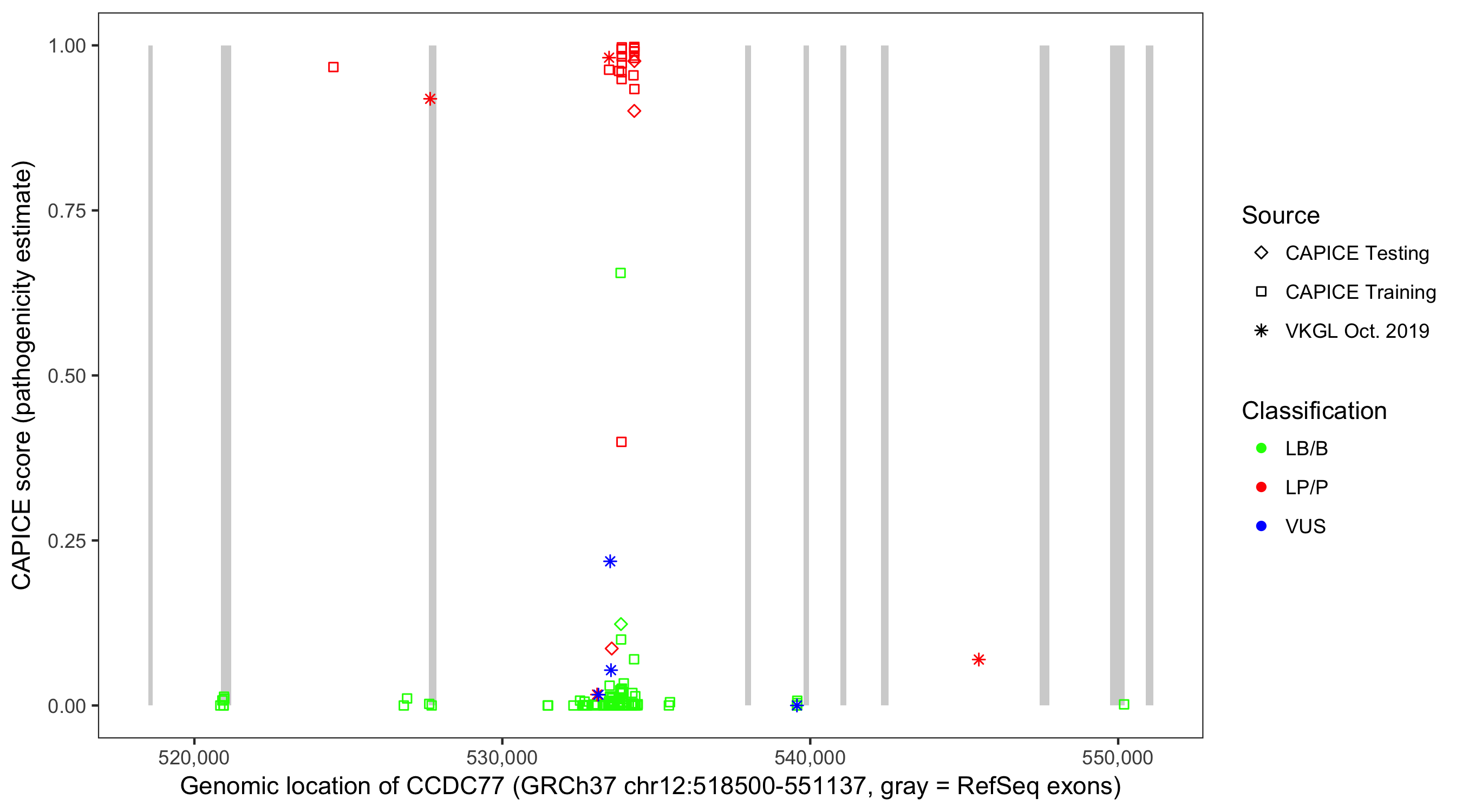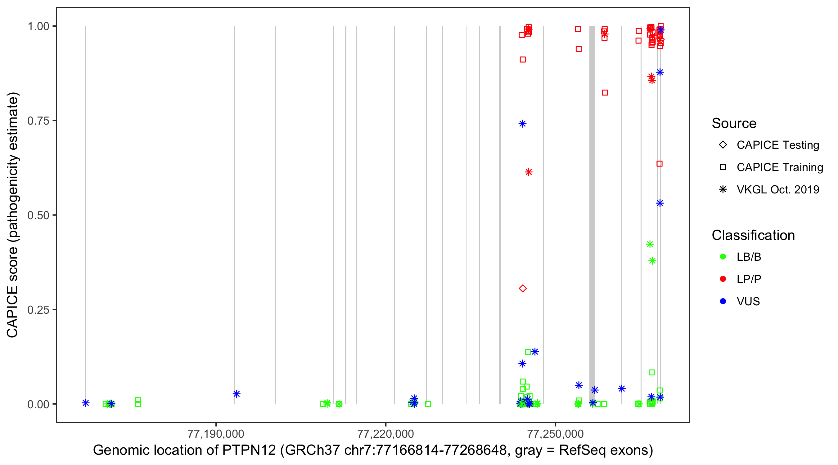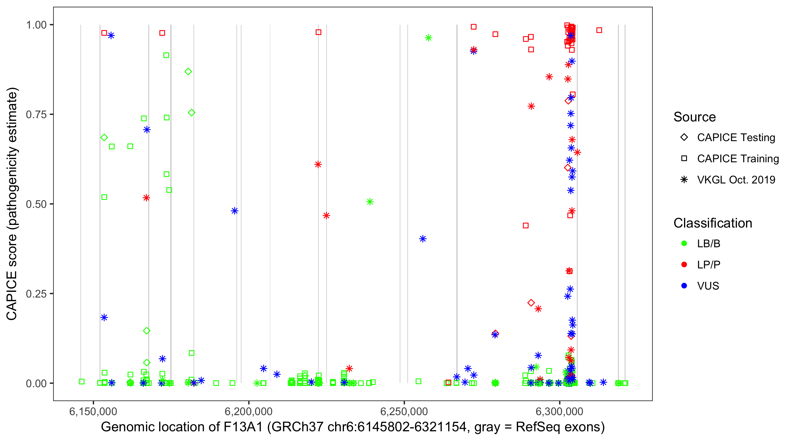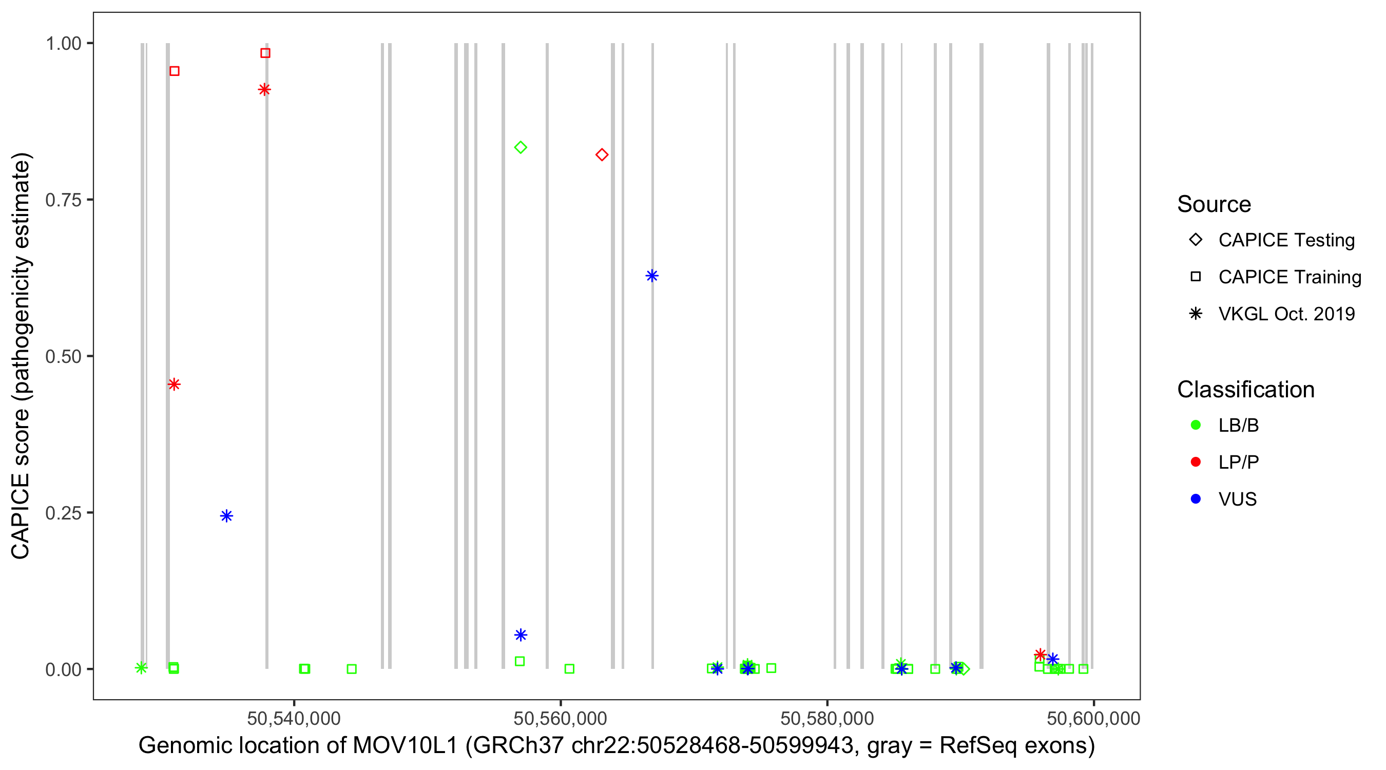 Shown are CAPICE train/test variants plus VKGL Oct 2019.