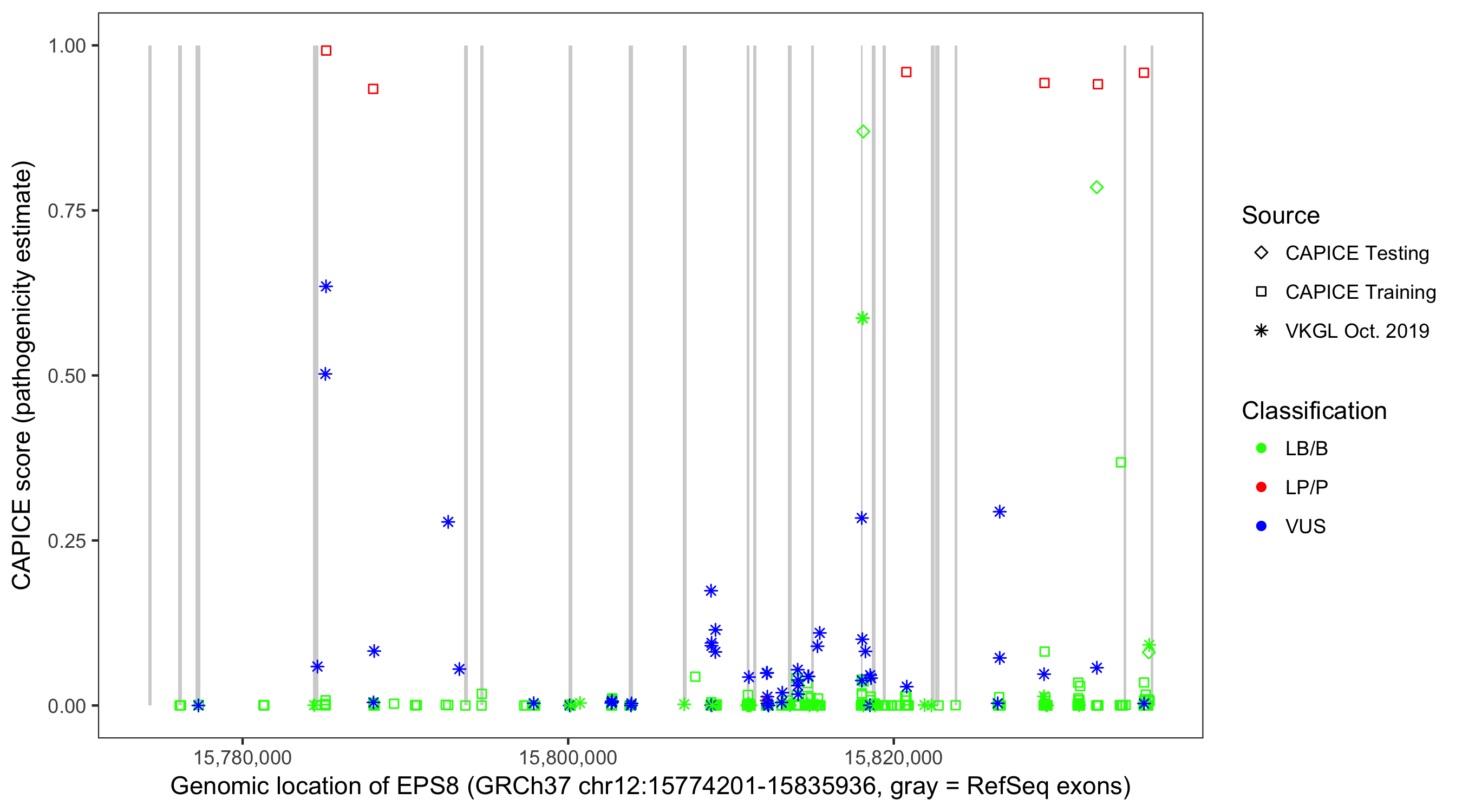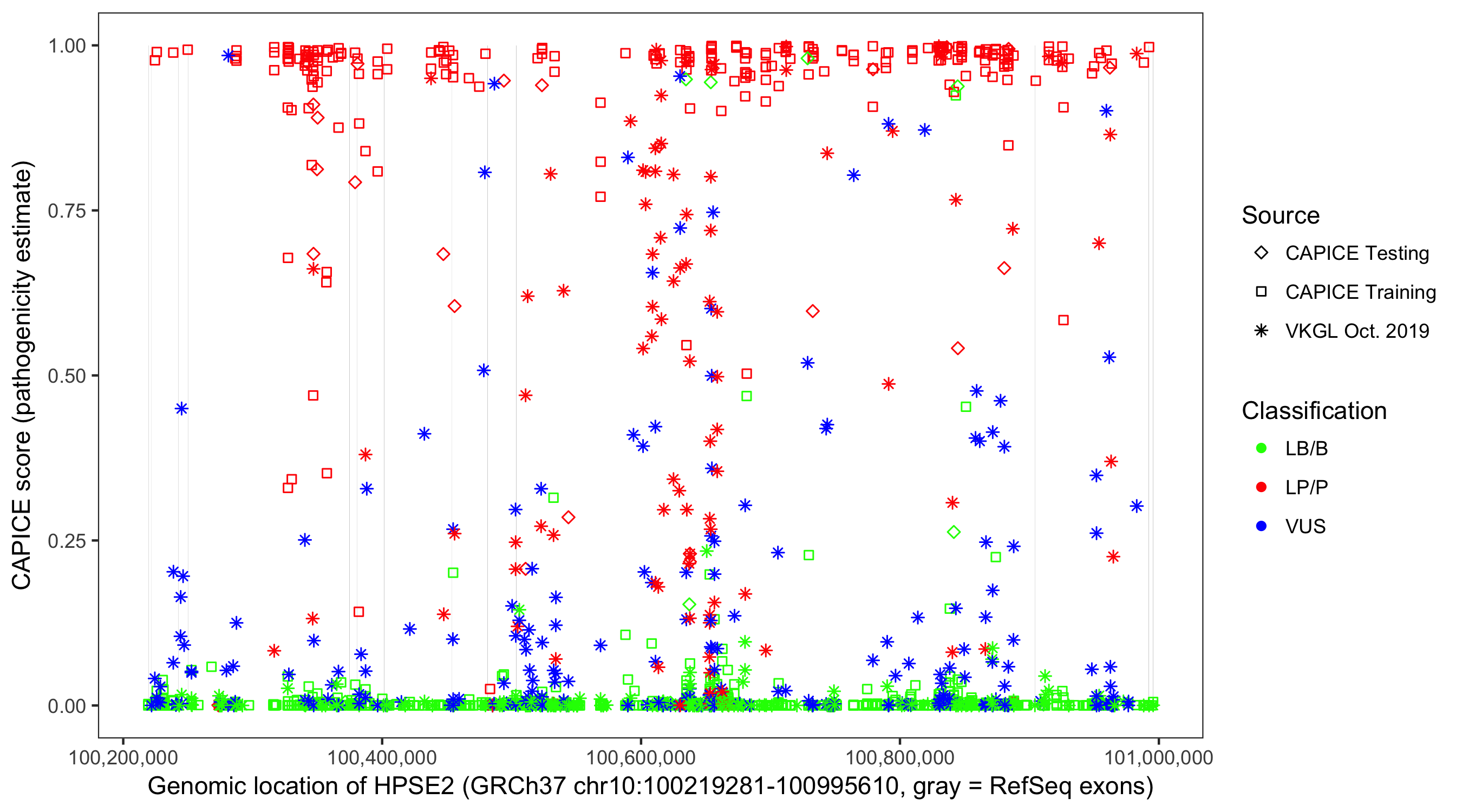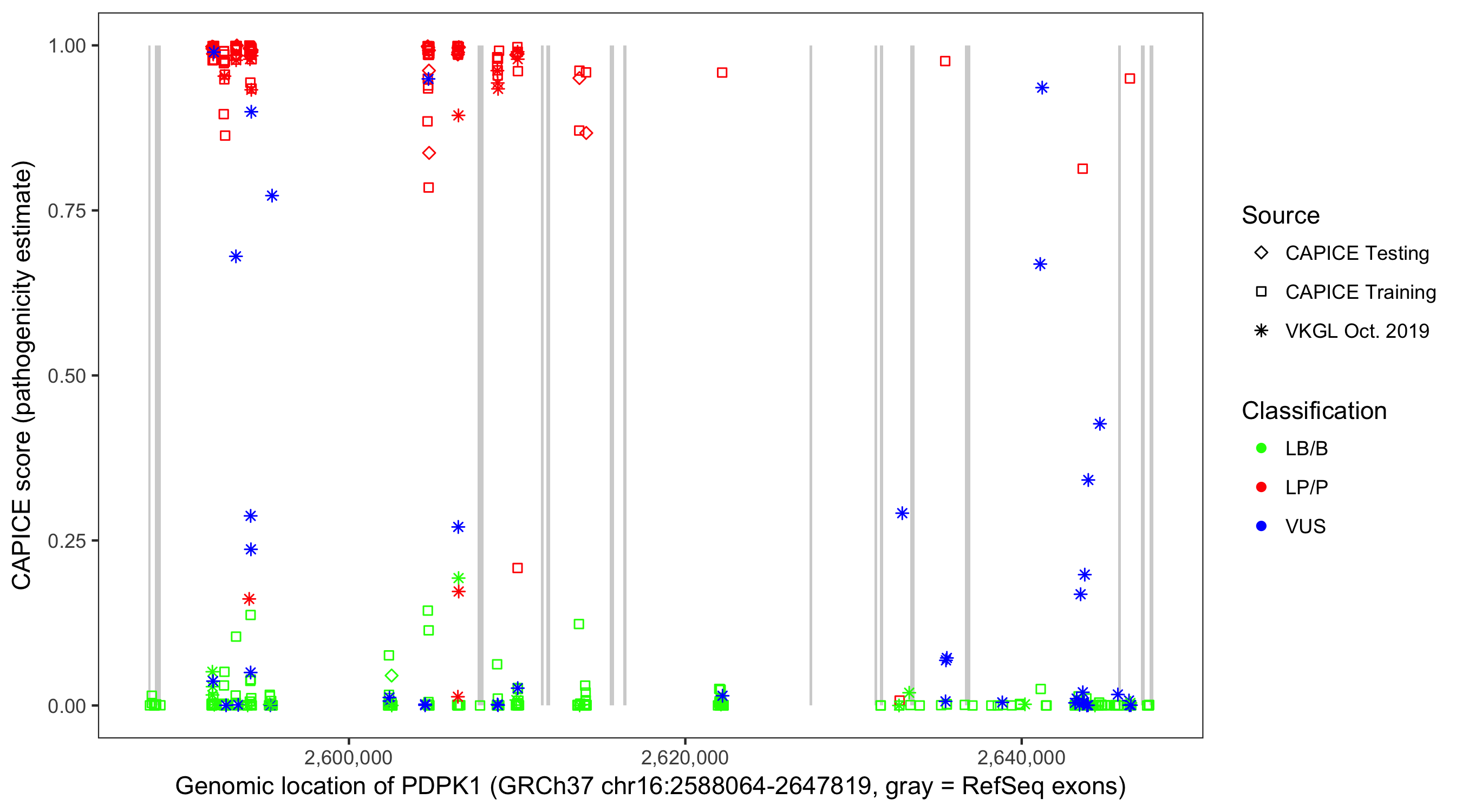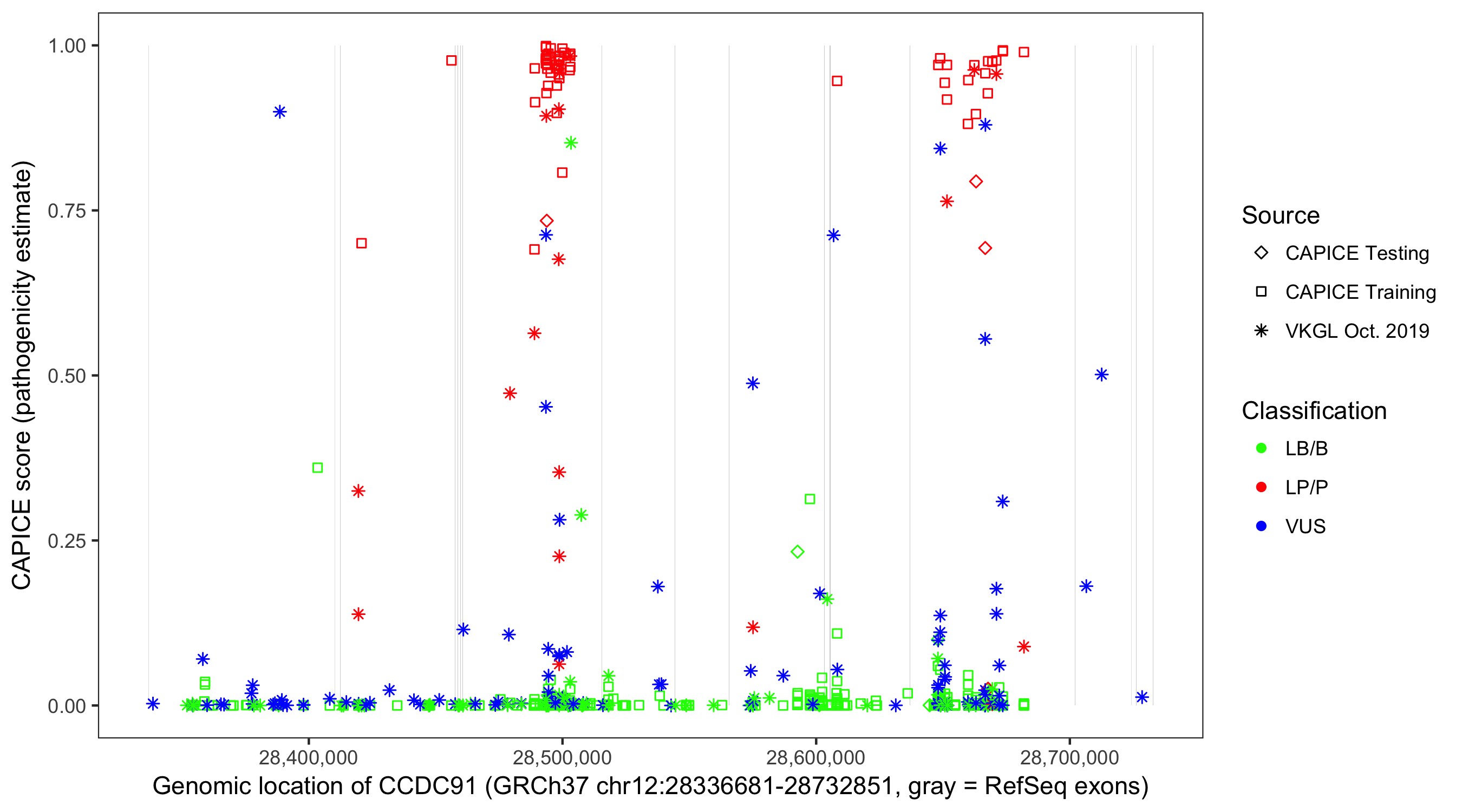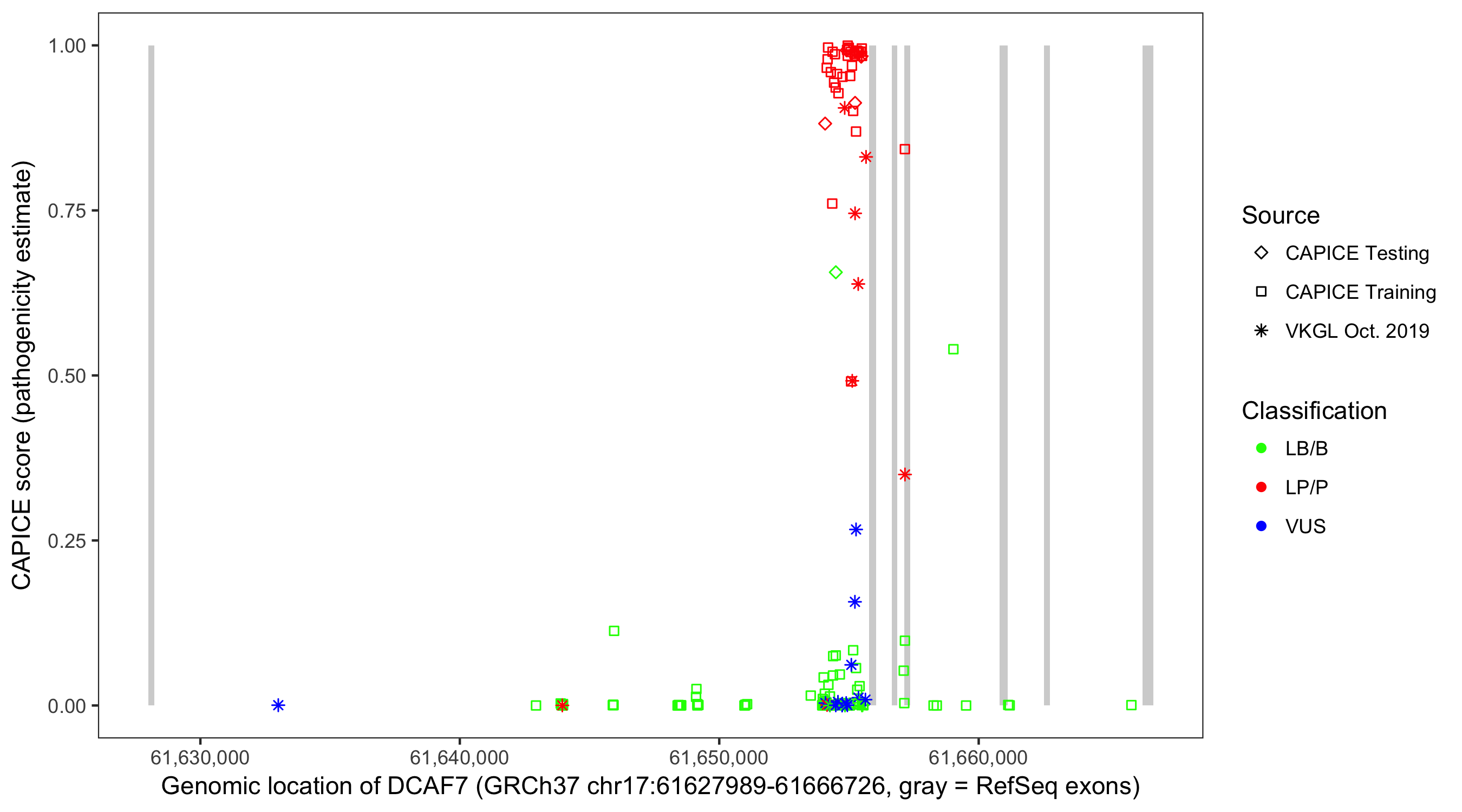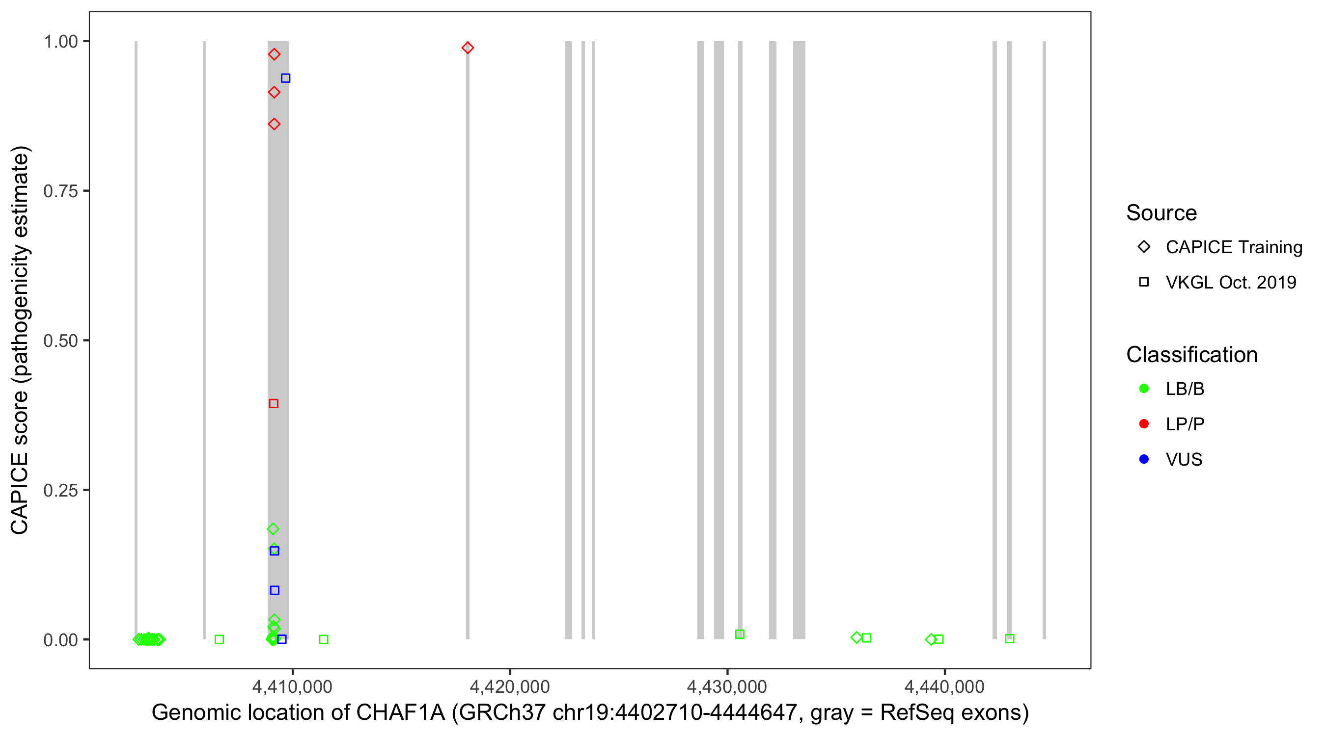 Shown are CAPICE train/test variants plus VKGL Oct 2019.