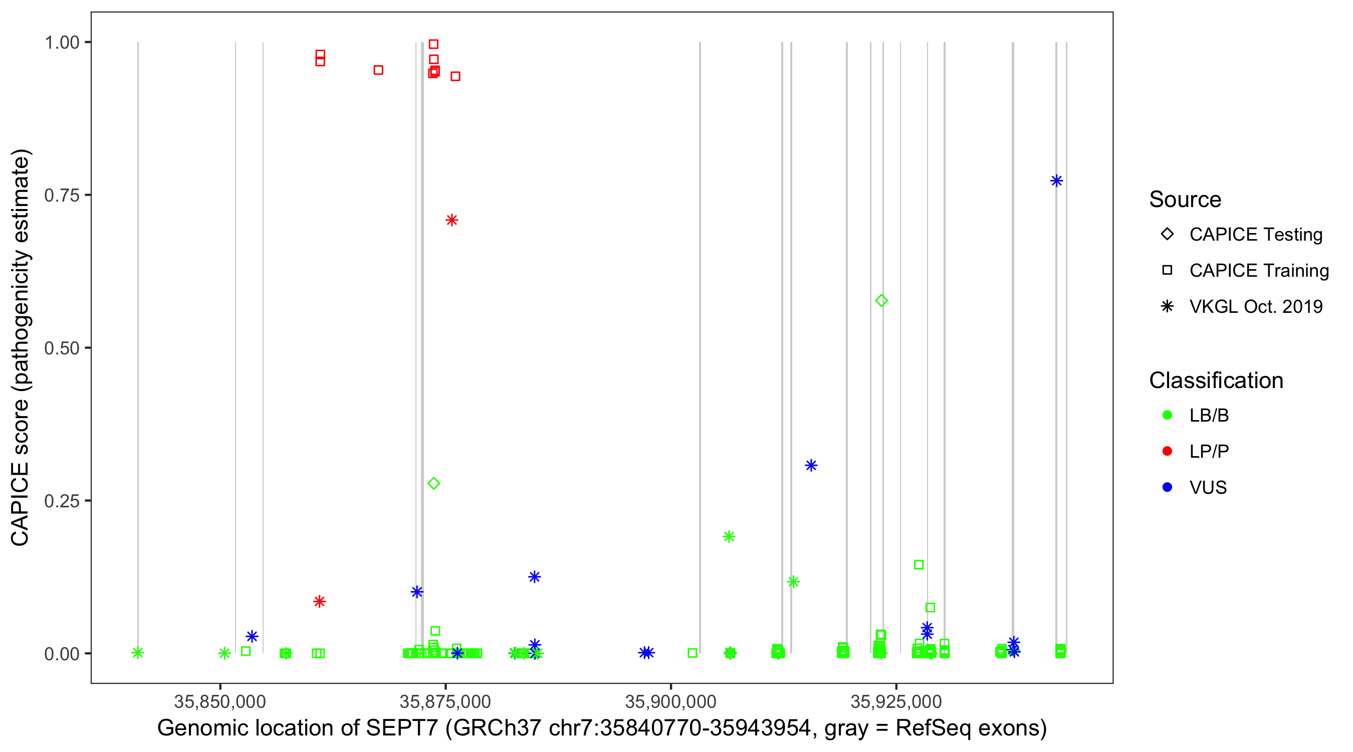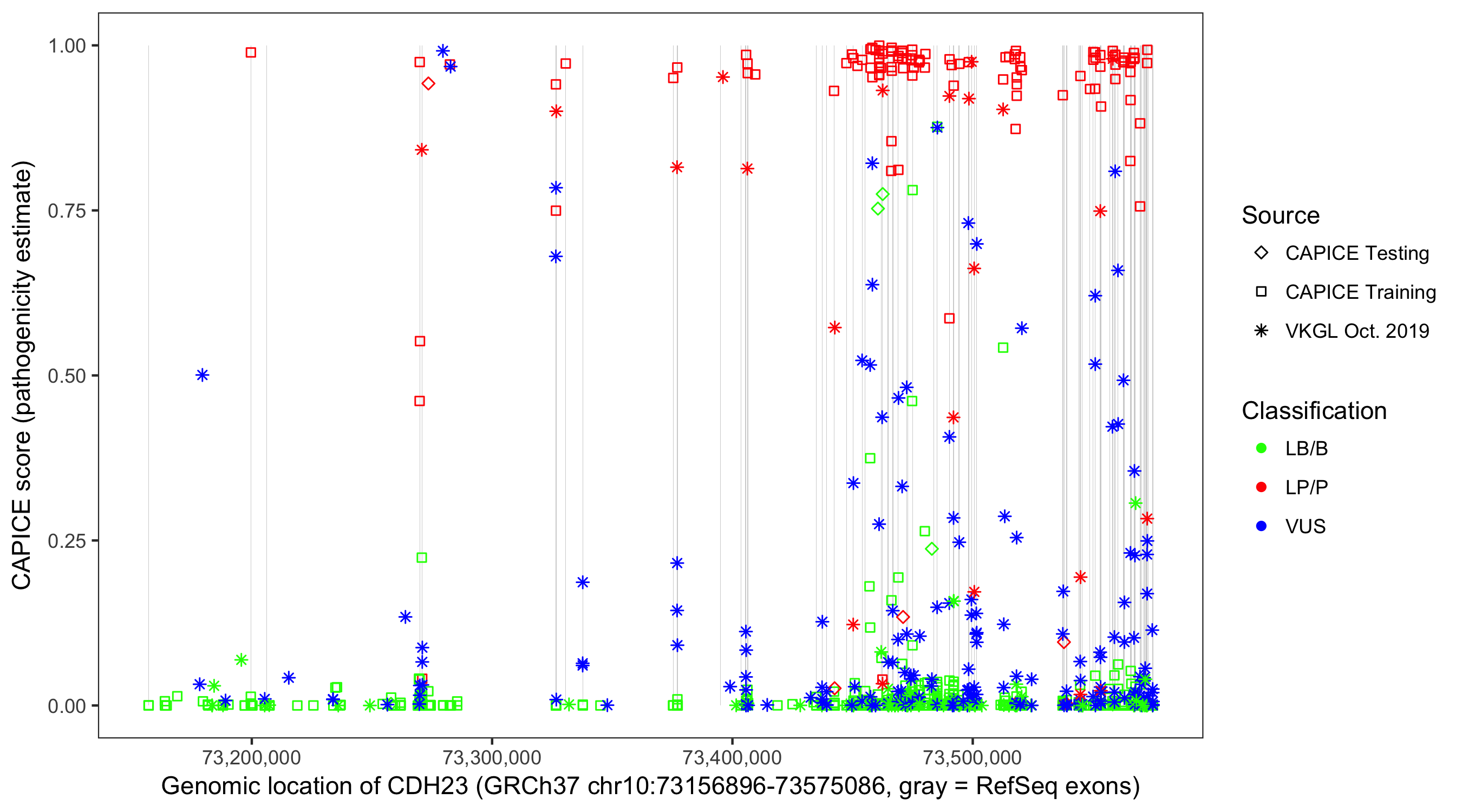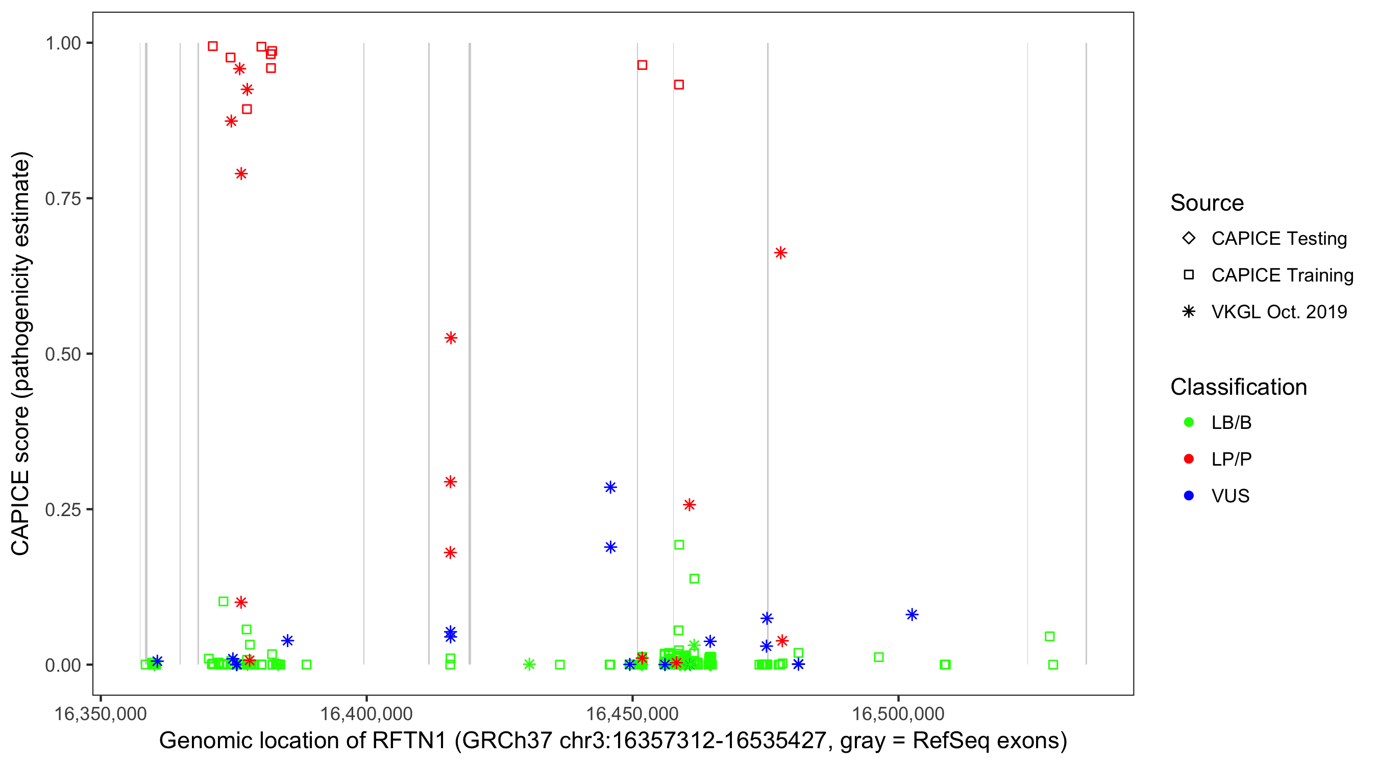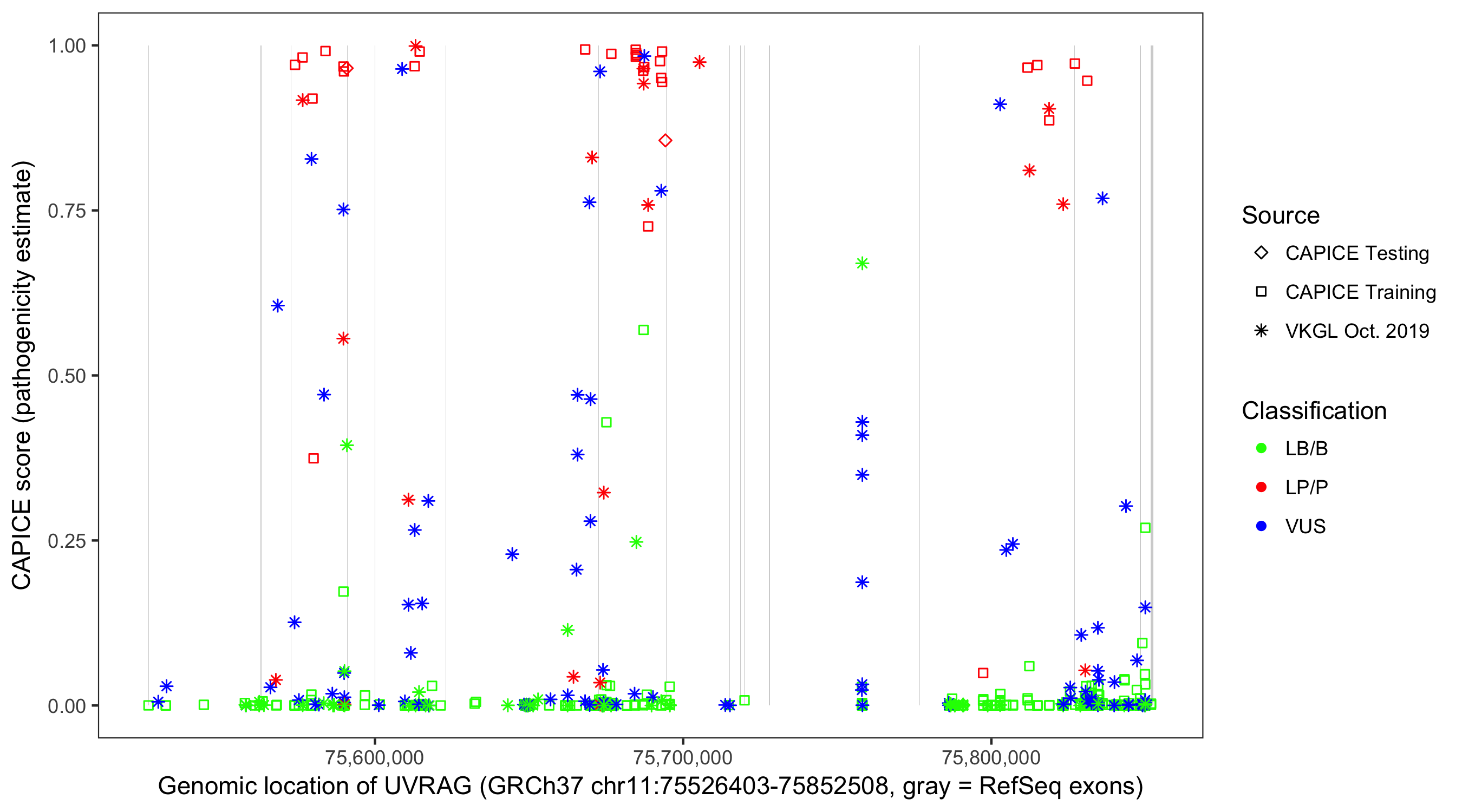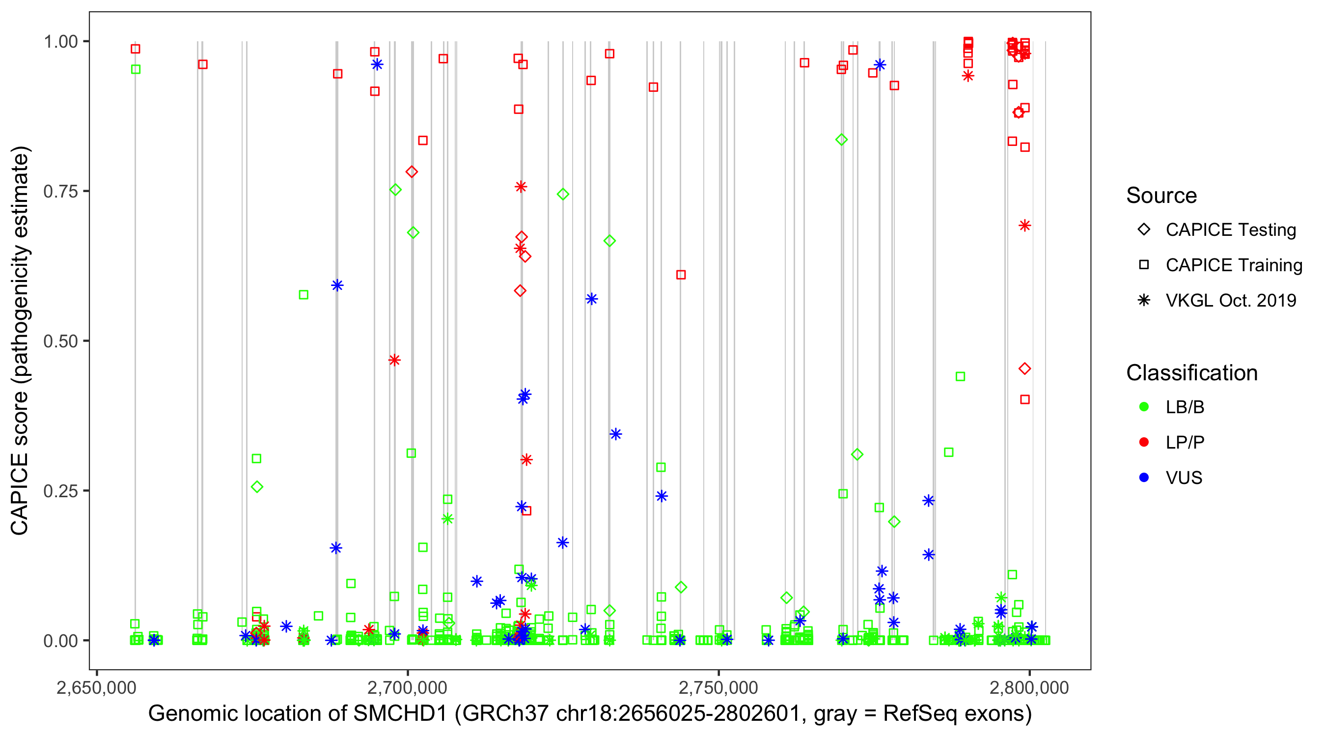 Shown are CAPICE train/test variants plus VKGL Oct 2019.