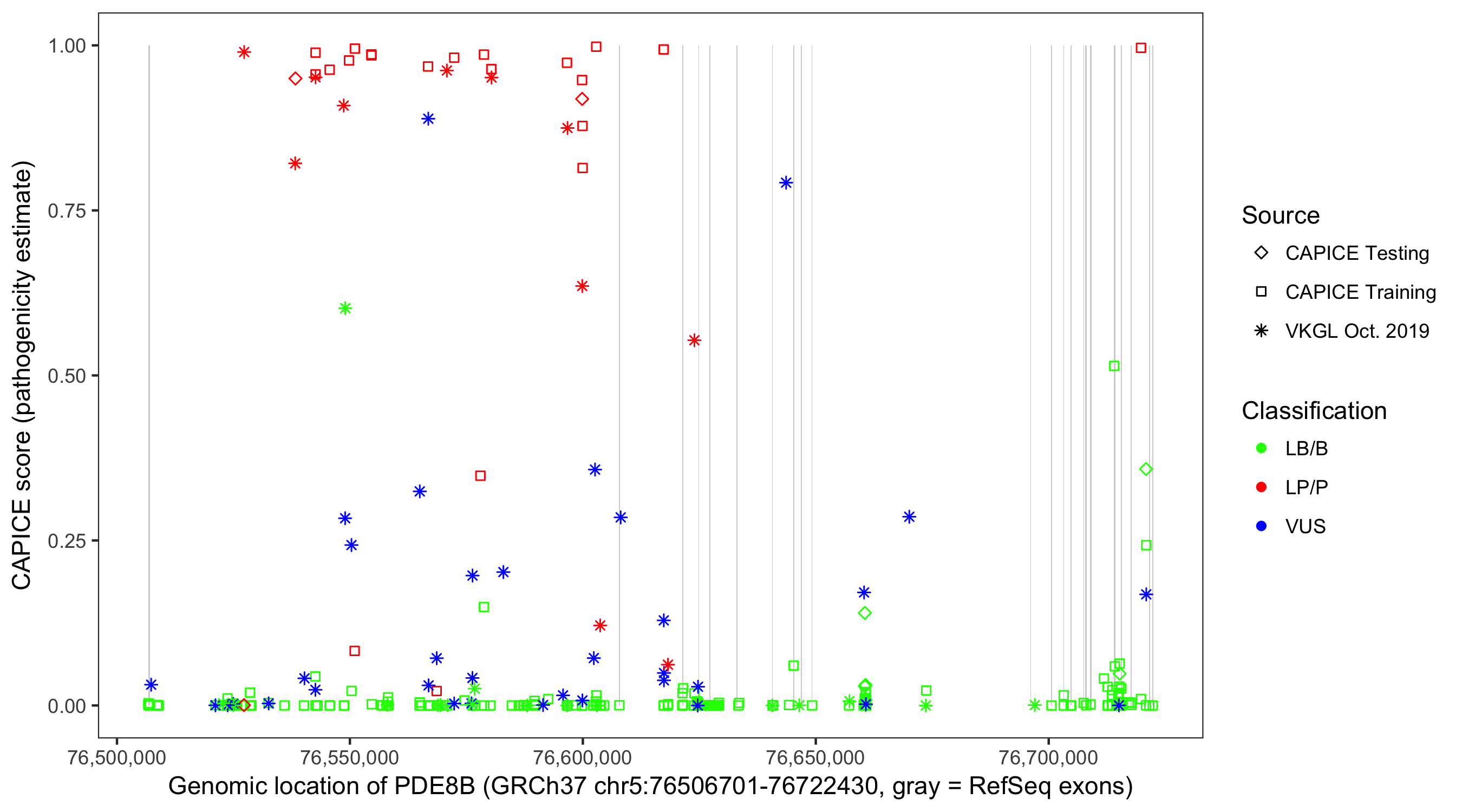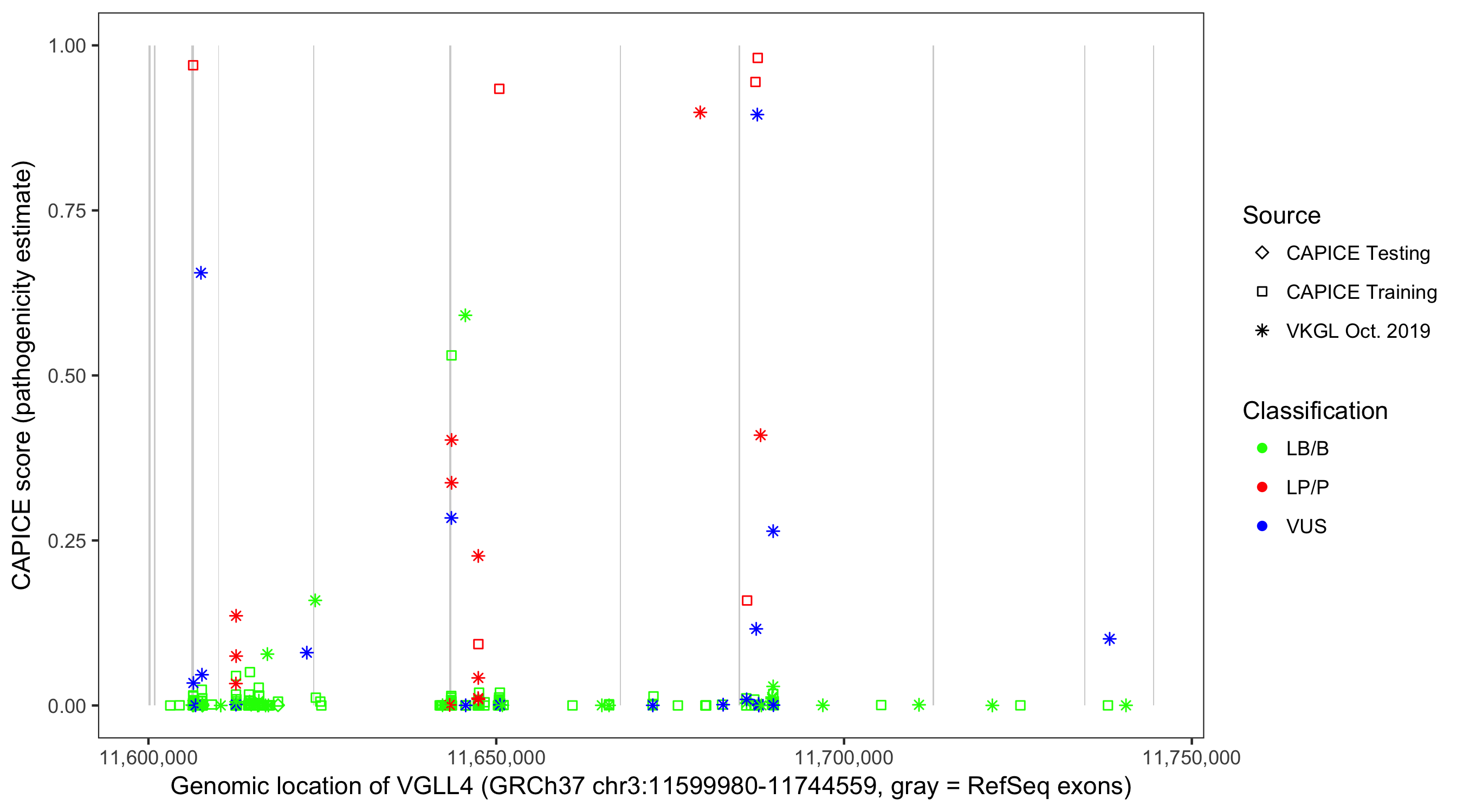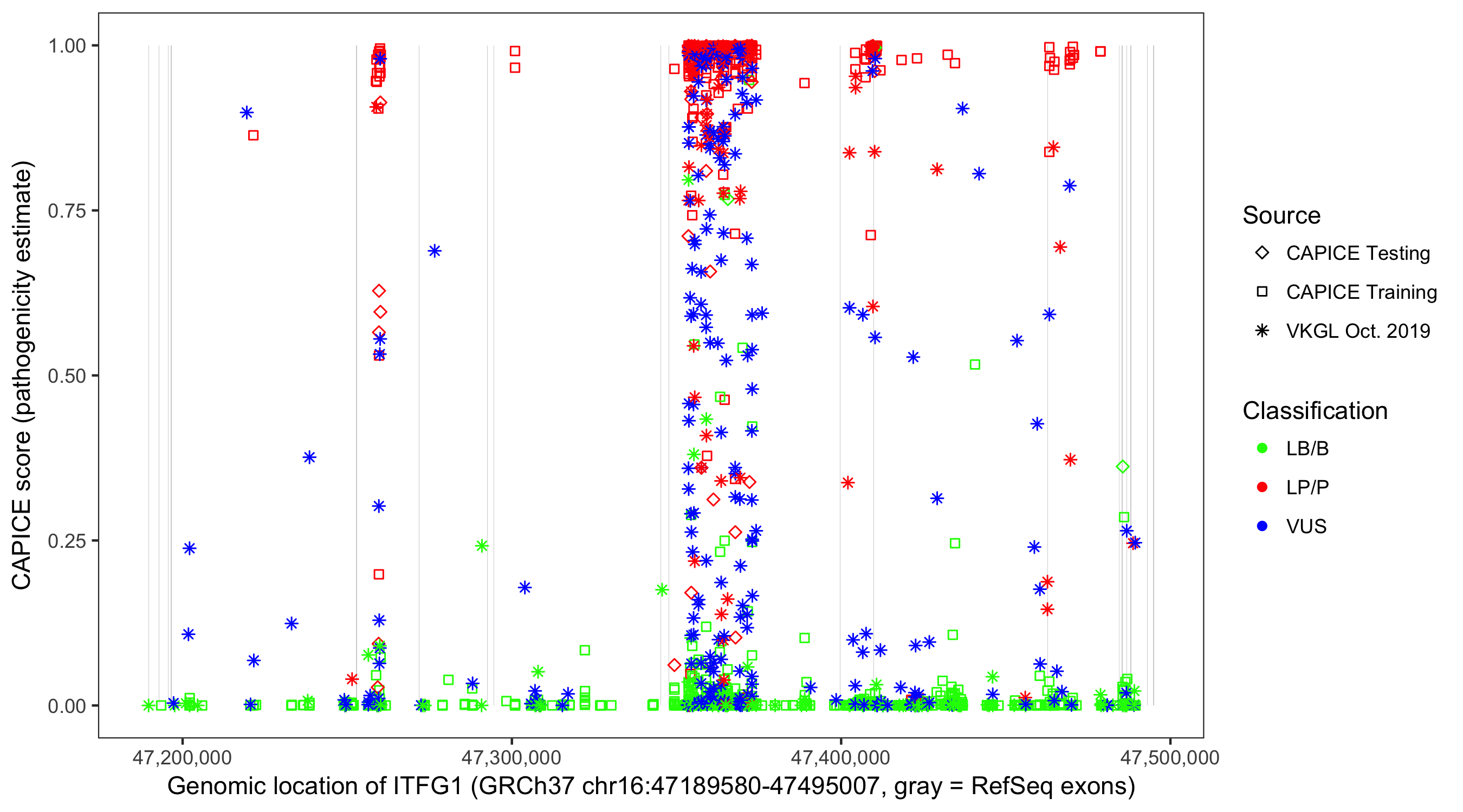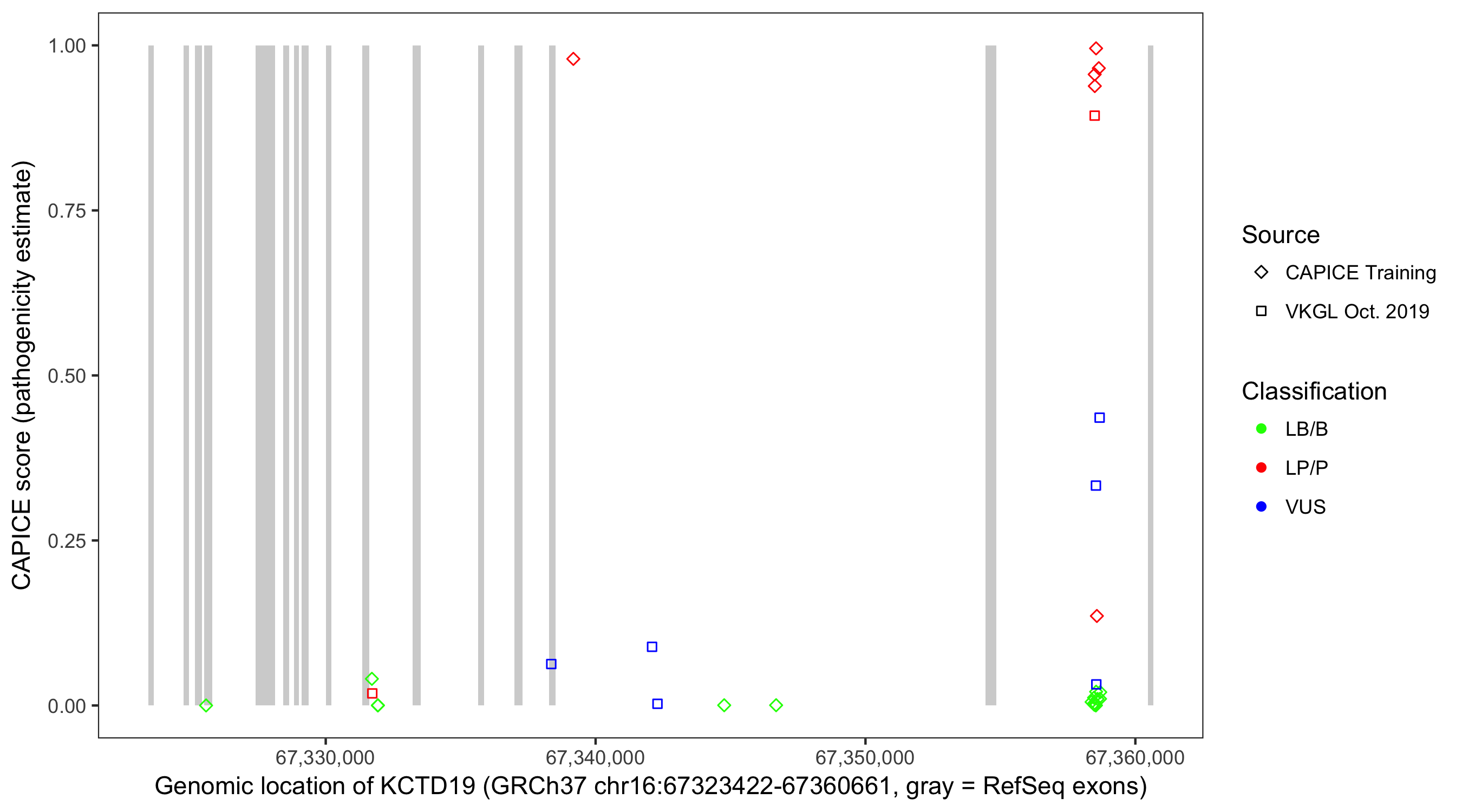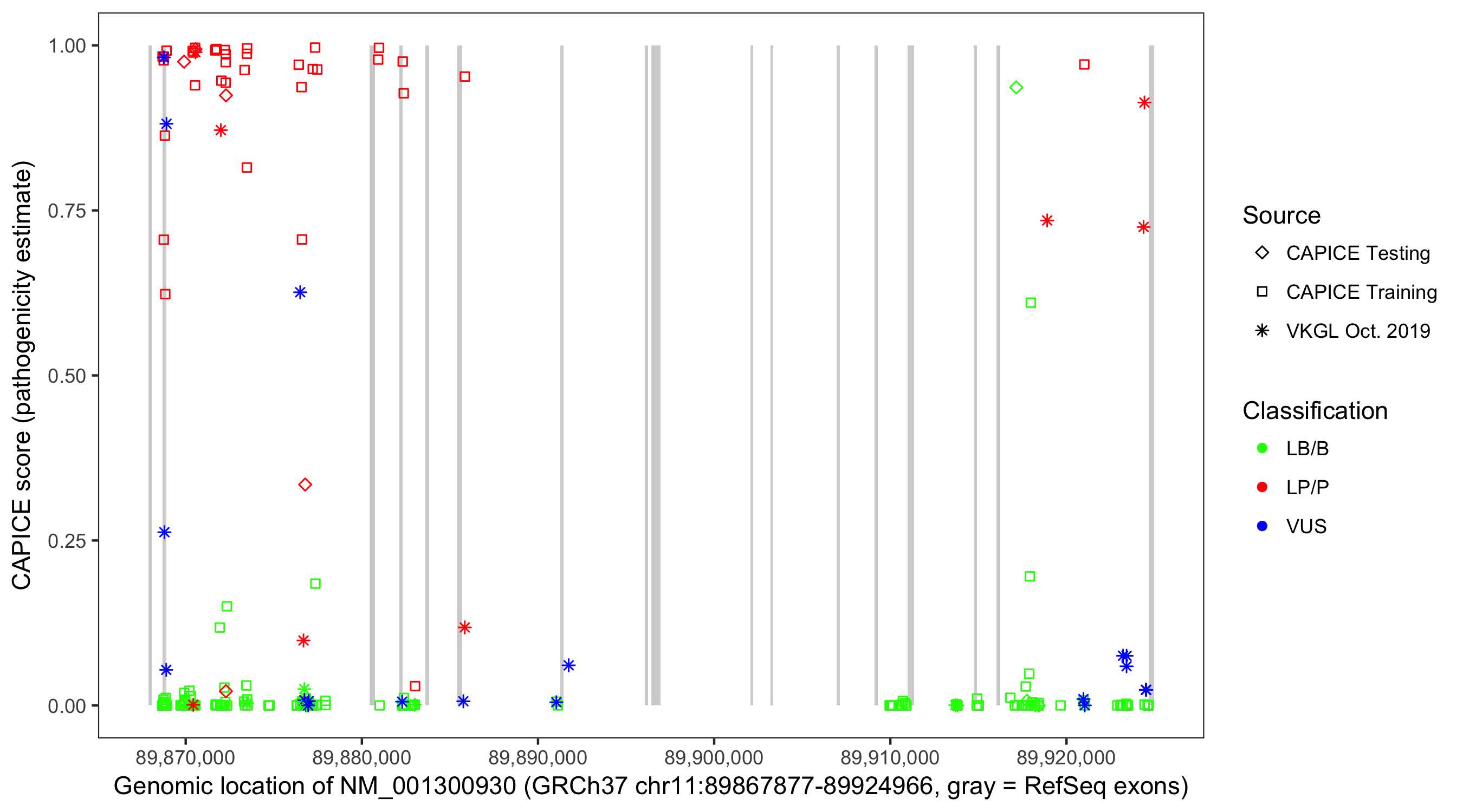 Shown are CAPICE train/test variants plus VKGL Oct 2019.