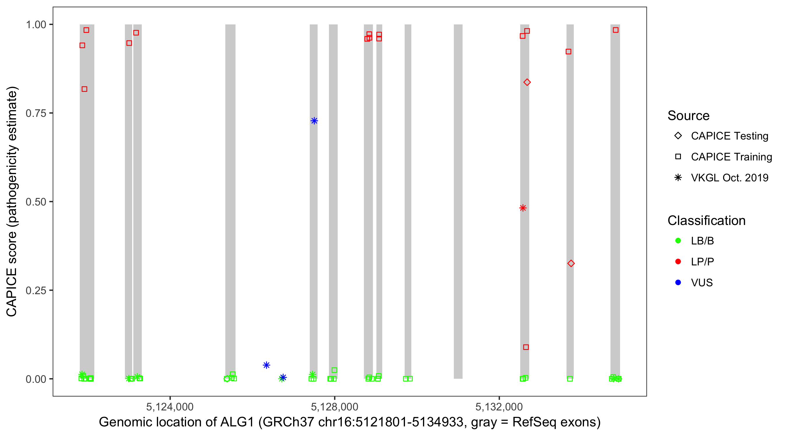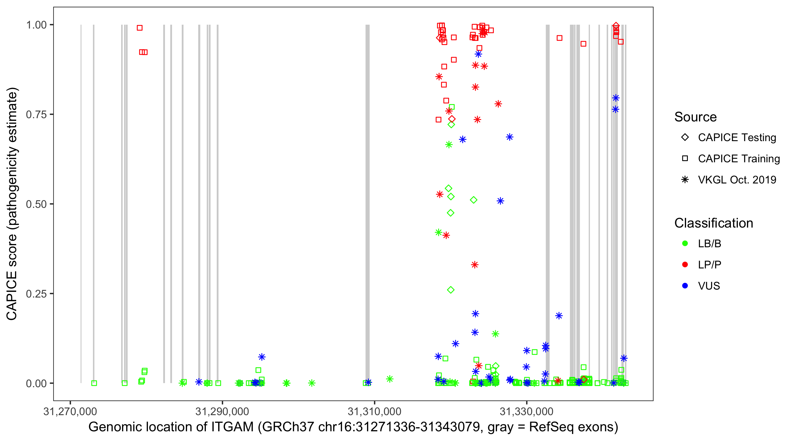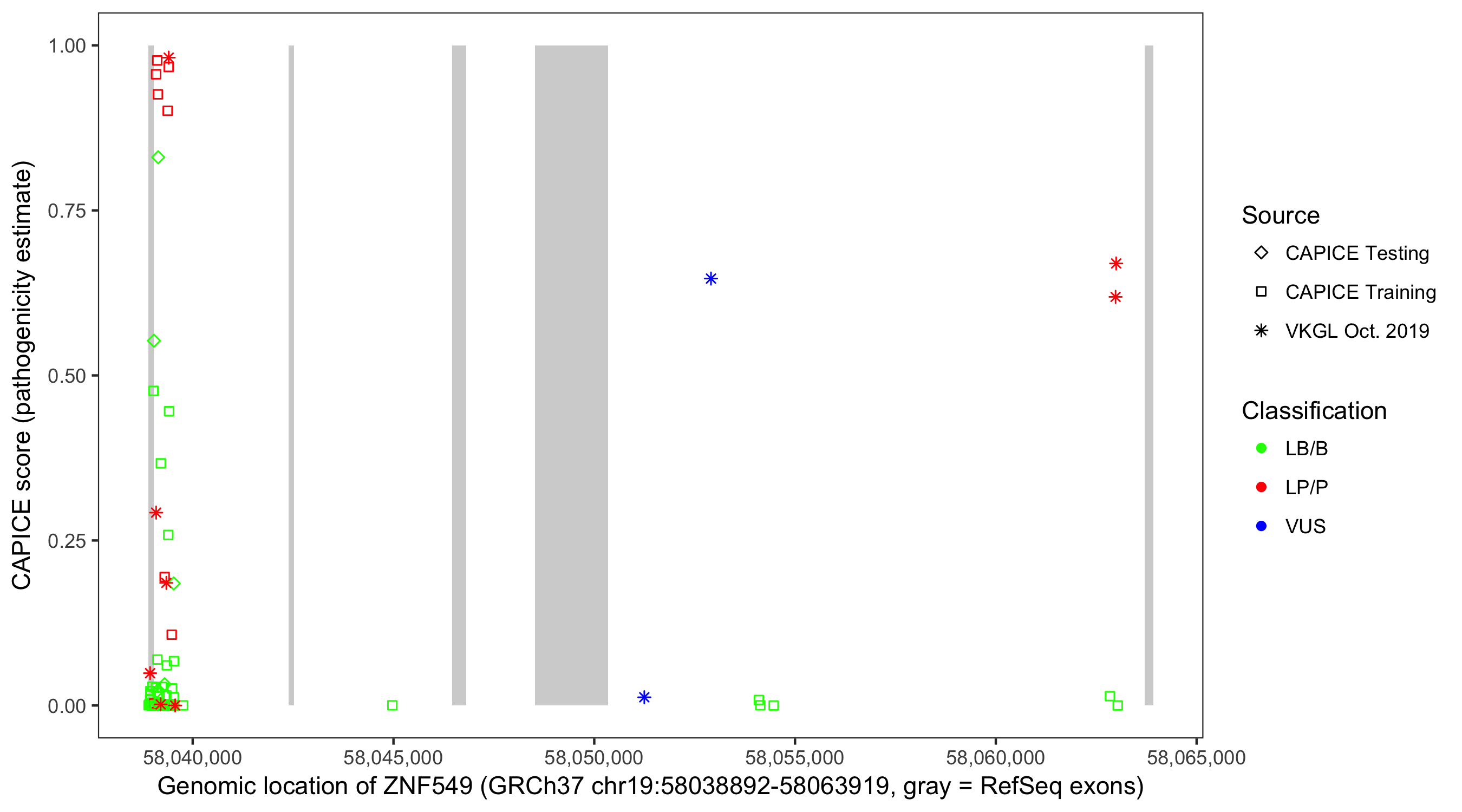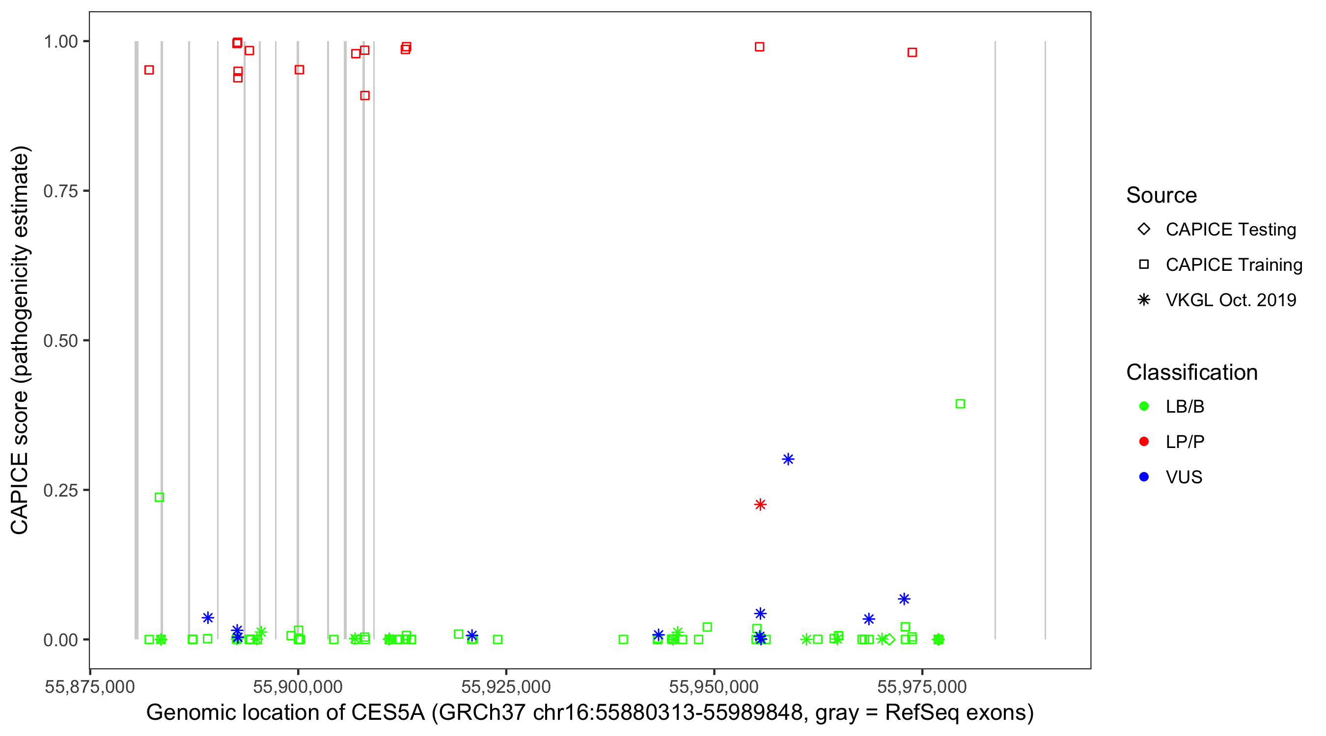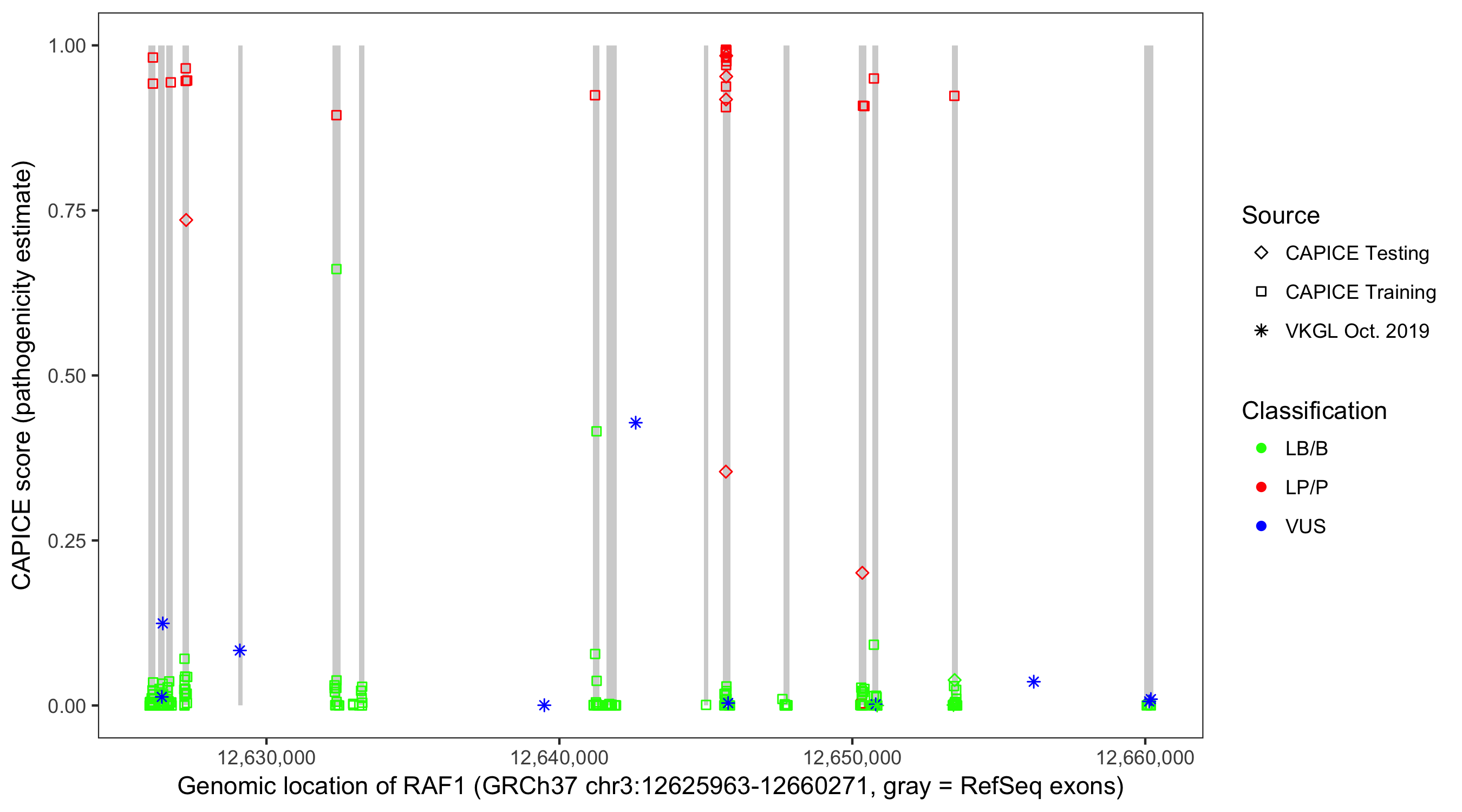 Shown are CAPICE train/test variants plus VKGL Oct 2019.