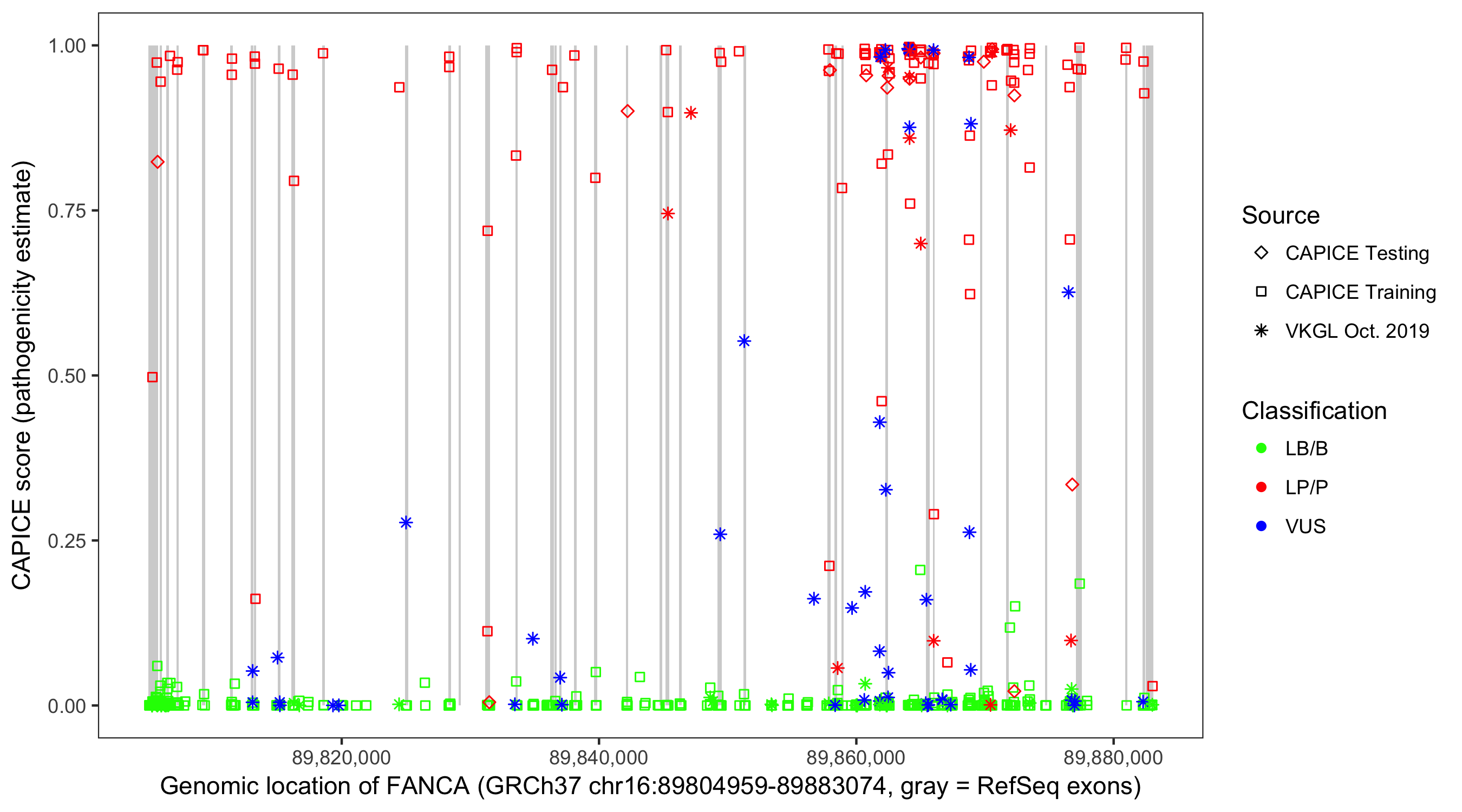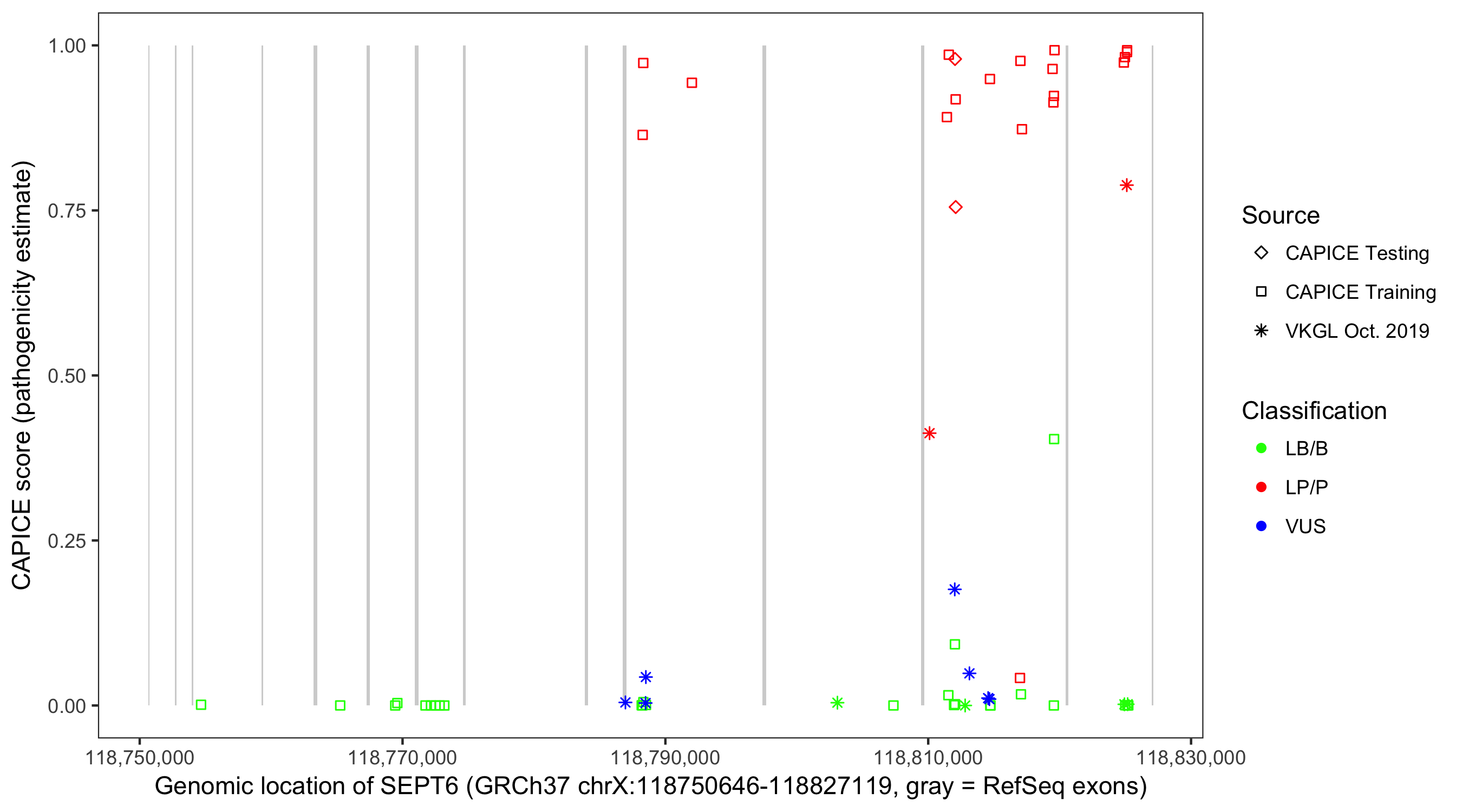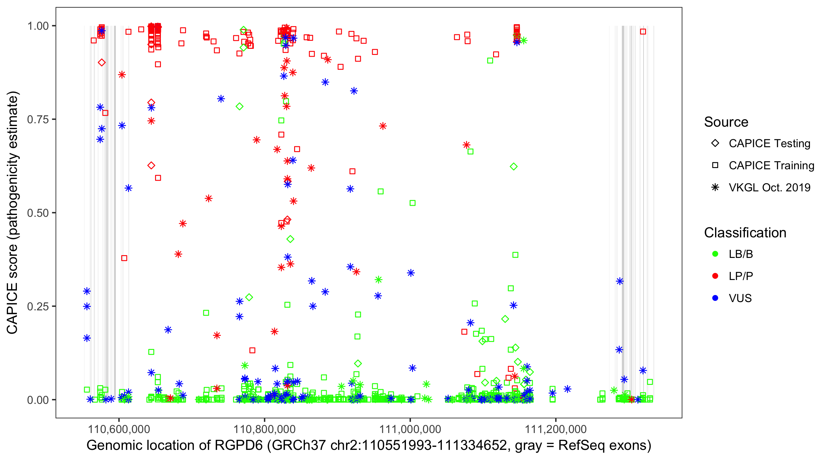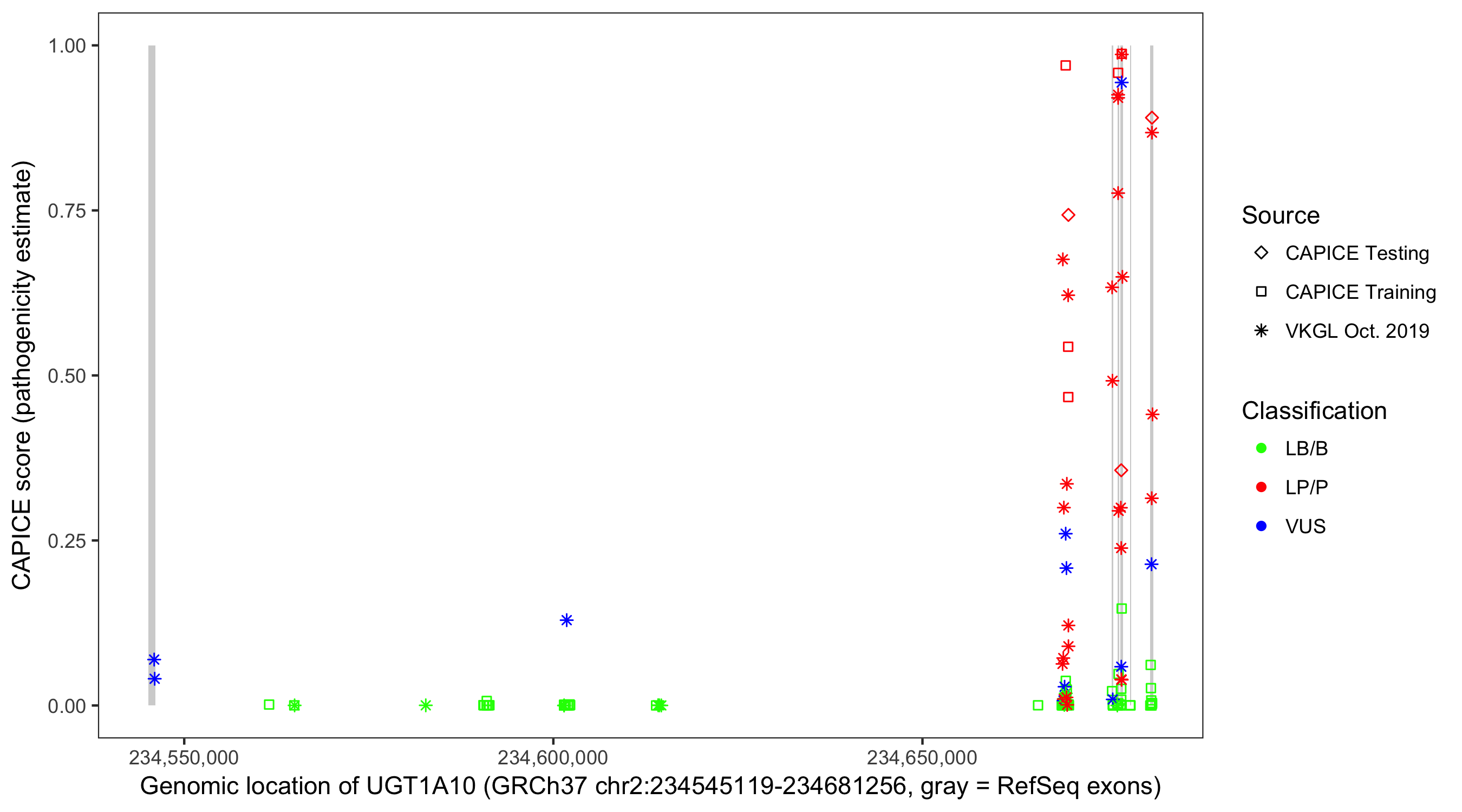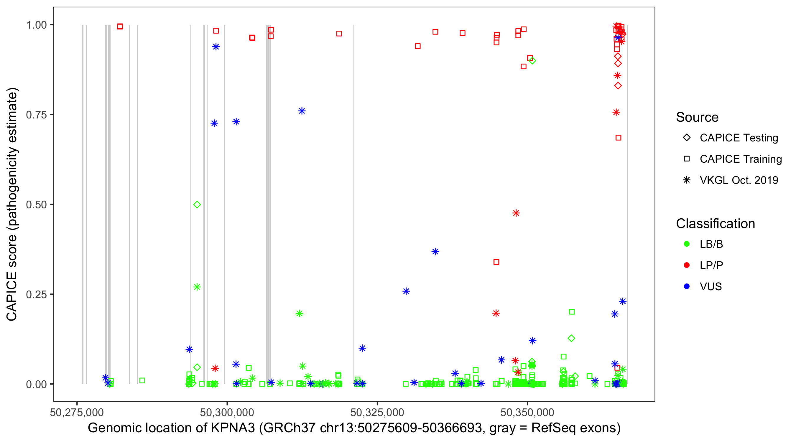 Shown are CAPICE train/test variants plus VKGL Oct 2019.